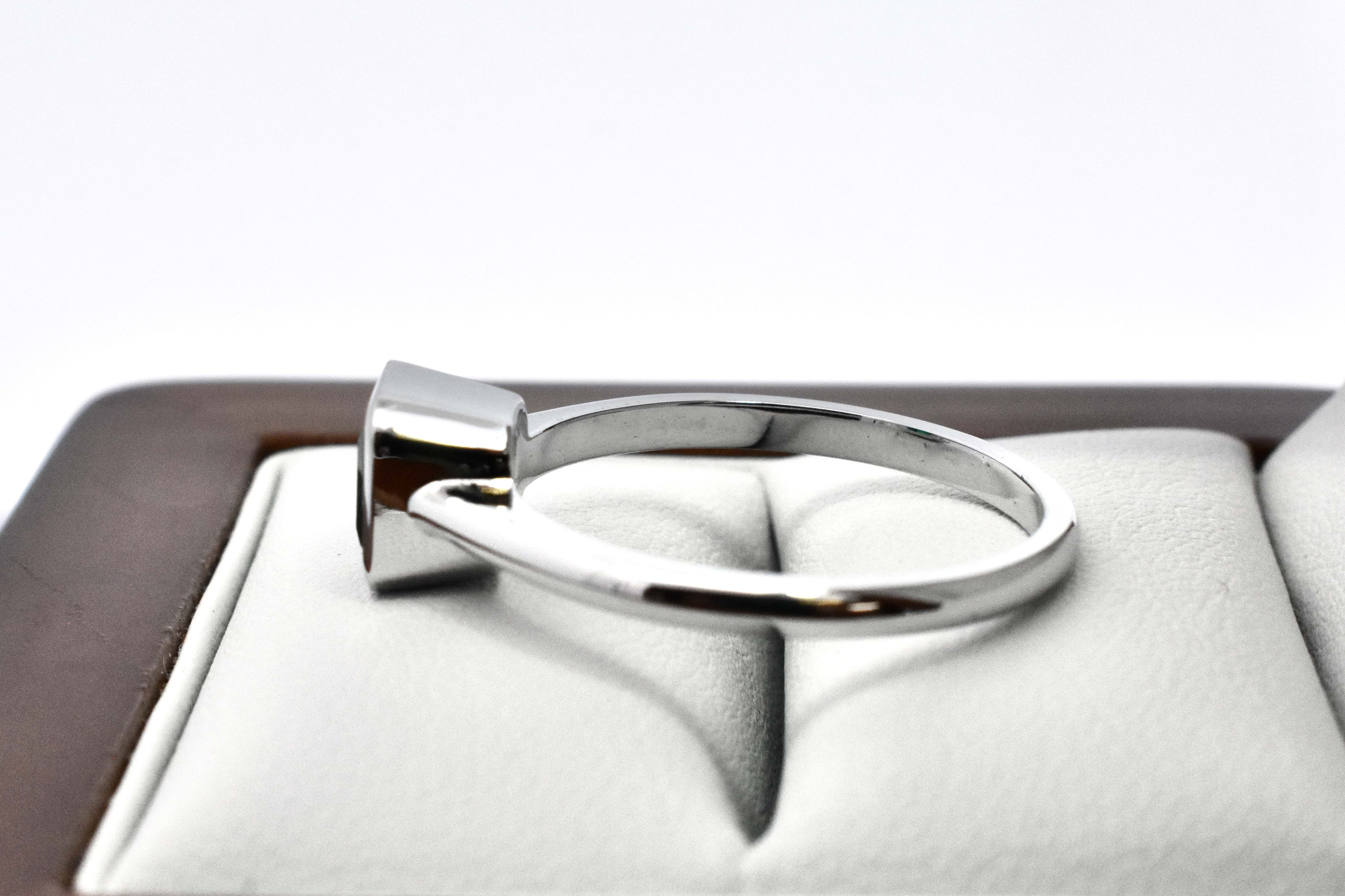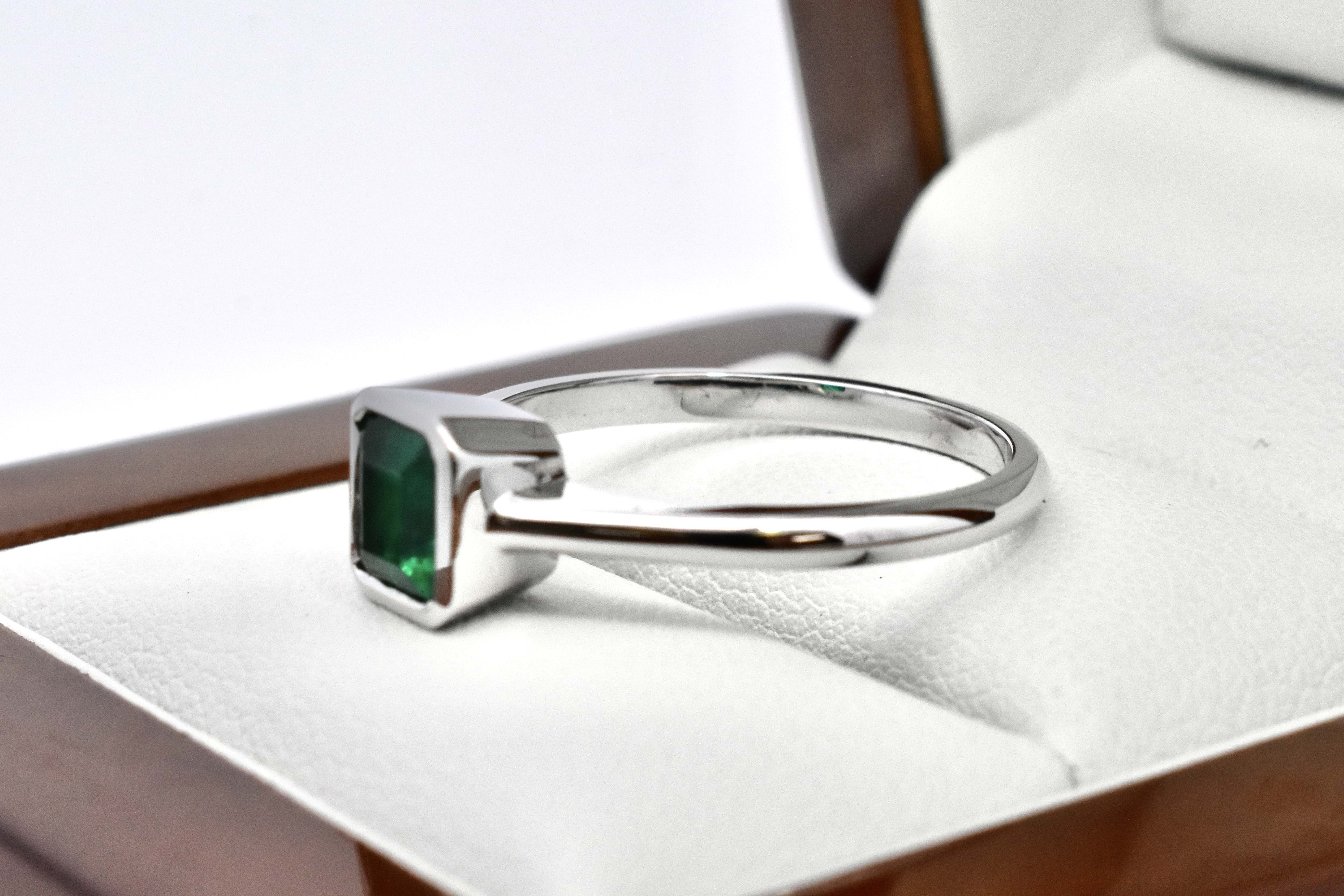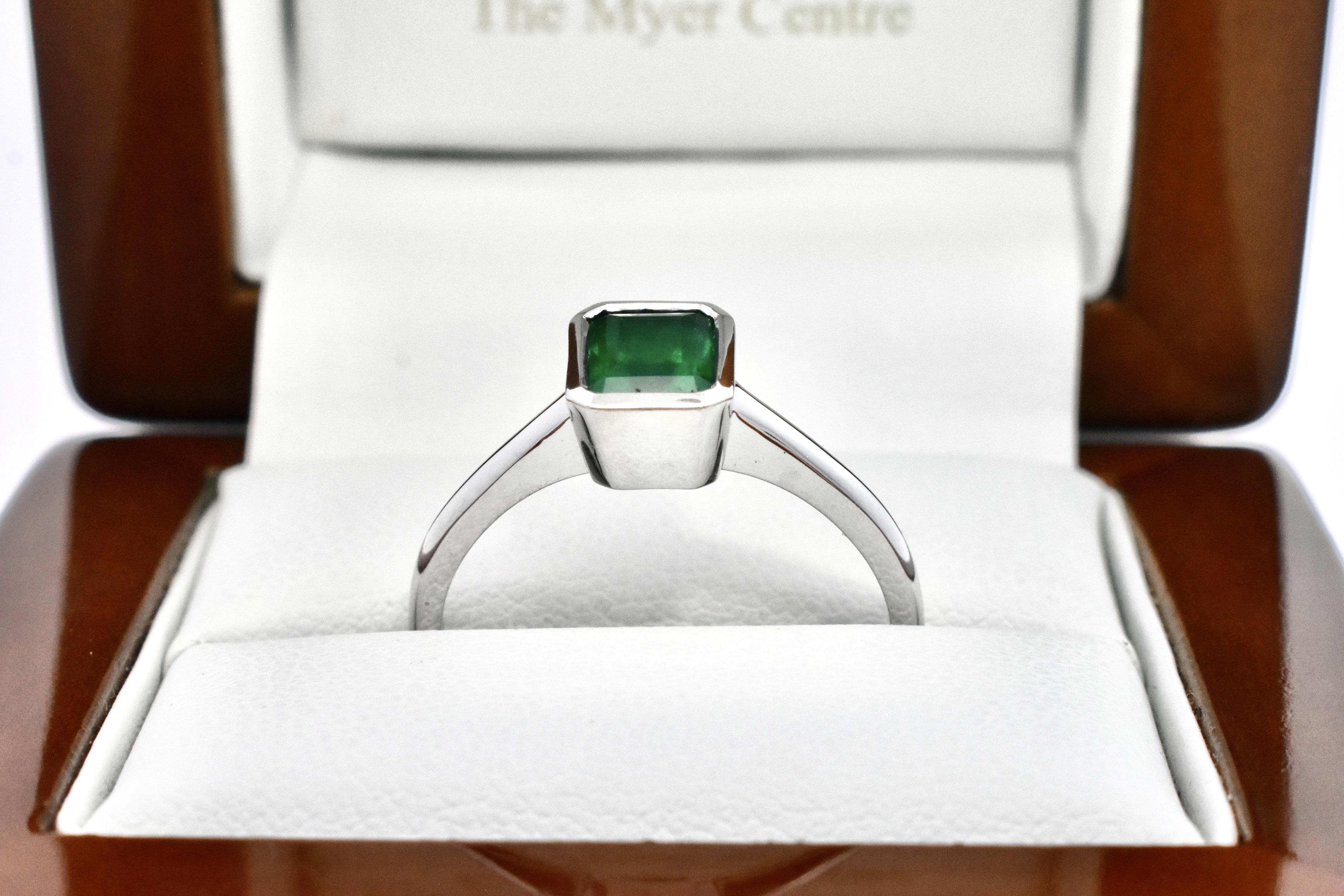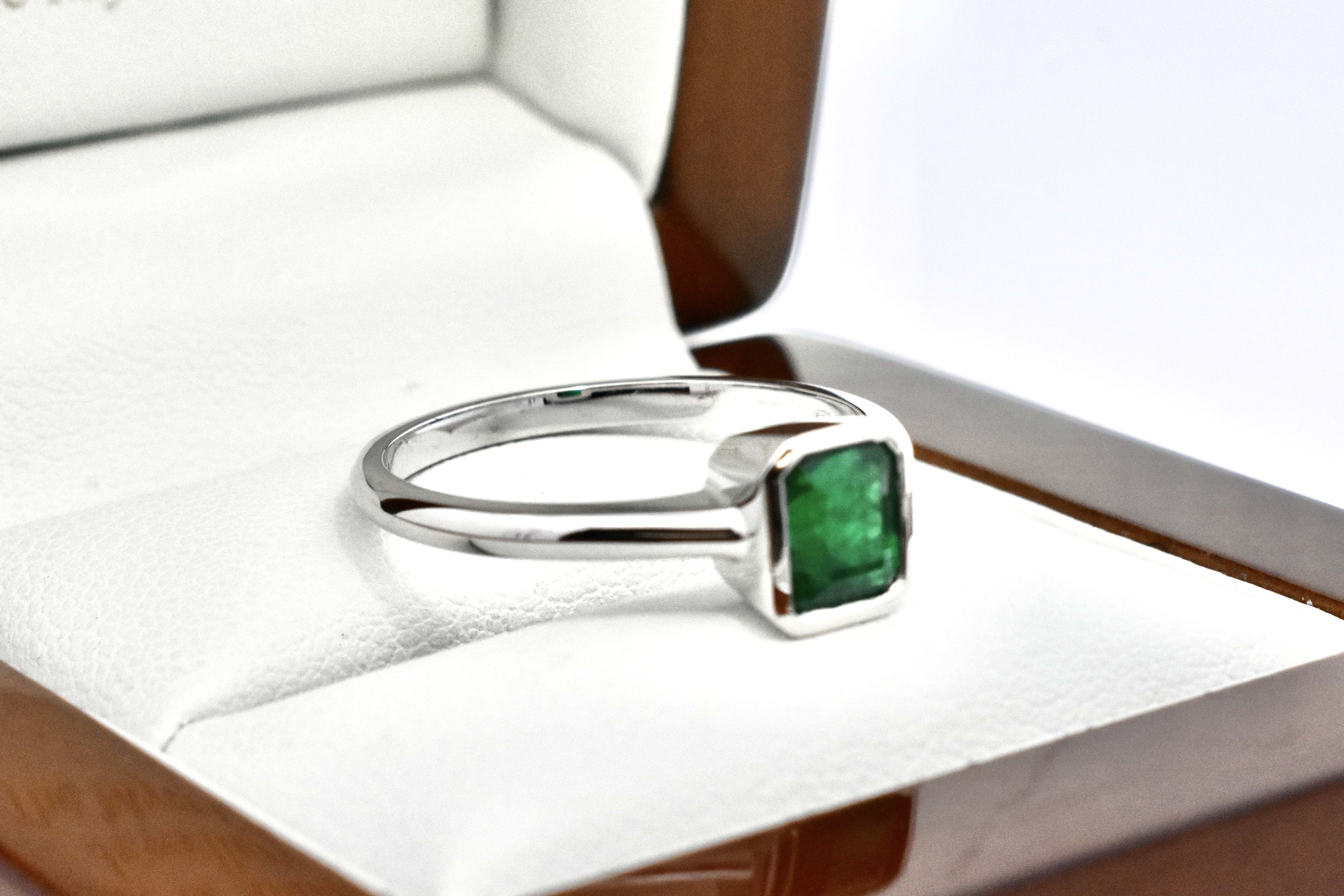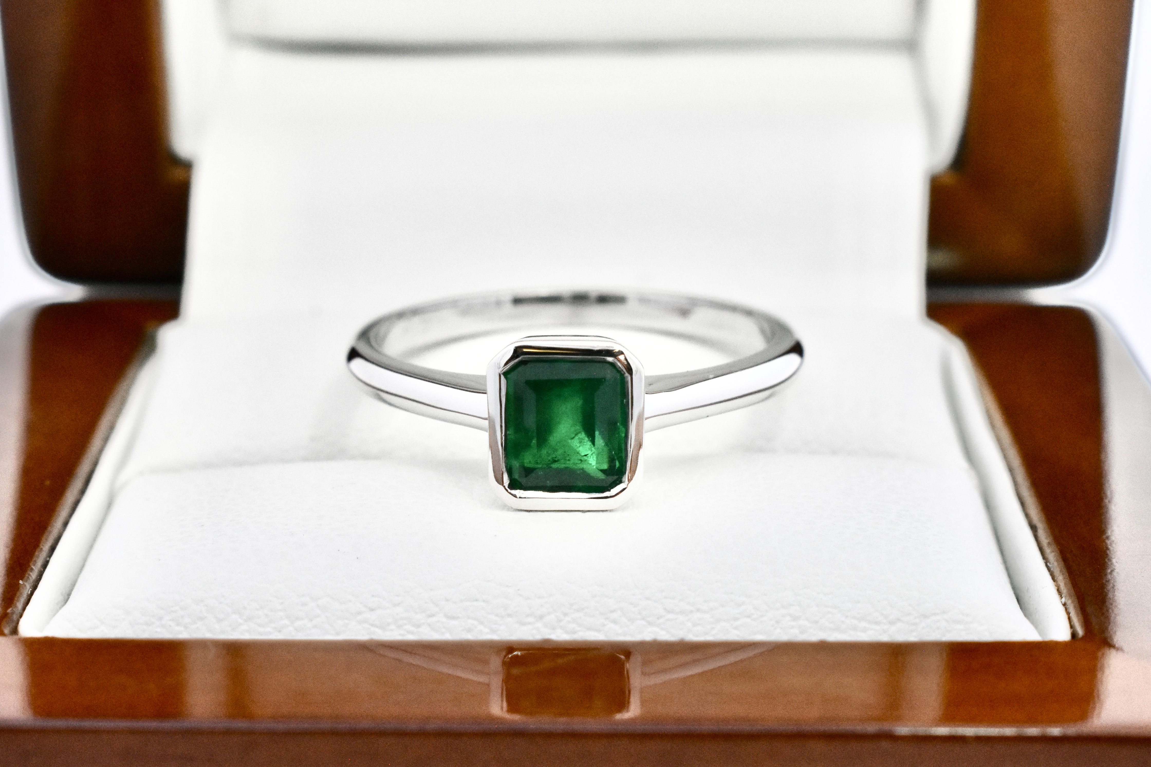 A gorgeous, 0.96ct, Colombian emerald sourced for our client to the feature of this simple and timeless 18ct white gold bezel set dress ring. Independent Valuation Supplied.