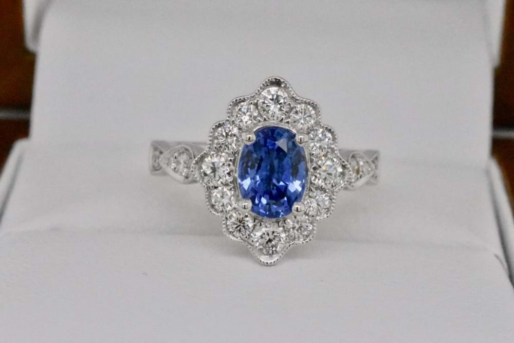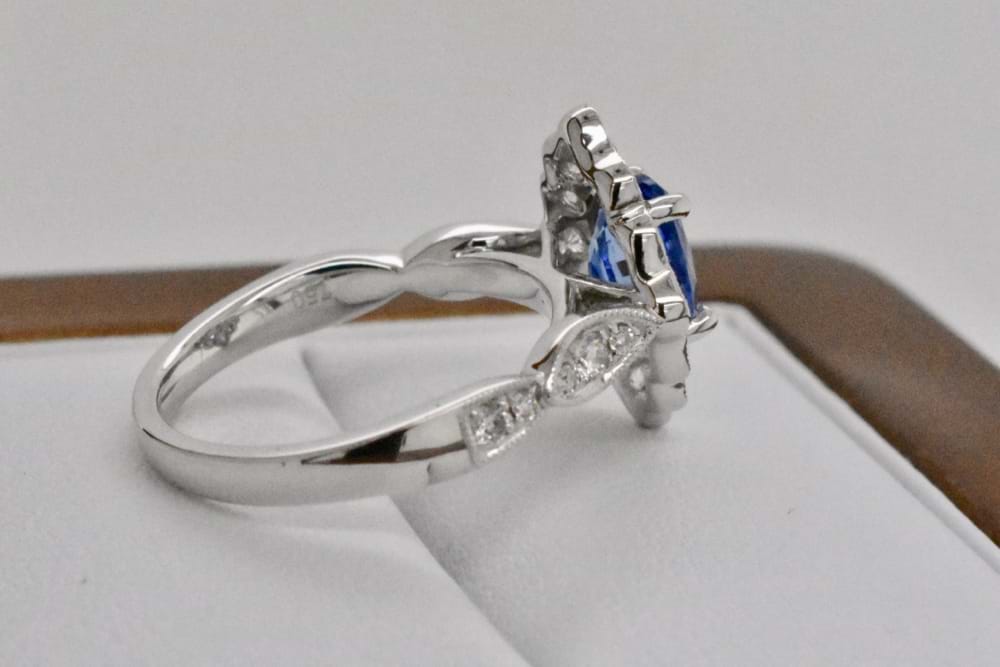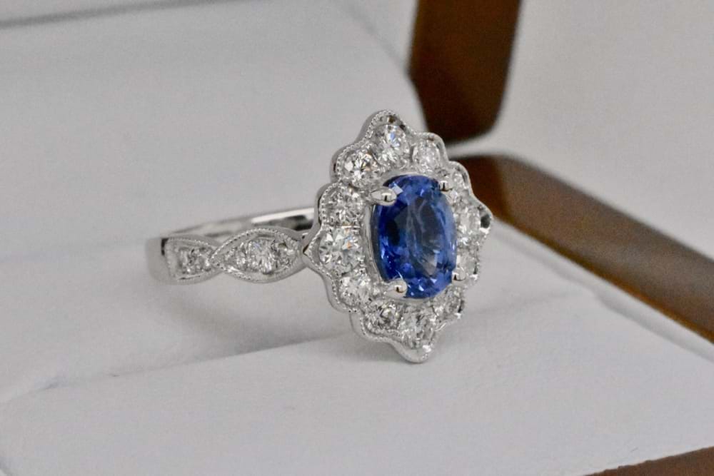 Alongside one of our in store designers this gorgeous 1.40ct Ceylon sapphire was chosen to be the focus of this stunning engagement ring. Crafted in 18ct white gold the ring features a halo of round diamonds in a scalloped setting giving the oval sapphire a soft marquise shape with more diamonds continuing down the band. The ring contains a total diamond content of 0.65cts and of course will sit beautifully with wedding bands in the future. Independent Valuation Supplied. Independent Valuation Supplied.