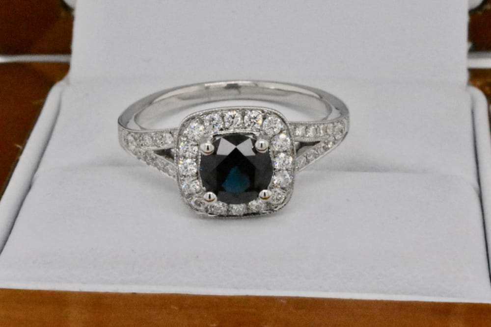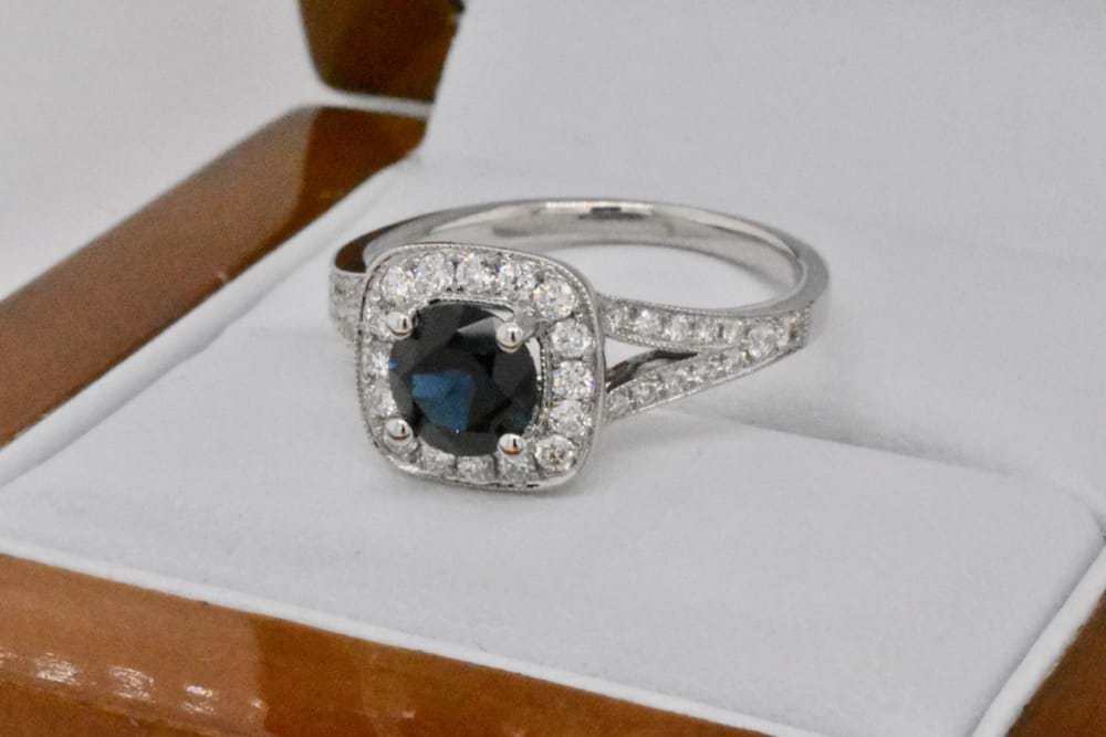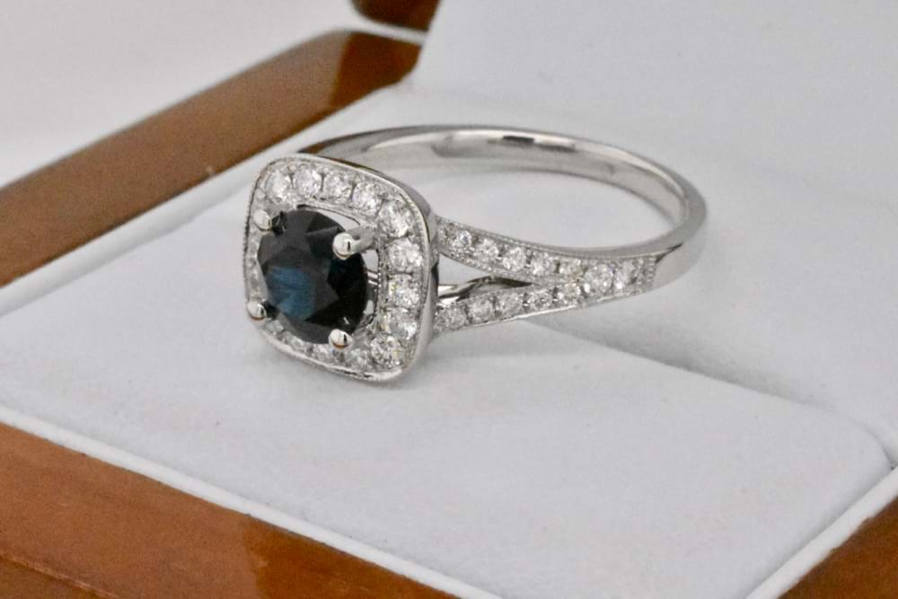 A stunning 1.02ct Australian blue sapphire was chosen to be the center piece of this Art Deco inspired engagement ring. Crafted in 18ct white gold it contains 26 round brilliant cut diamonds in the halo and down the split shoulders, all grain set with a mill grain edge. Total diamond content equals 0.45cts. Independent Valuation Supplied. If you are inspired by this archived design contact us today to discuss how we can create something incredible for you or your loved one.