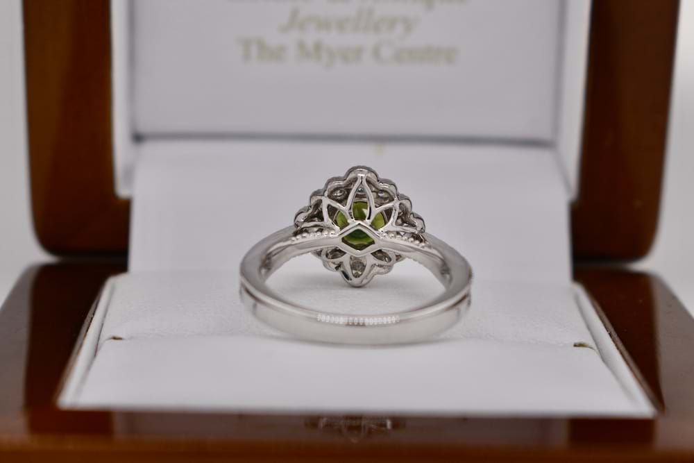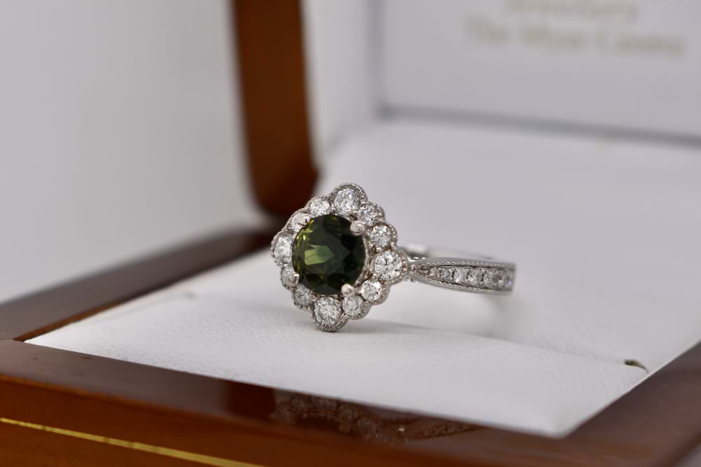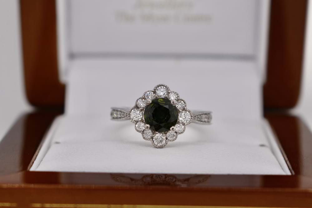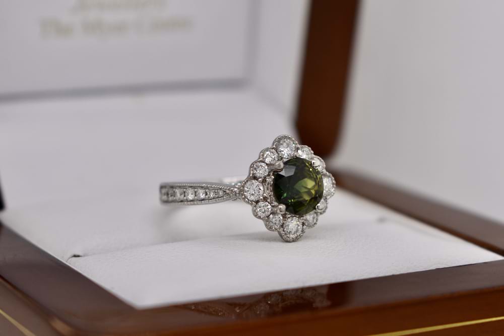 This lovely 1.06ct green sapphire was hand selected for both its beauty and also its Australian origin. Set into a timeless and beautiful scalloped marquise shape halo in 18ct white gold and set with shimmering round brilliant cut diamonds this engagement ring is designed to sit perfectly with a plain or diamond set wedding band. Independent Valuation Supplied. This bespoke creation is being enjoyed by its new owner, if you are inspired by this archived design contact us today to discuss how we can create something incredible for you or your loved one.