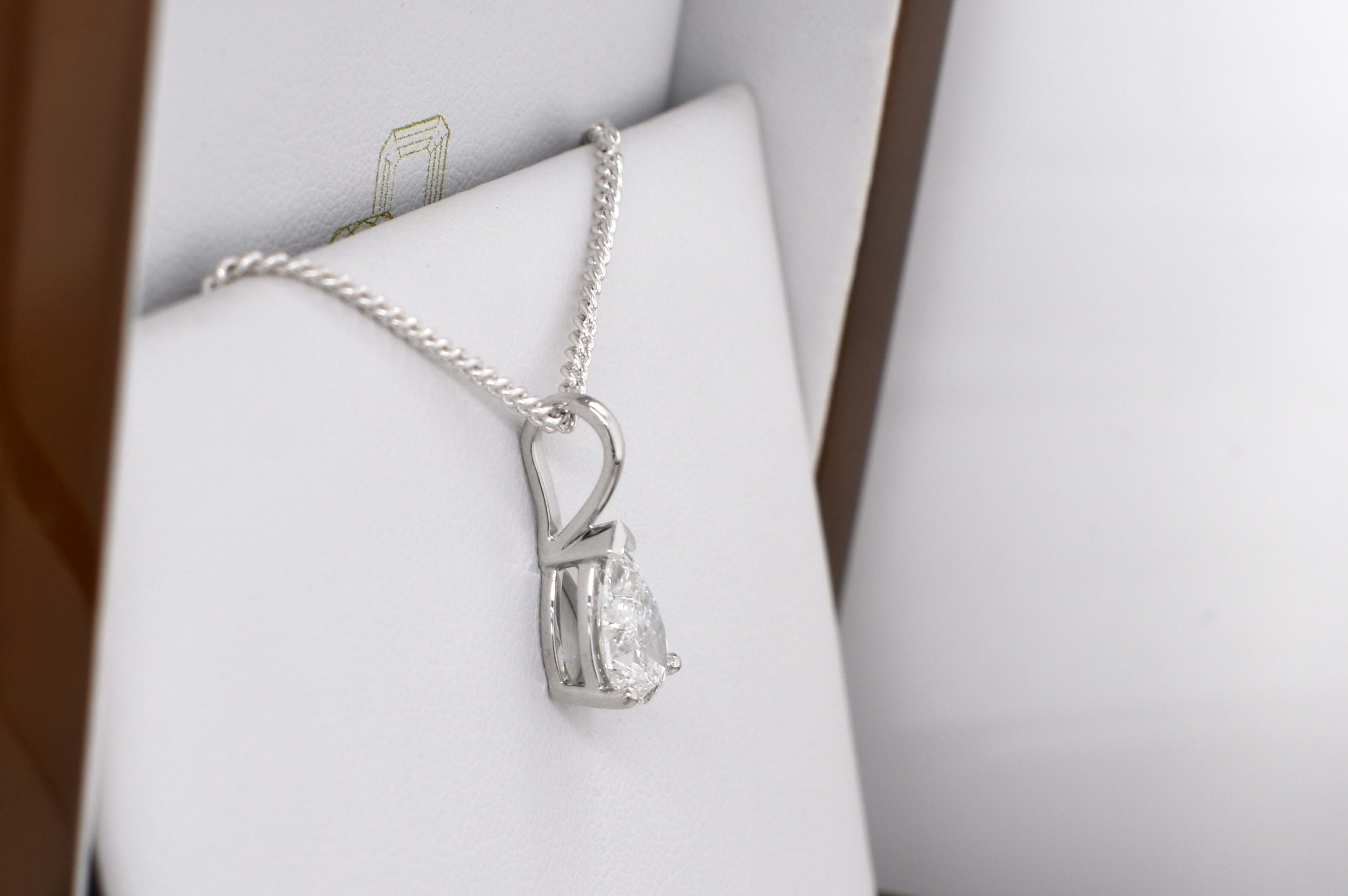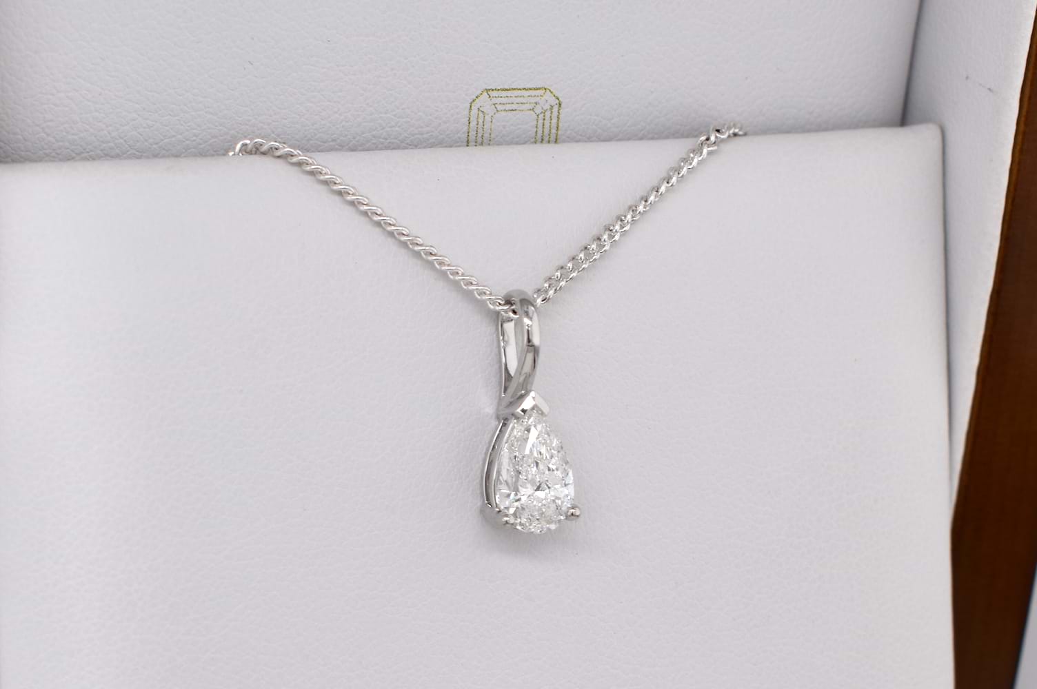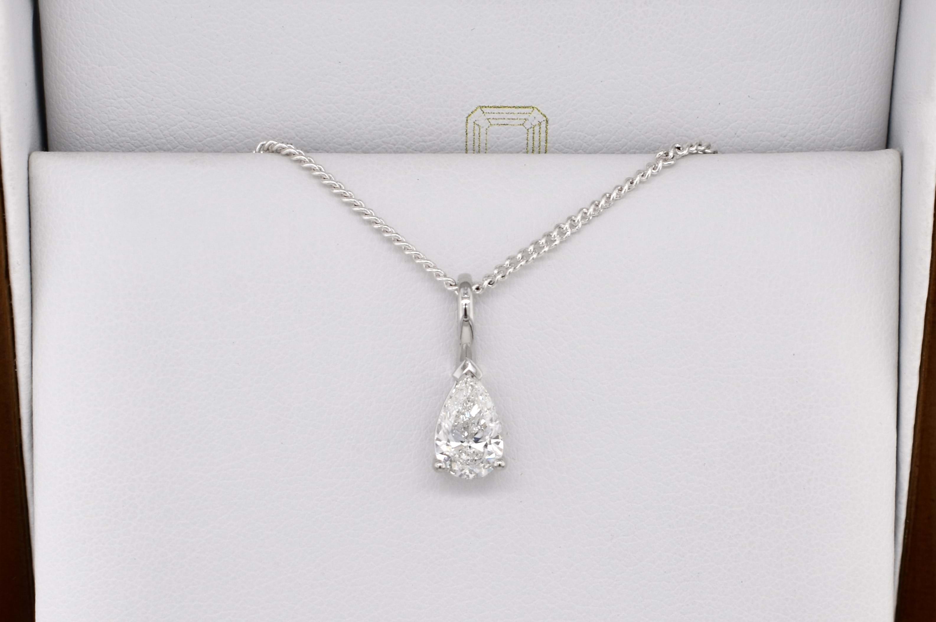 This stunning 1.20ct pearshape diamond was sourced especially for our client and chosen for it's beautiful refraction and bright white colour. Designed into a classic and timeless 18ct white gold cap & two claw pendant, with a sleek bale to fit over multiple of our clients existing chains. GIA & Independent Valuation Supplied.