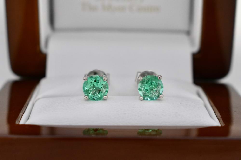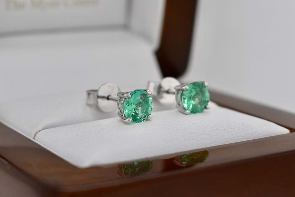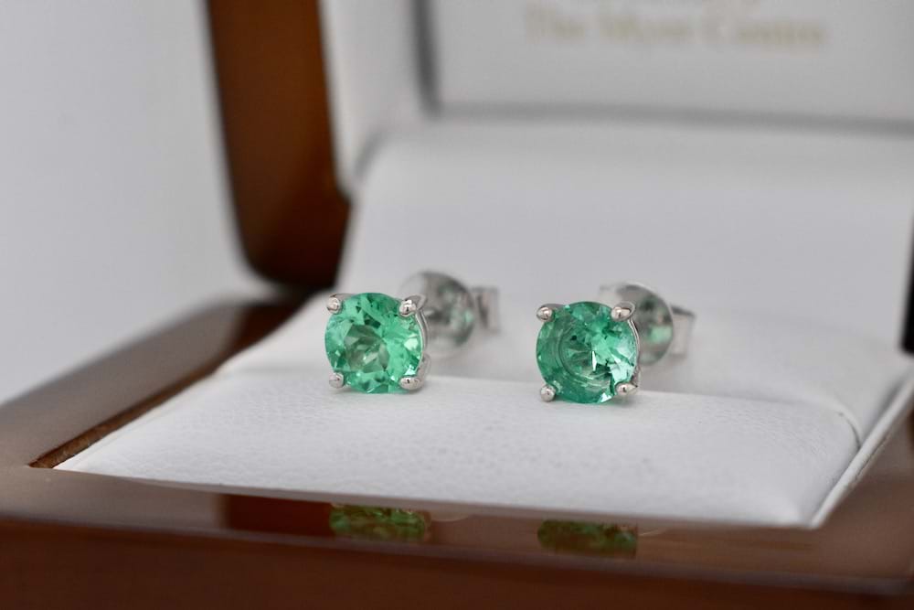 Stunning matched pair of Colombian emeralds totalling 1.26cts and graded as bright light-mid green hand chosen in store and set into 18ct white gold four claw stud fittings. Independent Valuation Supplied.