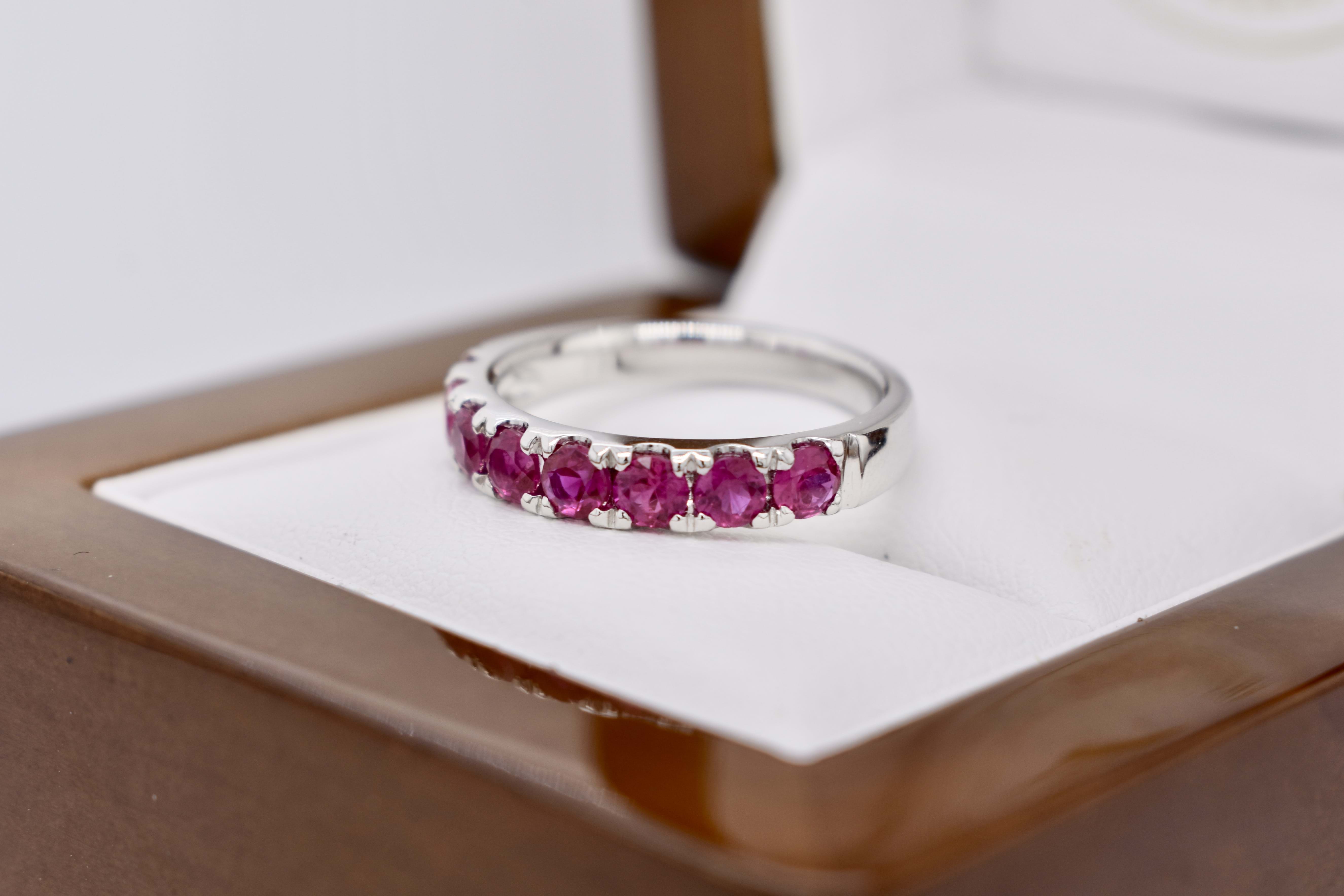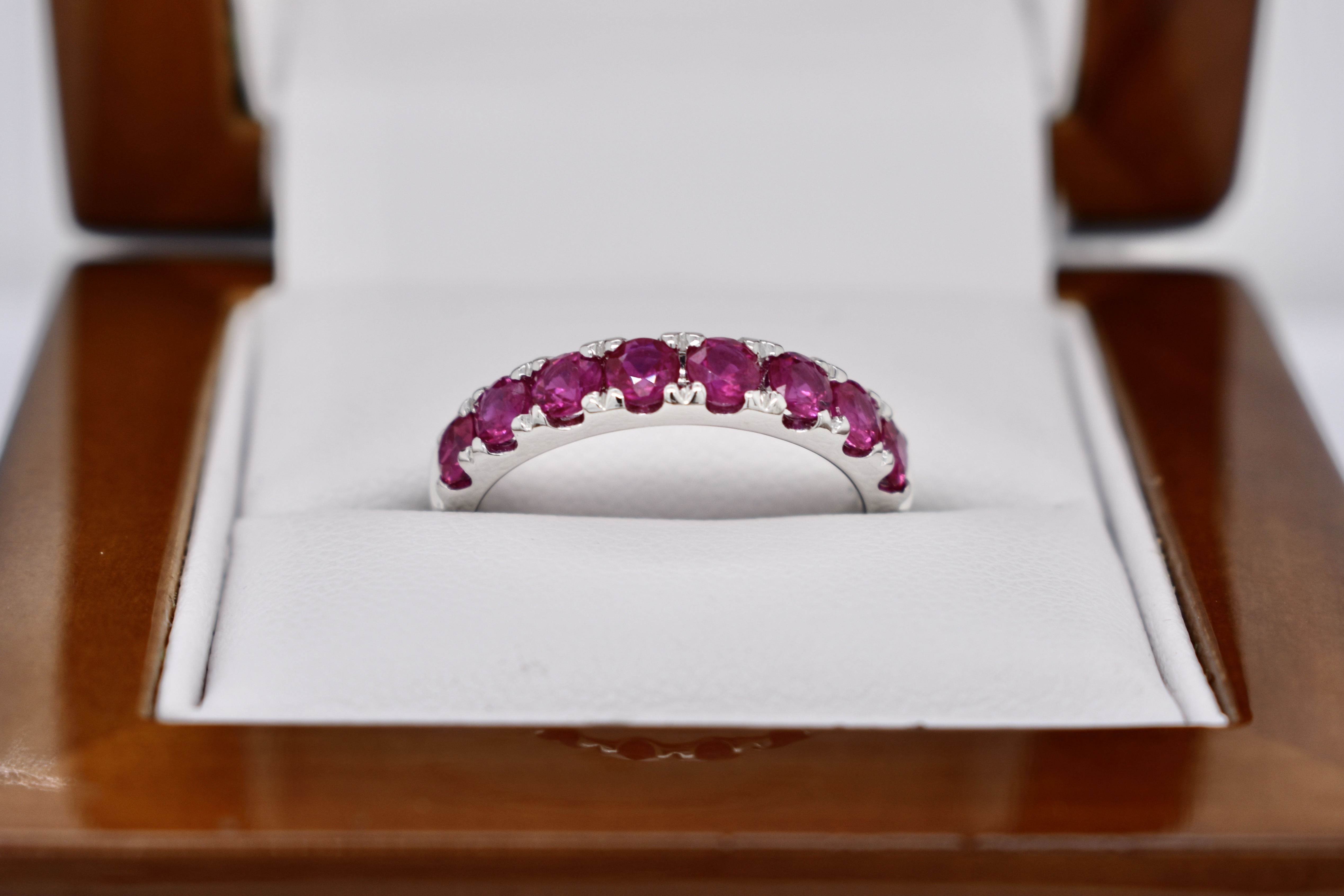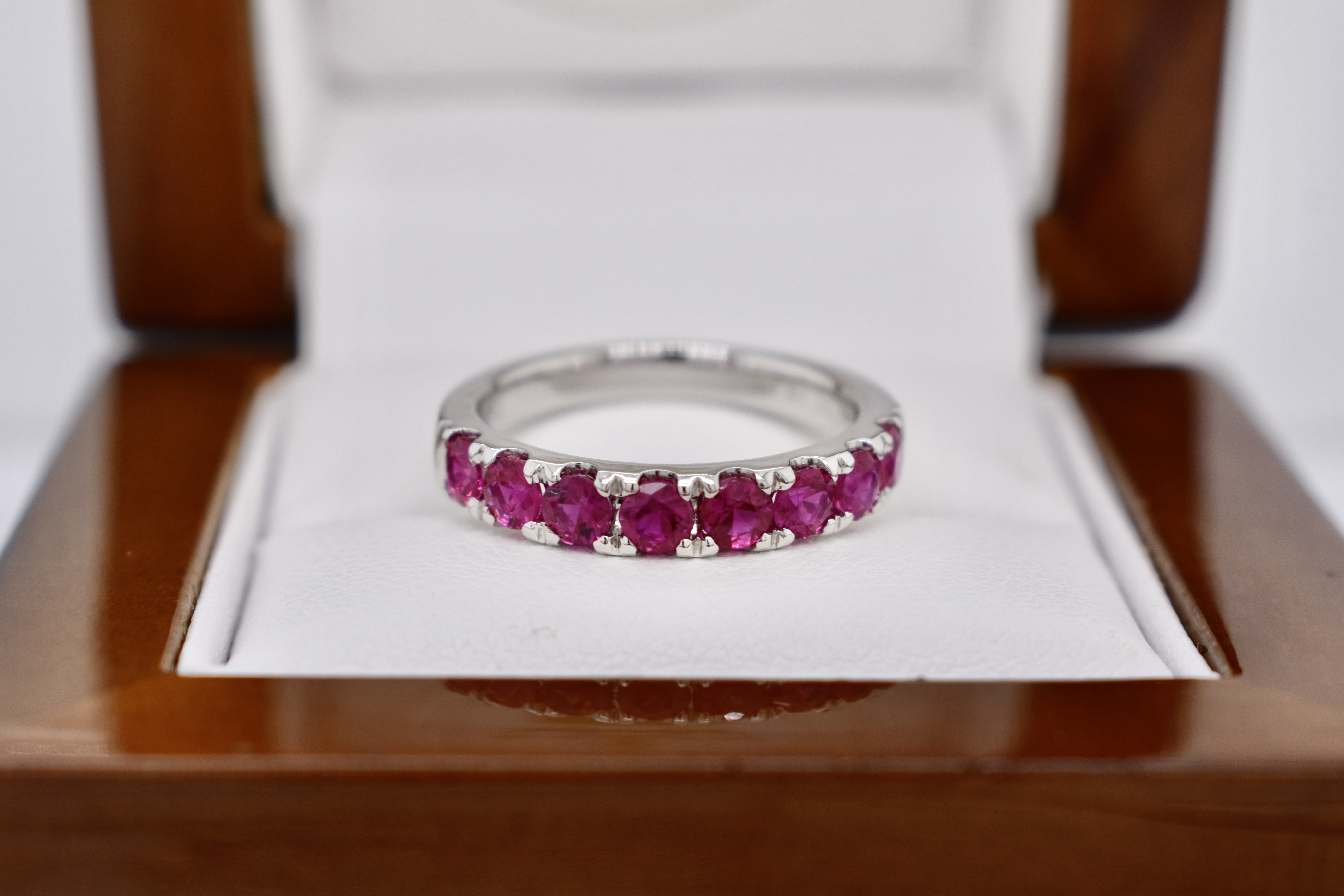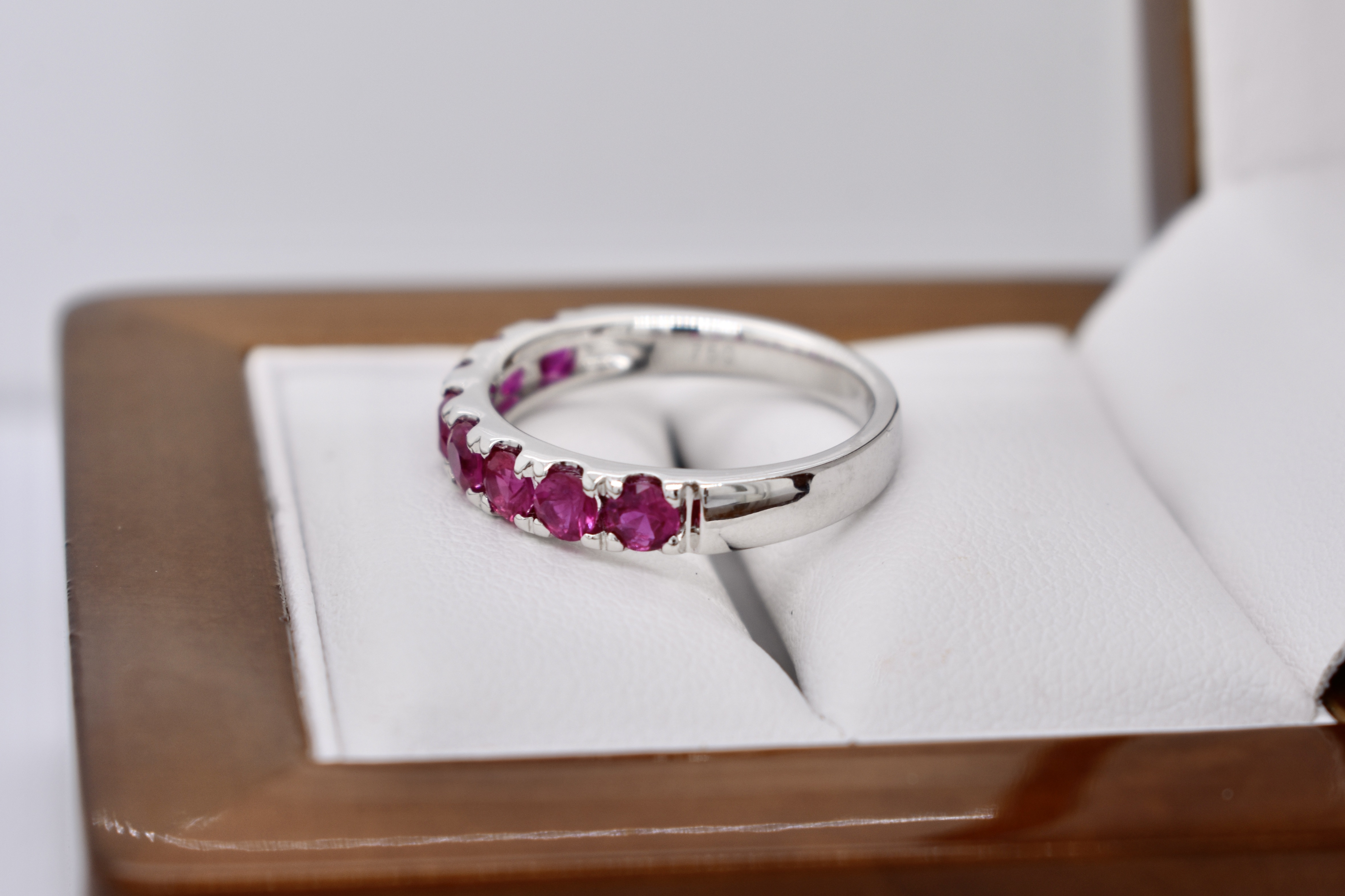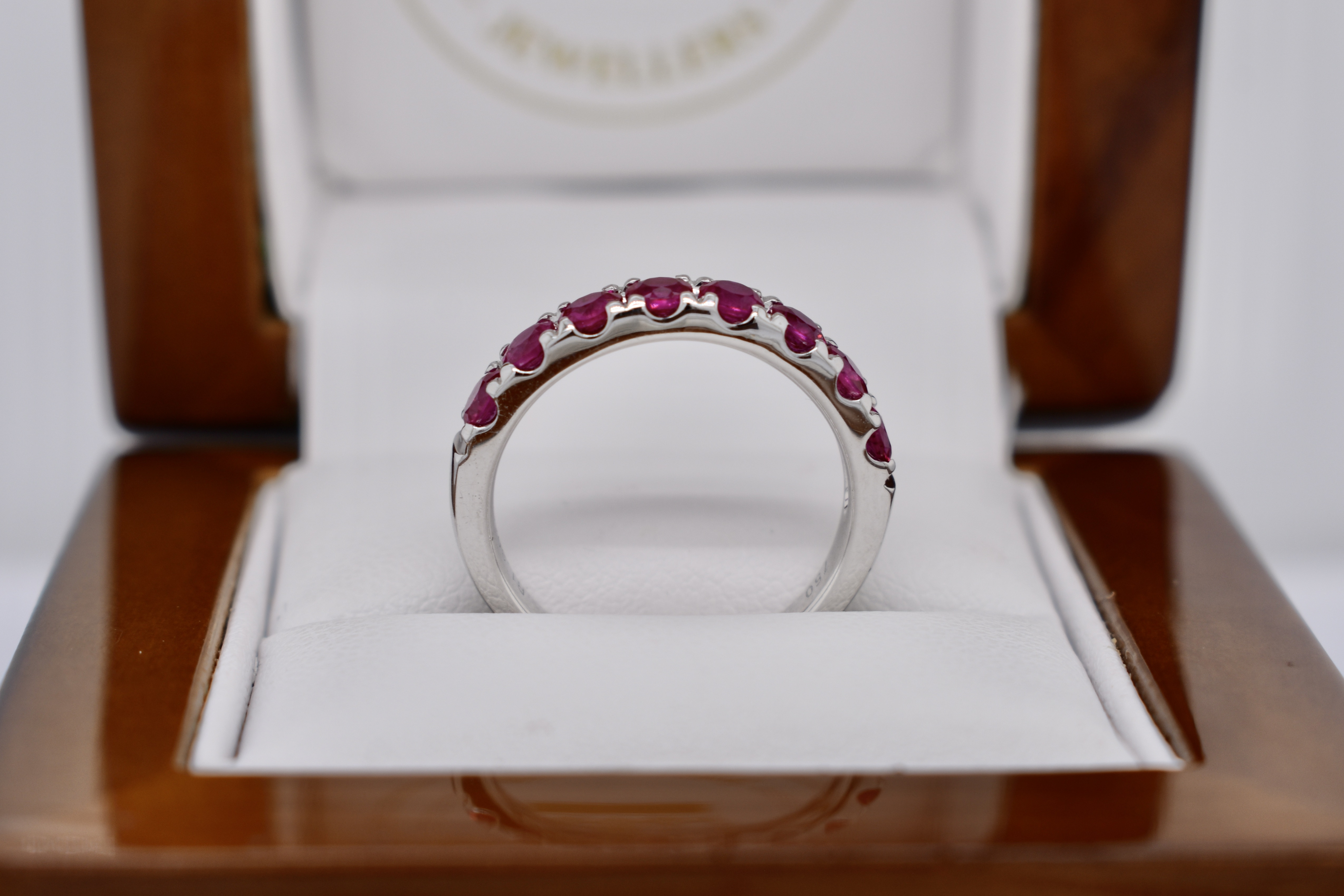 The simple nature of this design means it relies solely on the quality of the gemstones set within it. This 18ct white gold ring features eight, fine pink red, rubies totaling 1.30ct and makes a stunning solo ring whilst also complimented with diamond bands paired with it. Independent Valuation Supplied.