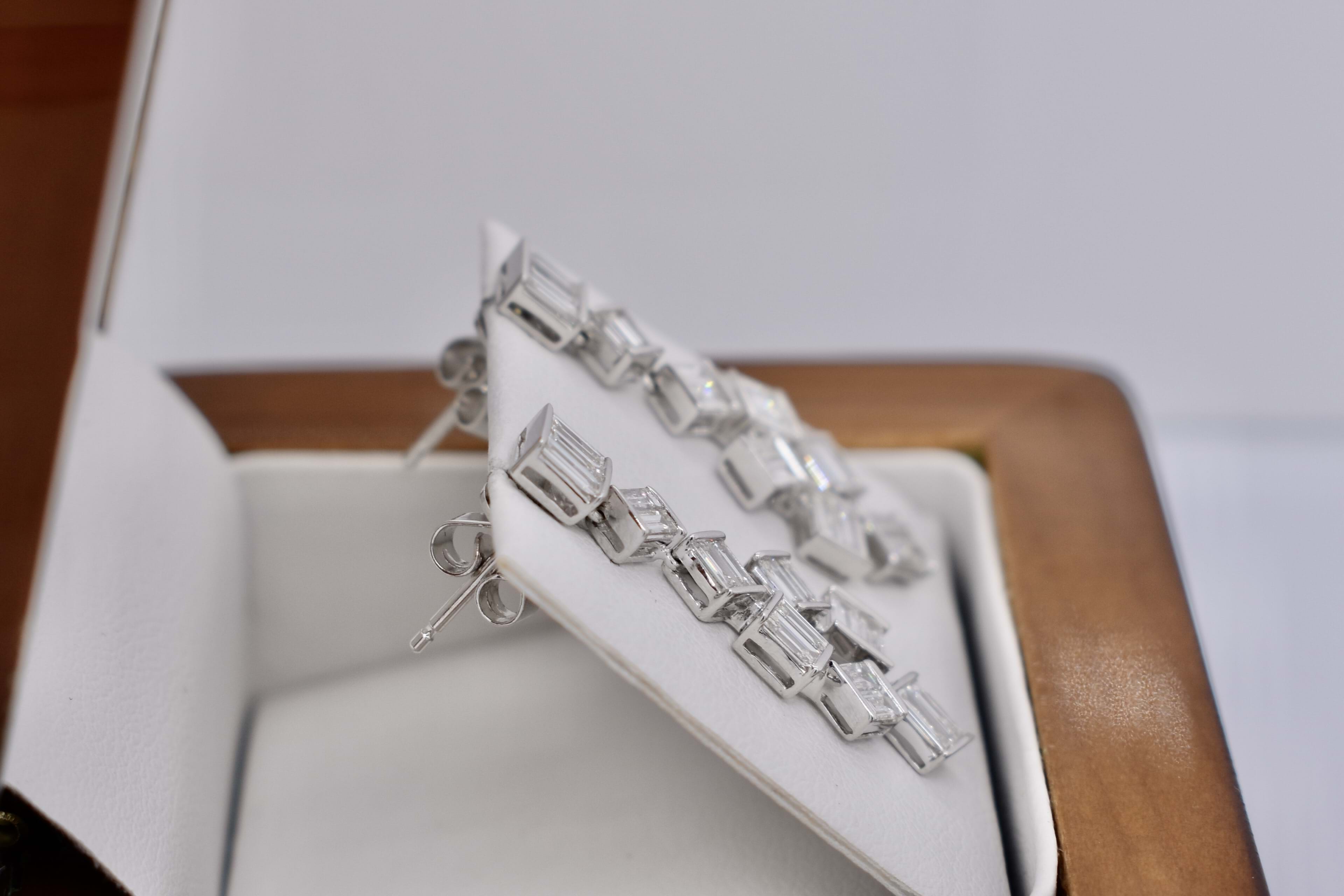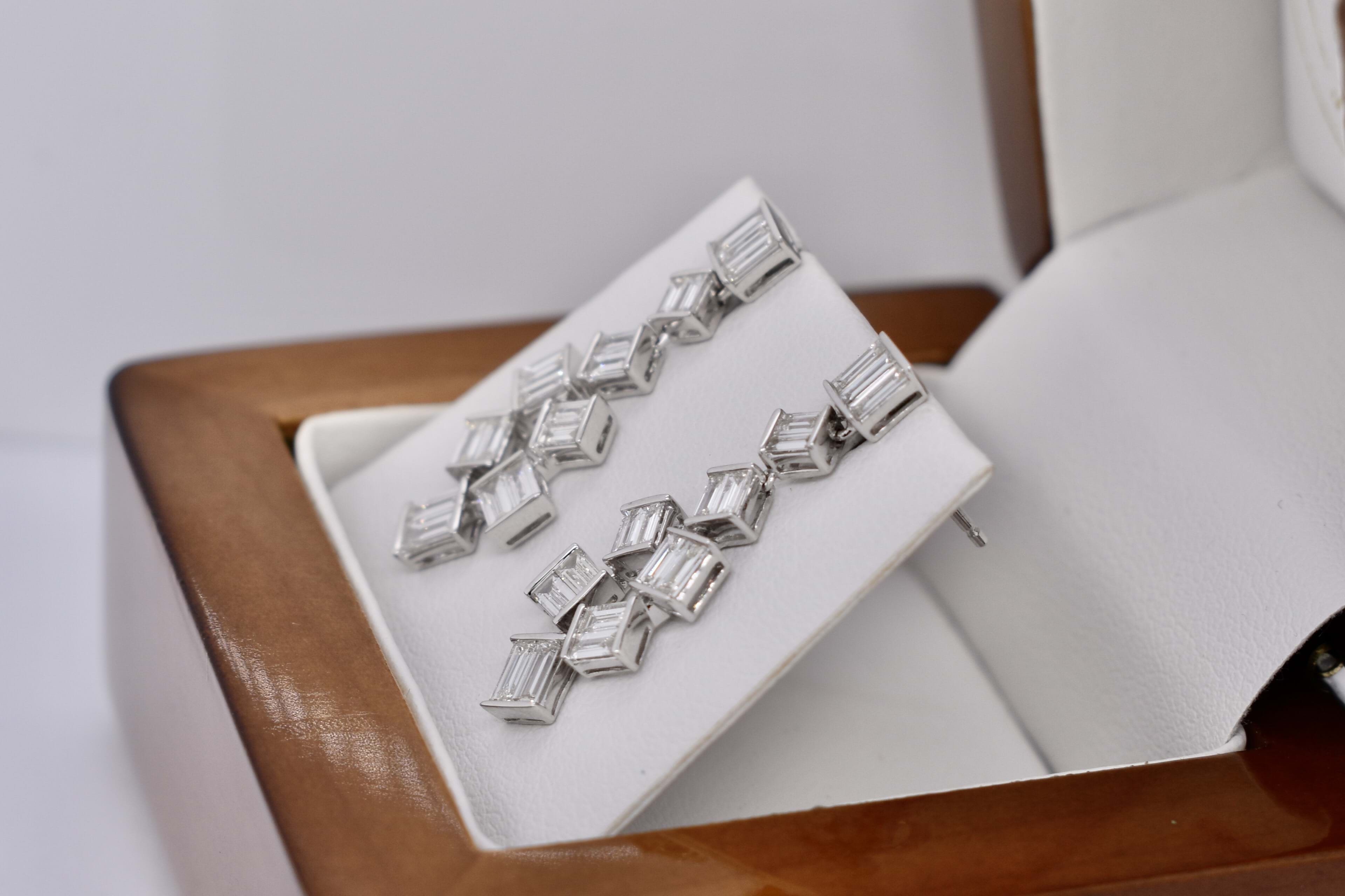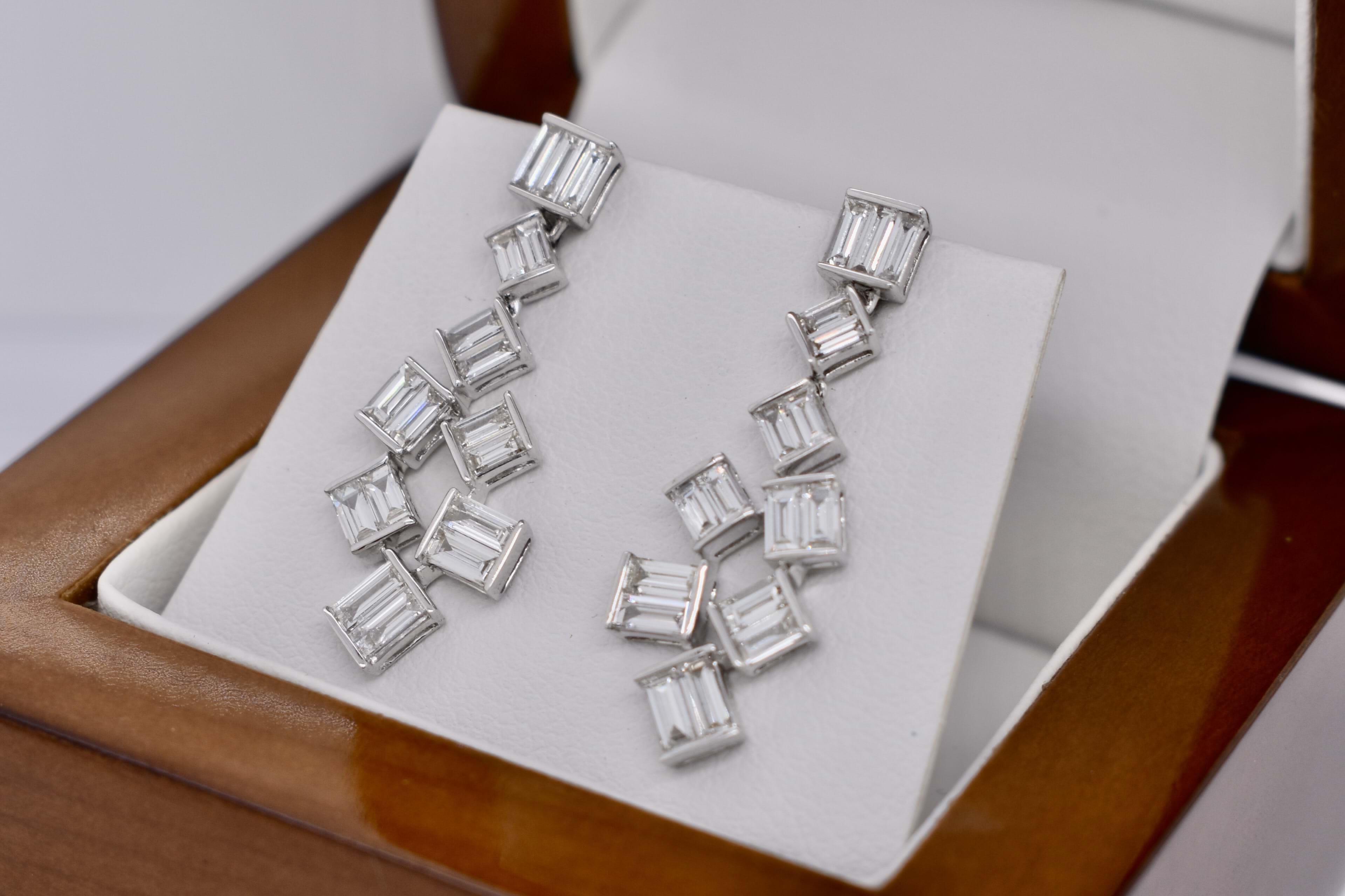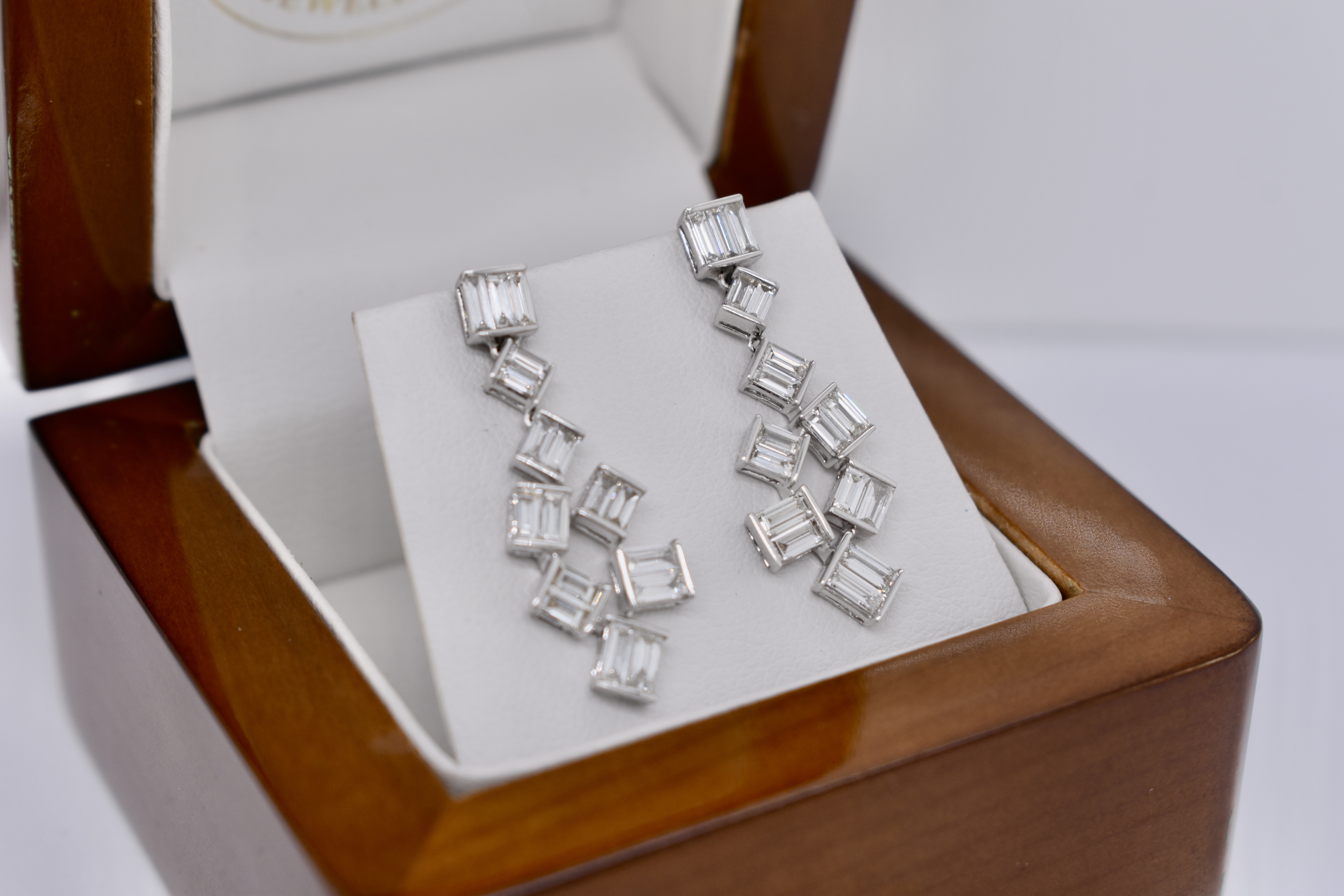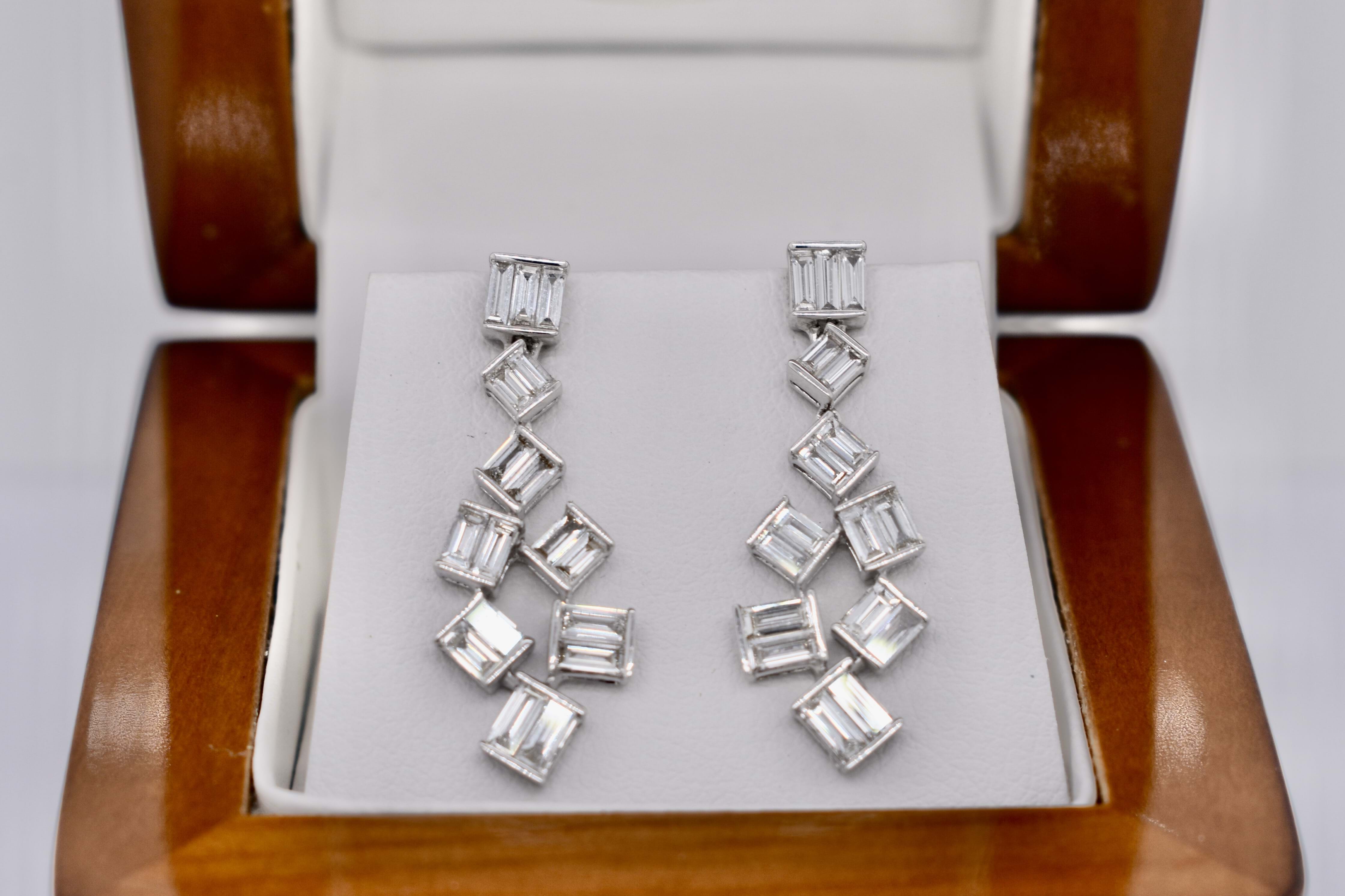 These stunning cascading diamond earrings have been crafted in 18ct white gold with two baguettes set into semi-bezel settings in a stud top with angular drop sections. The earrings contain a total of 34 baguette diamonds totalling 1.41ct FG/VS. Independent Valuation Supplied.