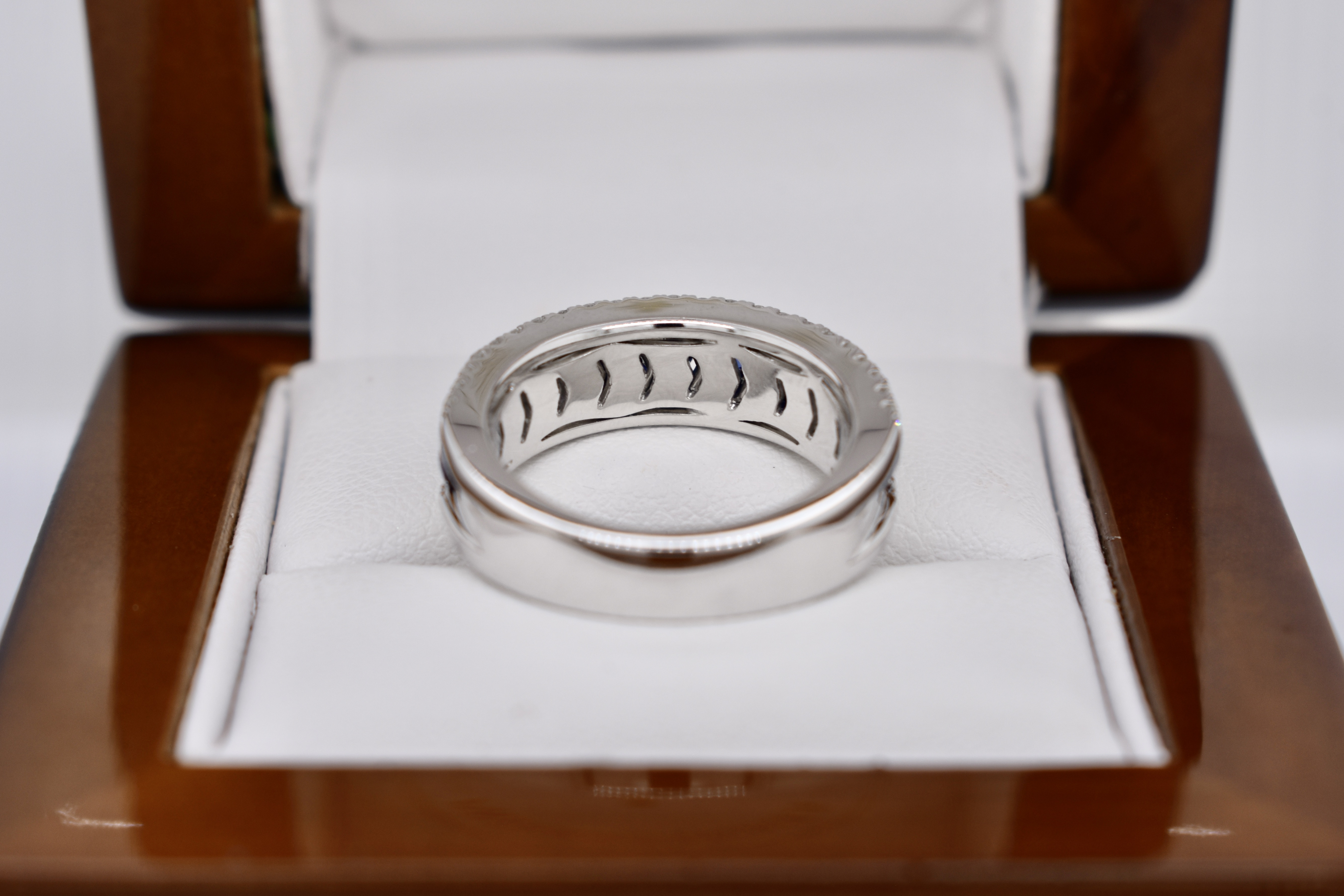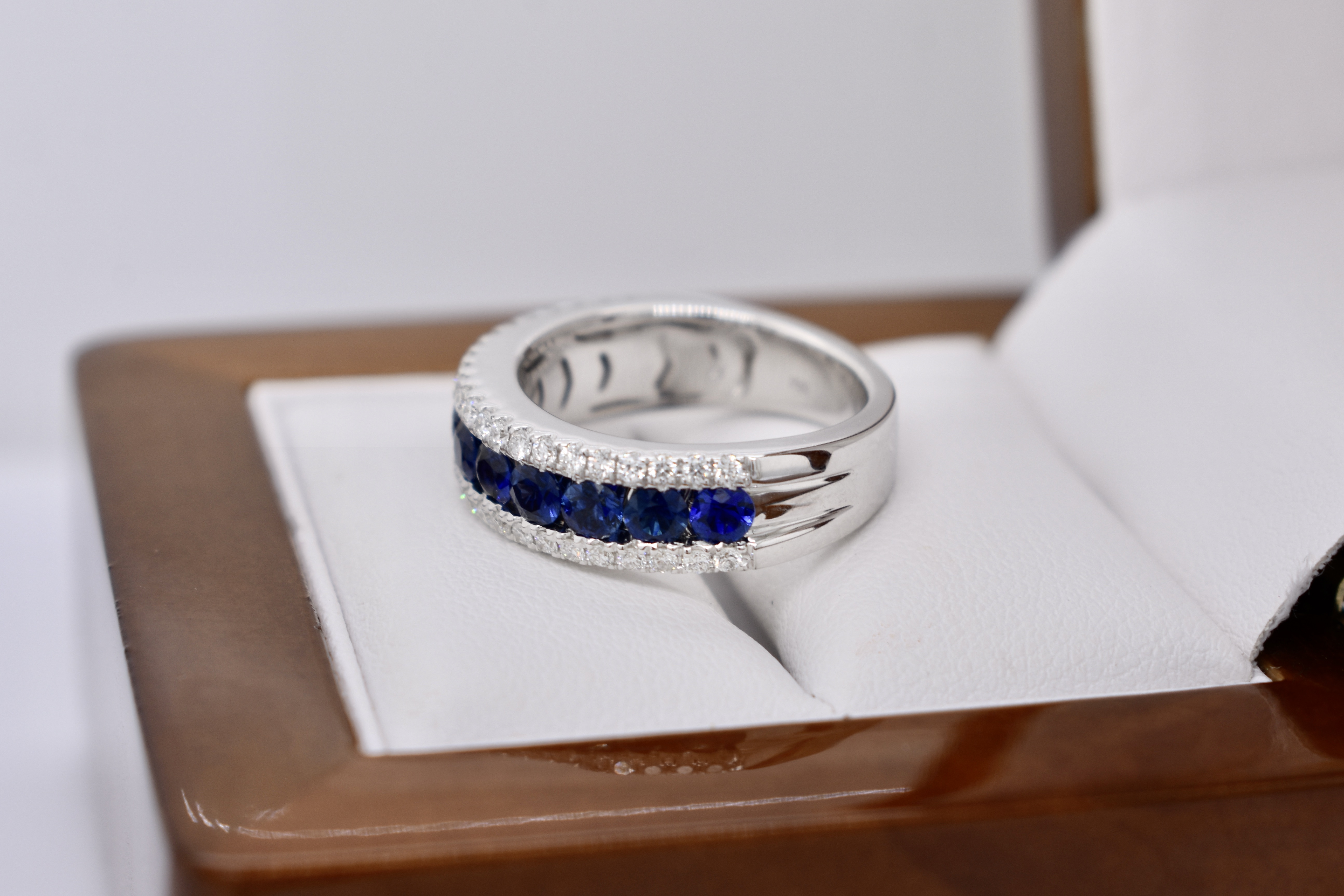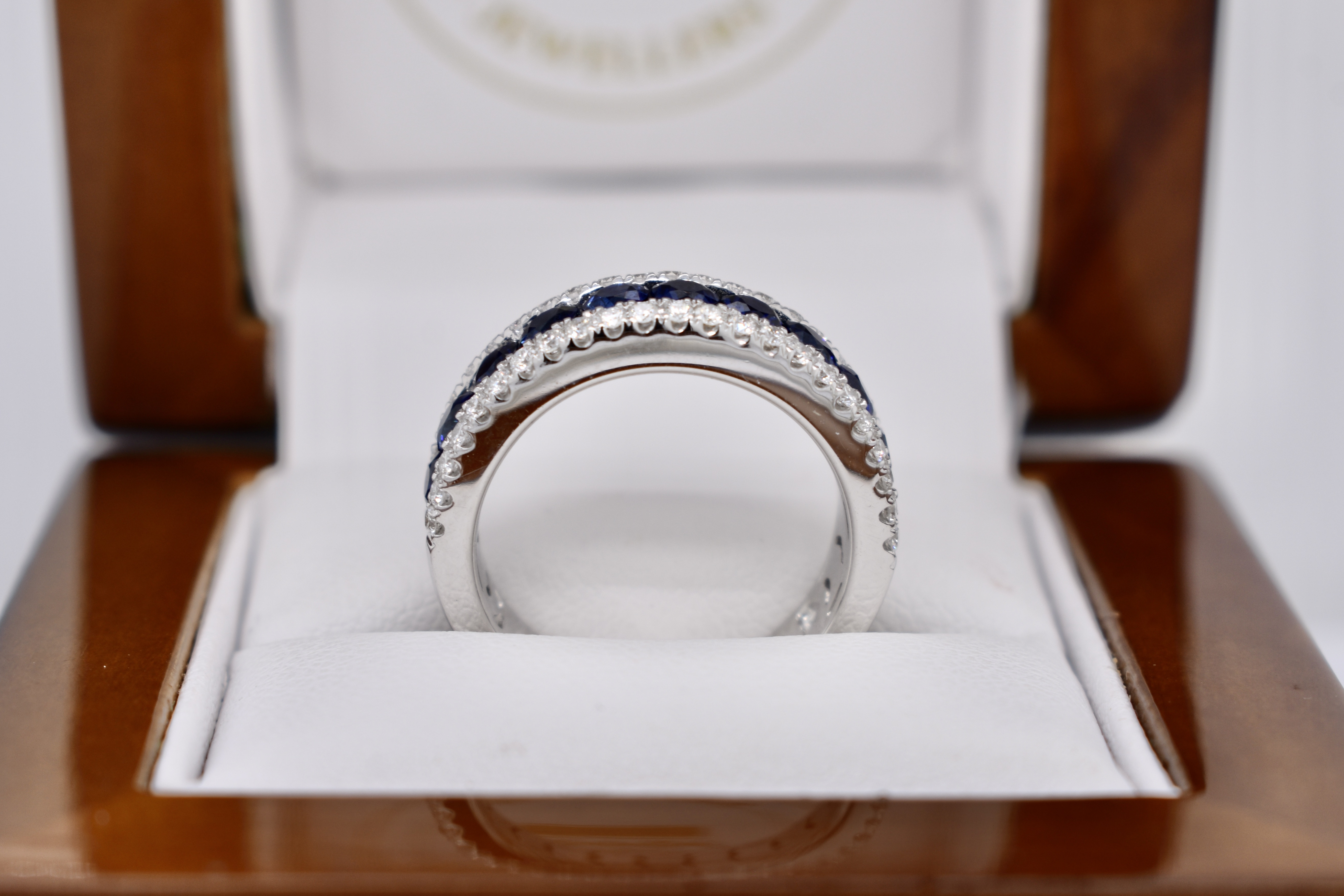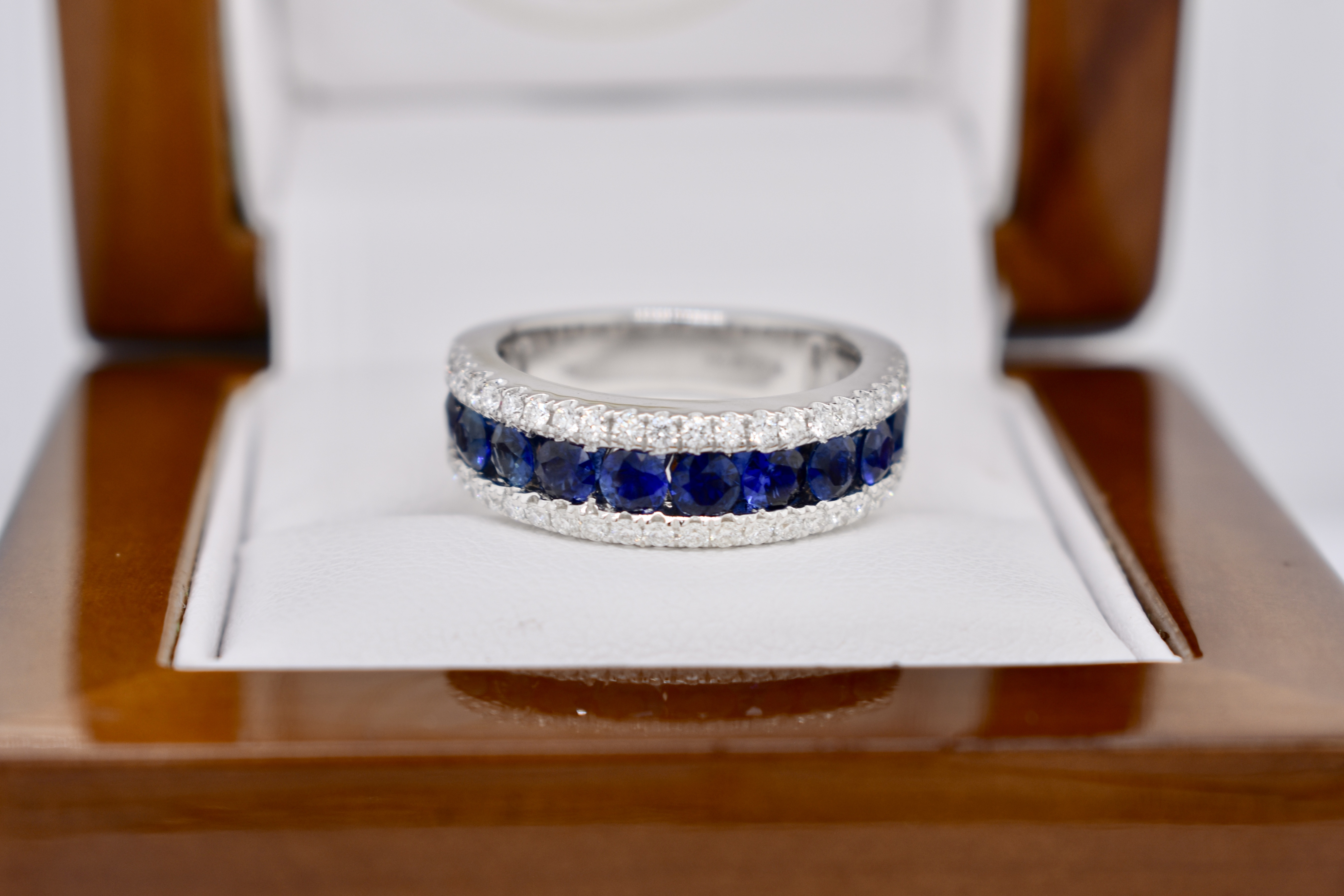 Featuring 11 spectacular, very fine royal blue, sapphires totaling 1.48ct channel set originally across the finger with a row of grain set white diamonds above and below totaling 0.48ct for contrast in 18ct white gold. Independent Valuation Supplied.