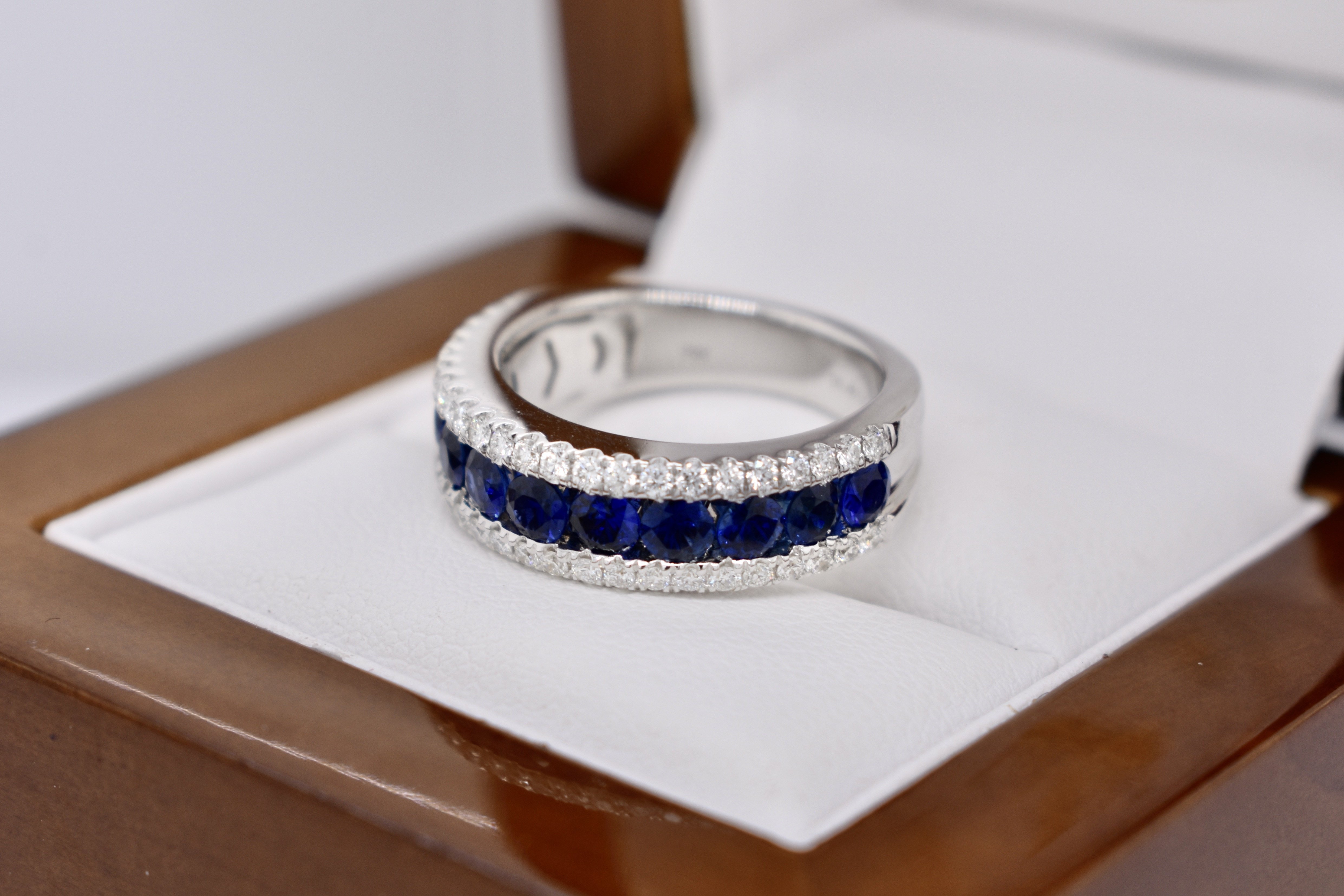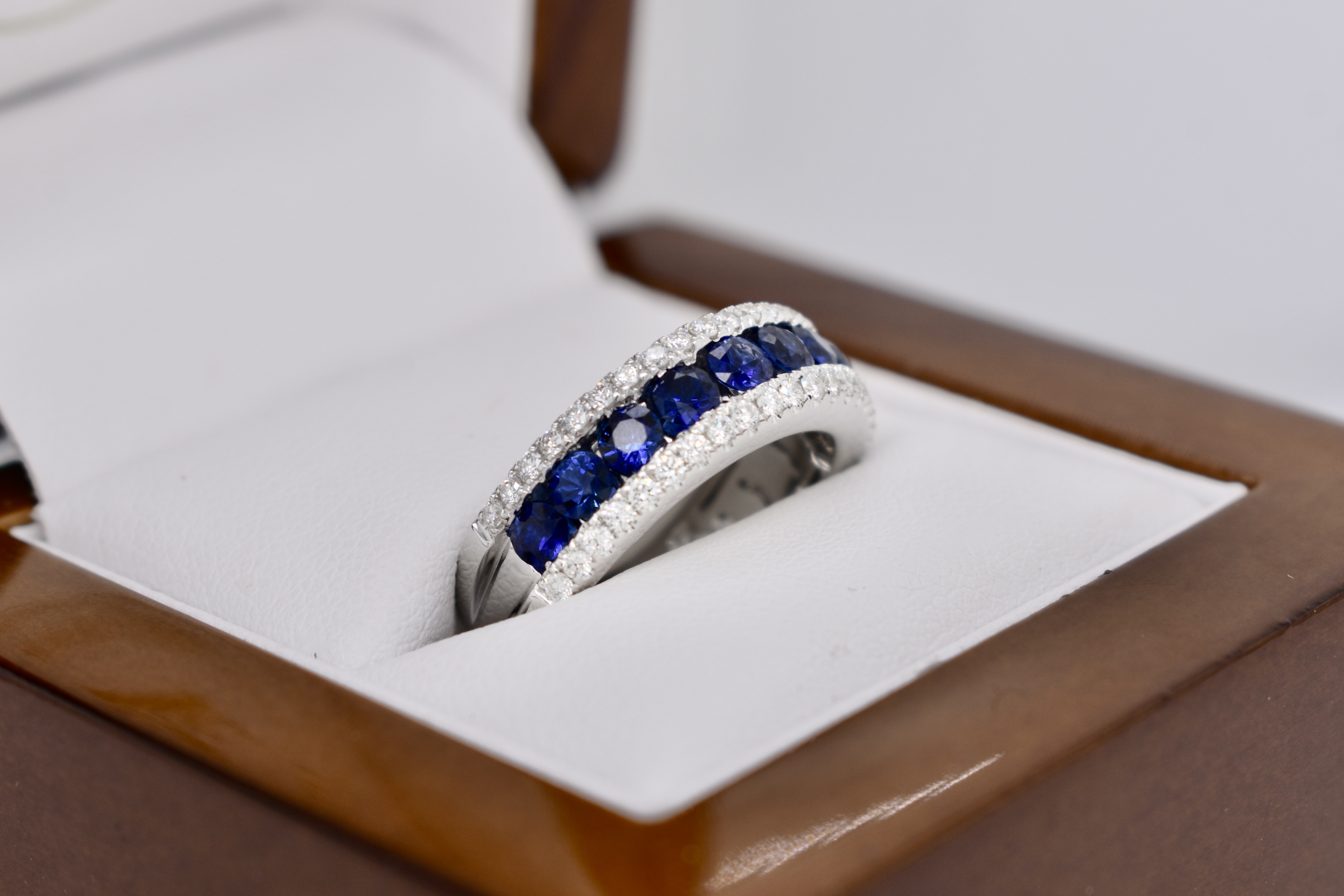 Featuring 11 spectacular, very fine royal blue, sapphires totaling 1.48ct channel set originally across the finger with a row of grain set white diamonds above and below totaling 0.48ct for contrast in 18ct white gold. Independent Valuation Supplied.
