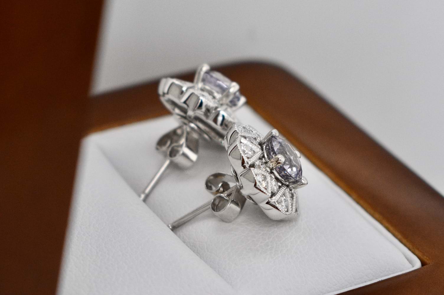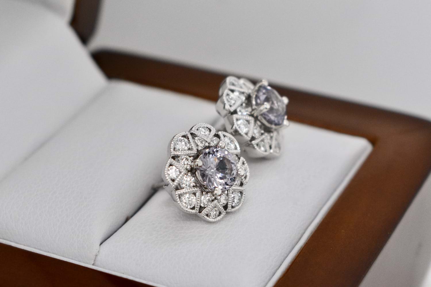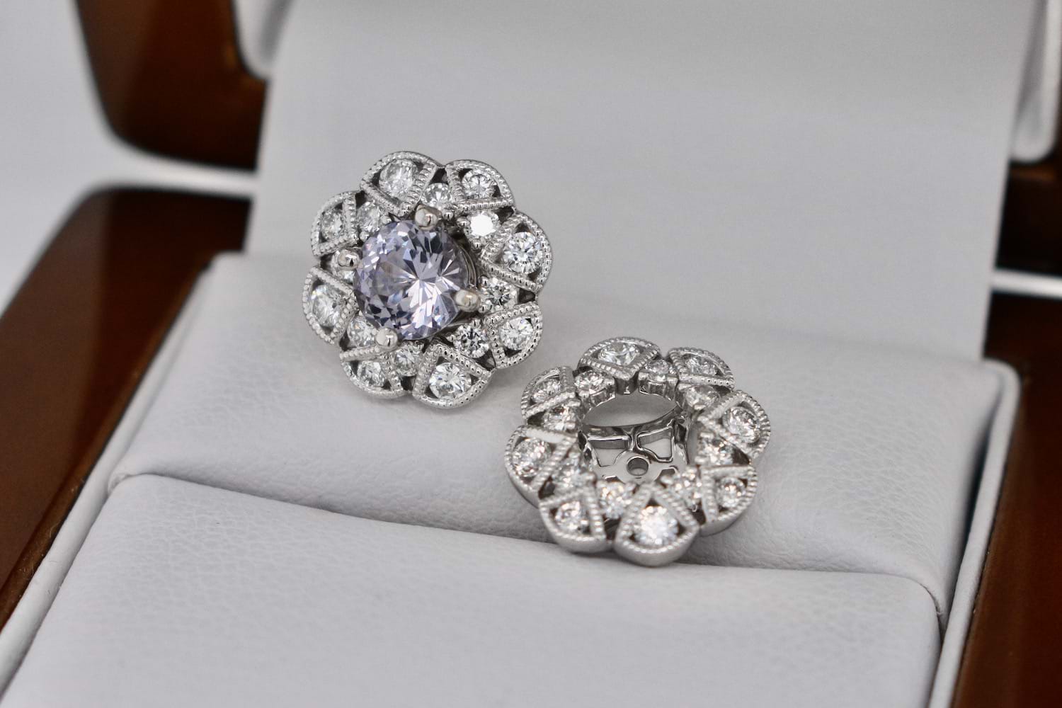 A striking pair of greyish purple spinels totalling 1.53cts set into simple 18ct white gold four claw stud settings, paired with these spectacular removable diamond jackets. The 18ct white gold jackets are in an Art Deco style and contain 32 shimmering round brilliant cut diamonds totalling 0.76cts (G/VS). With the option to wear the studs on their own or with the jackets these versatile earrings will also allow our client to pair the jackets with other studs in future. Independent Valuation Supplied.