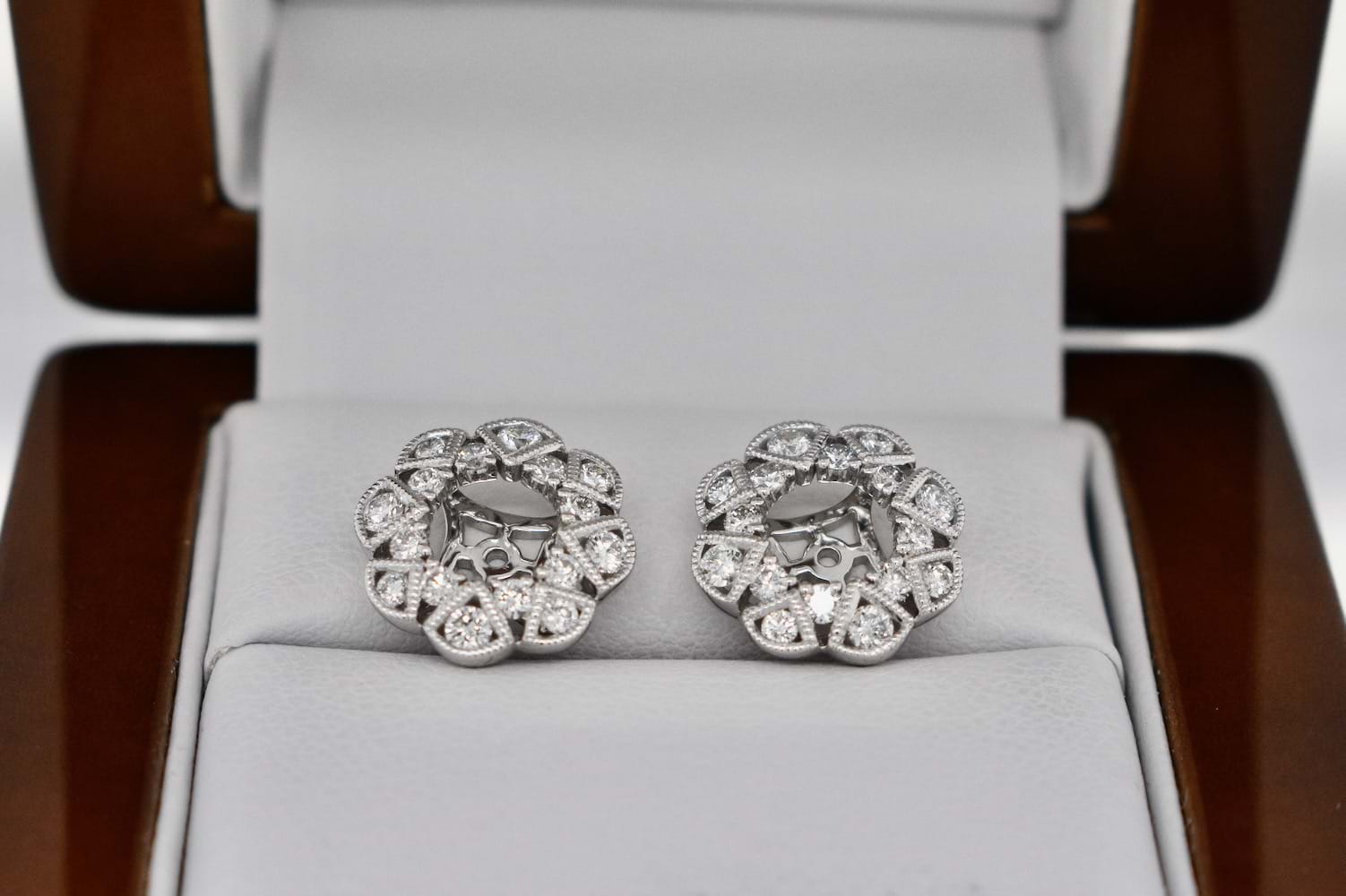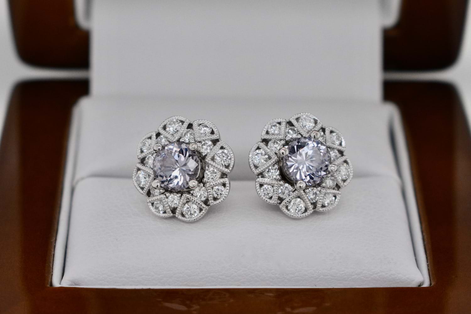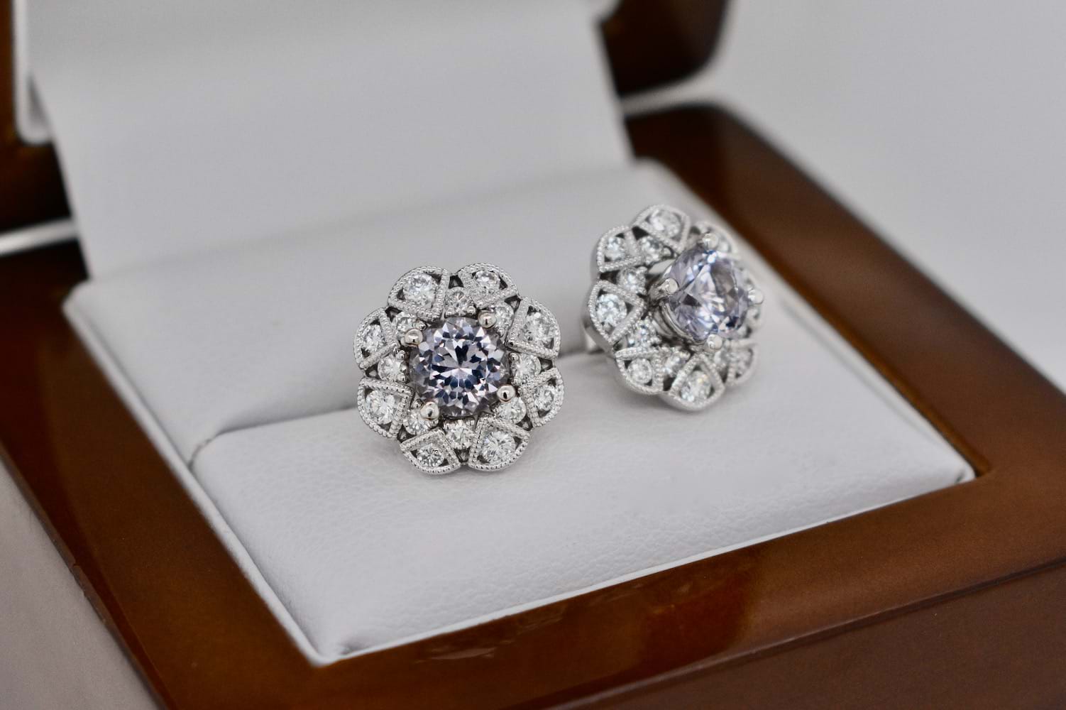 A striking pair of greyish purple spinels totalling 1.53cts set into simple 18ct white gold four claw stud settings, paired with these spectacular removable diamond jackets. The 18ct white gold jackets are in an Art Deco style and contain 32 shimmering round brilliant cut diamonds totalling 0.76cts (G/VS). With the option to wear the studs on their own or with the jackets these versatile earrings will also allow our client to pair the jackets with other studs in future. Independent Valuation Supplied.
