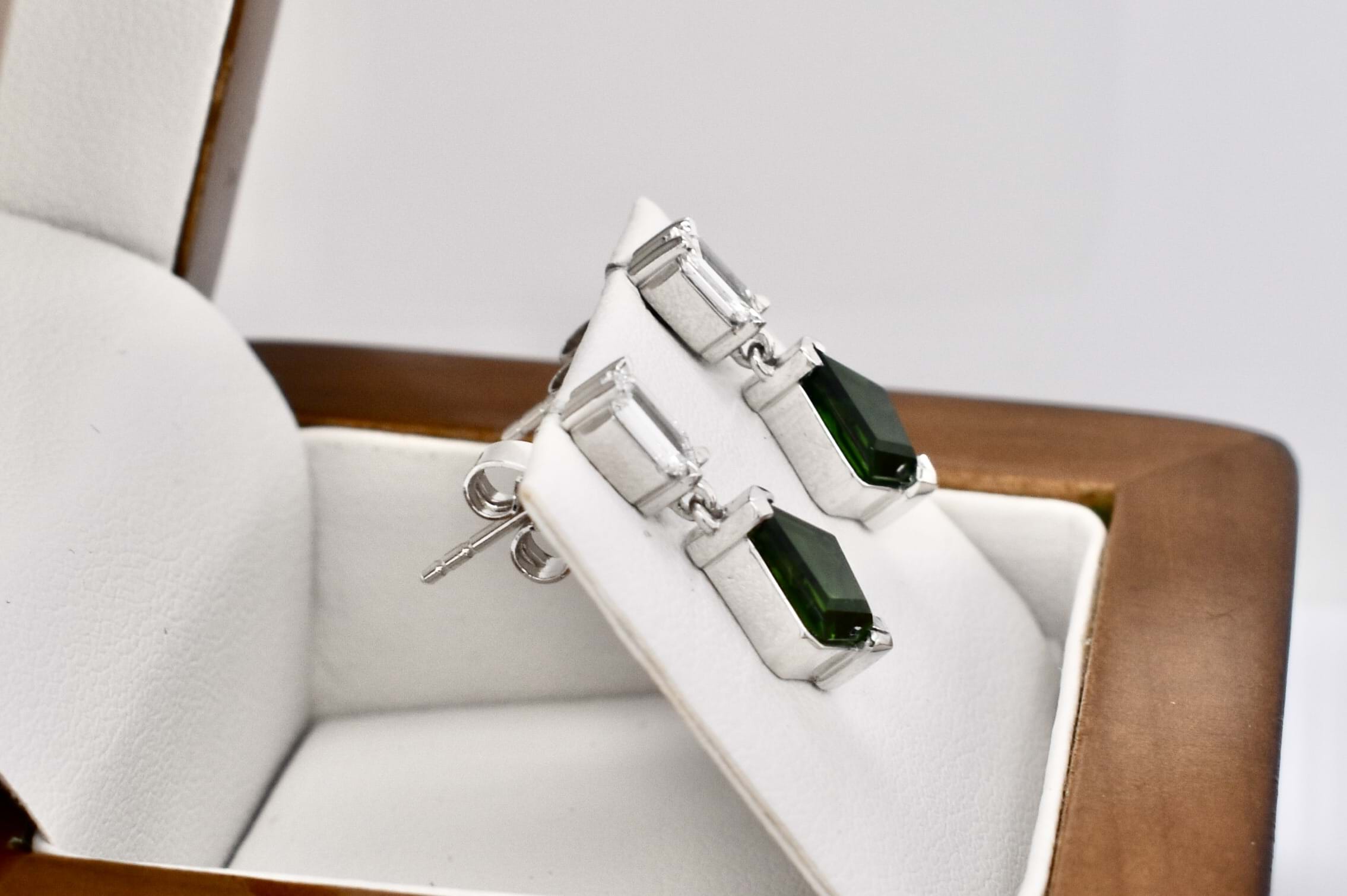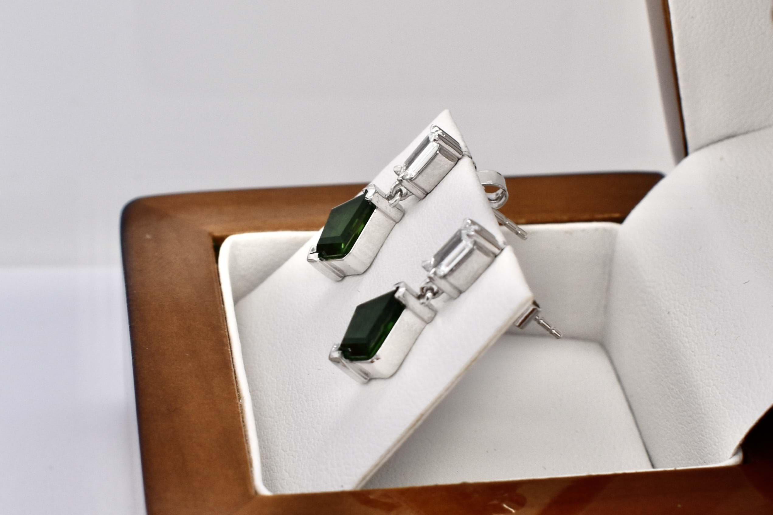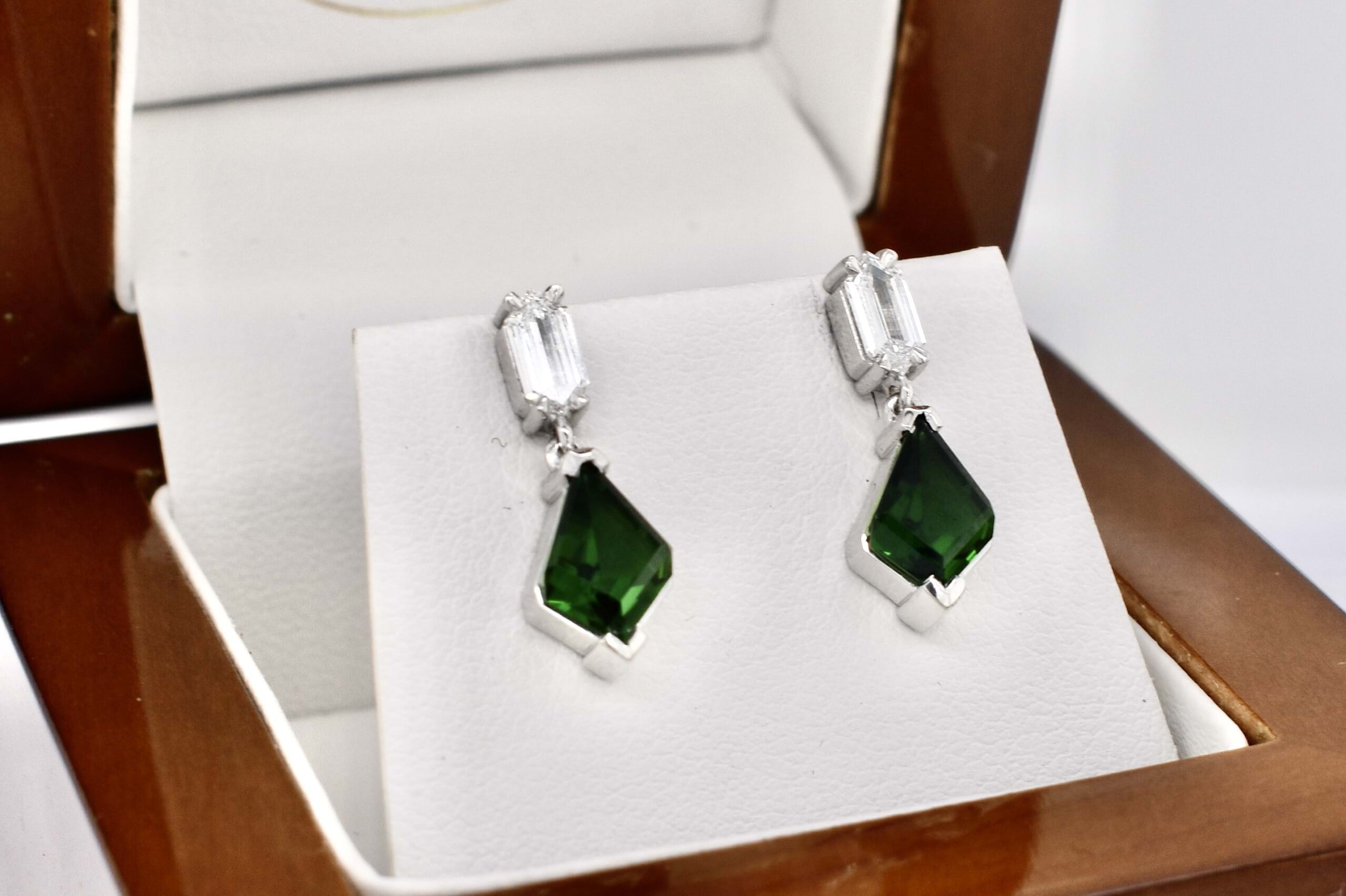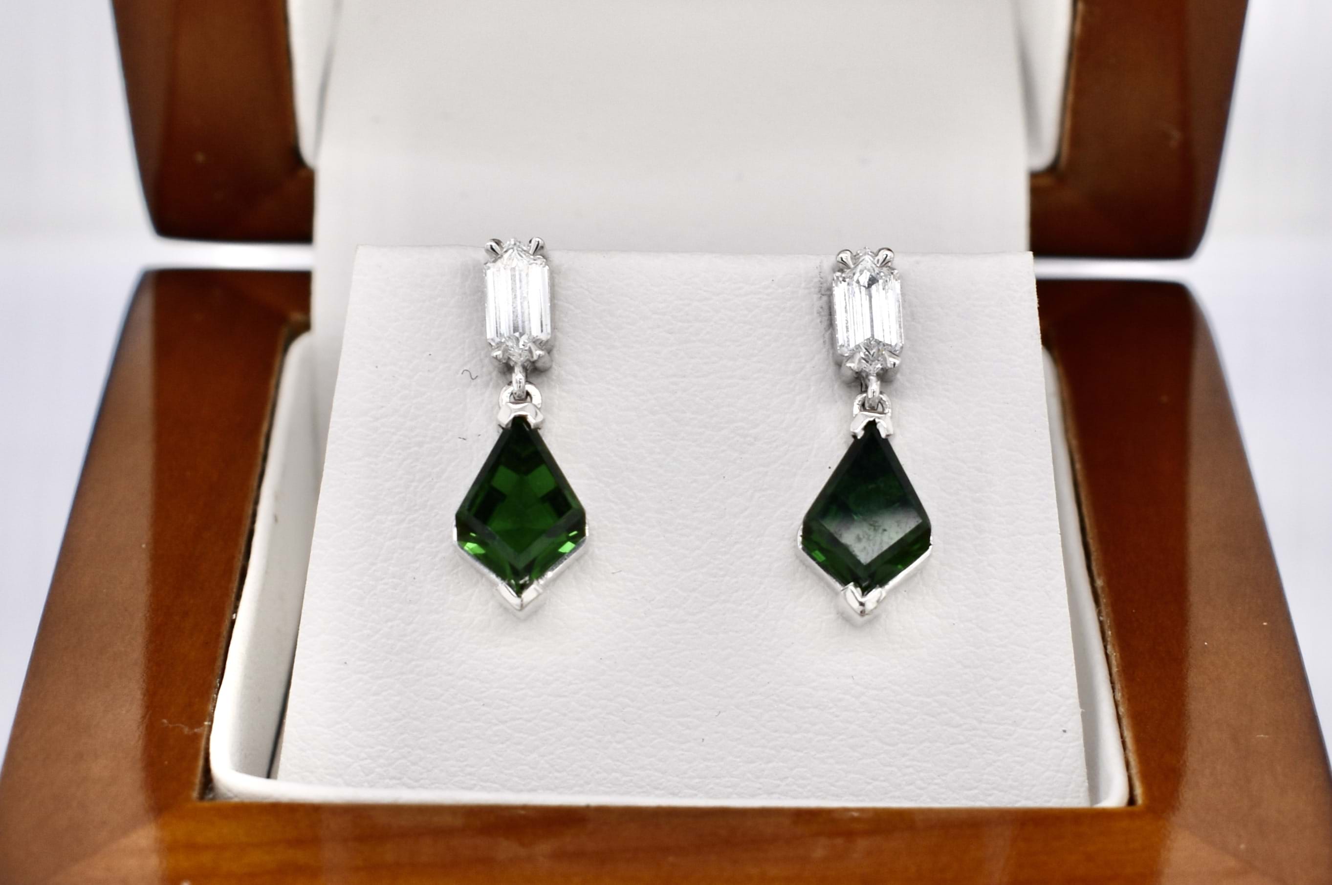 A beautiful pair of kite shape chrome green tourmalines totalling 1.56ct set into this custom made 18ct white gold stud drop earrings with a single hexagon diamond claw set at the top. The two diamonds equal 0.45ct FVS. Independent Valuation Supplied.
