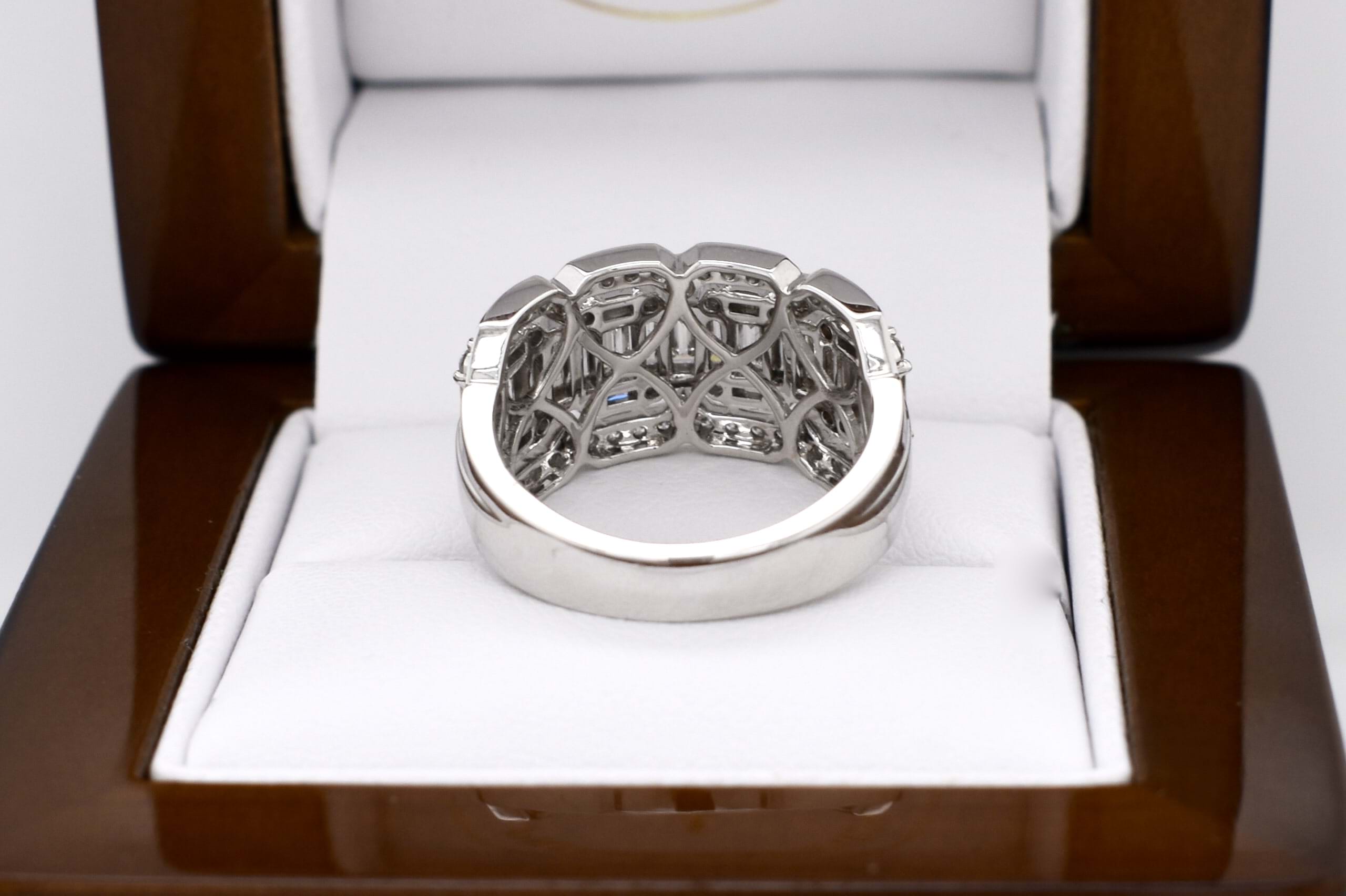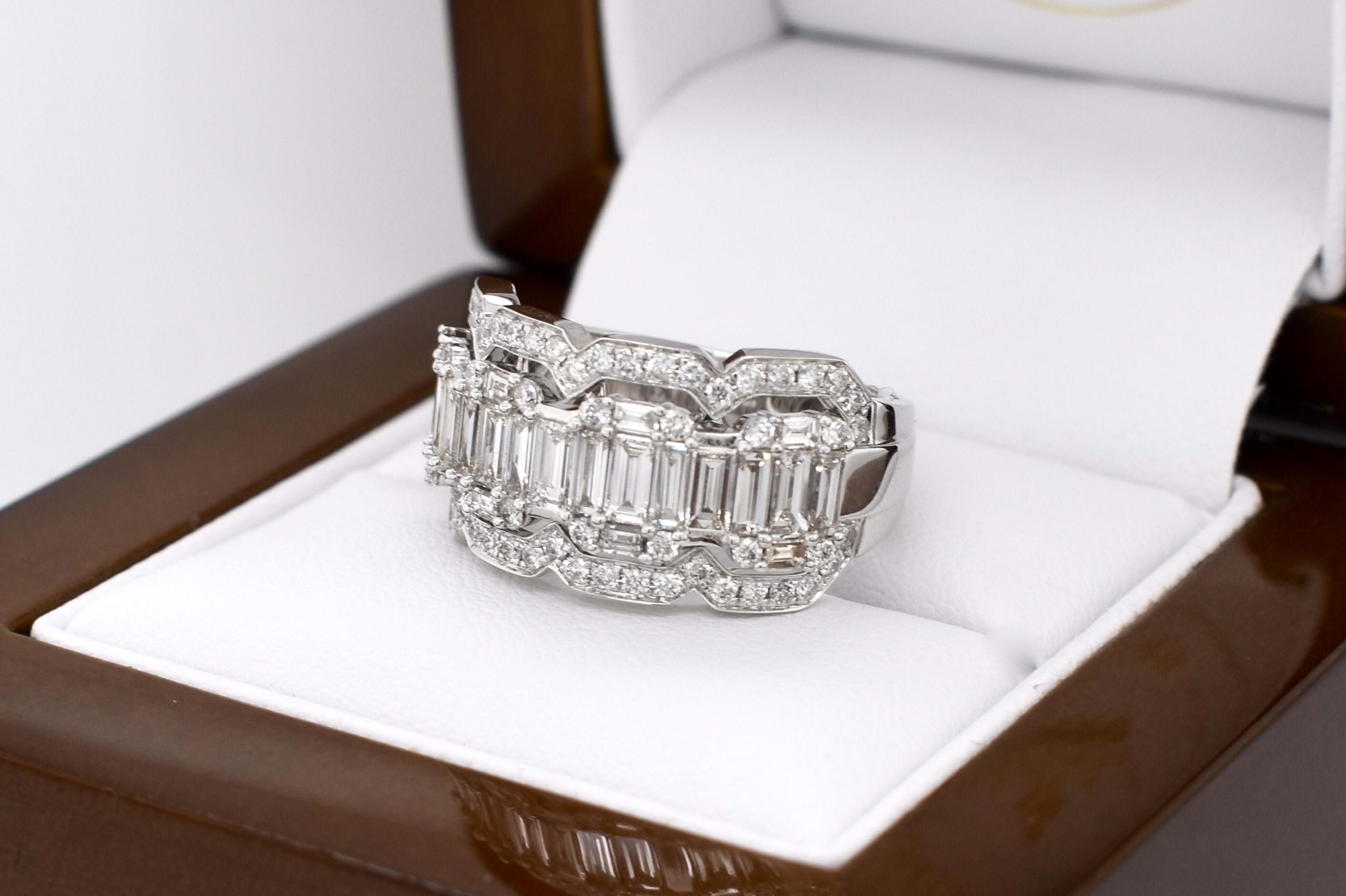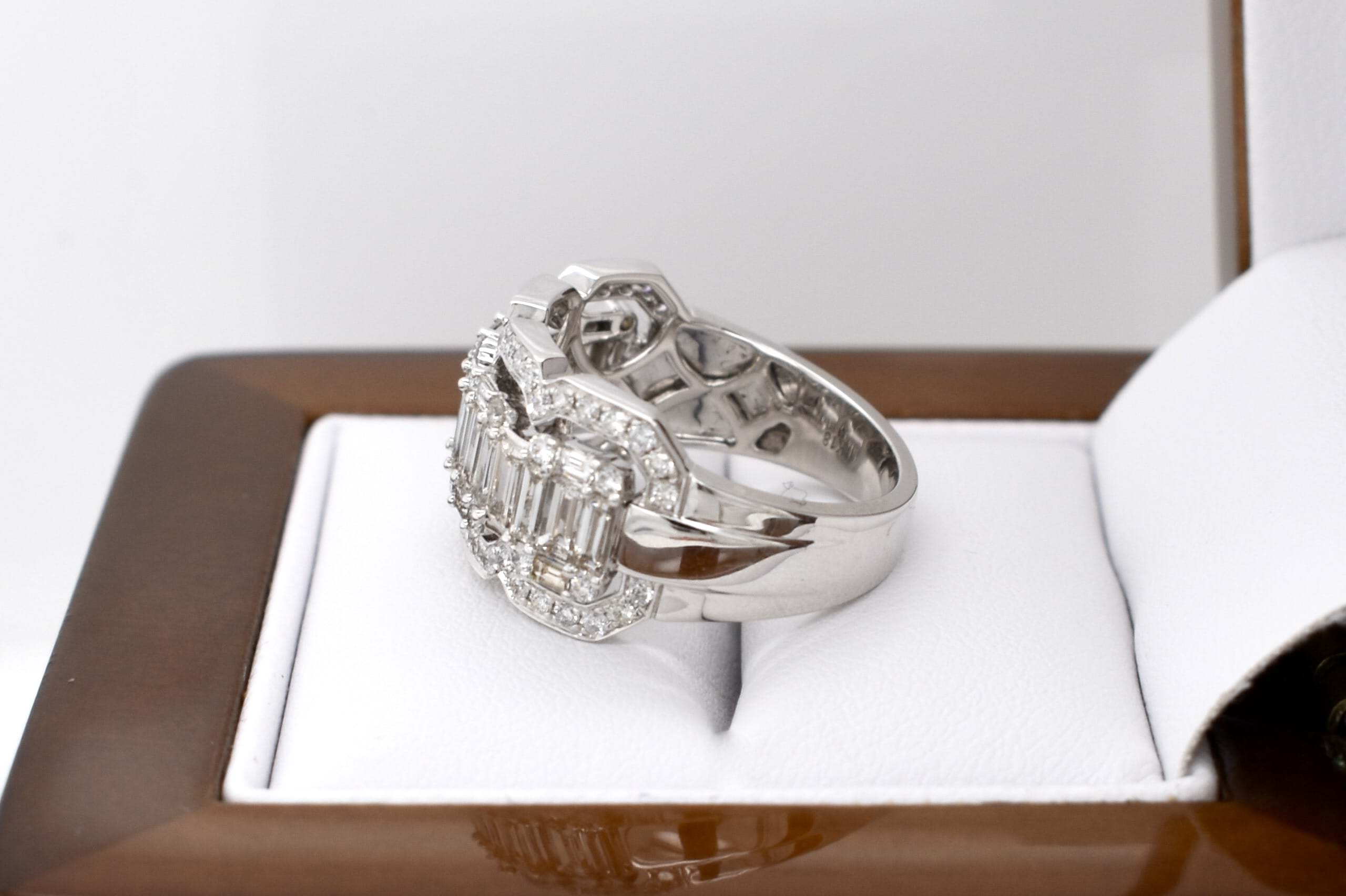 Sparkling and fabulous illusion diamond ring crafted in 18ct white gold and mimicking five large emerald cut diamonds with a shimmering border. The ring consists of 23 baguette cut diamonds equalling 1.23ctr GHVS and 62 round brilliant cut diamonds totalling 0.54ct GHVS. Independent Valuation Supplied.