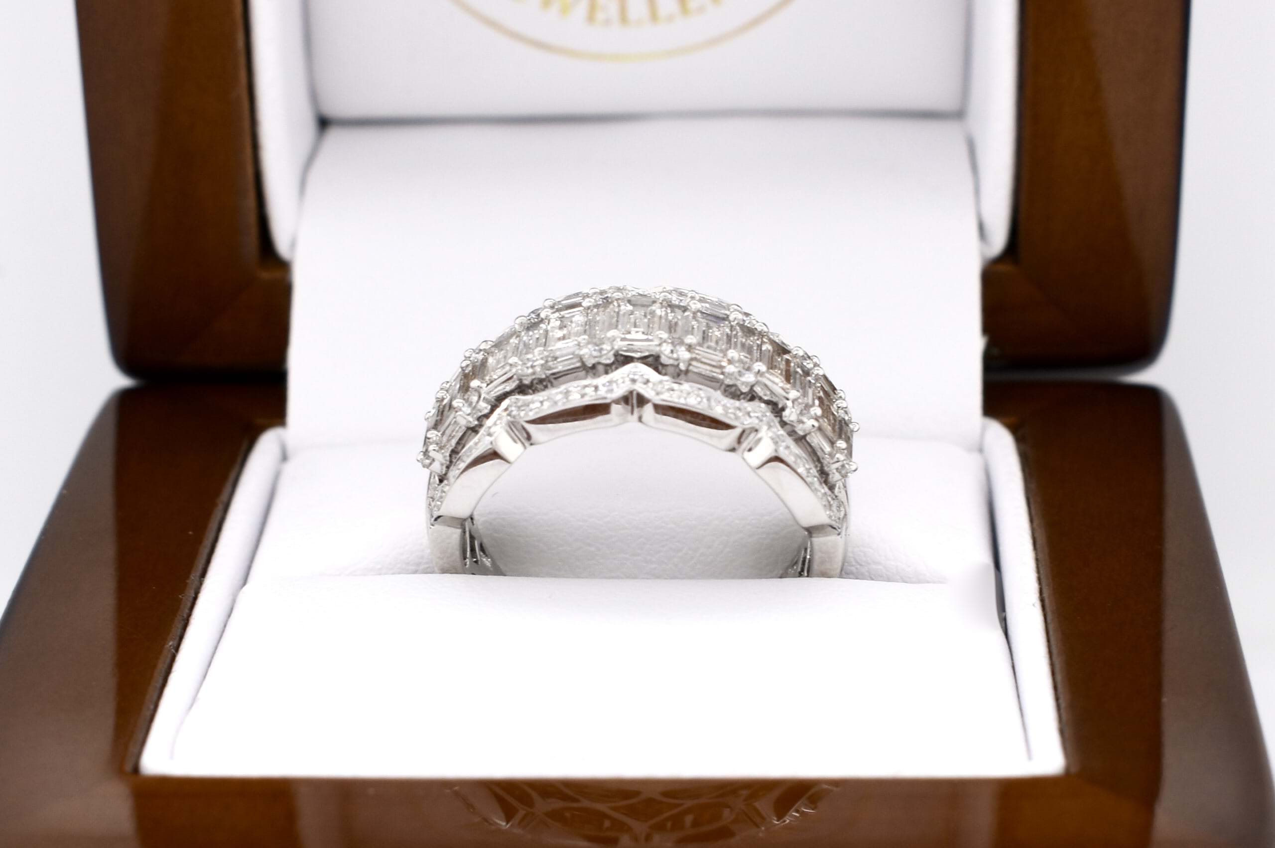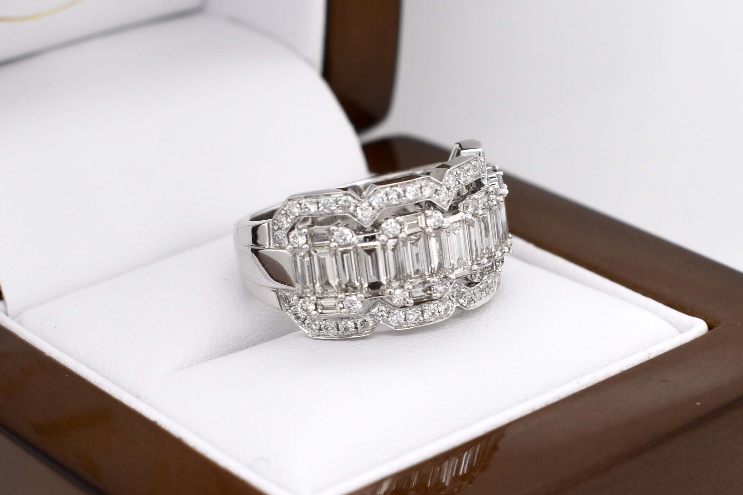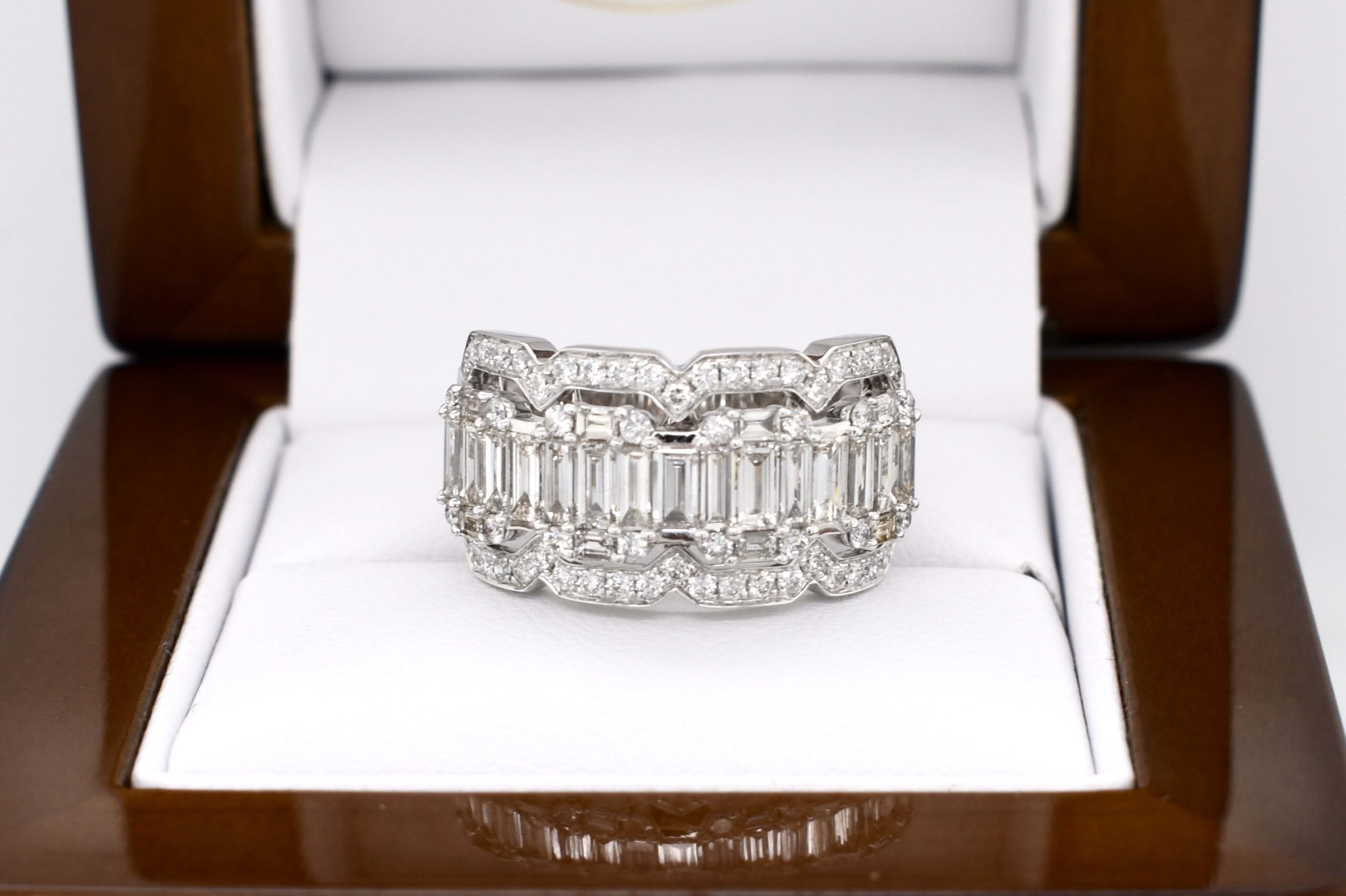 Sparkling and fabulous illusion diamond ring crafted in 18ct white gold and mimicking five large emerald cut diamonds with a shimmering border. The ring consists of 23 baguette cut diamonds equalling 1.23ctr GHVS and 62 round brilliant cut diamonds totalling 0.54ct GHVS. Independent Valuation Supplied.