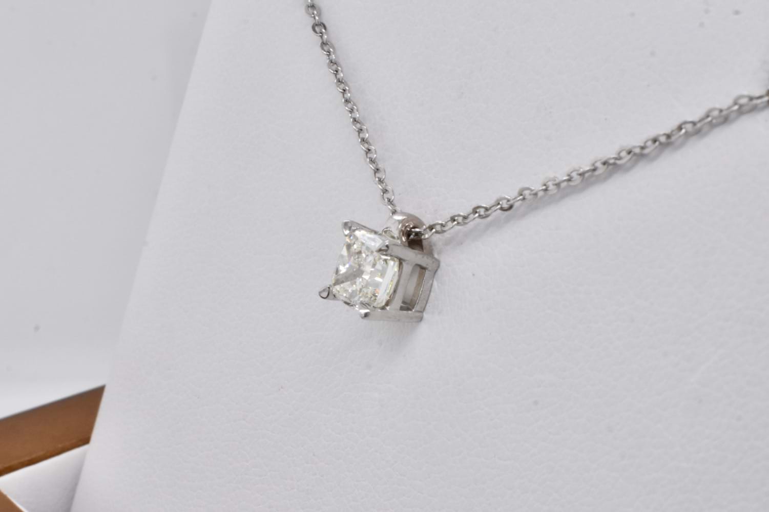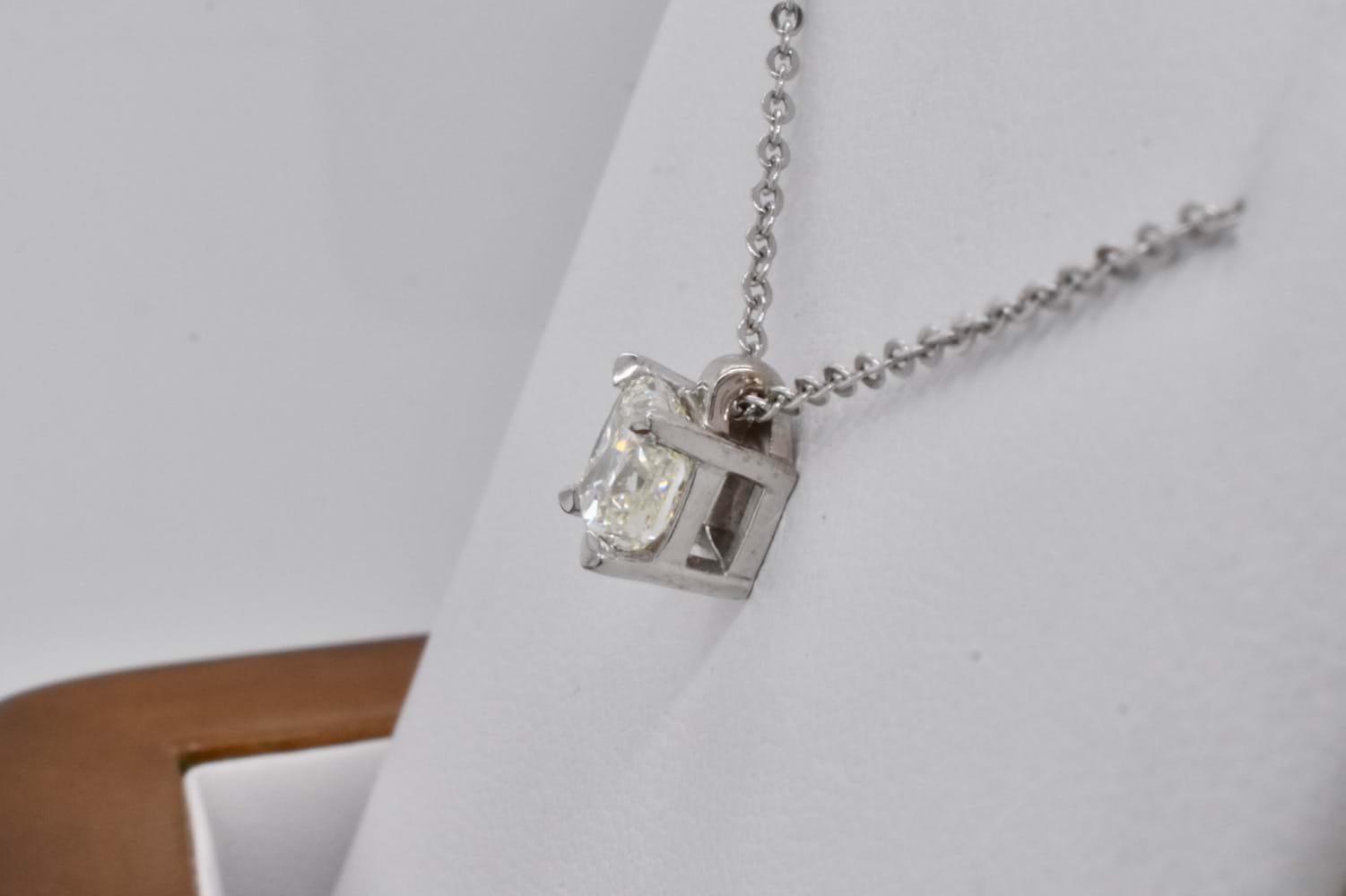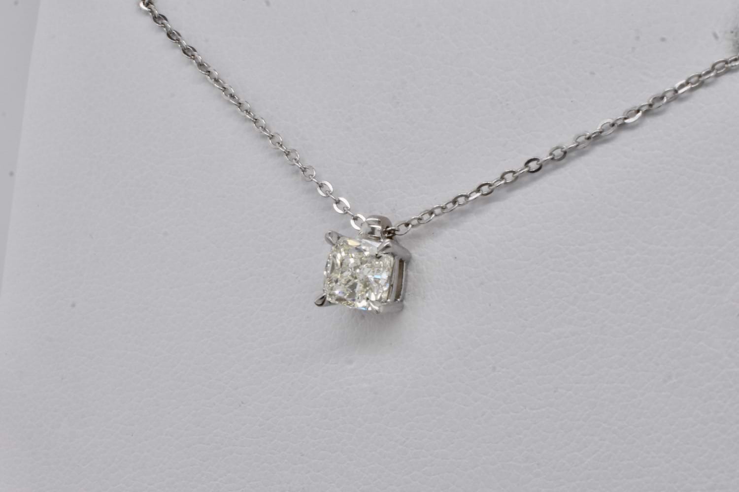 This sparkling and shimmering 1ct cushion cut diamond was hand selected in store and has been set into a custom 18ct white gold four claw setting with a small and understated tapered loop and suspended from a delicate trace link chain. Independent Valuation Supplied.