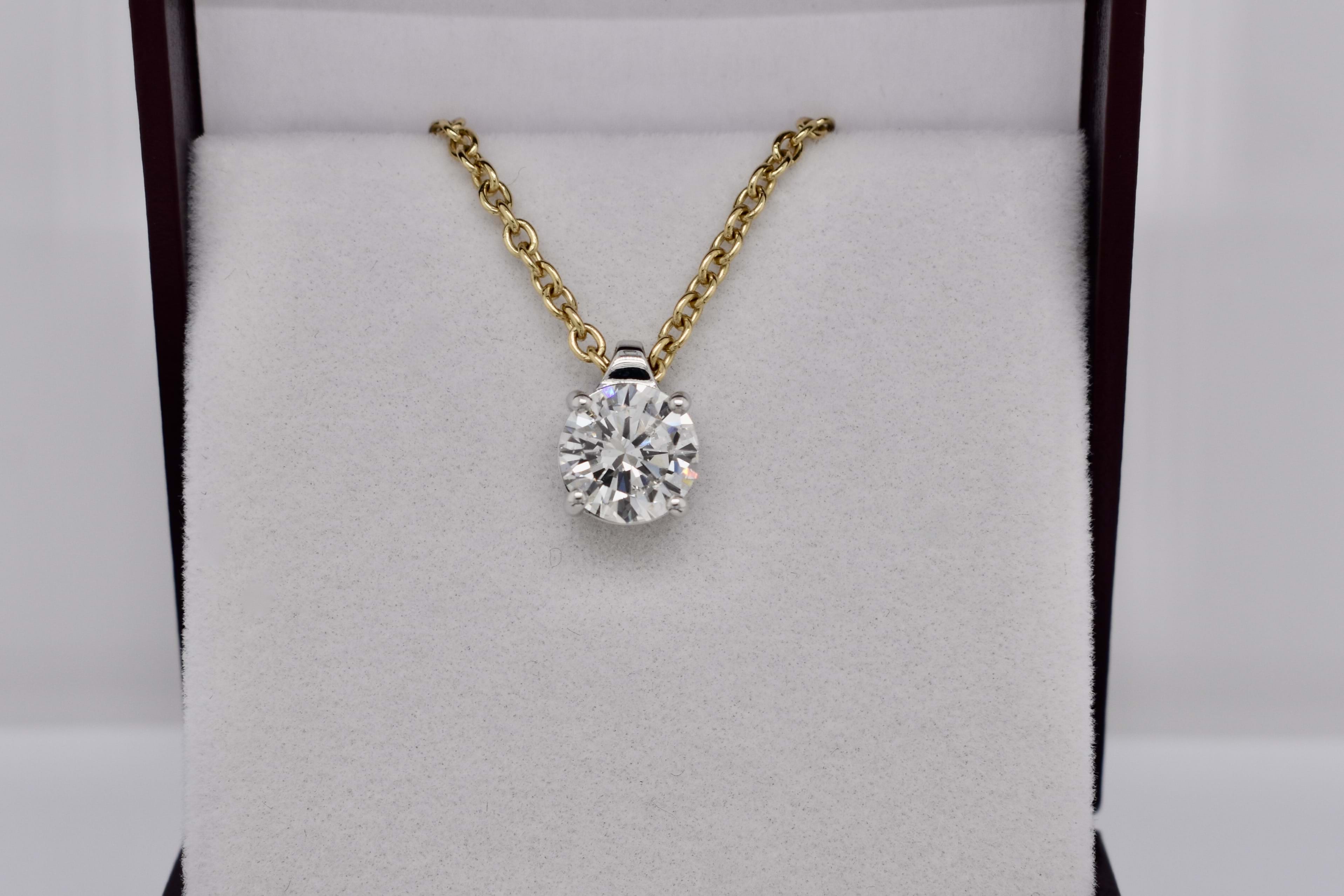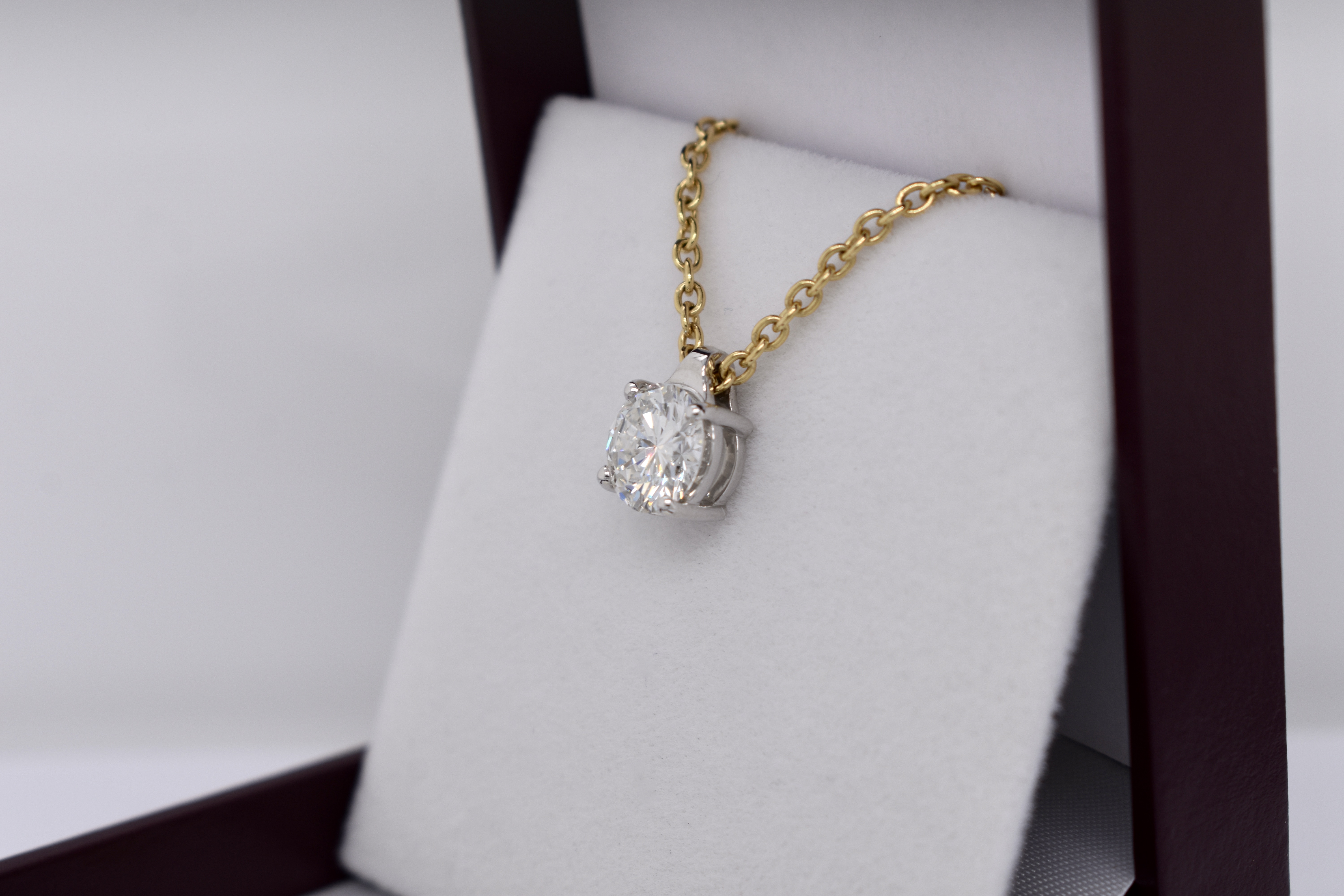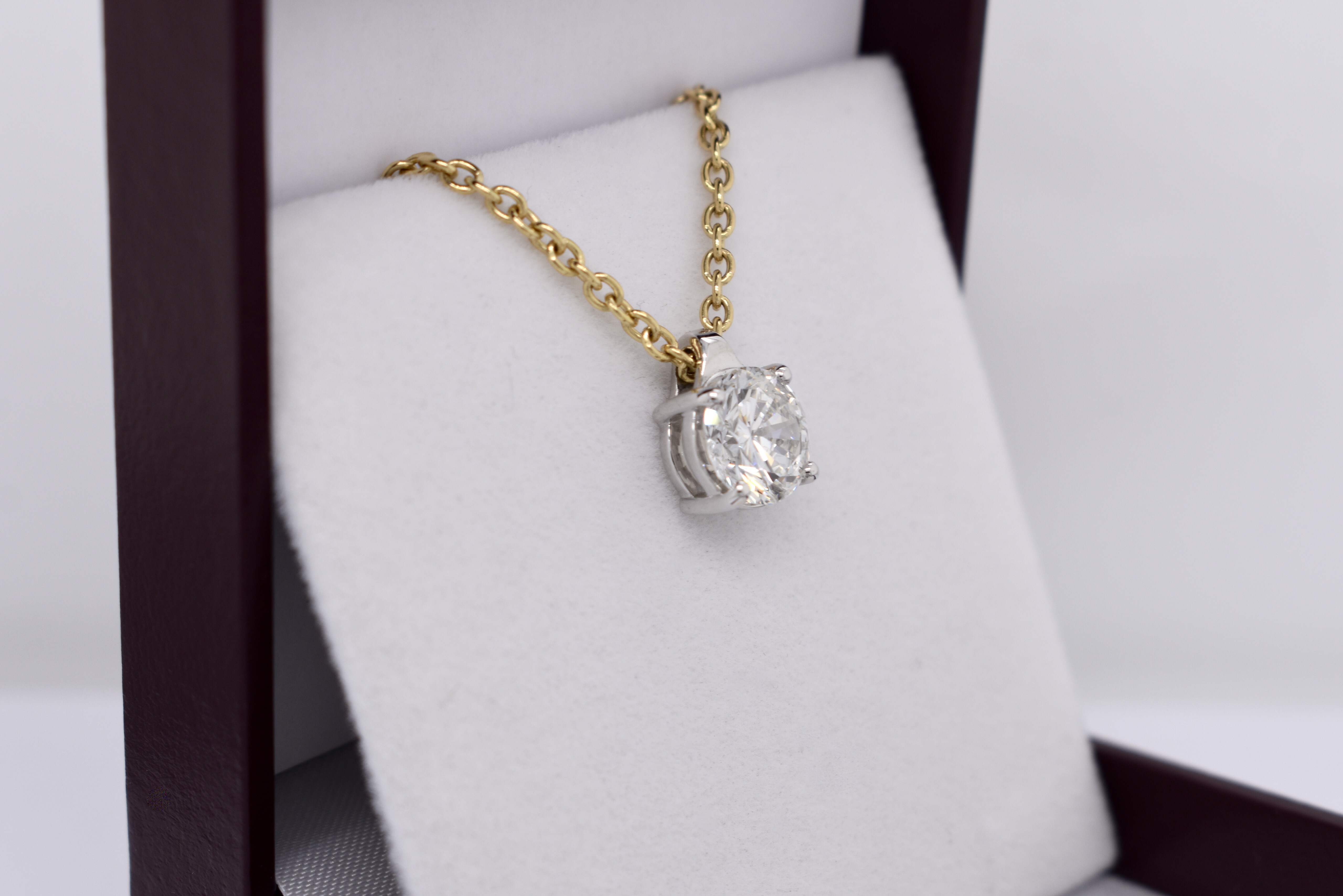 A simple and classic pendant designed to showcase the scintillating and fantastic 2.01ct round brilliant cut diamond set in the four tapered claws with a fixed an tapering 18ct white gold bale. This pendant is designed to be paired with a white, yellow or rose gold chain. Independent Valuation Supplied.