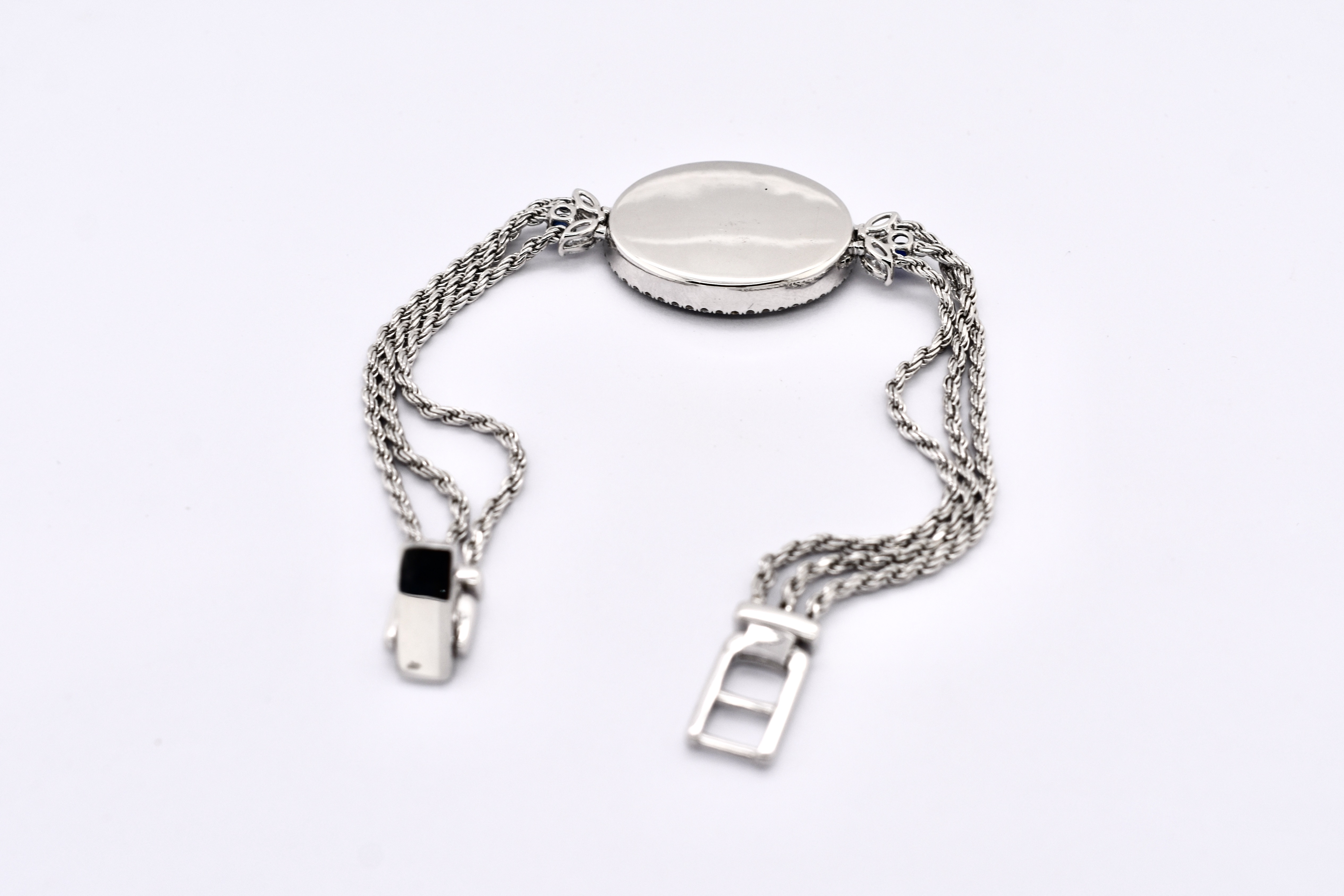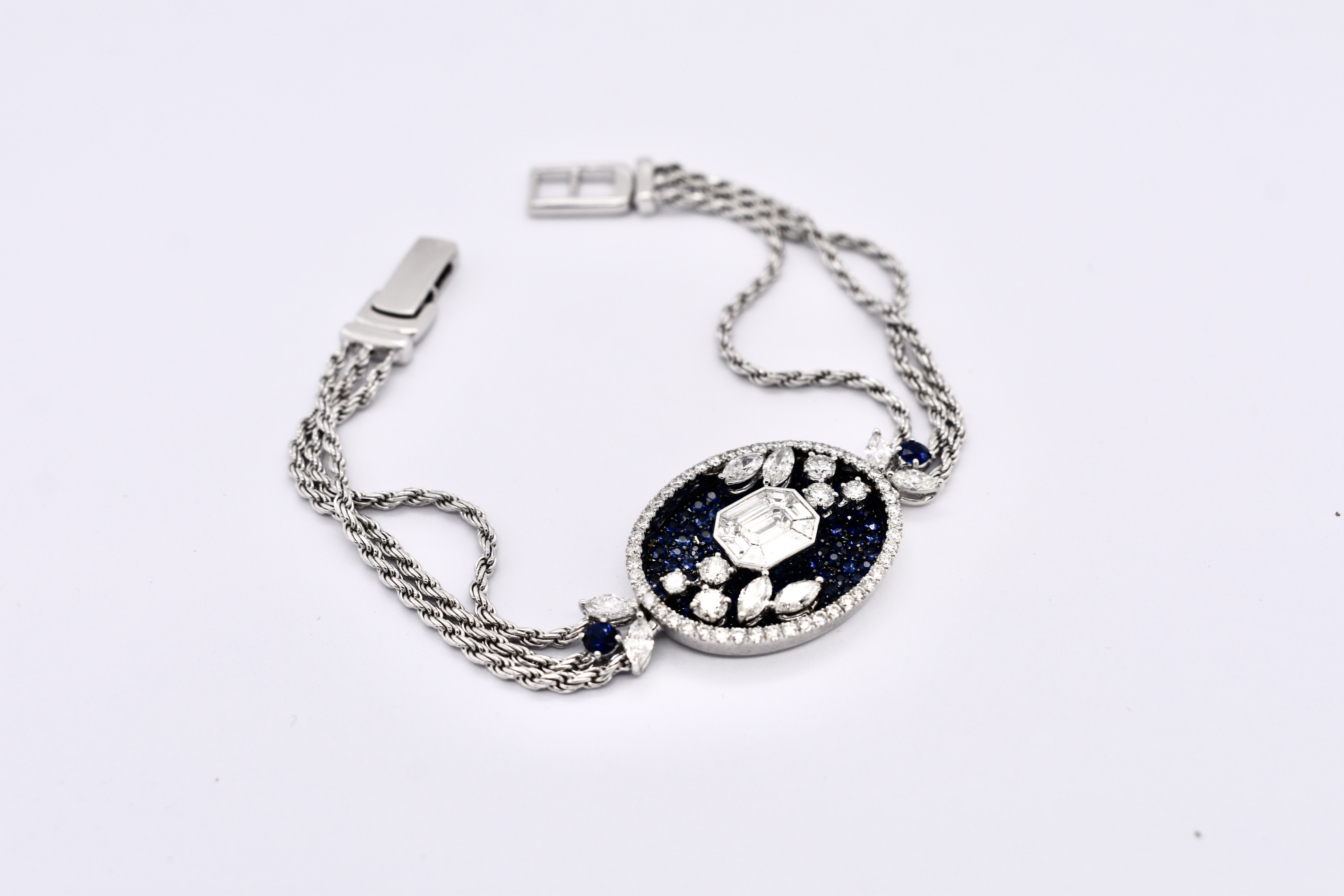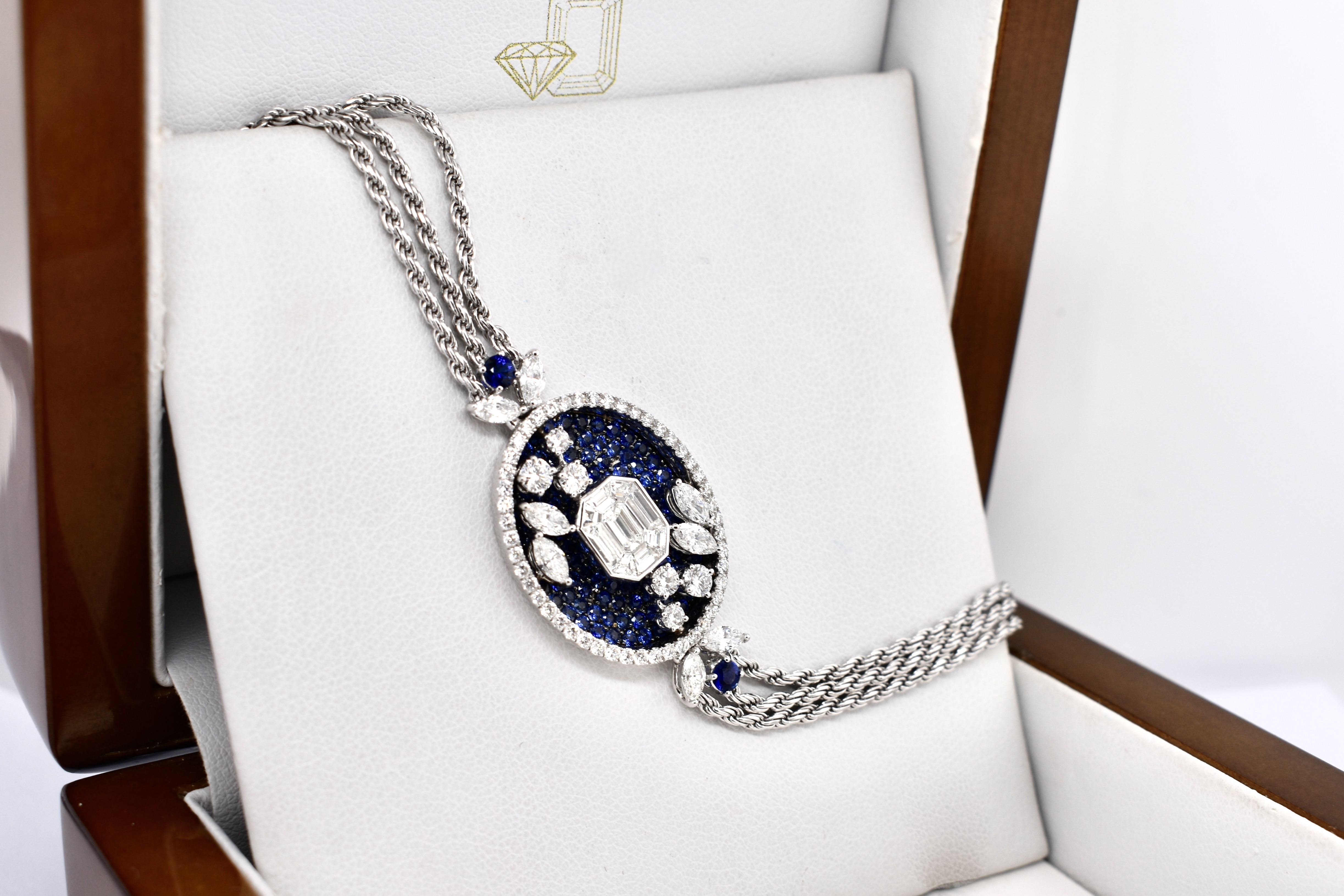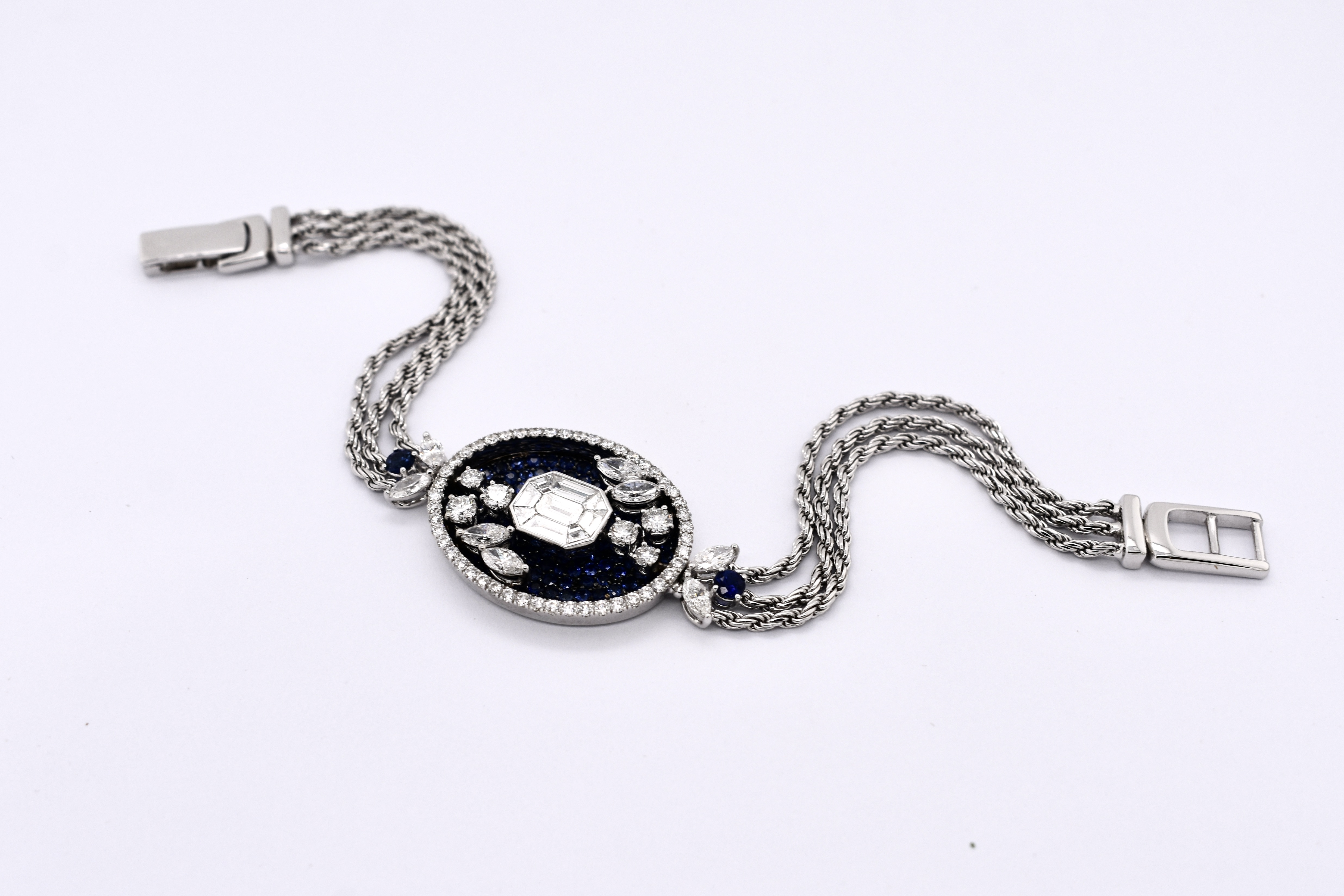 A very special and one of kind bracelet crafted in 18ct white gold with an amulet feature piece containing a pave of 138 royal blue sapphires equalling 2.13cts and a mosaic of tapered emerald cut and baguette cut diamonds in the centre totalling 0.63ct with accents of marquise and round diamond scattered across the amulet and a shimmering halo of diamonds with a combined total of 1.69ct surrounding the piece. The centre piece is attached to a triple strand of rope chain on each side and a secure locking clasp. Independent Valuation Supplied.