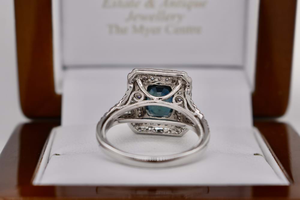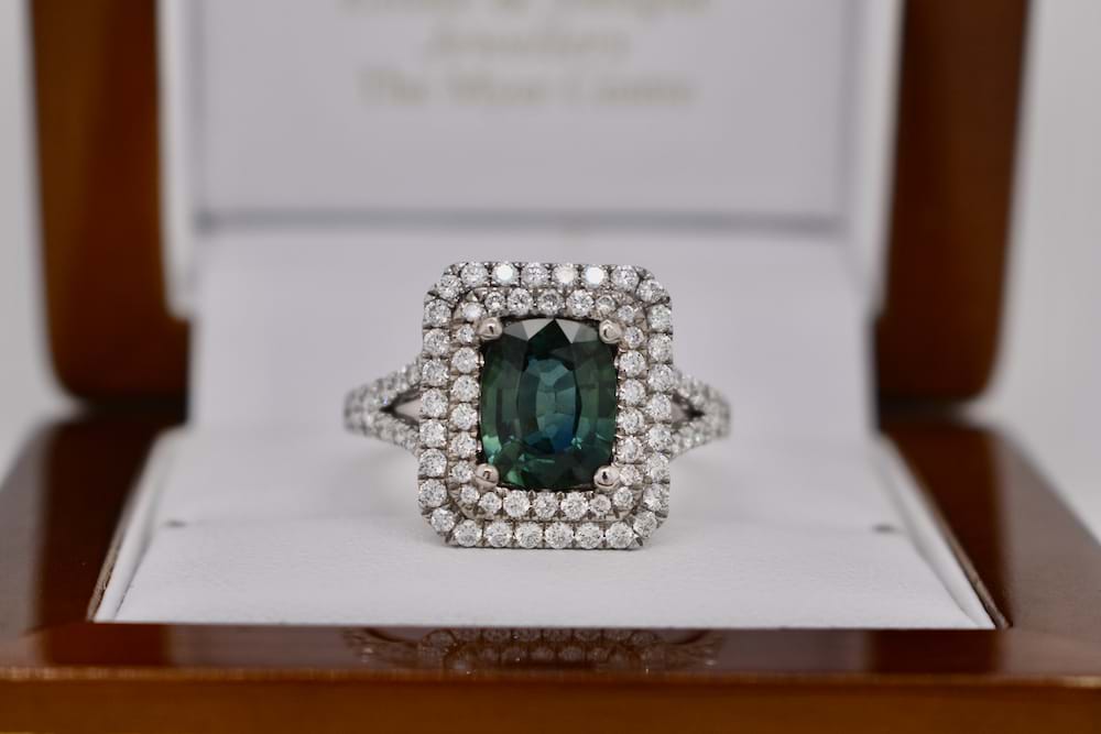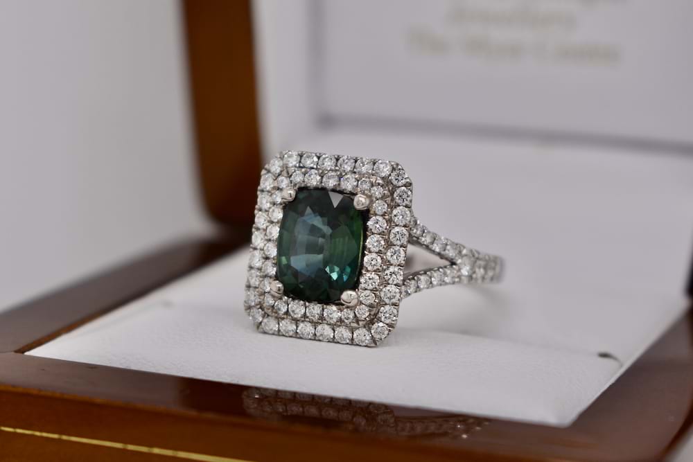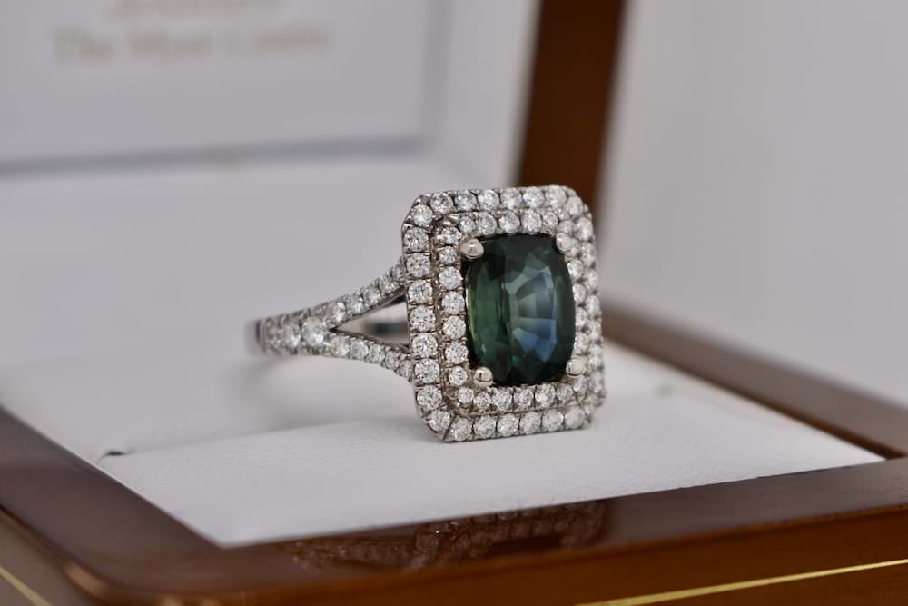 Hand chosen in store is this stunning greenish blue 2.30ct sapphire to be the centre of this eye catching and fabulous engagement ring. Crafted in 18ct white gold the ring boasts a double halo of sparkling round brilliant cut diamonds and split shoulders also set with shimmering diamonds. Total diamond content equals 0.85cts. Independent Valuation Supplied. This bespoke creation is being enjoyed by its new owner, if you are inspired by this archived design contact us today to discuss how we can create something incredible for you or your loved one.