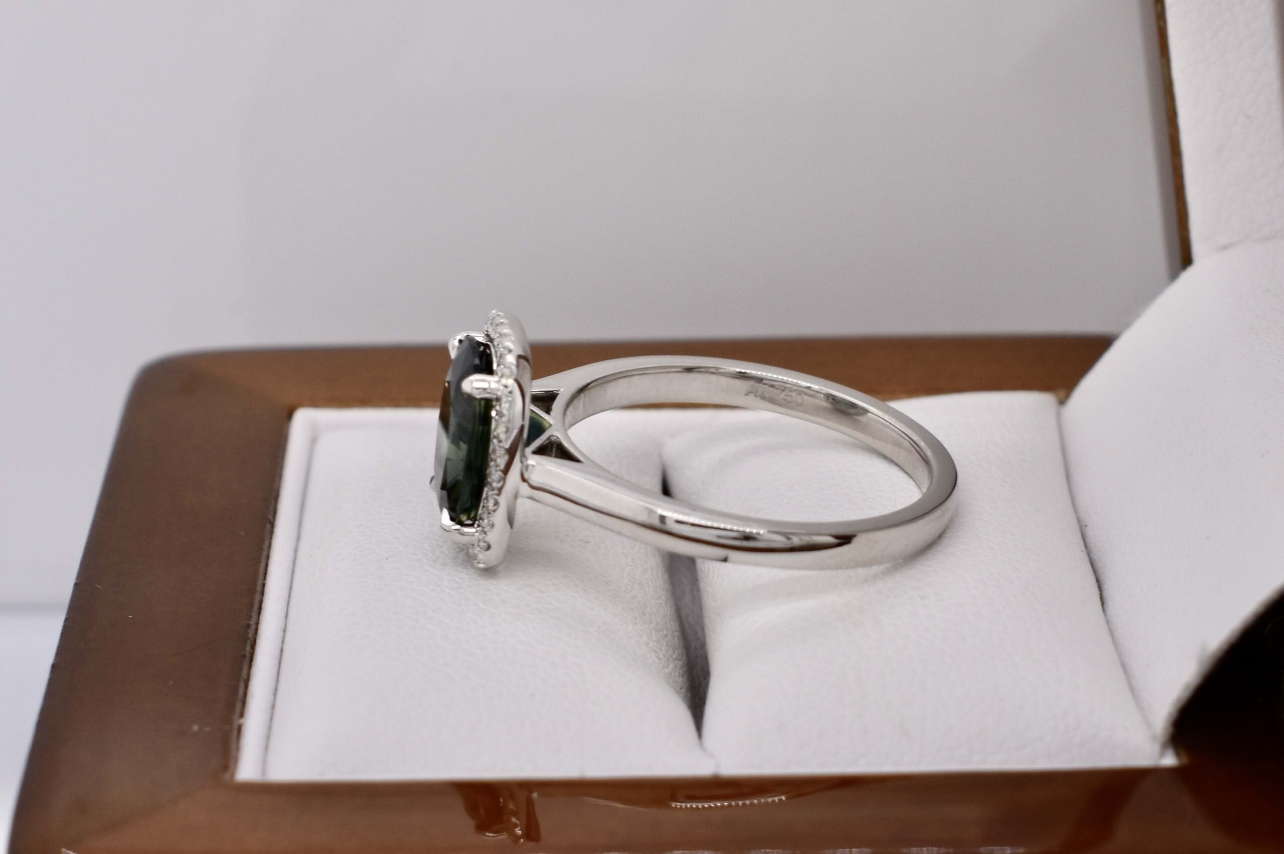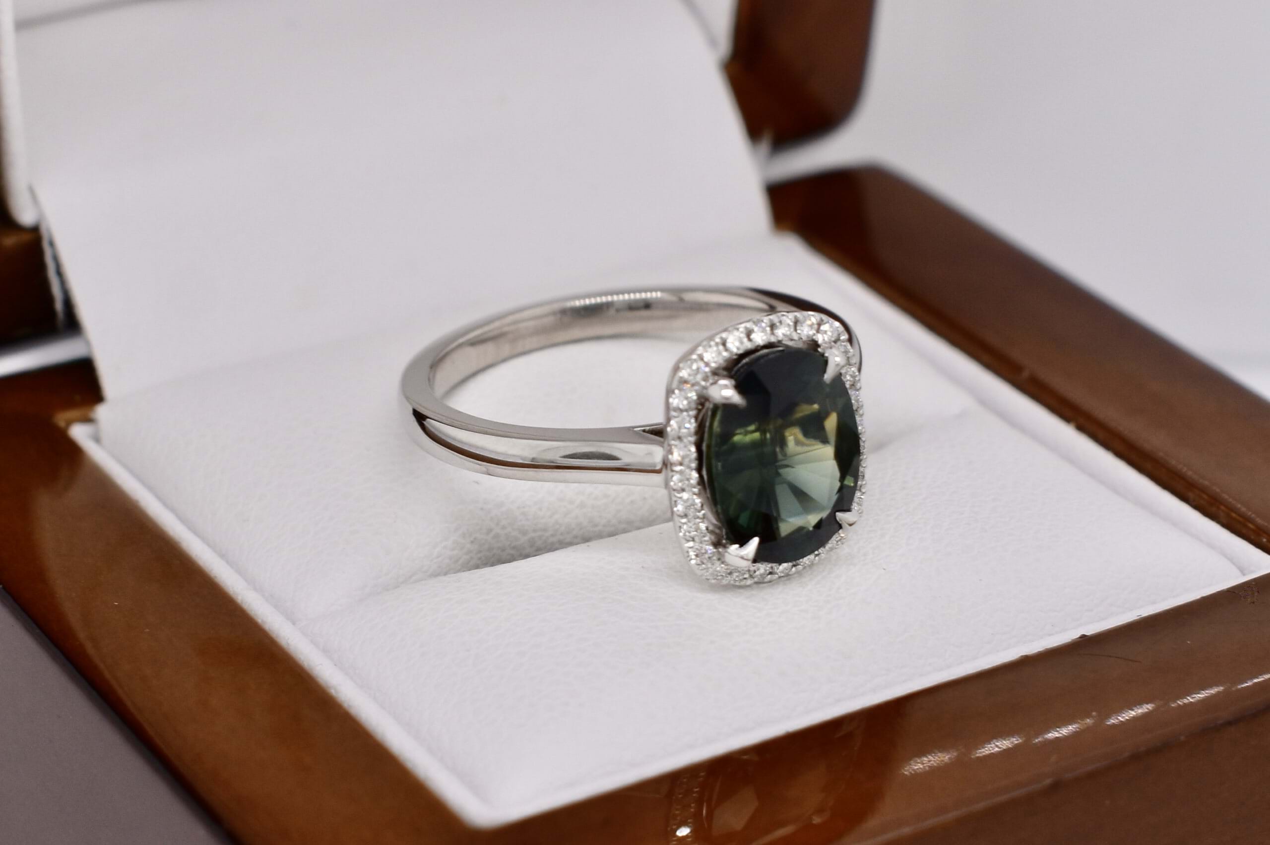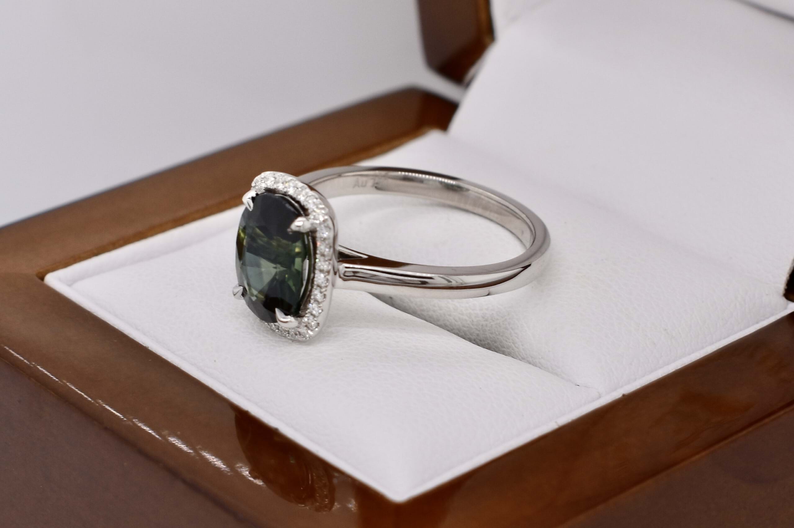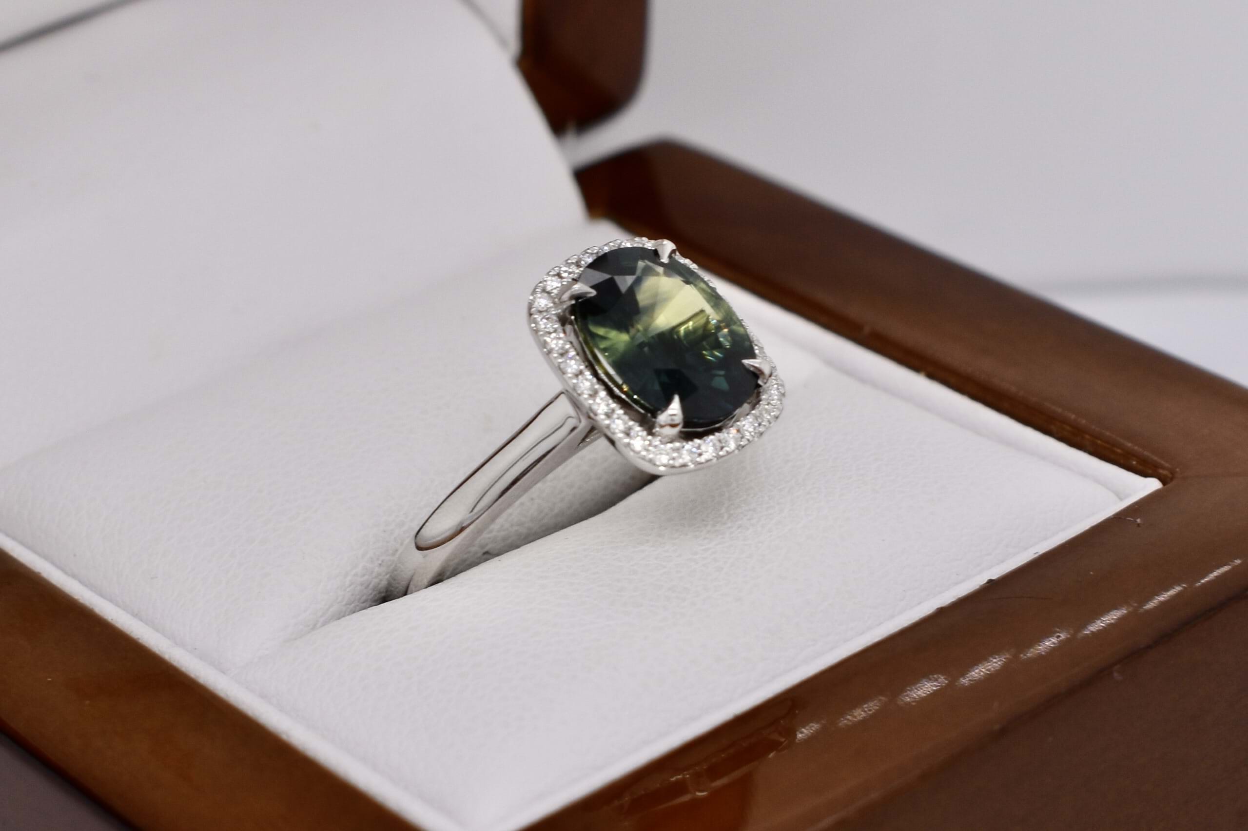 A gorgeous 2.47ct Australia parti sapphire hand selected by our clients to be the feature of this beautiful custom made engagement ring. Crafted in 18ct white gold the ring has a halo of sparkling diamonds totaling 0.12cts and a plain band. Independent Valuation Supplied.