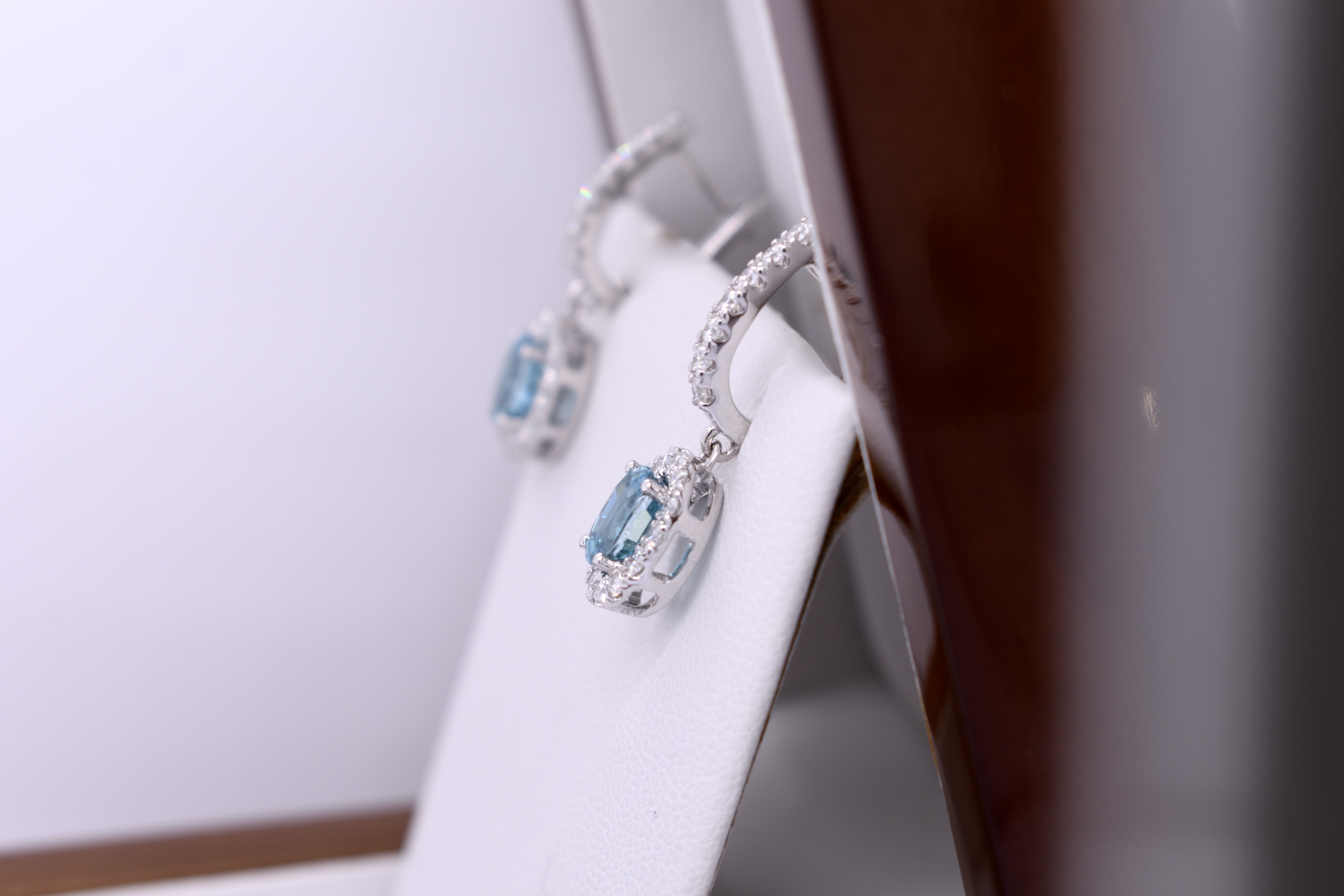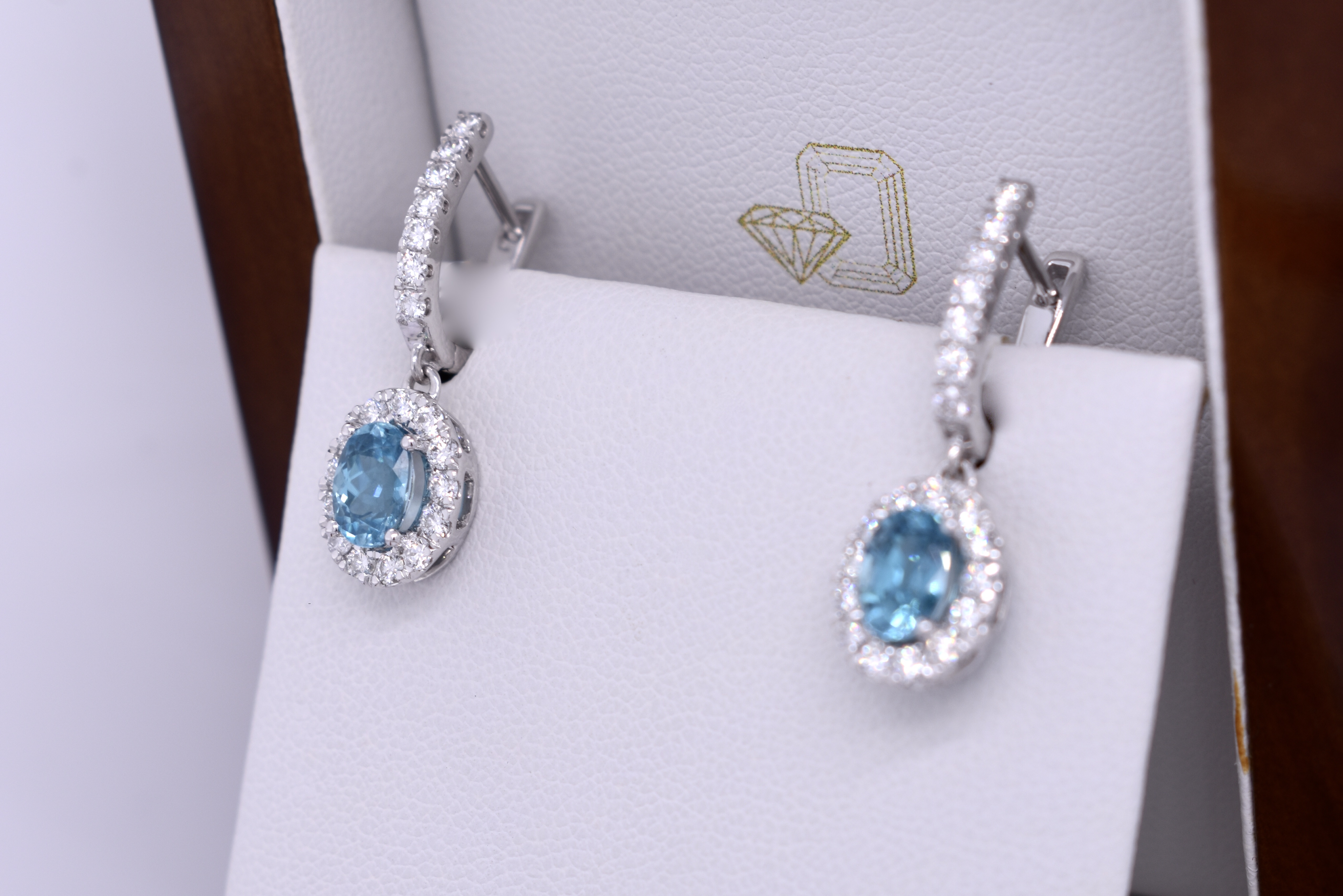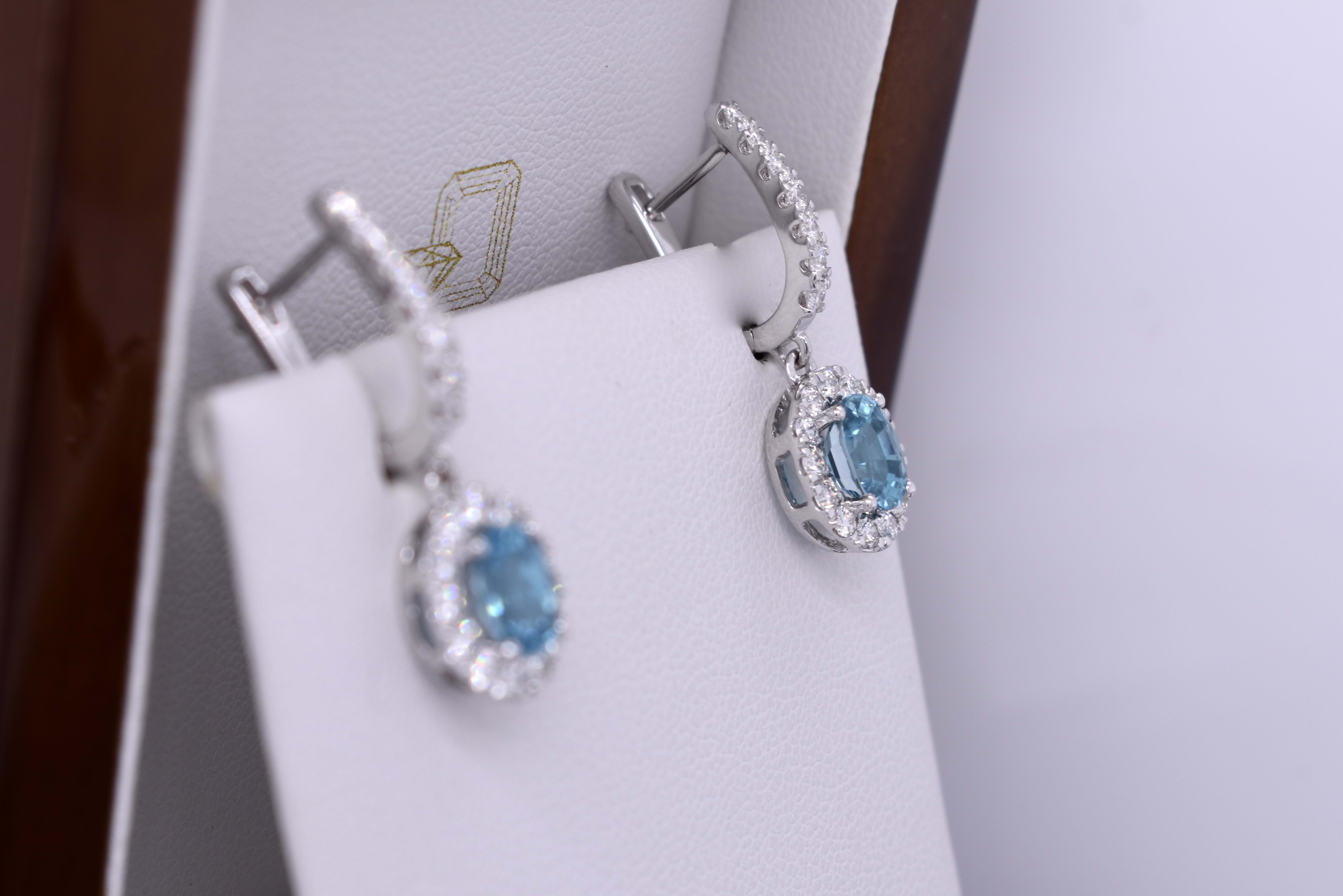 Designed to match a pendant and ring custom made previously these 18ct white gold diamond set huggies have an articulated oval halo drop featuring a matching pair of oval blue zircons. The two zircons total 2.66cts and the earrings have a combined diamond content of 0.96cts. Independent Valuation Supplied.