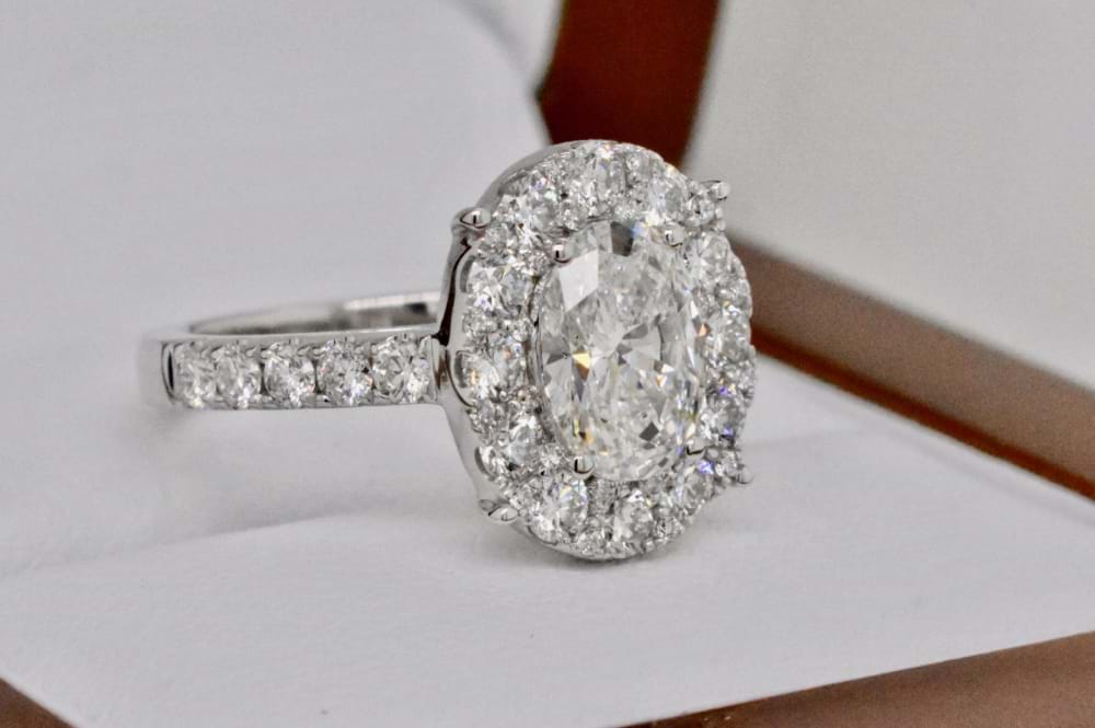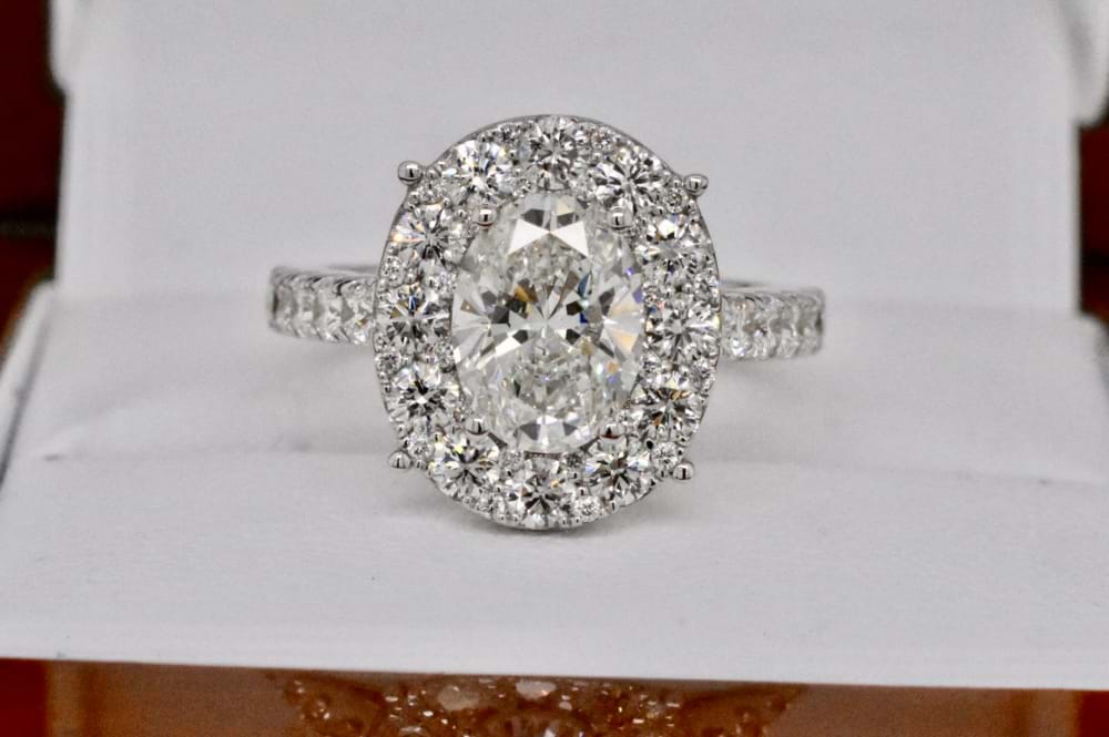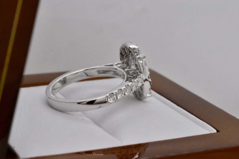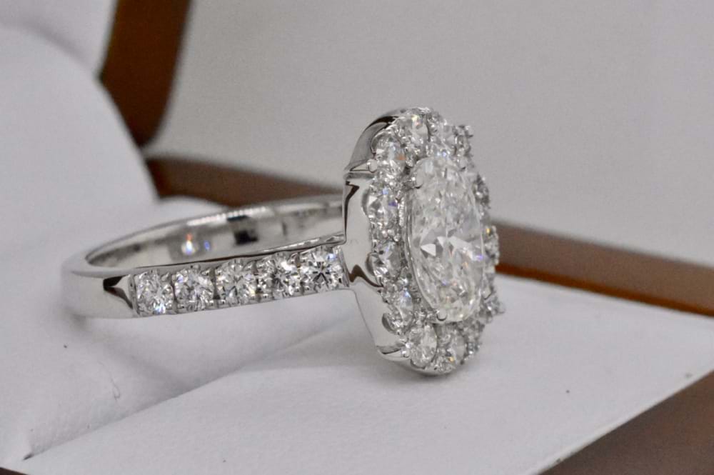 This fabulous 18ct white gold diamond ring was deisgned and crafted especially to showcase the central 1.52ct oval diamond supplied by our client. Exhibiting beautiful workmanship this stunning ring contains a further 46 round brilliant cut diamonds totalling 1.31cts adding to the already scintilating centre diamond.