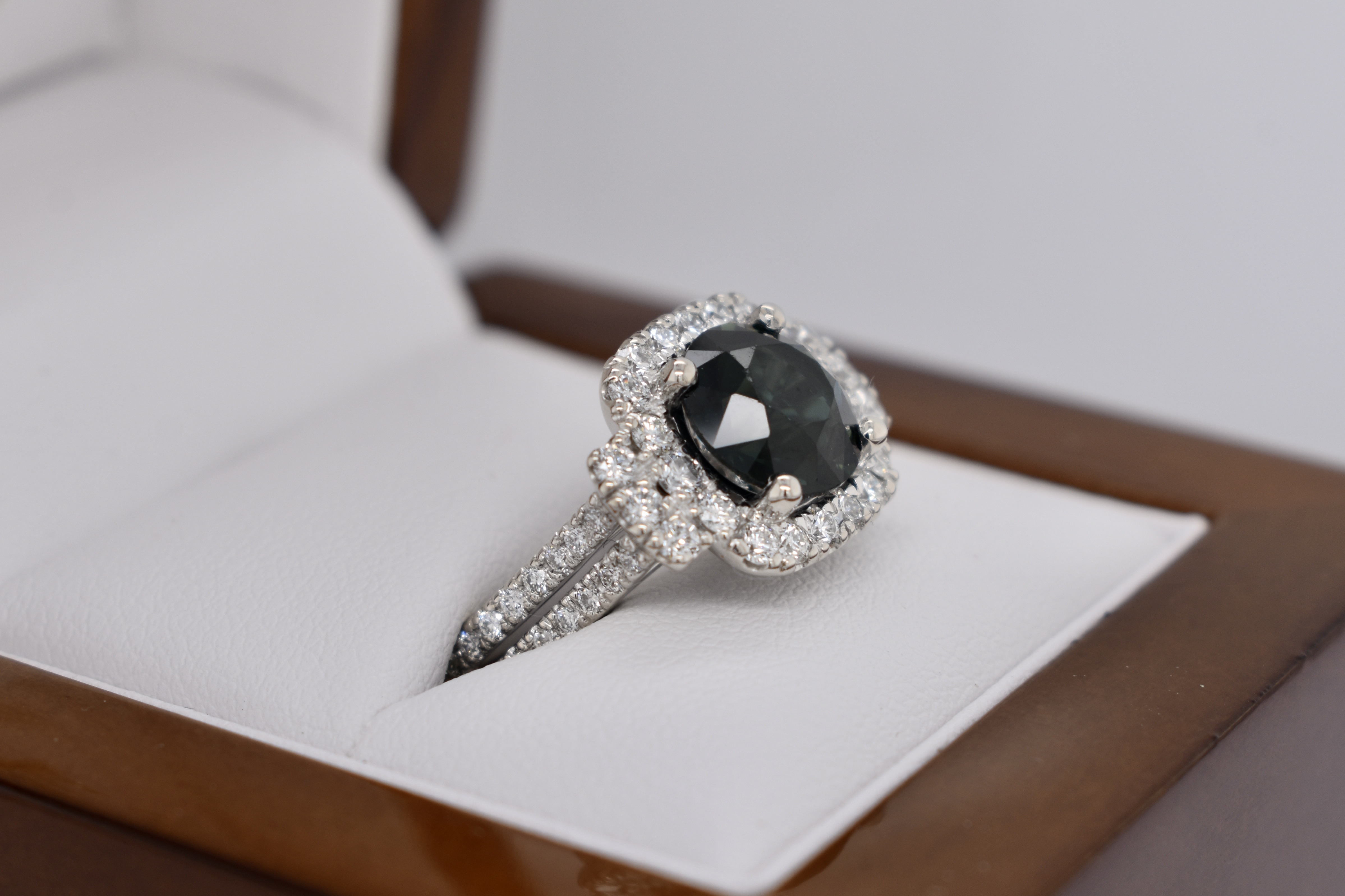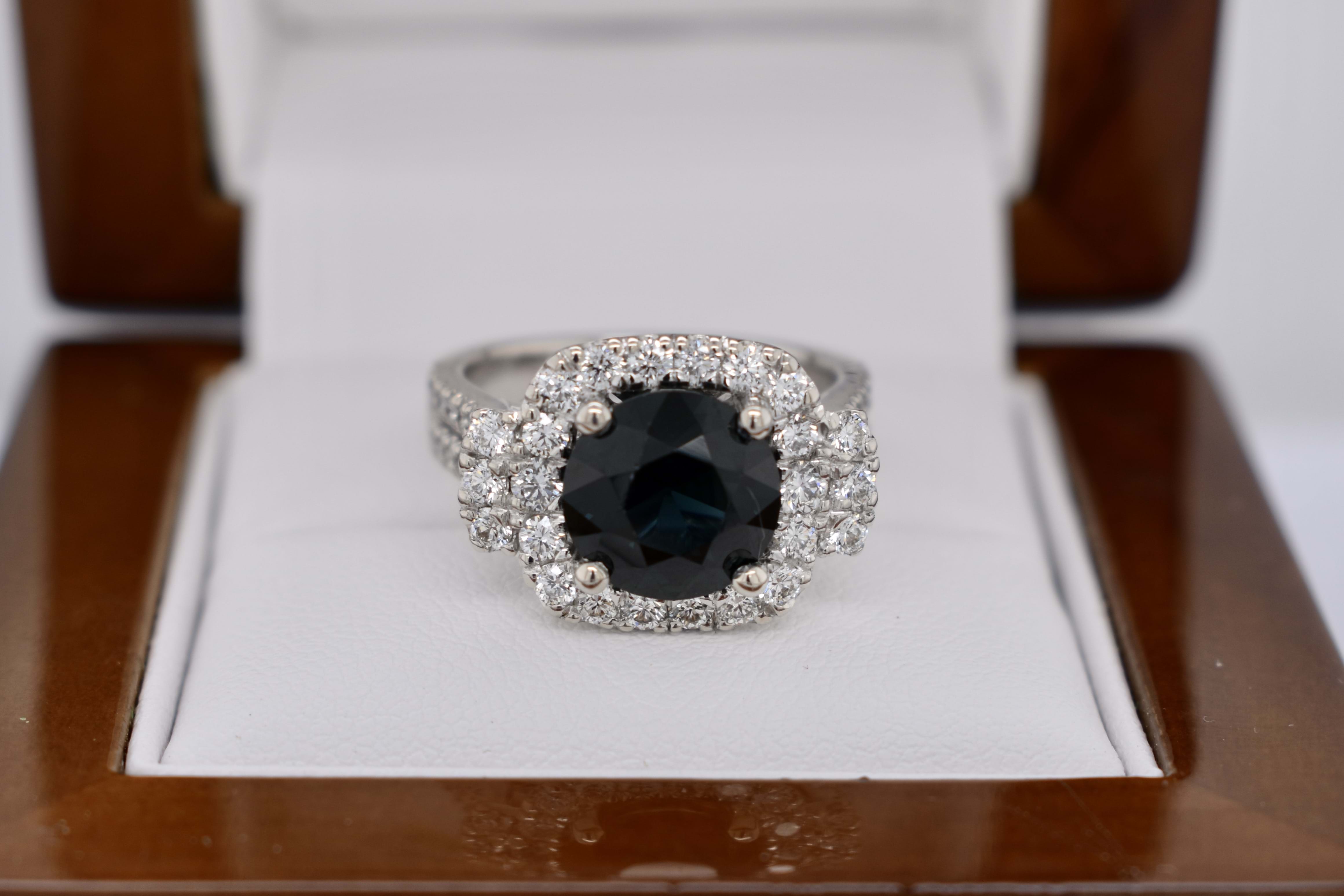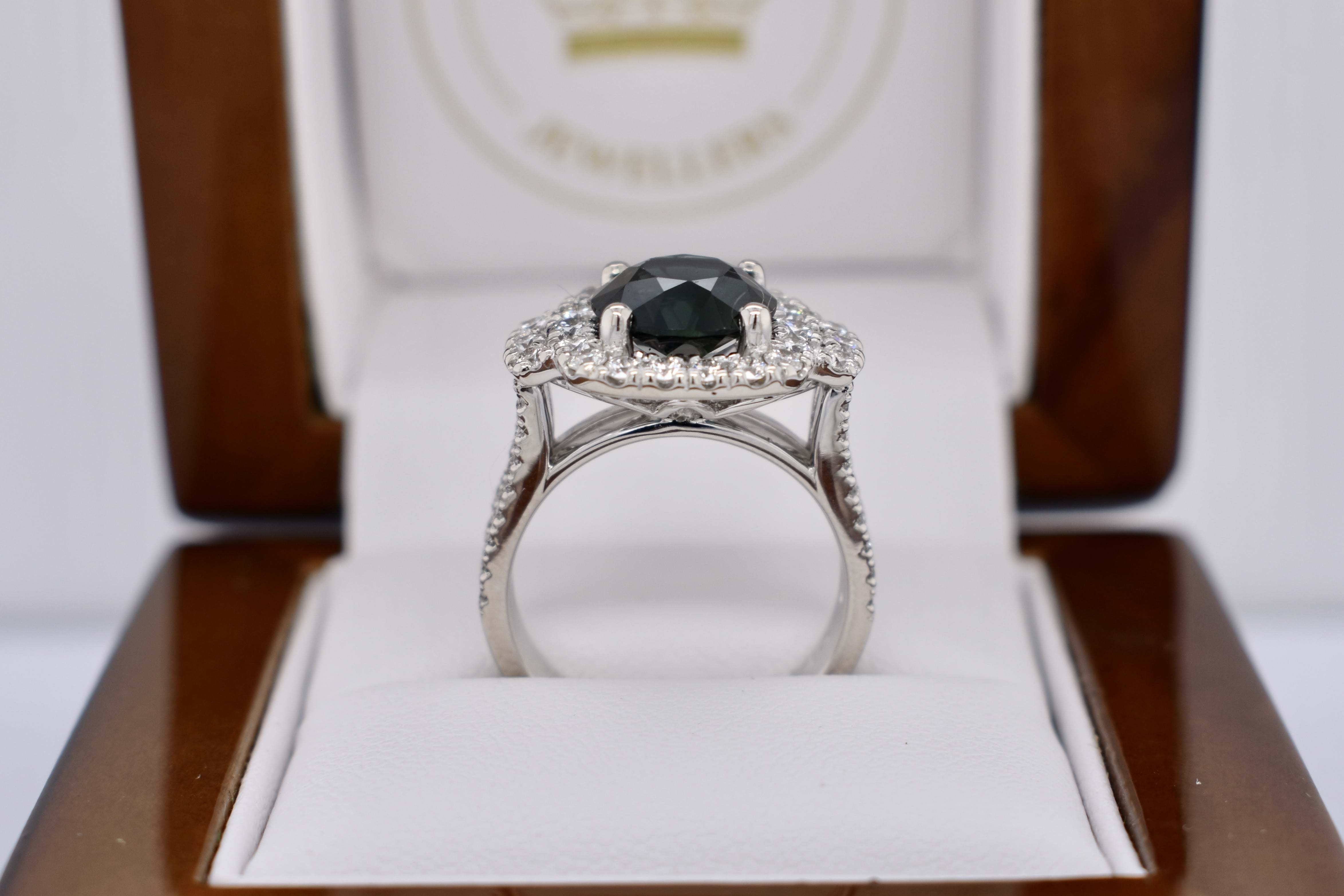 A stunning 18ct white gold ring featuring a beautiful 3.18ct teal sapphire surrounded by sparkling round brilliant cut diamonds in a cushion shape halo, flanked by an additional row of three diamonds on each side and a diamond set split shoulders. Independent Valuation Supplied.