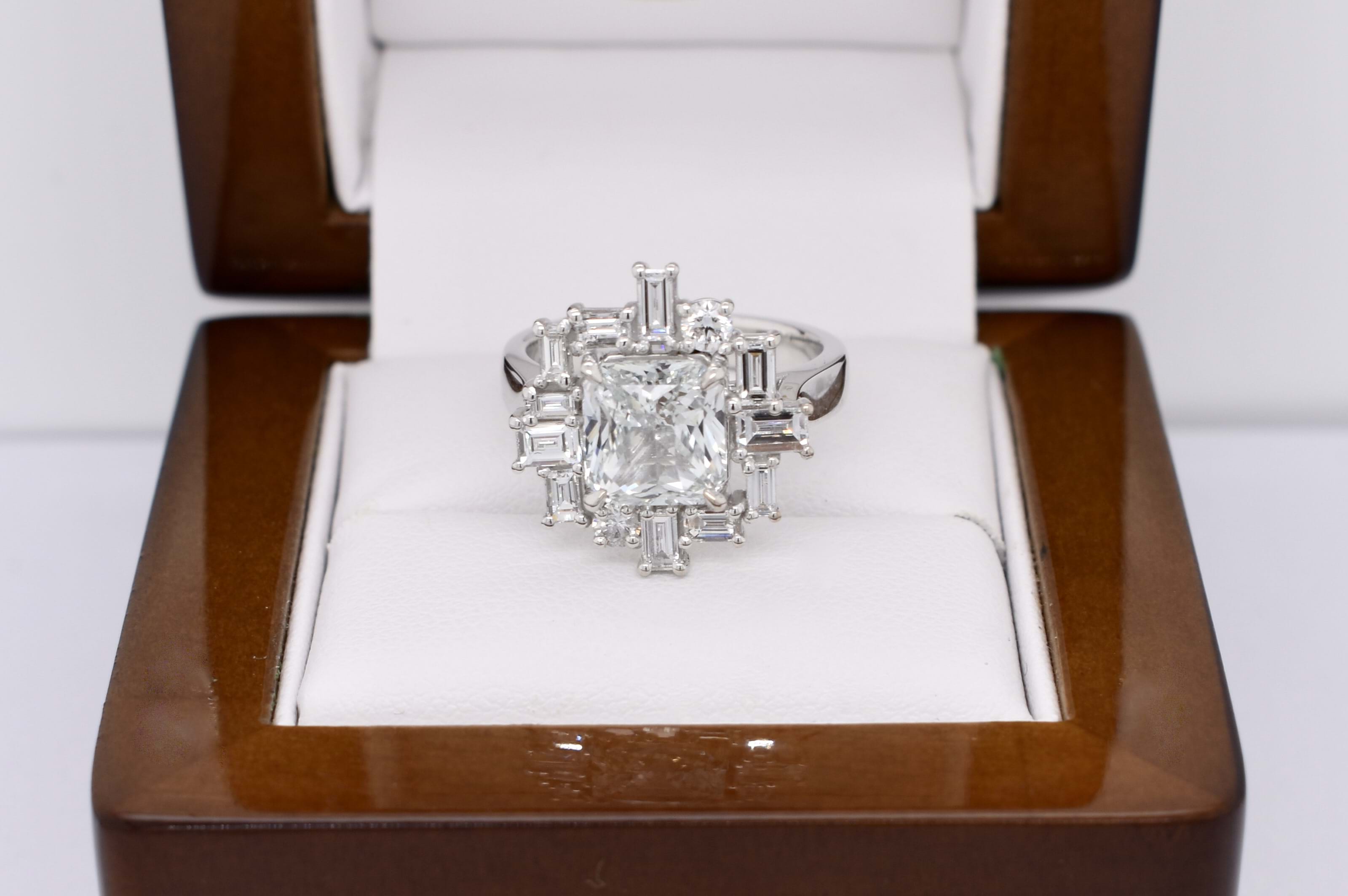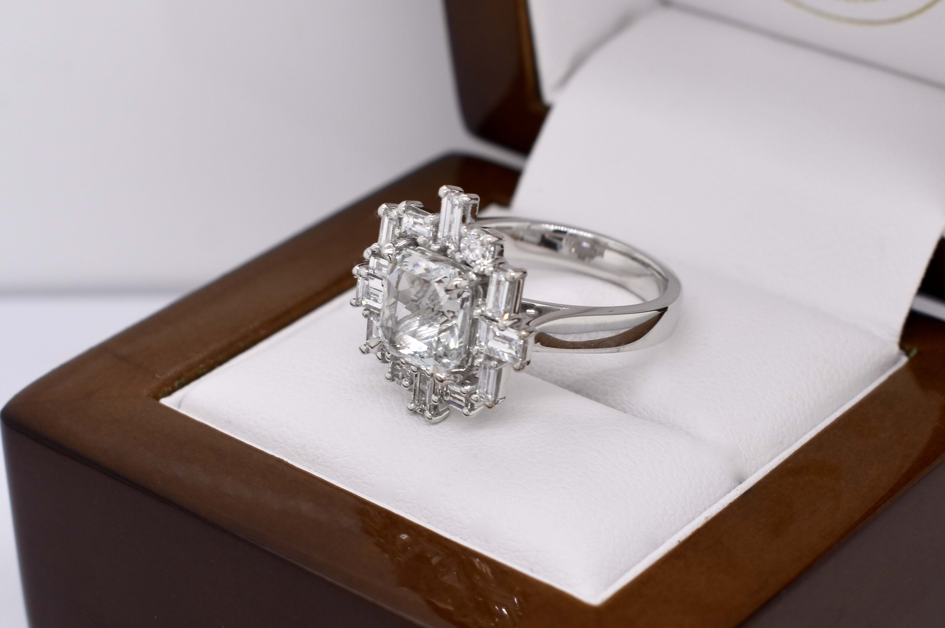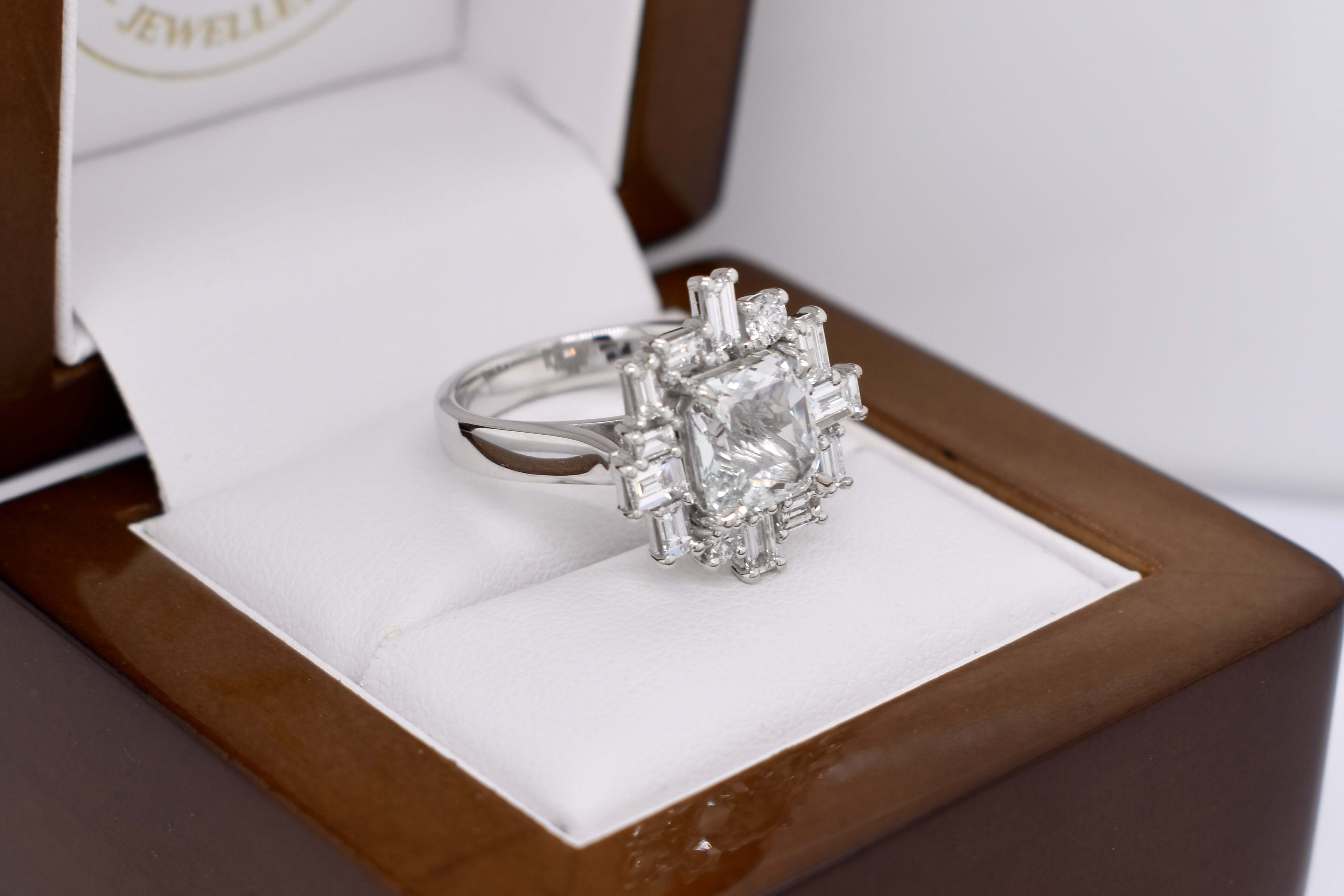 This stunning geometric dress ring has been crafted beautifully in our workshop in 18ct white gold and features a gorgeous, square radiant cut, 3.53ct colourless sapphire four claw set in the centre of a baguette & round brilliant cut diamond surround. Independent Valuation Supplied.