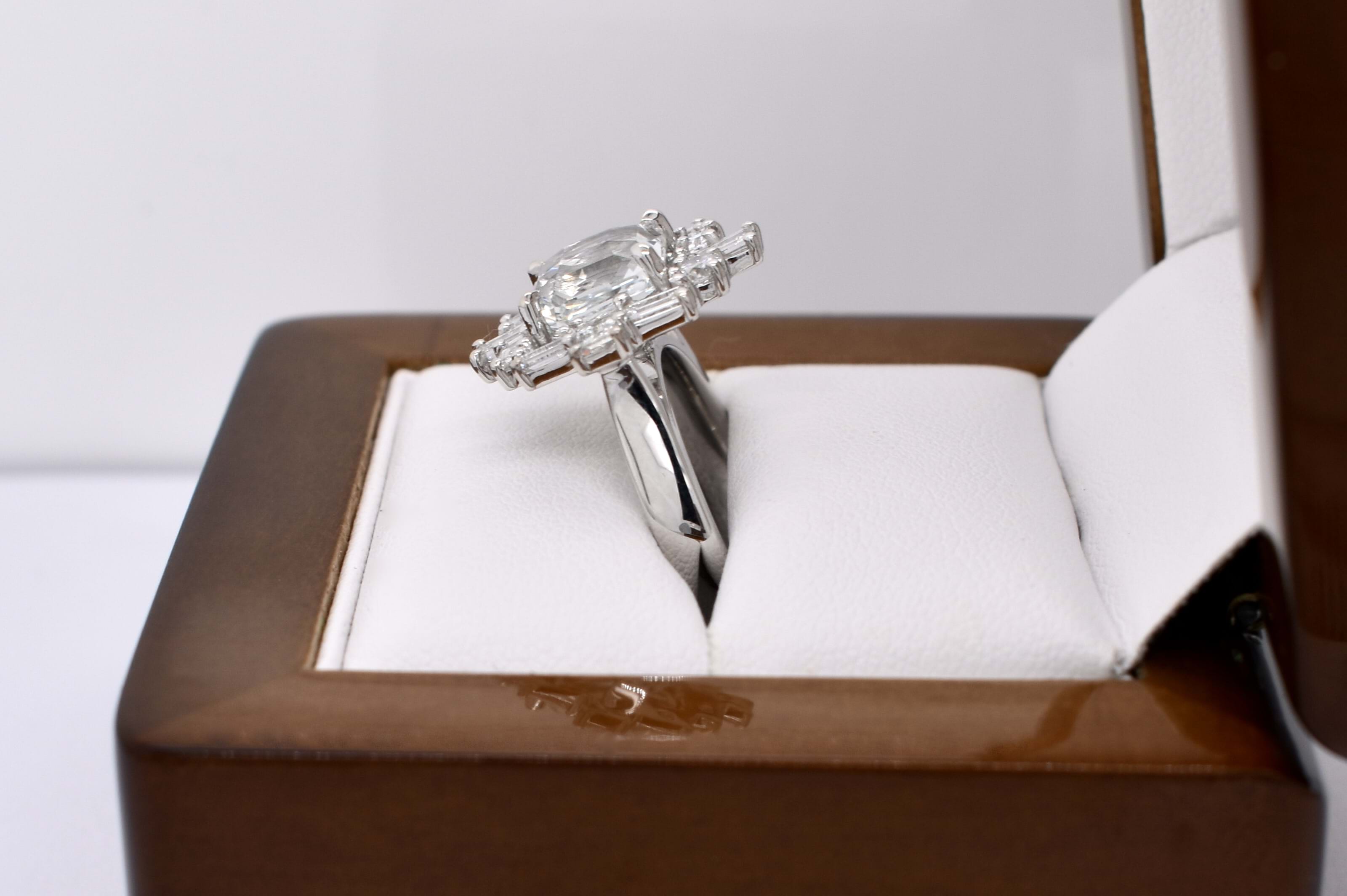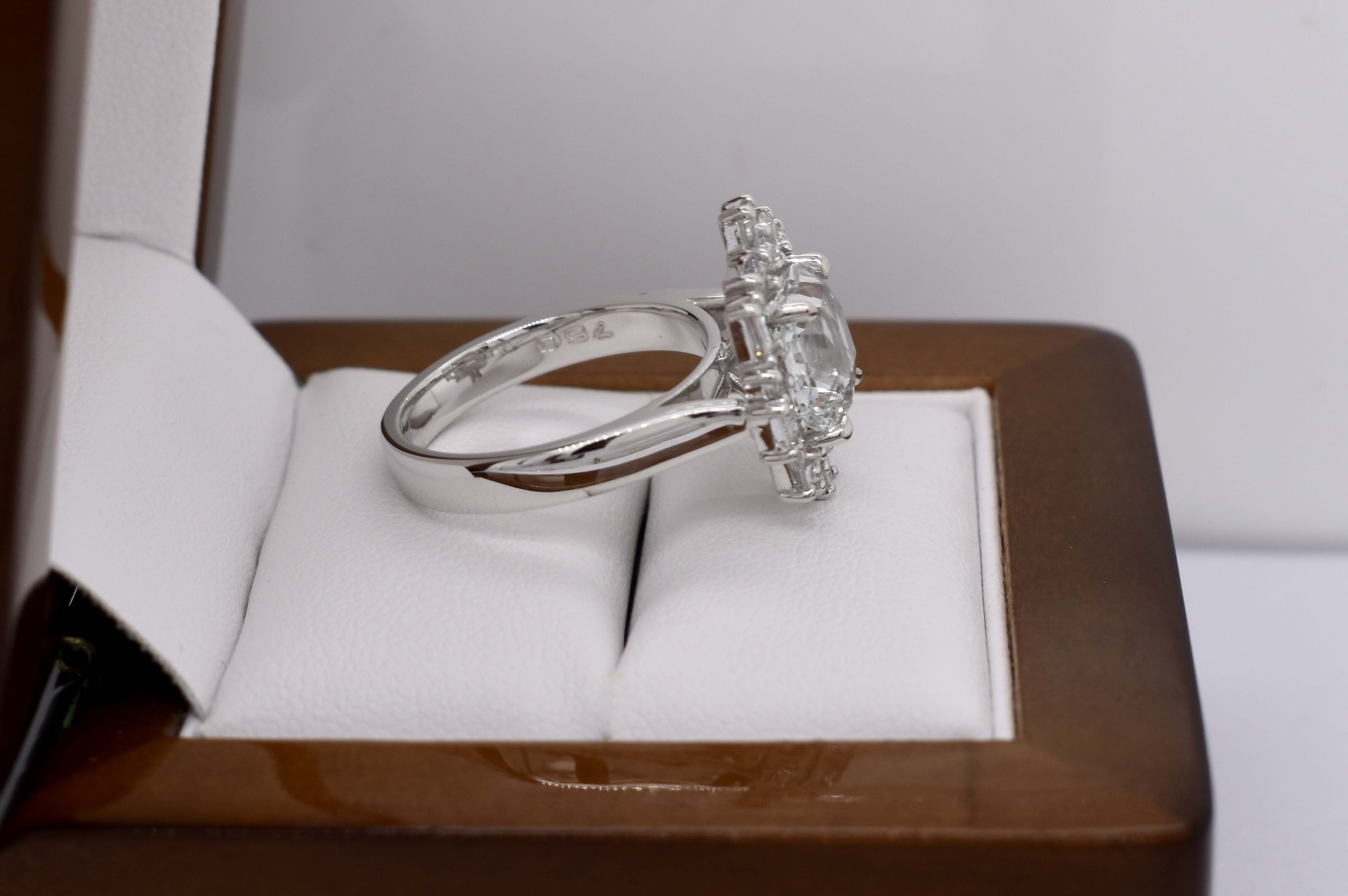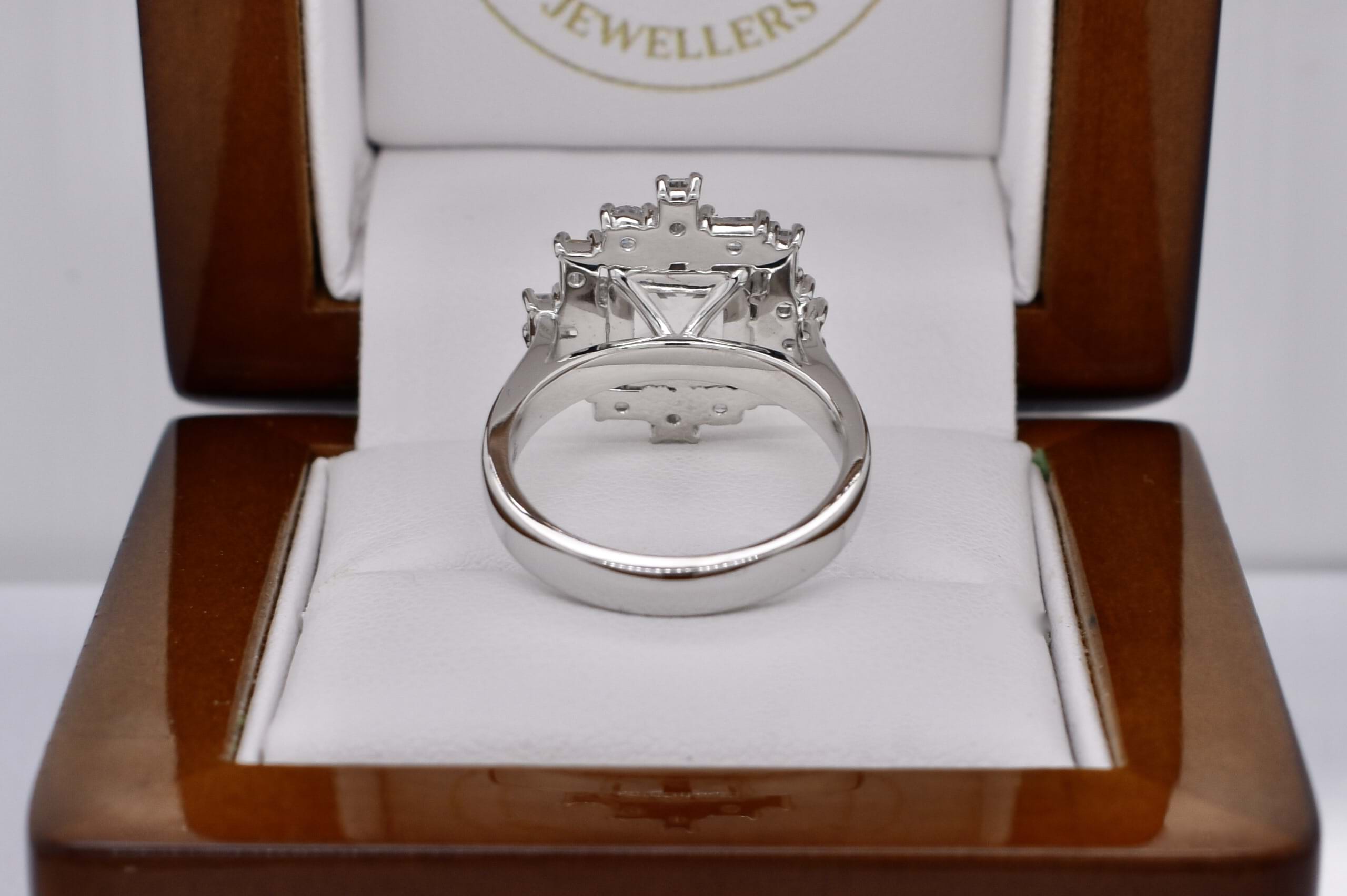 This stunning geometric dress ring has been crafted beautifully in our workshop in 18ct white gold and features a gorgeous, square radiant cut, 3.53ct colourless sapphire four claw set in the centre of a baguette & round brilliant cut diamond surround. Independent Valuation Supplied.