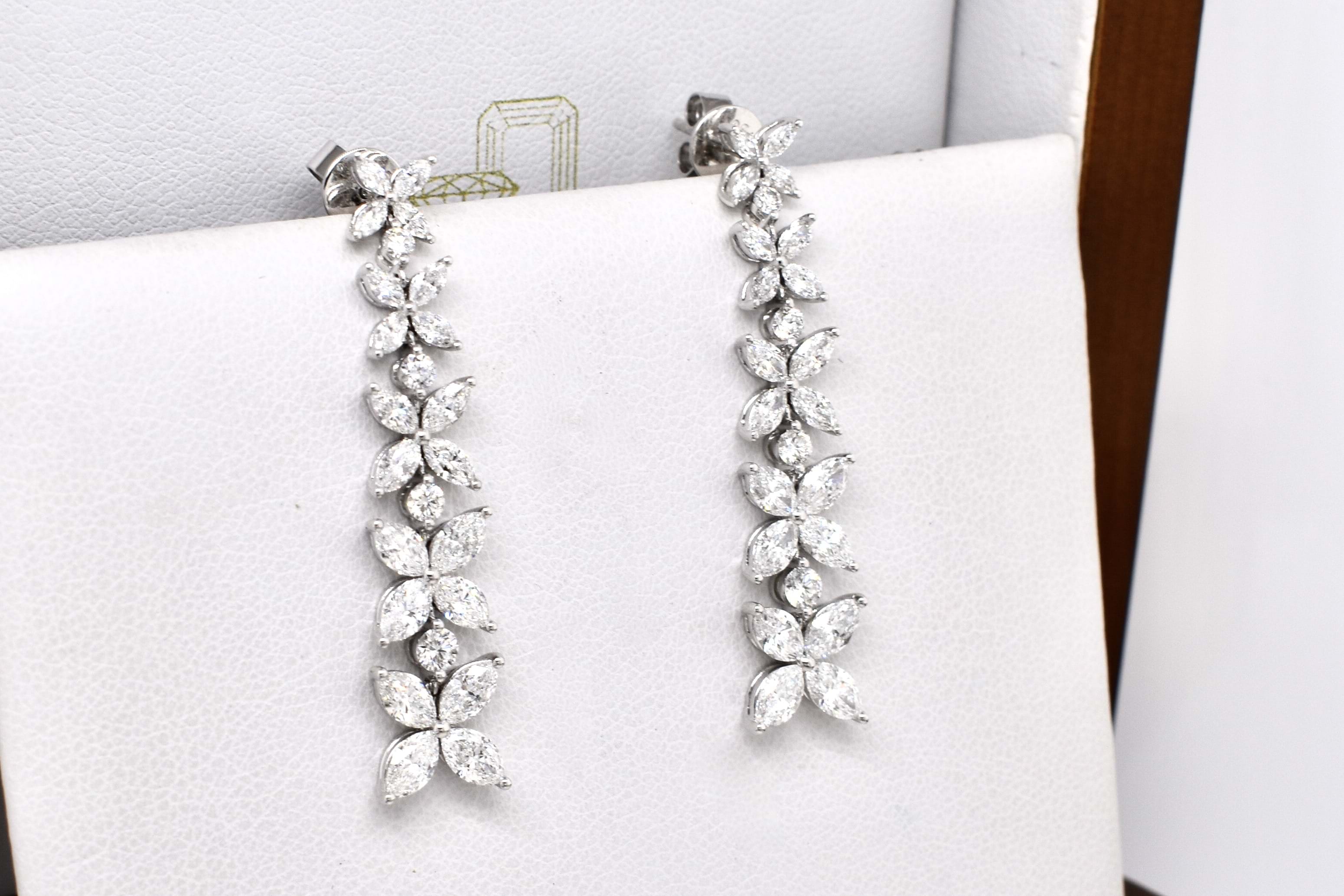 Scintillating and elegant diamond drop earrings custom made for our clients special event. Crafted in 18ct white gold these stunning drop earrings are suspended from stud fittings and feature a combined 20 marquise shape diamonds equaling 2.71cts and 24 round brilliant cut diamonds totaling 1.10cts each claw set in a butterfly shape cluster and suspended in this articulating drop design. Two alternate matching necklaces were also made for the event and photos can be found in this category. Independent Valuation Supplied.