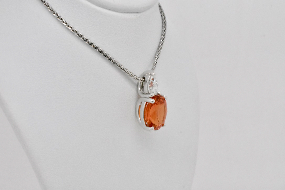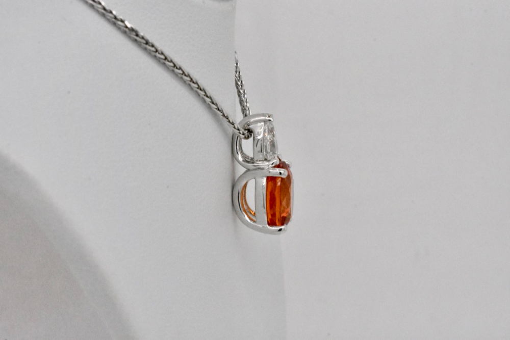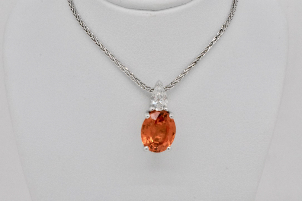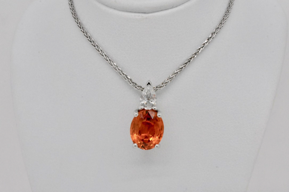 A gorgeous mandarin garnet of 3.93cts from Mozambique hand selected alongside the client to be the final piece of a custom designed parure. Crafted in 18ct white gold the bale of this pendant is a scintillating, GIA certified, 0.50ct pear shape diamond of high colour and clarity. GIA certificate and Independent Valuation Supplied