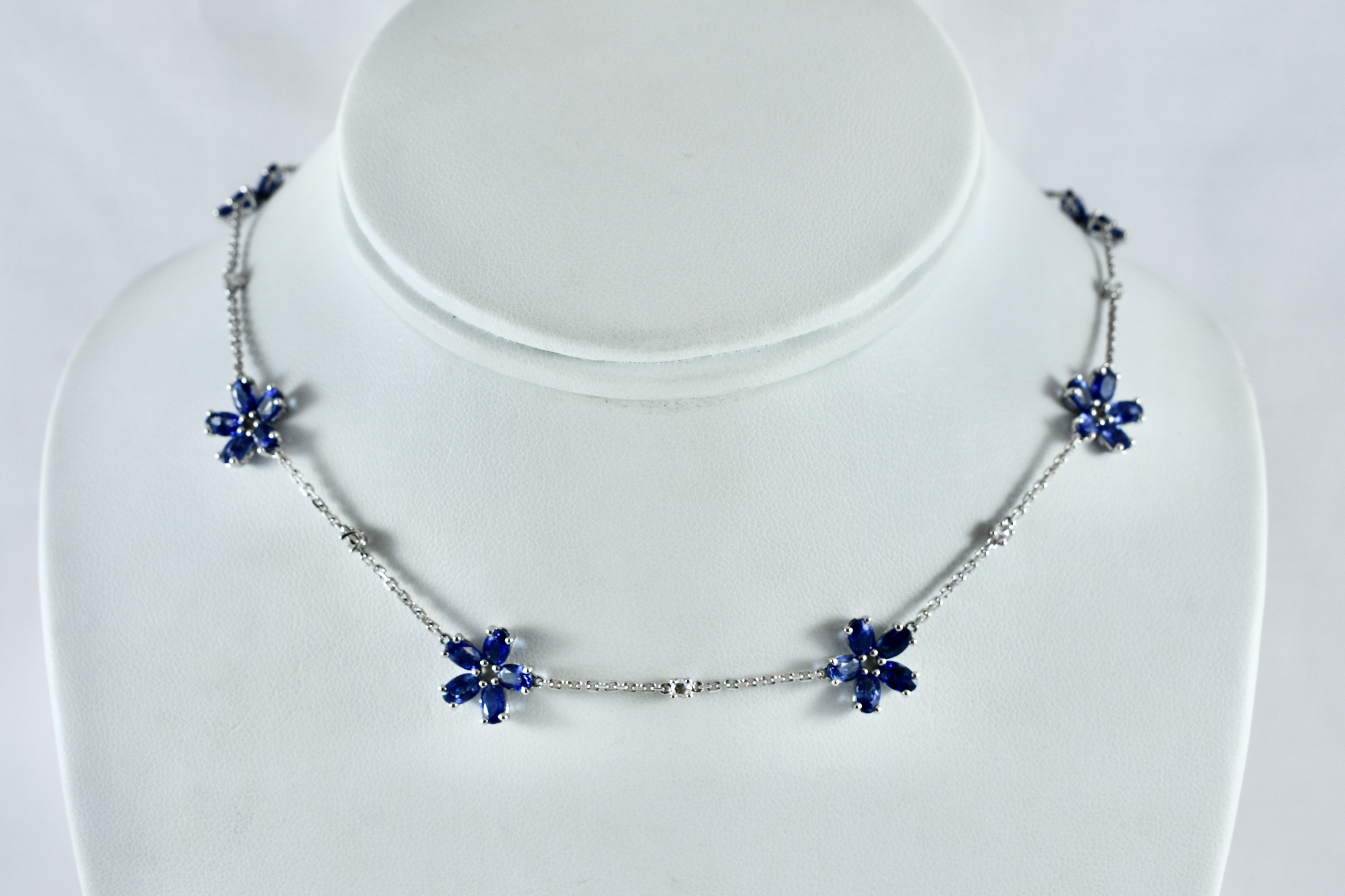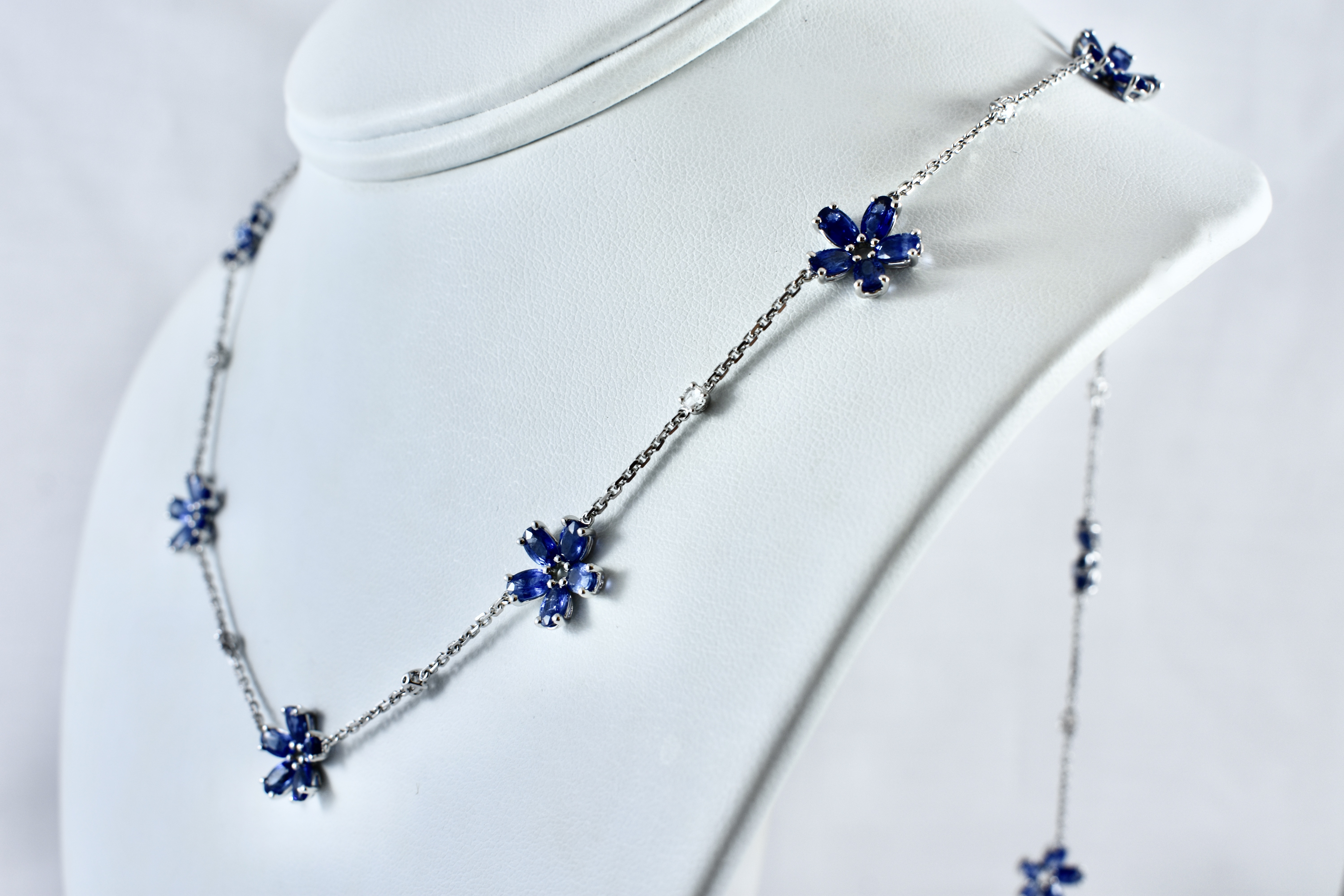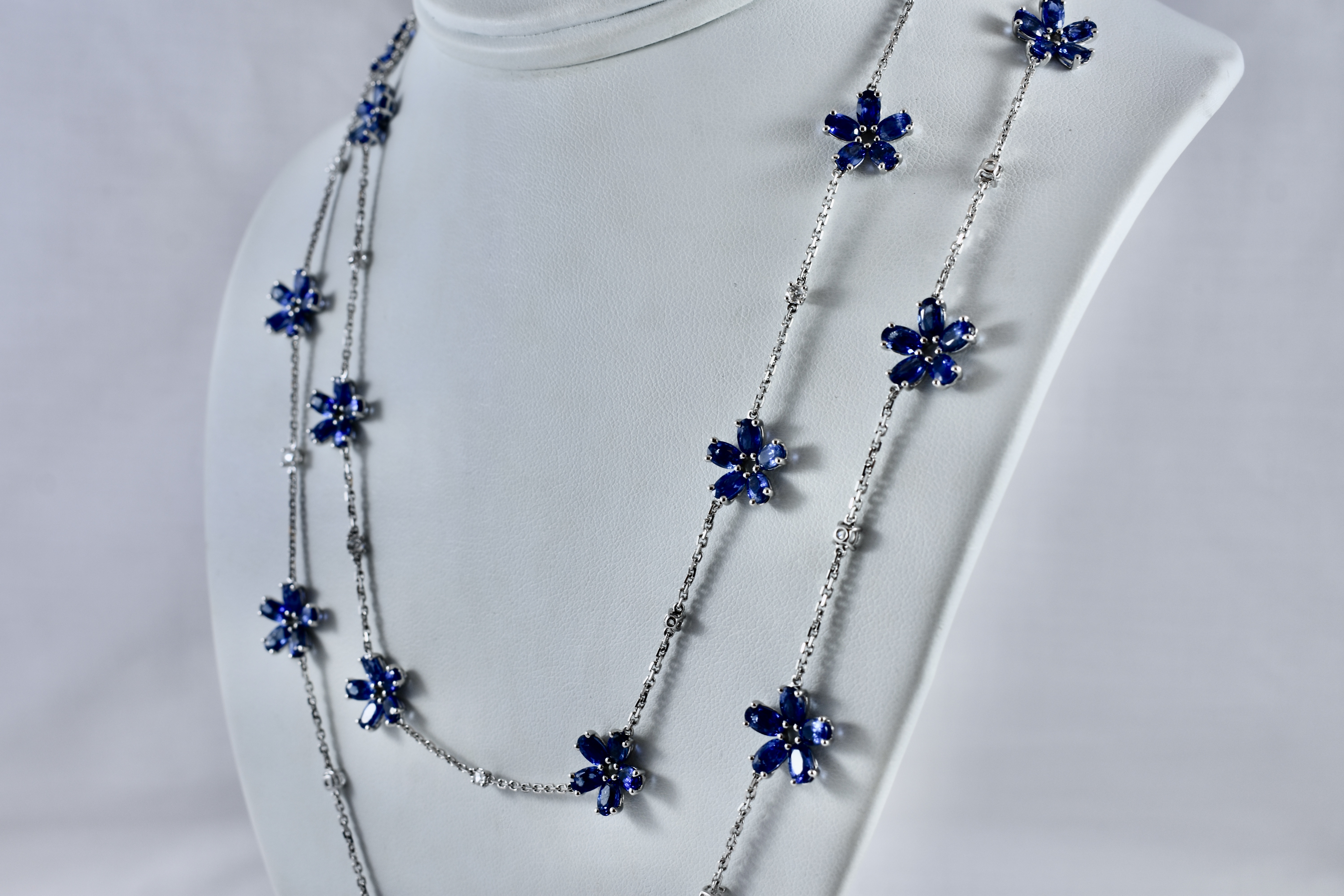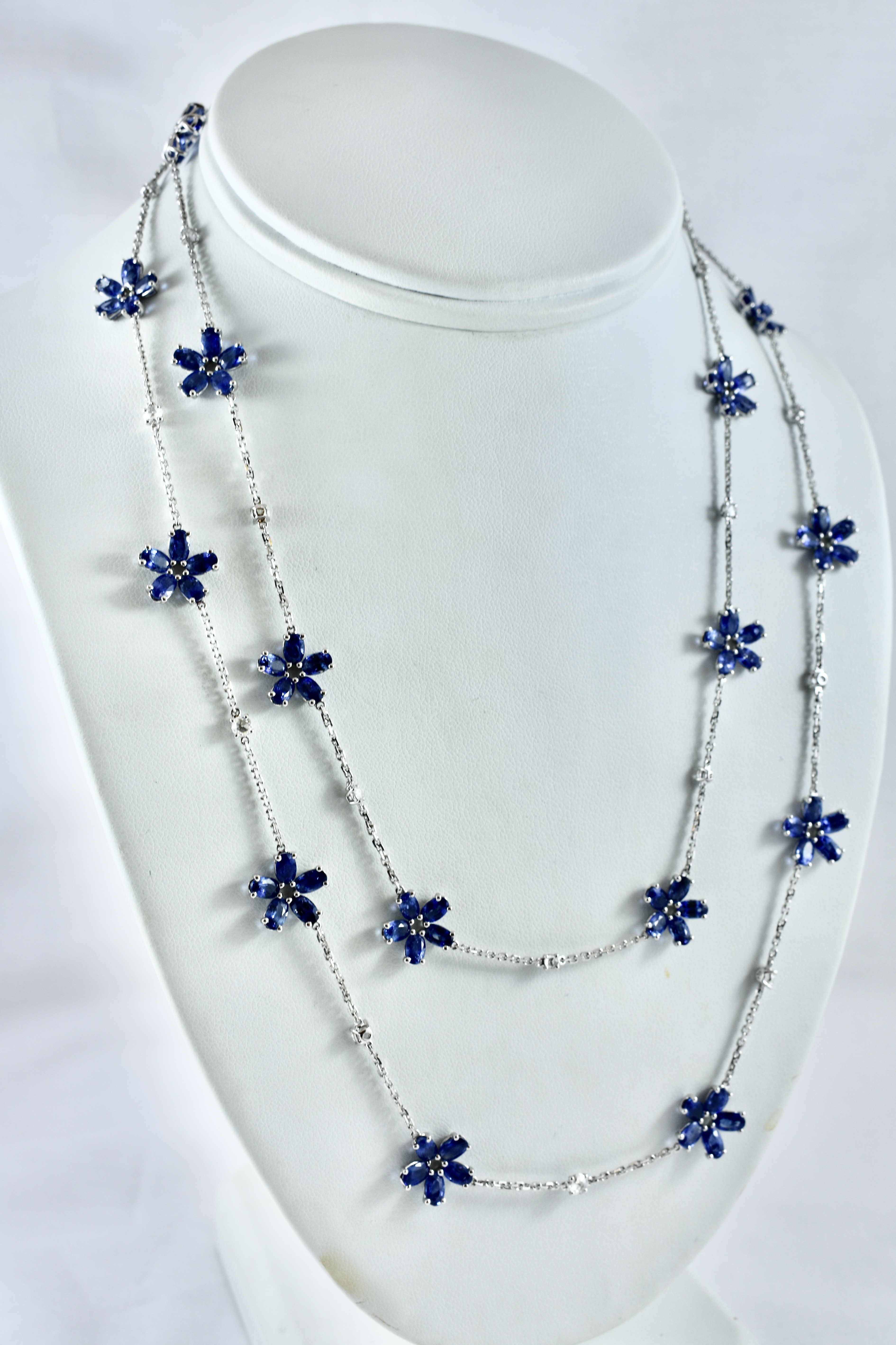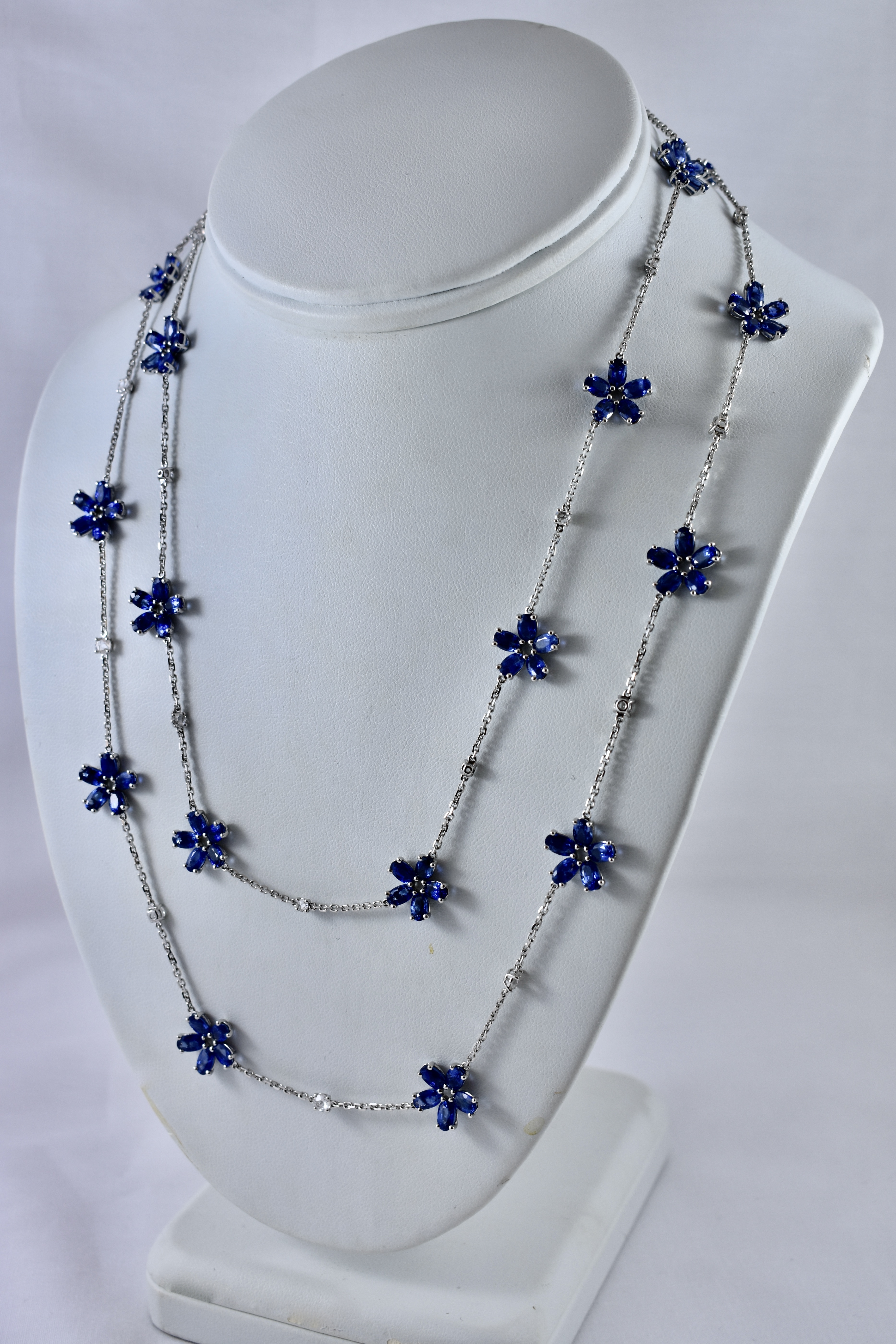 Totally stunning station necklace found at an international jewellery fair for our wonderful client. The necklace is crafted in 18ct white gold and features flowers of oval Ceylon sapphires set alternately with a single sparkling rose cut diamond along the 96cm chain. The 100 sapphires total 32.14cts and 20 rose cut diamonds equal 1.34ct FGVS-SI. Independent Valuation Supplied.