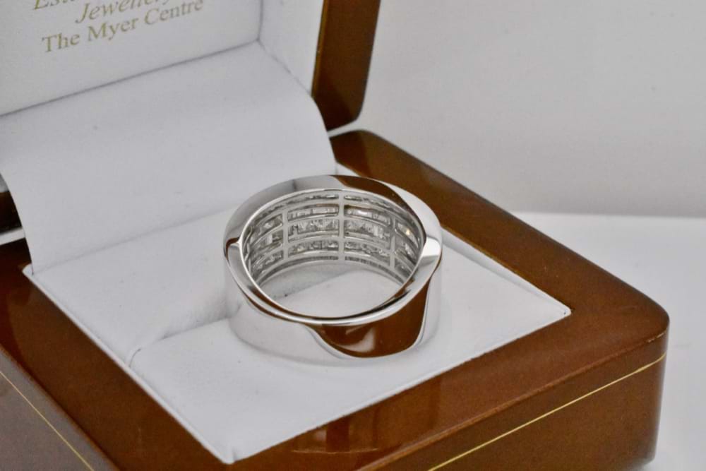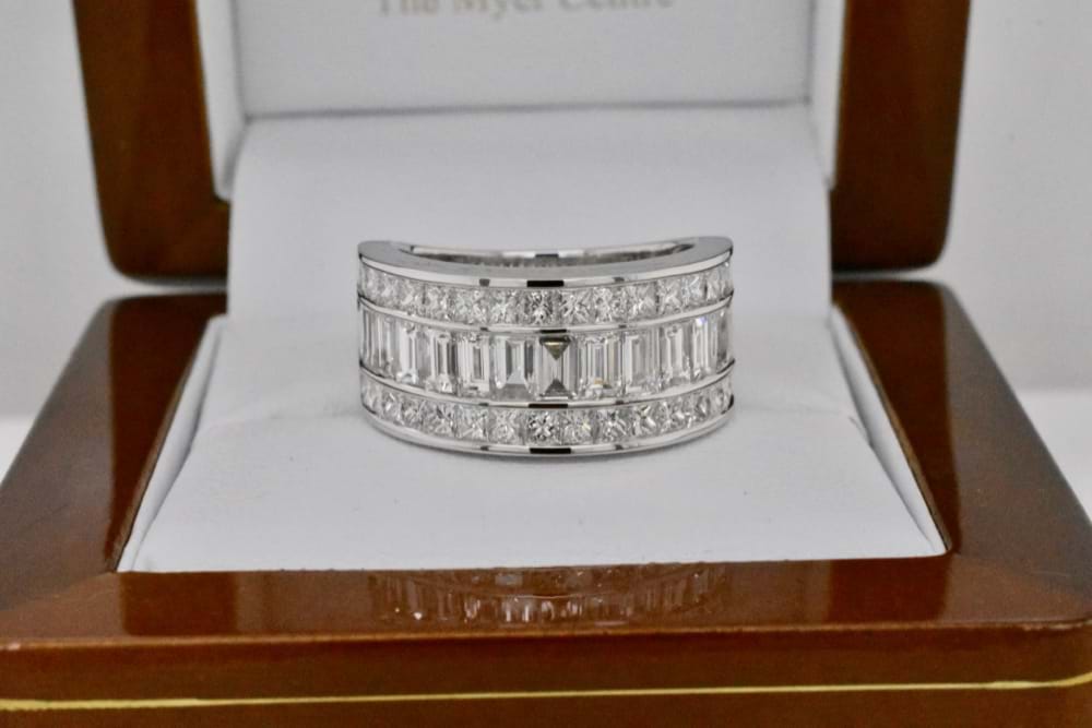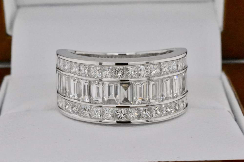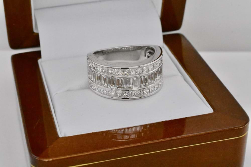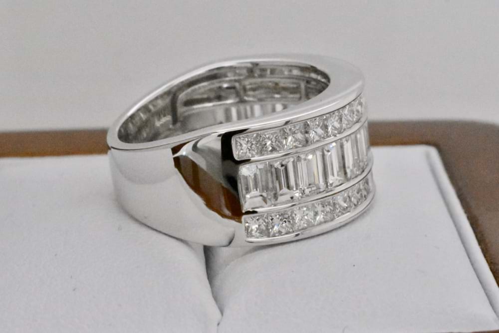 This fabulous and scintillating diamond ring was created to achieve maximum sparkle and impact for its' awesome owner. Crafted in 18ct white gold it contains 15 baguette diamonds totaling 2.22cts and a further 36 princess cut diamonds totaling 1.80cts! If you are inspired by this archived design contact us today to discuss how we can create something incredible for you or your loved one. Supplied