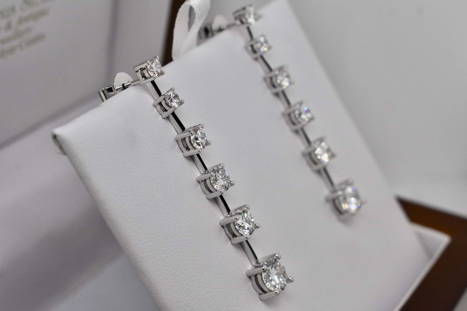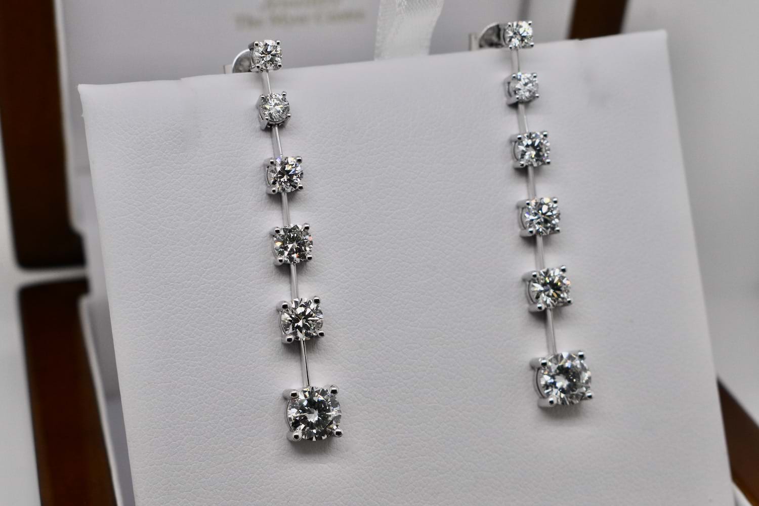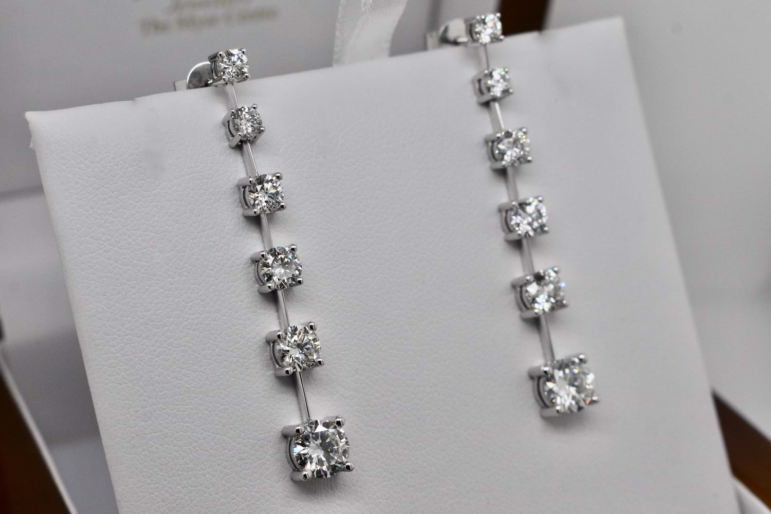 These absolutely spectacular diamond drop earrings were designed in store, with each sparkling round brilliant cut diamond hand selected by our client alongside one of our design consultants. The earrings have been beautifully crafted in 18ct white gold with each diamond four claw set and suspended from an articulated bar with stud and post fittings at the top. The earrings contain a total of 14 round brilliant cut diamonds equalling an astounding 5.16cts! Independent Valuations & Lab Certs Supplied.