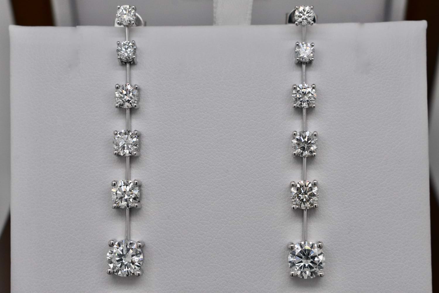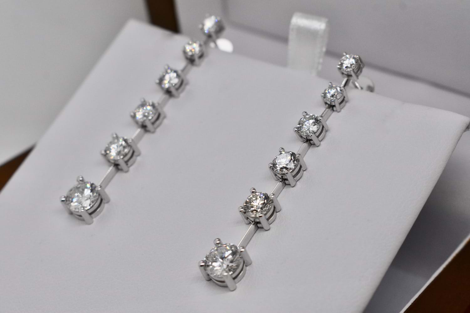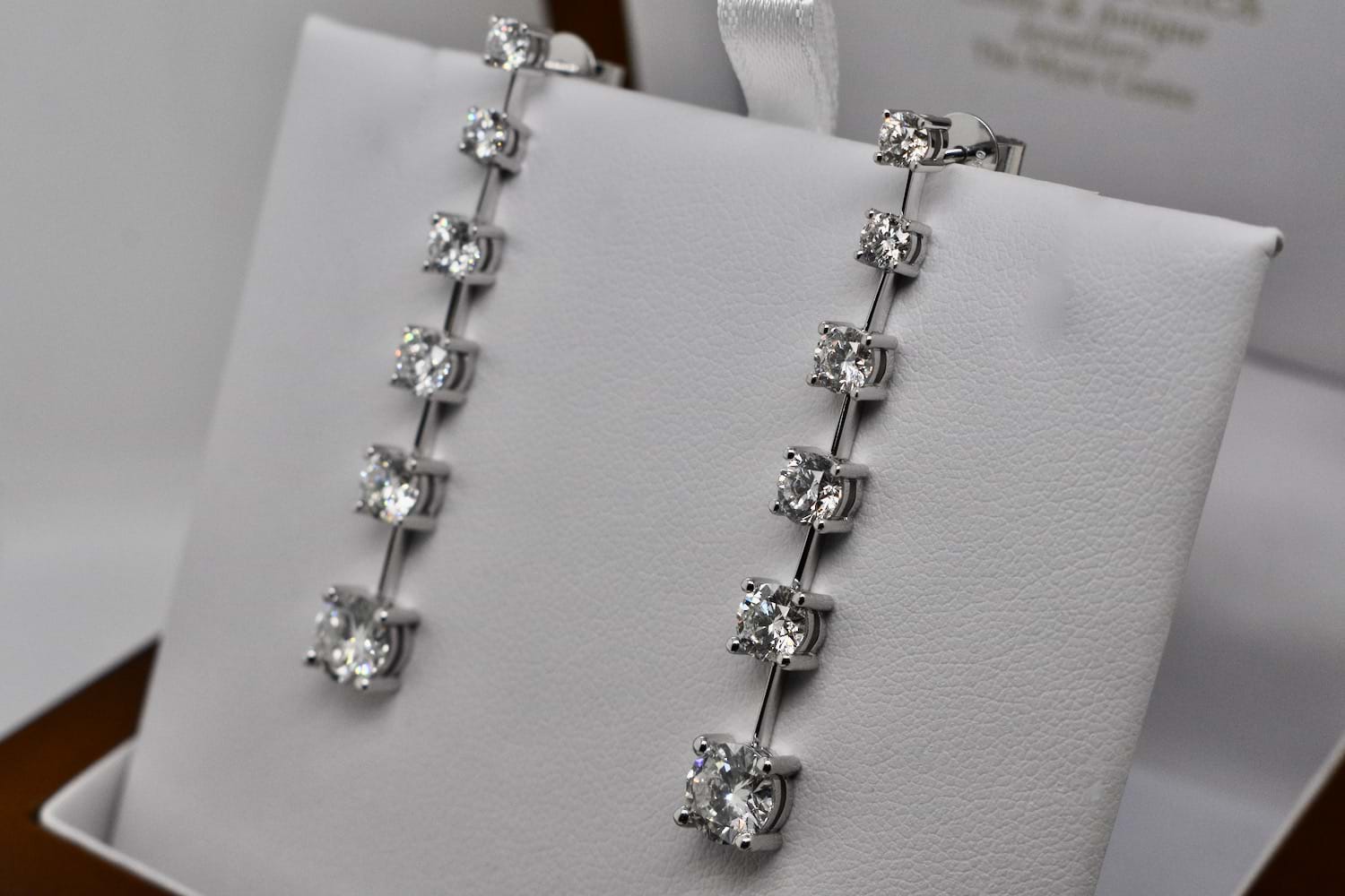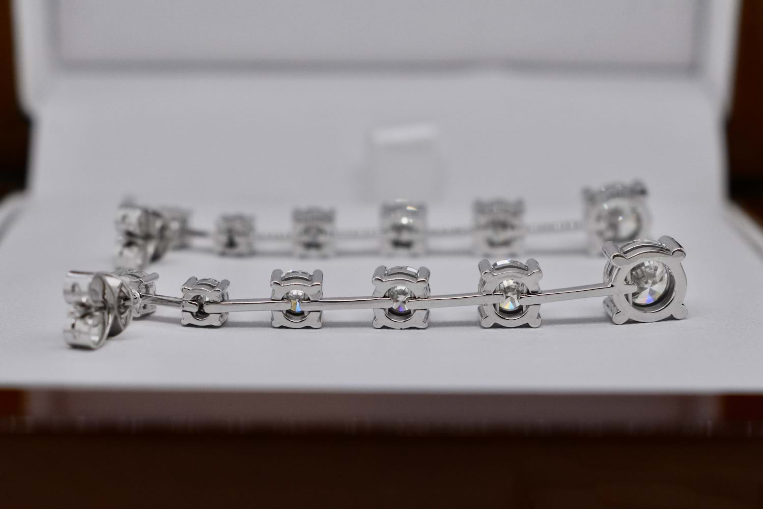 These absolutely spectacular diamond drop earrings were designed in store, with each sparkling round brilliant cut diamond hand selected by our client alongside one of our design consultants. The earrings have been beautifully crafted in 18ct white gold with each diamond four claw set and suspended from an articulated bar with stud and post fittings at the top. The earrings contain a total of 14 round brilliant cut diamonds equalling an astounding 5.16cts! Independent Valuations & Lab Certs Supplied.