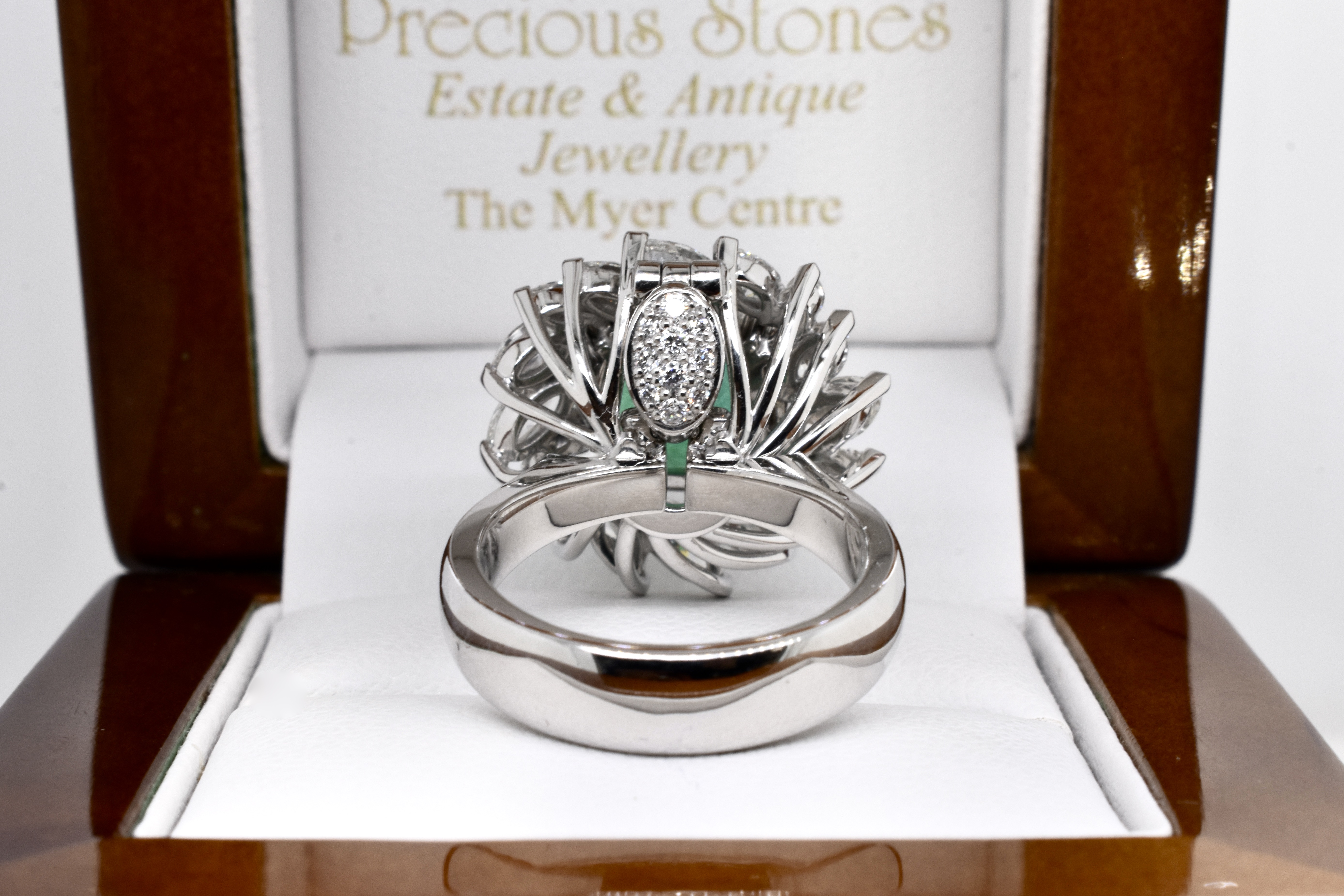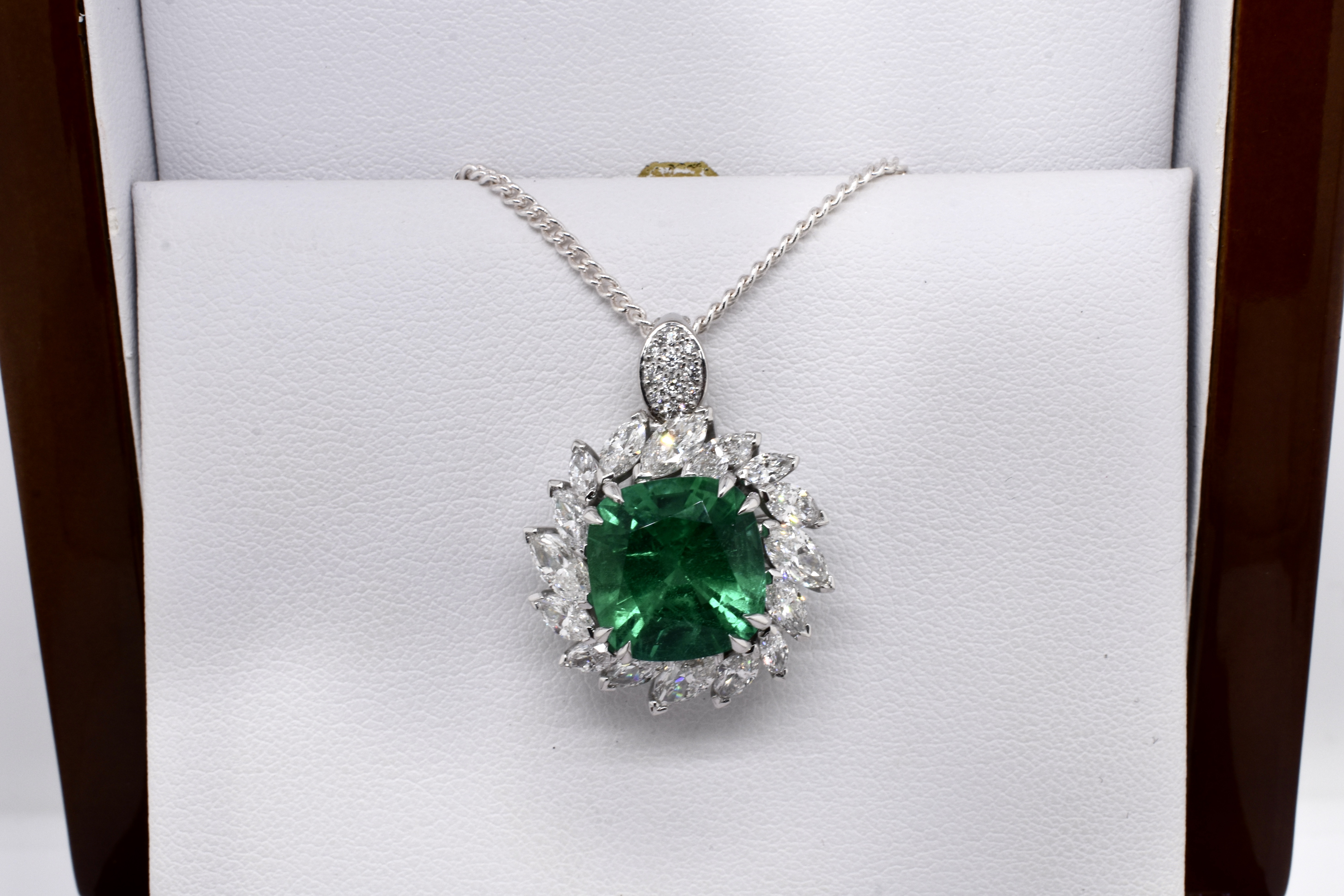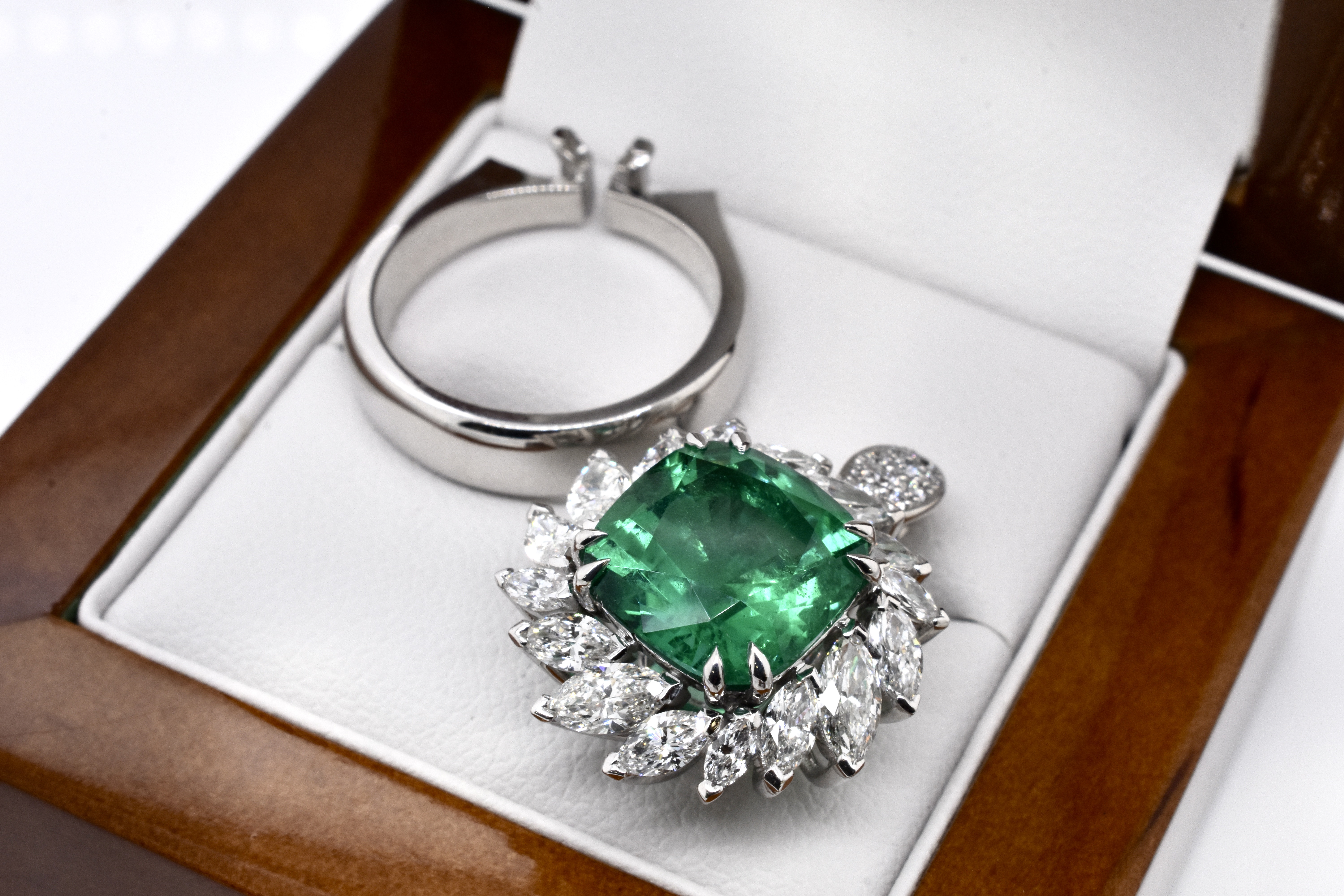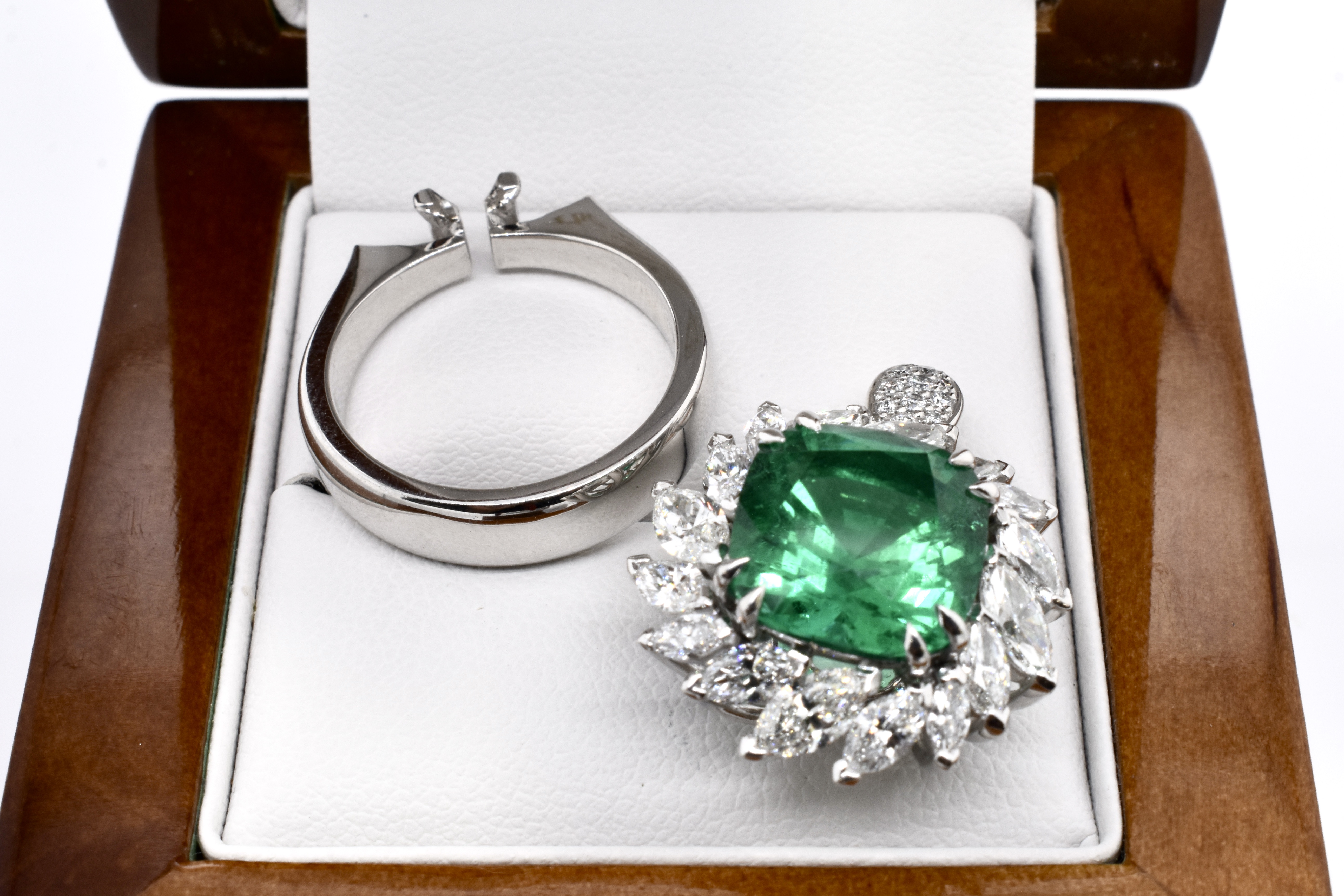 A one of a kind, extraordinary piece of wearable art featuring an ultra rare centre stone and swathe of diamonds which make the piece look like a blooming flower in motion. On first glance it may look solely like a ring, however has been cleverly and expertly designed and engineered to convert into an enhancer as well via the band which can be removed. This piece is handmade in 18ct white gold and features an exquisite centre 5.37ct cushion cut Zambian origin emerald, held in place by sets of elegant fine double talon claws with a starburst style surround of white, sparkling mixed shape marquise and round brilliant cut diamonds totalling 4.59ct D-F/VS