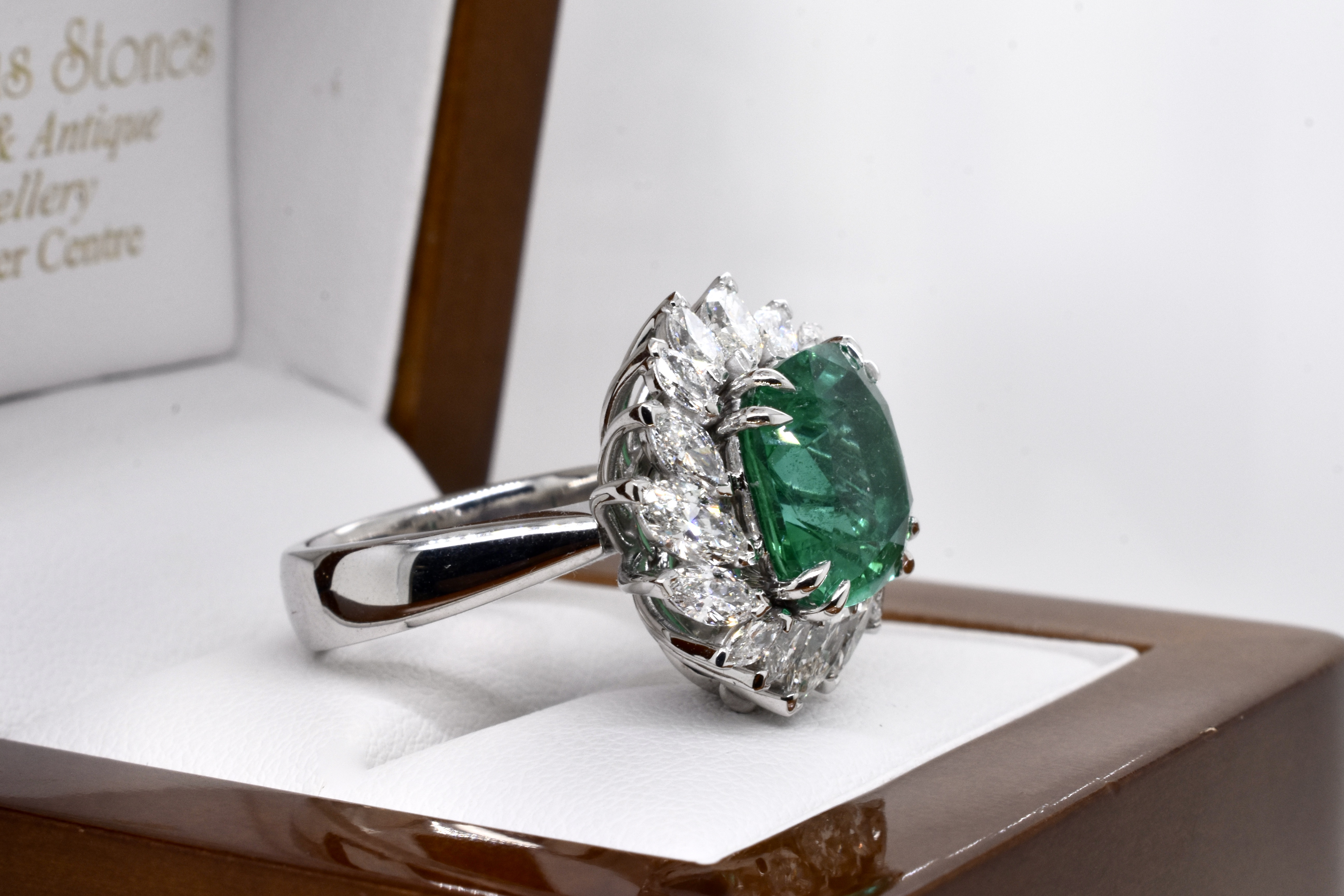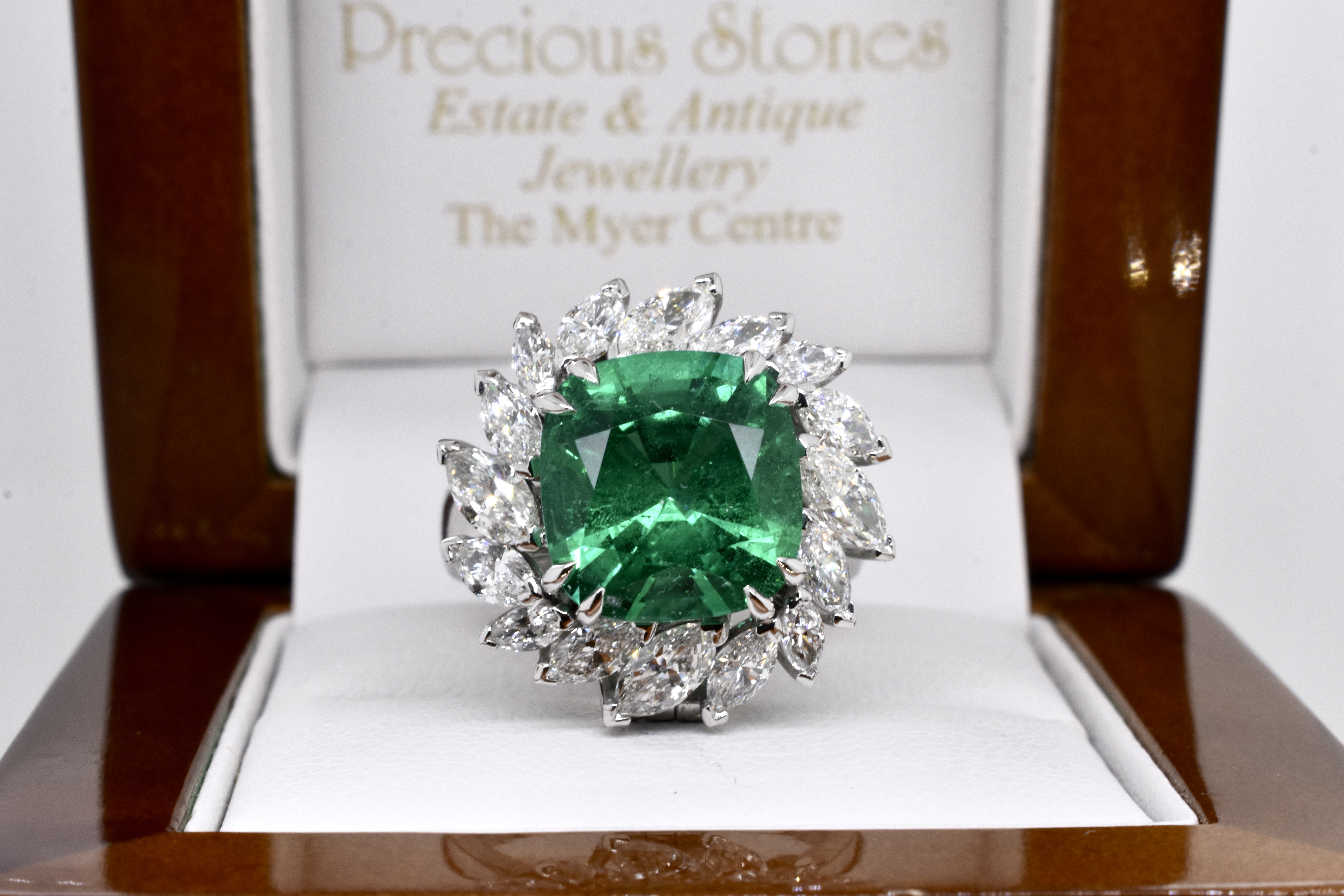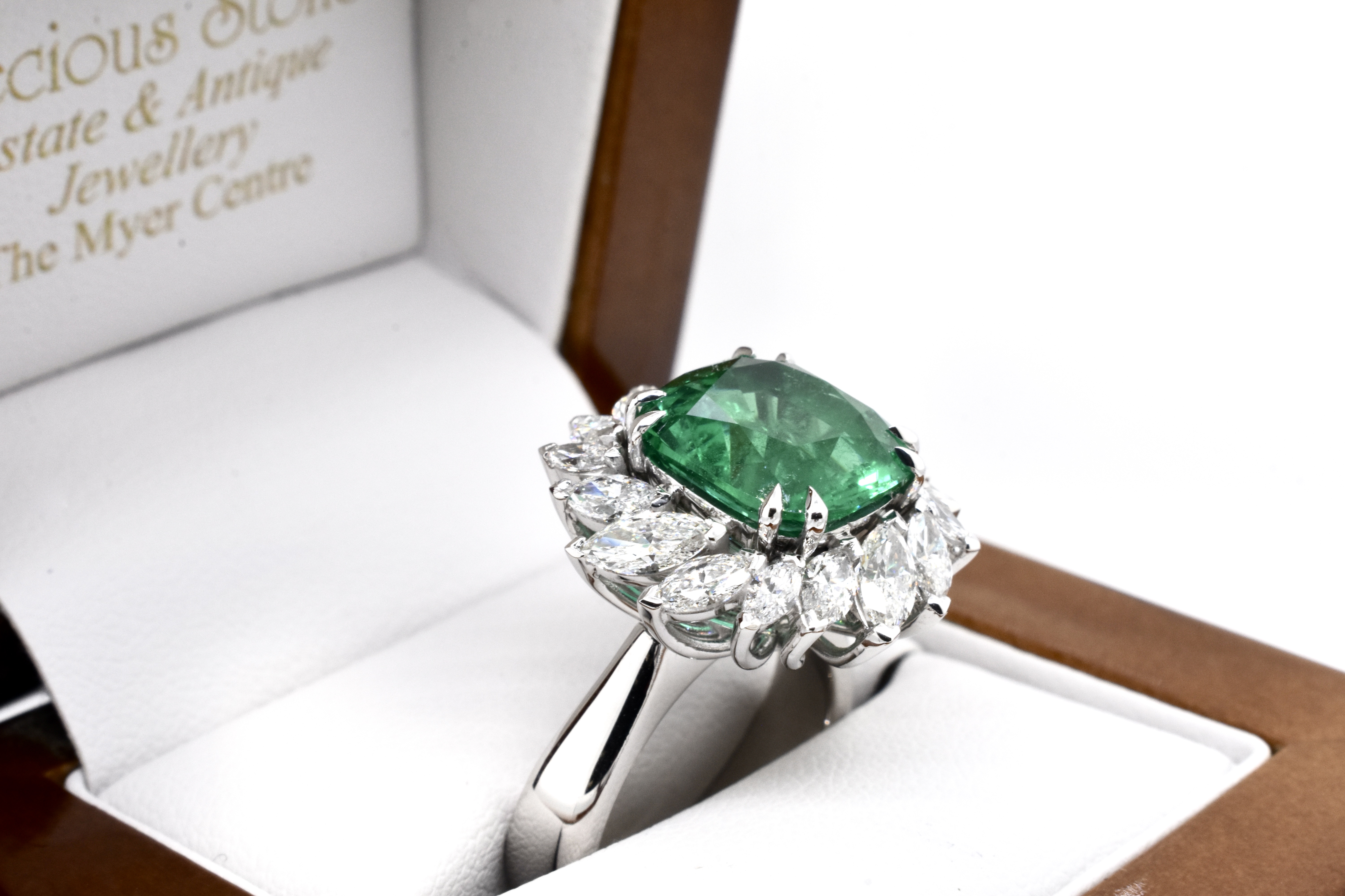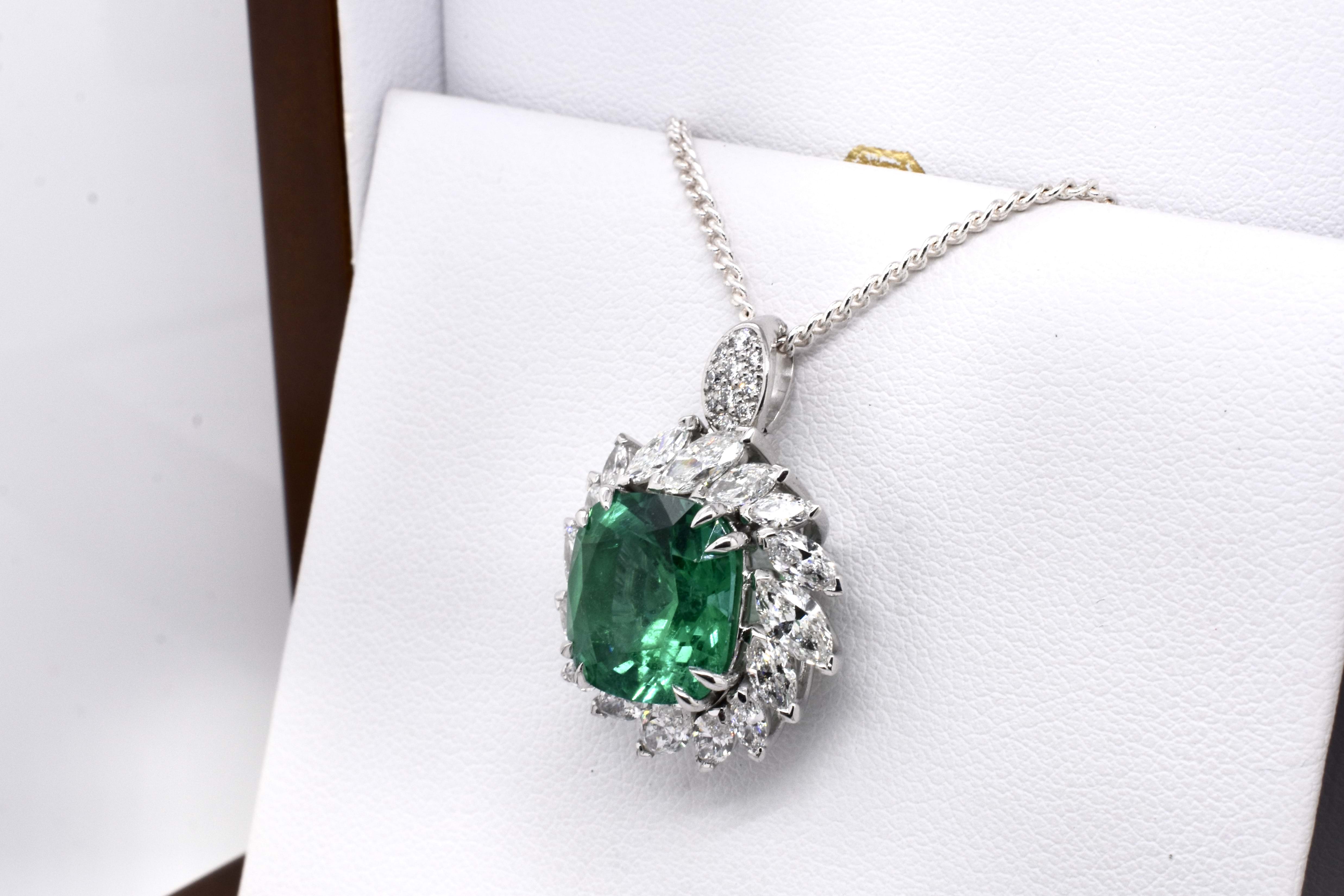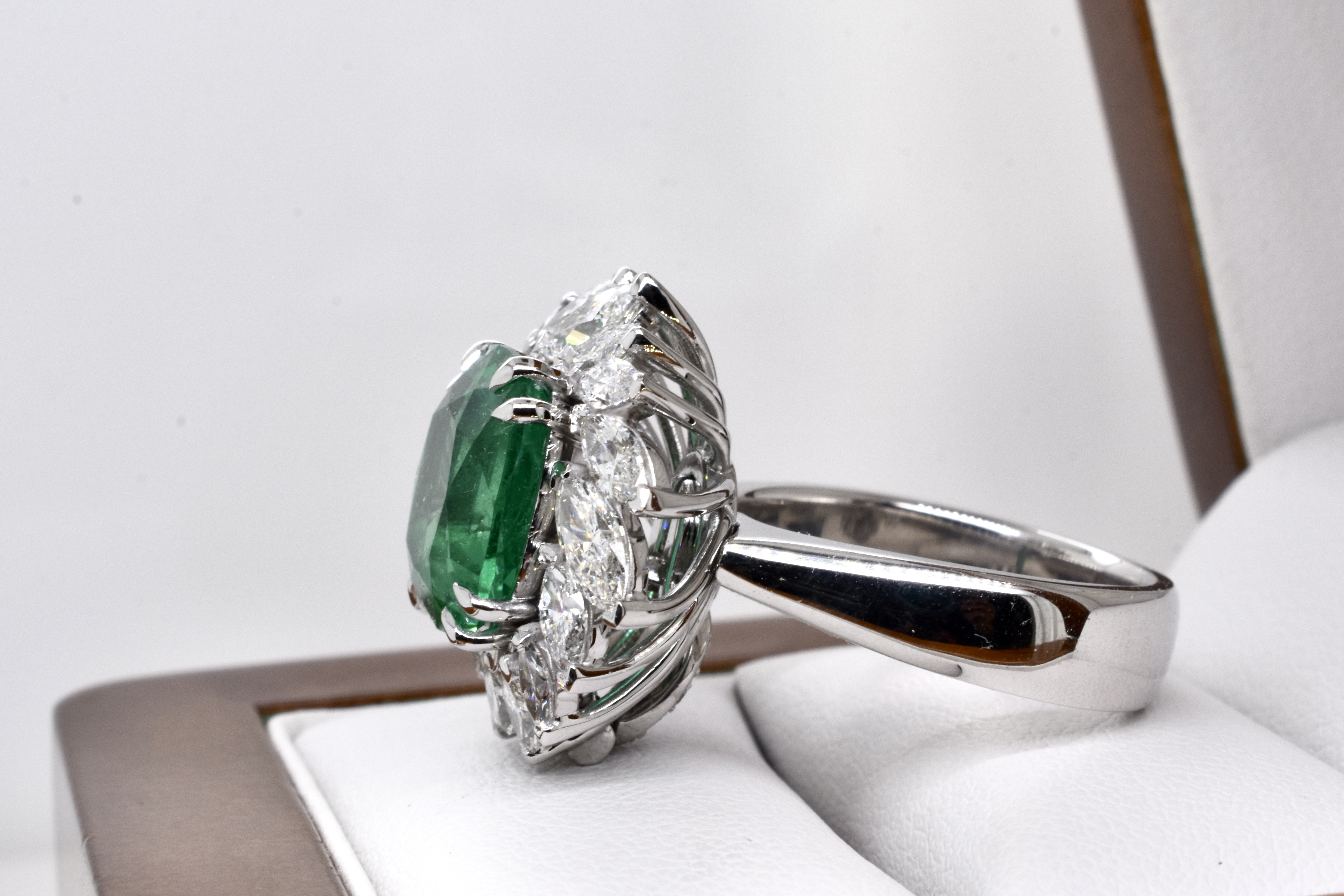 A one of a kind, extraordinary piece of wearable art featuring an ultra rare centre stone and swathe of diamonds which make the piece look like a blooming flower in motion. On first glance it may look solely like a ring, however has been cleverly and expertly designed and engineered to convert into an enhancer as well via the band which can be removed. This piece is handmade in 18ct white gold and features an exquisite centre 5.37ct cushion cut Zambian origin emerald, held in place by sets of elegant fine double talon claws with a starburst style surround of white, sparkling mixed shape marquise and round brilliant cut diamonds totalling 4.59ct D-F/VS