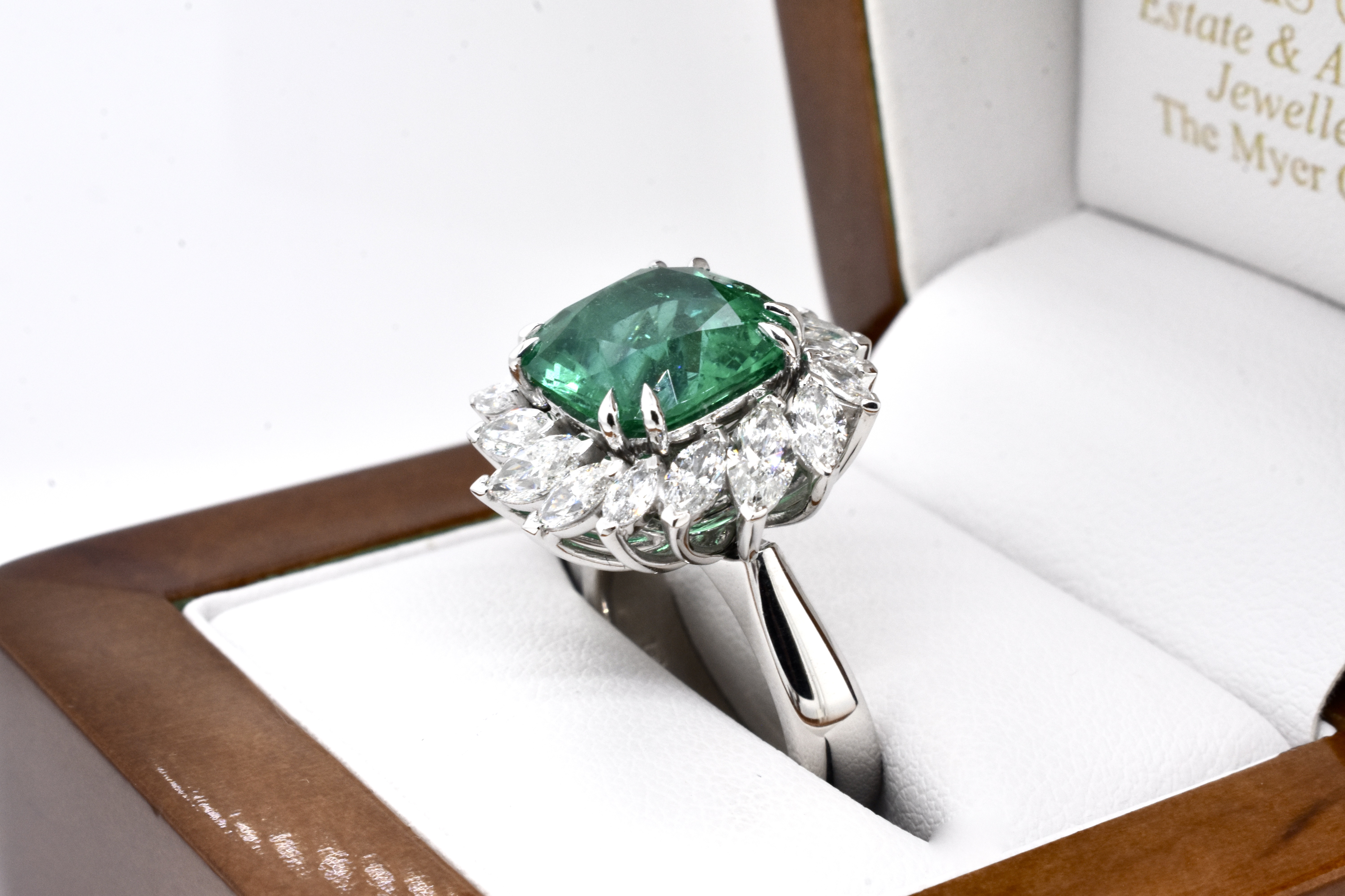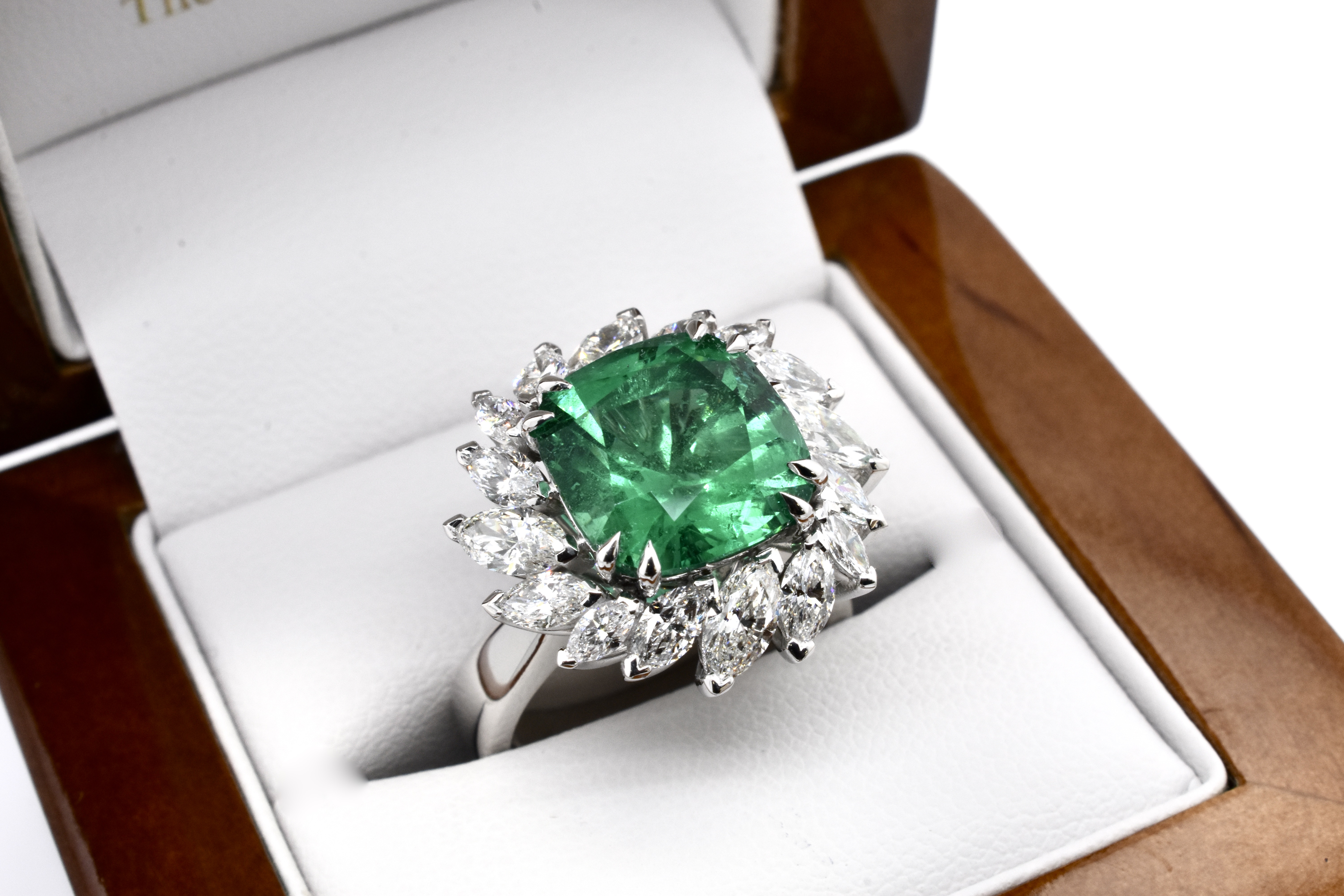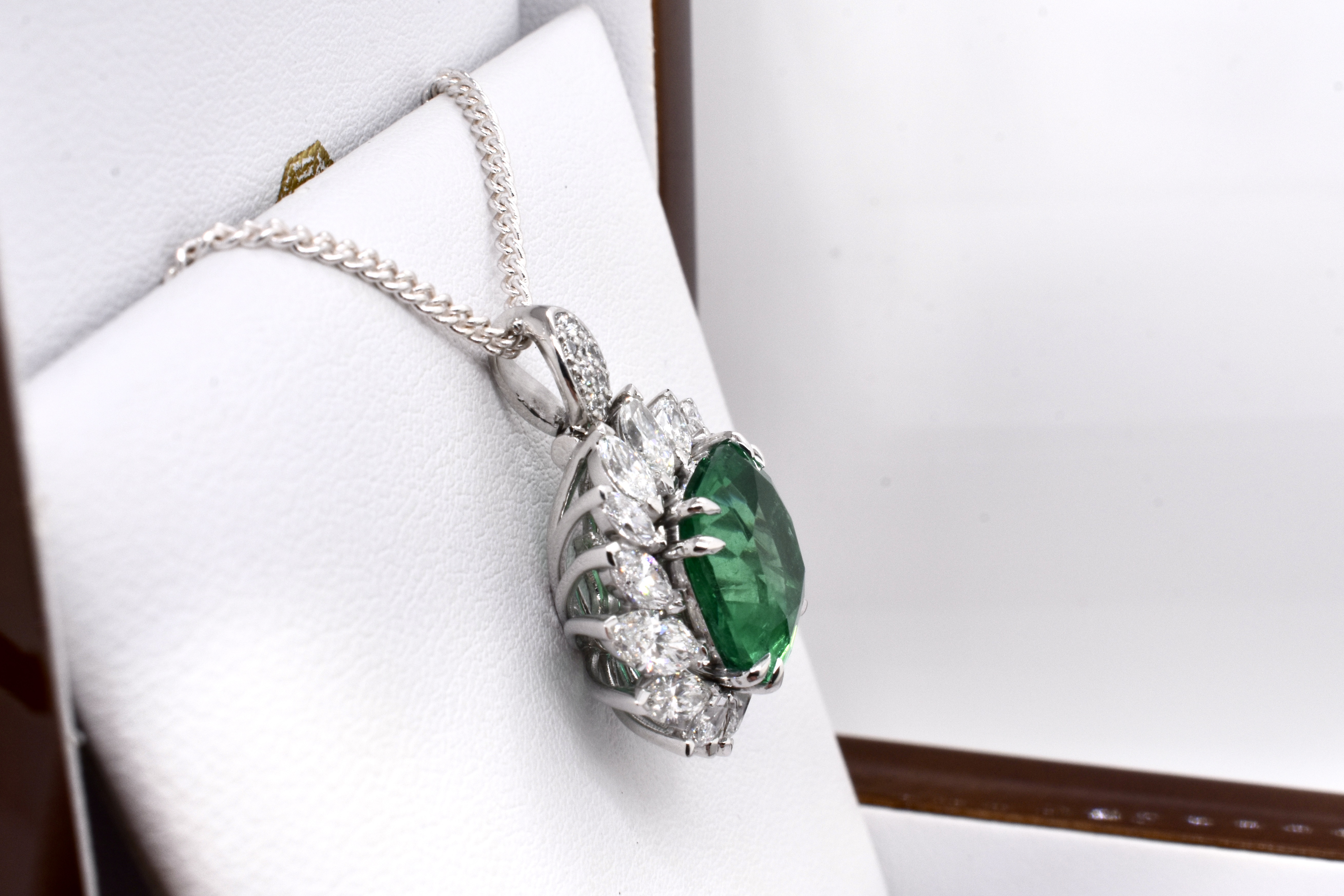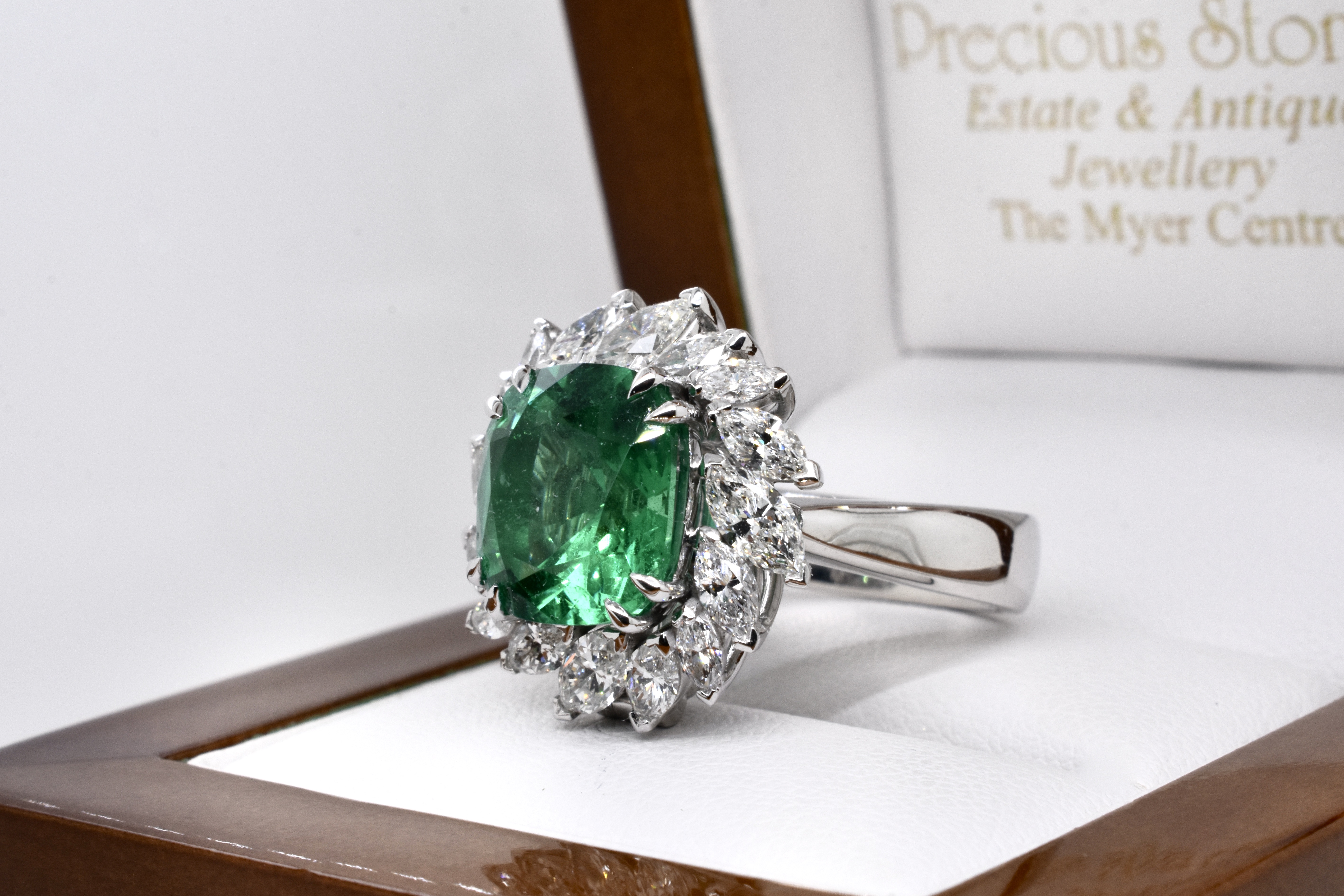 A one of a kind, extraordinary piece of wearable art featuring an ultra rare centre stone and swathe of diamonds which make the piece look like a blooming flower in motion. On first glance it may look solely like a ring, however has been cleverly and expertly designed and engineered to convert into an enhancer as well via the band which can be removed. This piece is handmade in 18ct white gold and features an exquisite centre 5.37ct cushion cut Zambian origin emerald, held in place by sets of elegant fine double talon claws with a starburst style surround of white, sparkling mixed shape marquise and round brilliant cut diamonds totalling 4.59ct D-F/VS