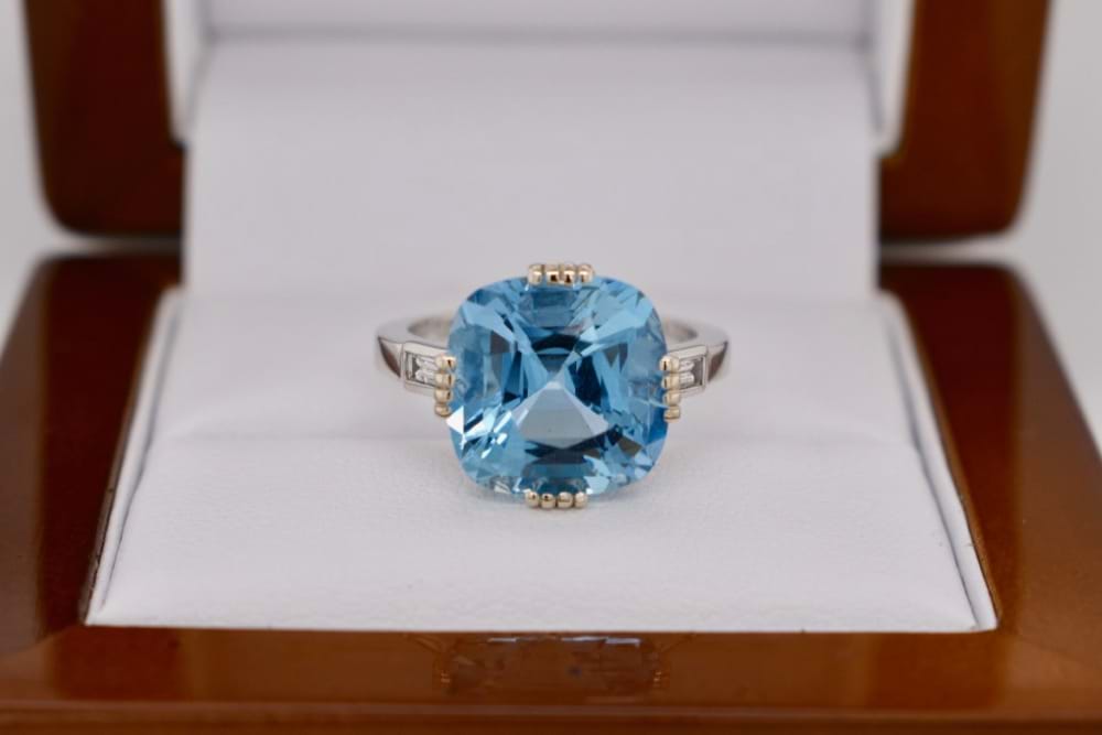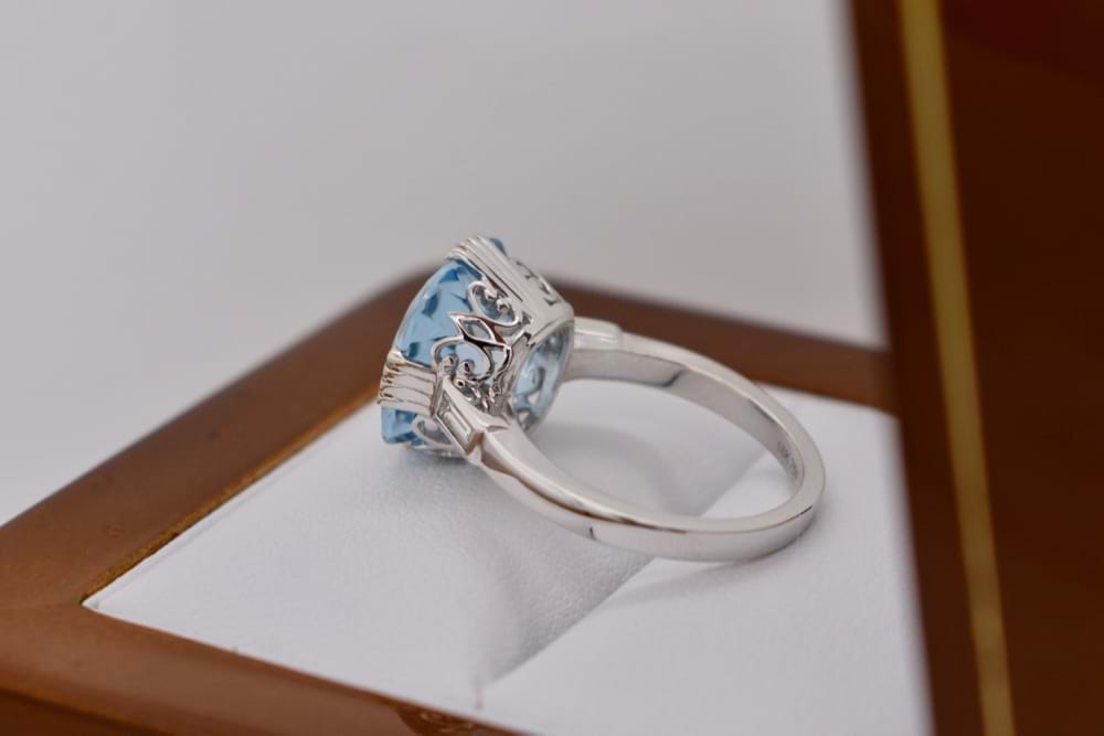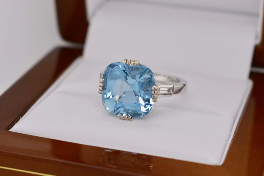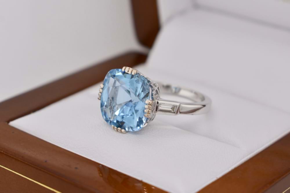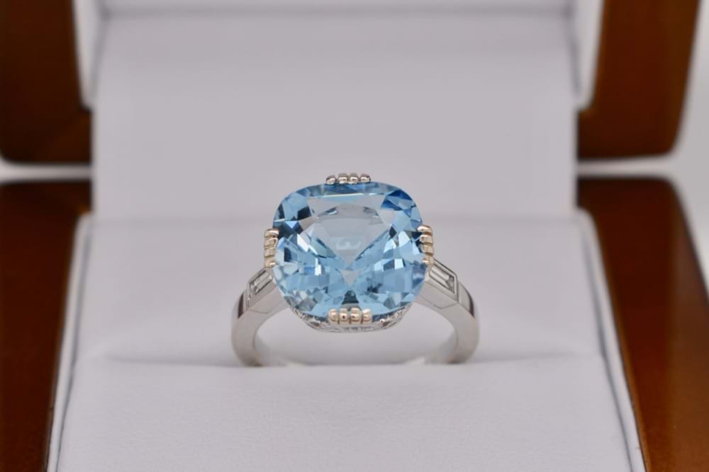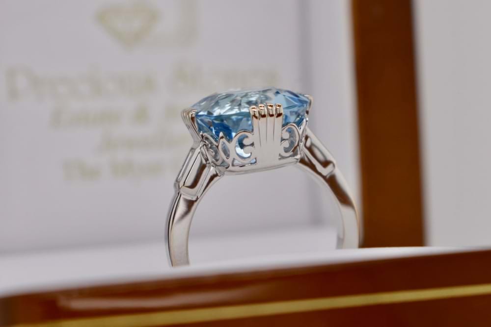 This spectacular 5.45ct aquamarine was hand selected in store by its current owner to be the focus of this vintage inspired cocktail ring. Crafted in 18ct white gold with a stunning wire gallery and a single baguette diamond bezel set into each shoulder totaling 0.20cts (GVS). Independent Valuation Supplied