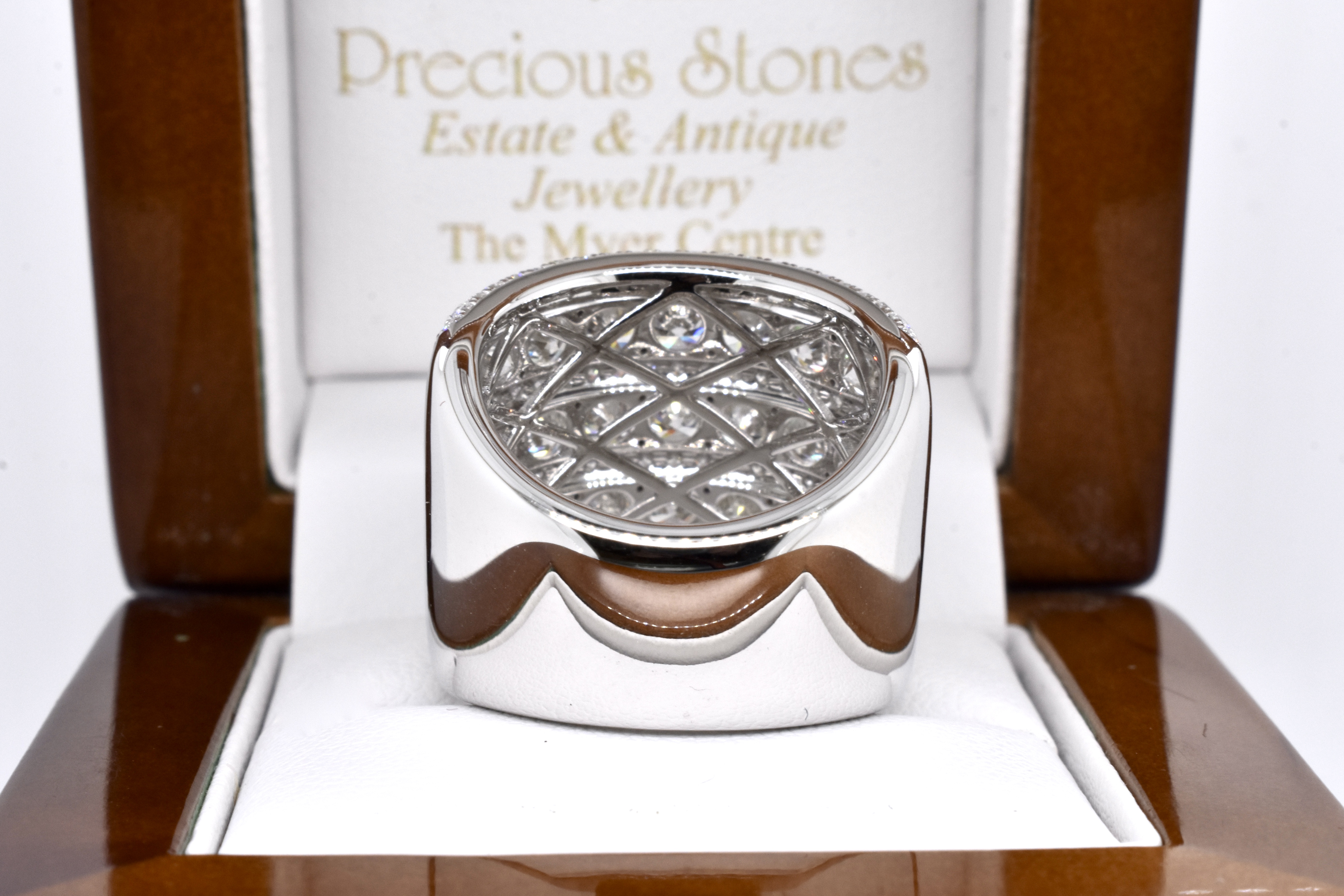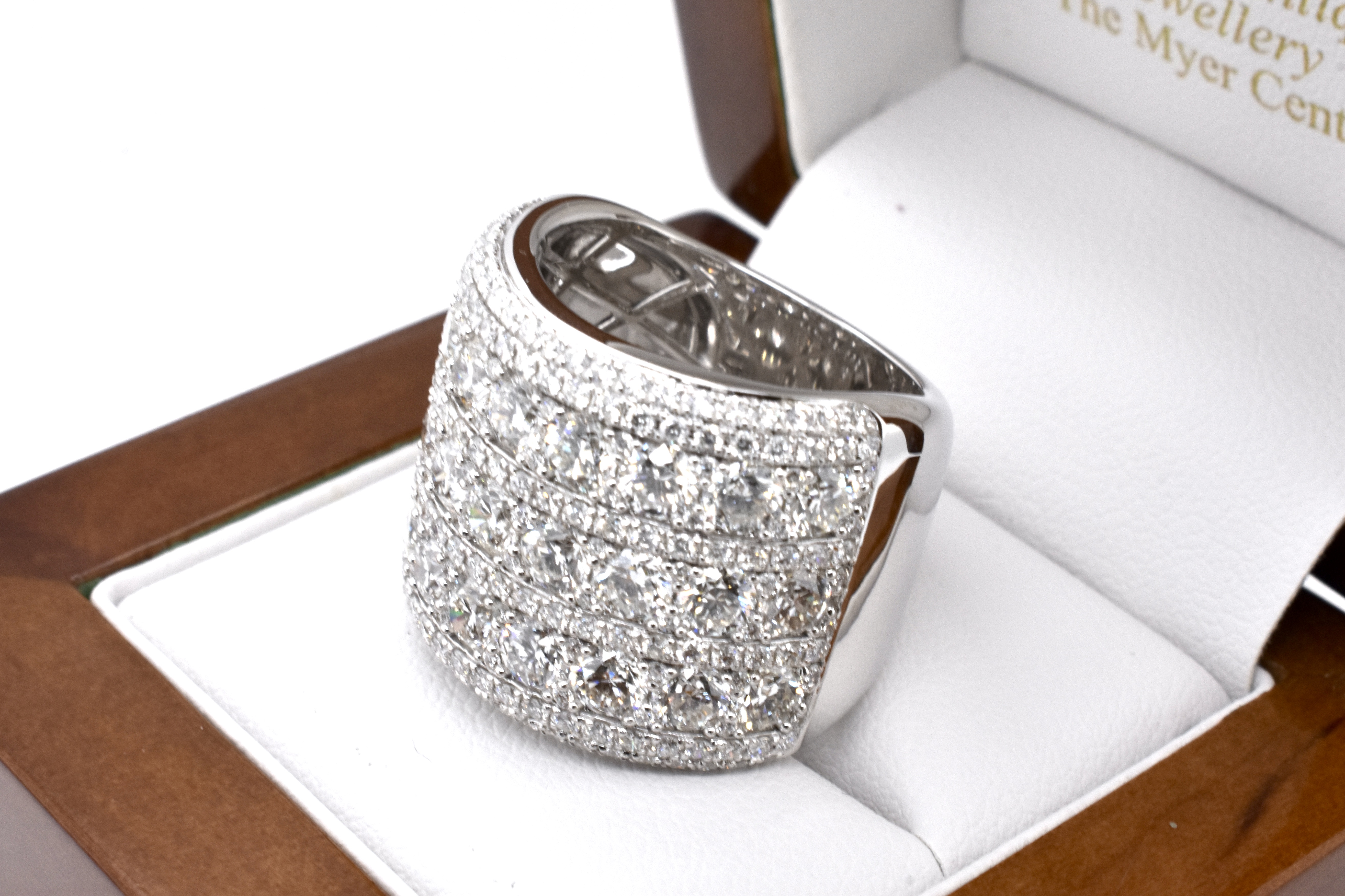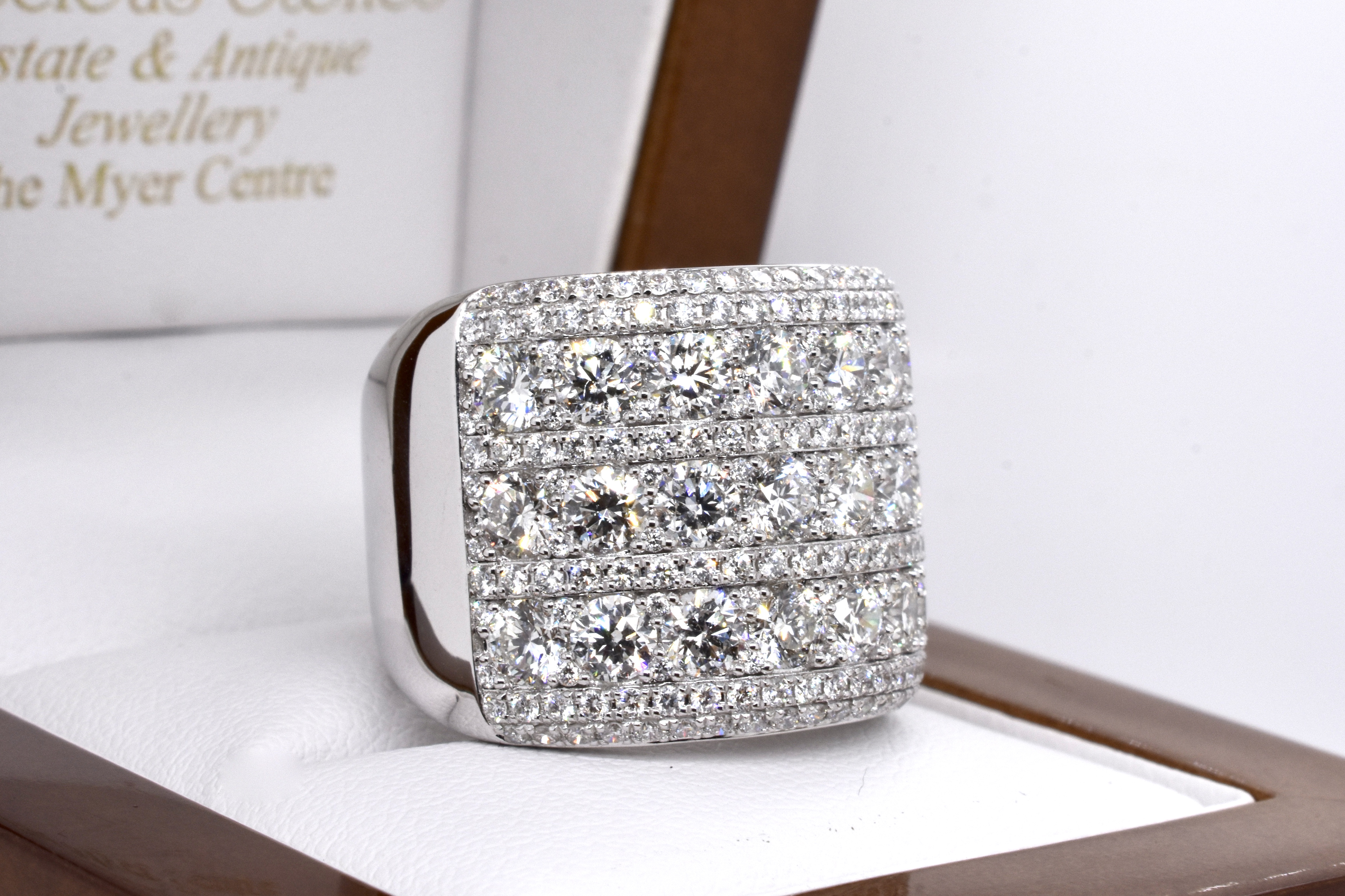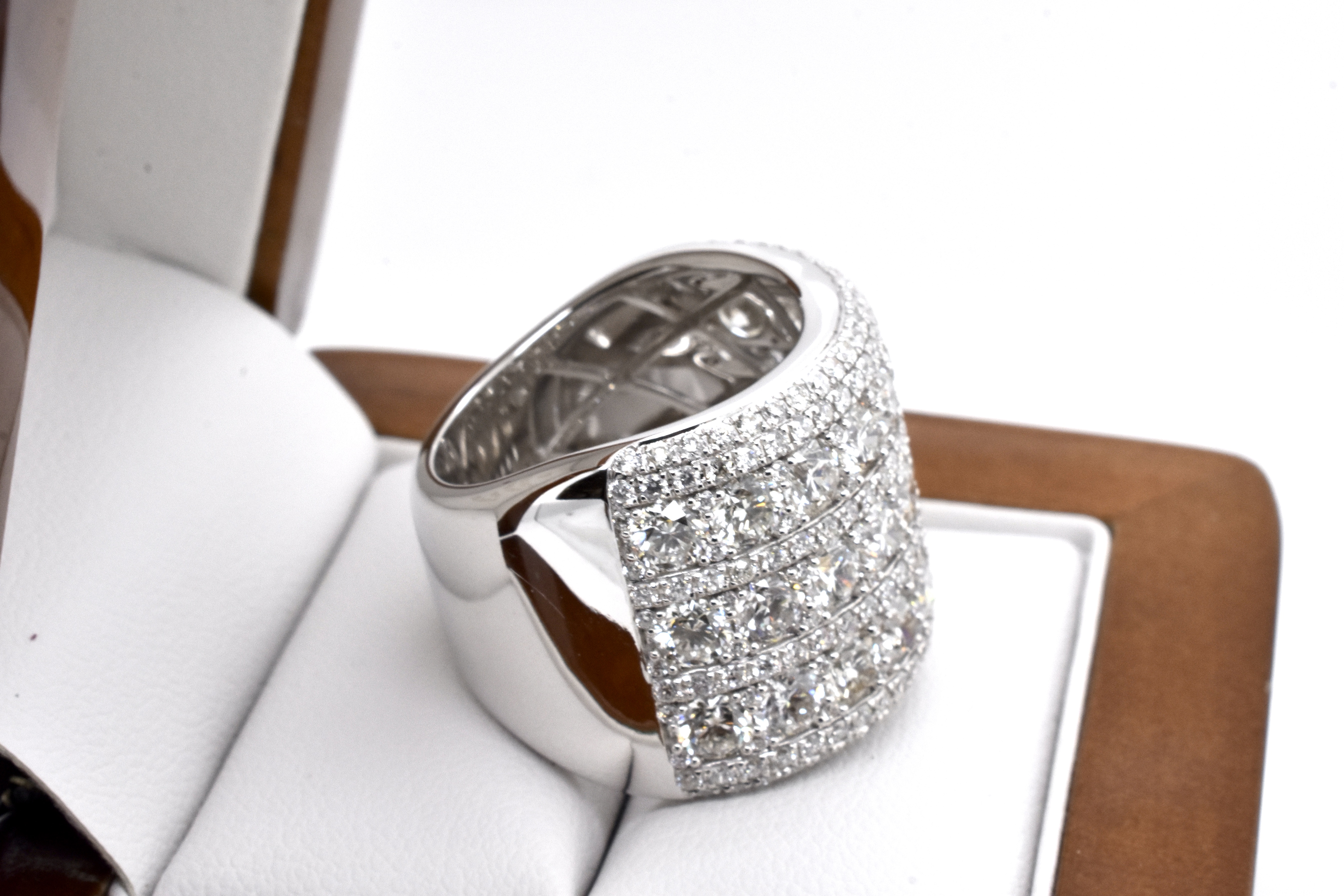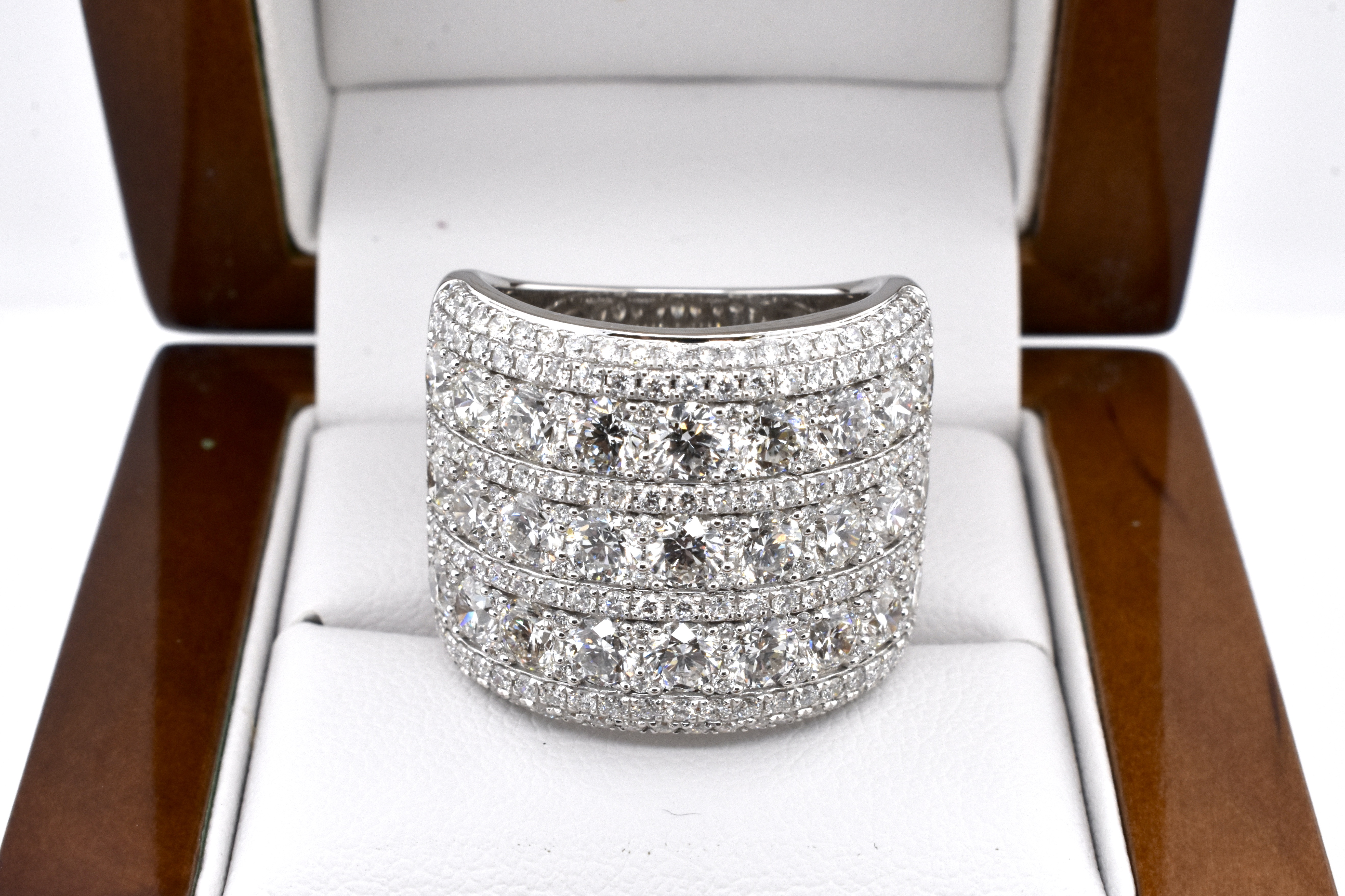 This absolutely magnificent and dazzling ring captures the light from every angle, crafted in 18ct white gold and set with a grand total of 223 gleaming white RBC diamonds equalling 6.28ct FG/VS-SI in three larger rows, with smaller rows in between and an outer accent of two small diamond rows, with pretty latticework to the underside and a tapered band. Independent Valuation Supplied