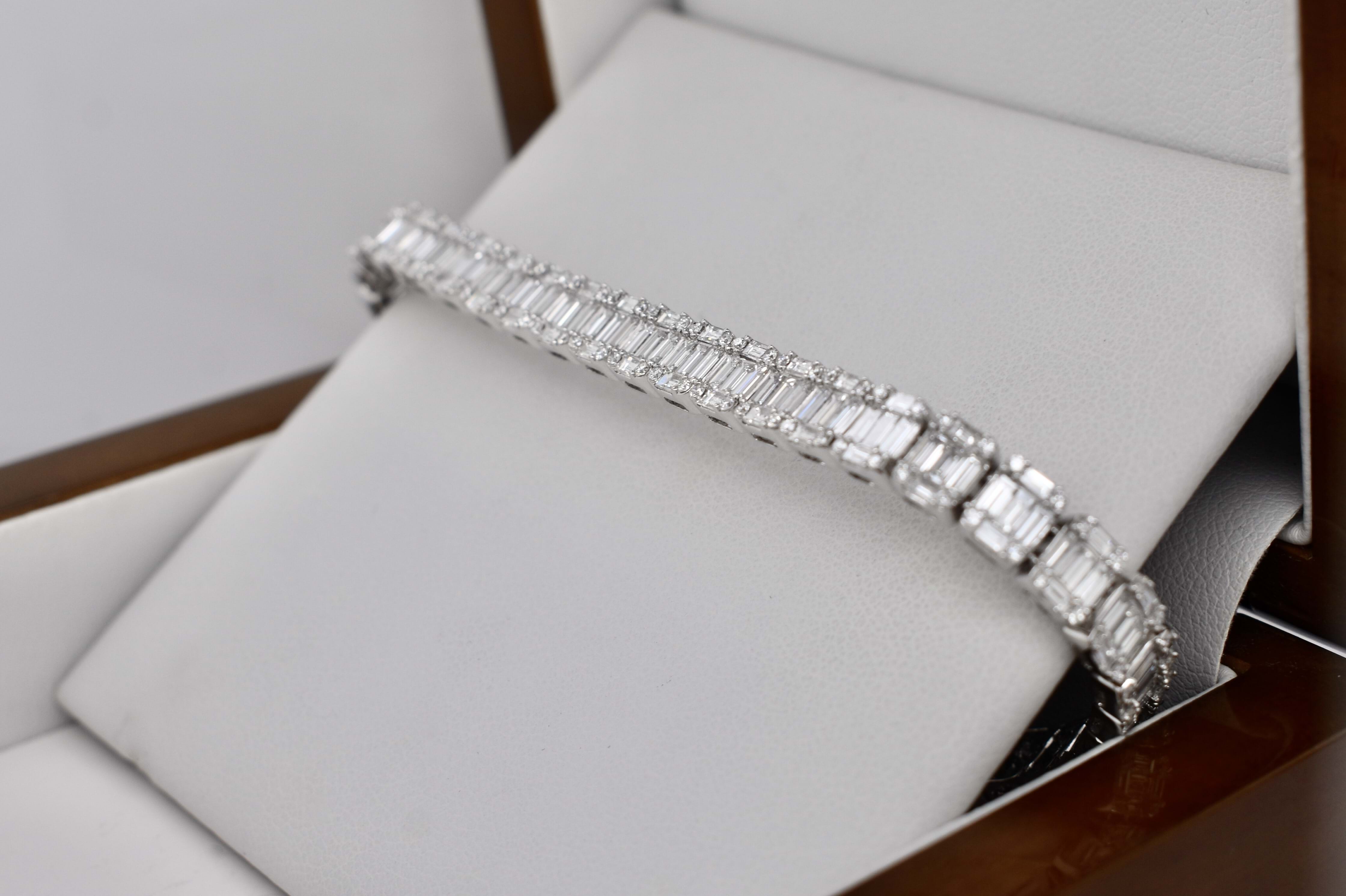 Scintillating and sparkling diamond bracelet sourced to match our clients necklace crafted in 18ct white gold and featuring an incredible 175 baguette cut diamonds totalling 5.59ct and 140 round brilliant cut diamonds equalling 0.83ct assembled to give the illusion of singular large emerald cut diamonds. Independent Valuation Supplied.