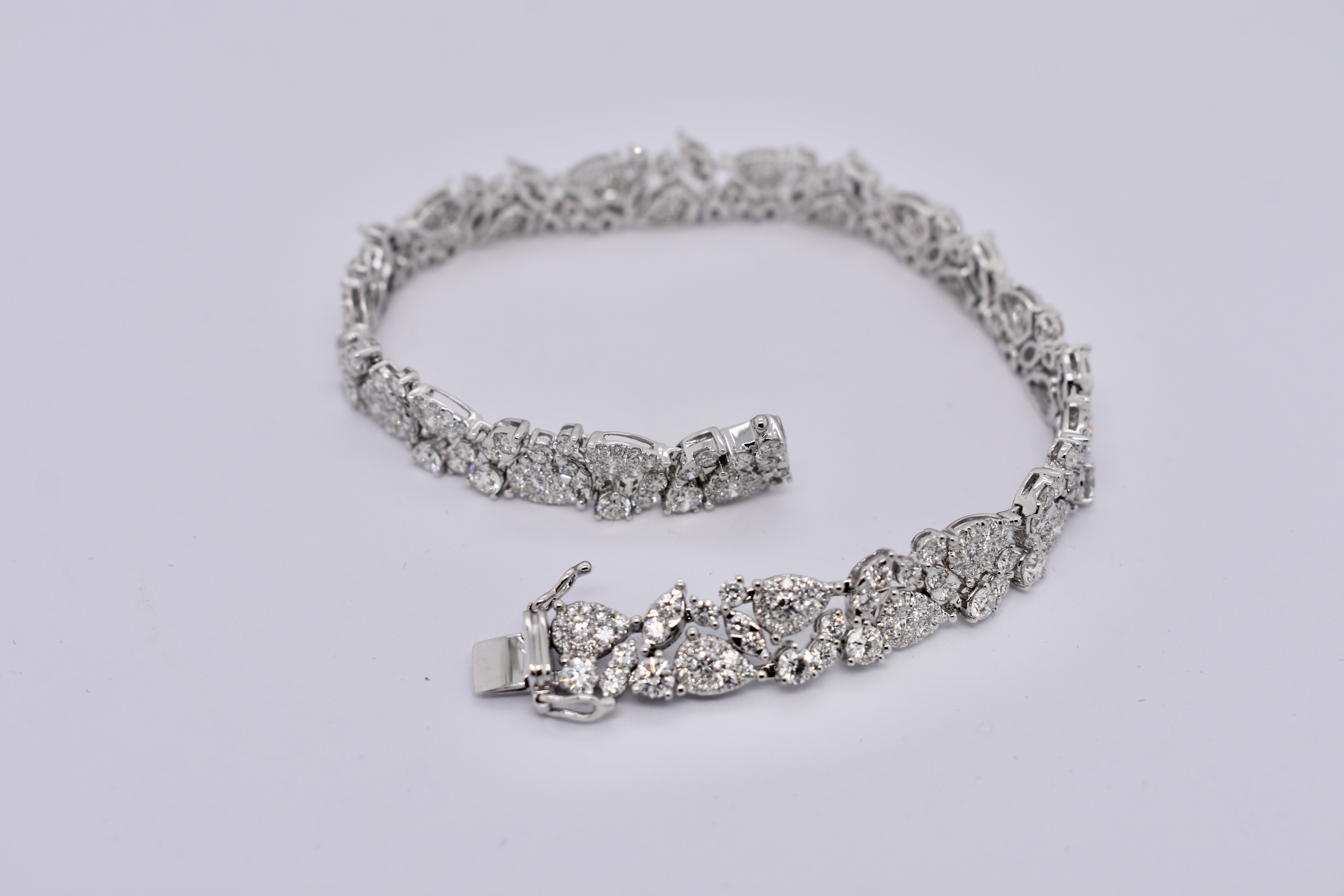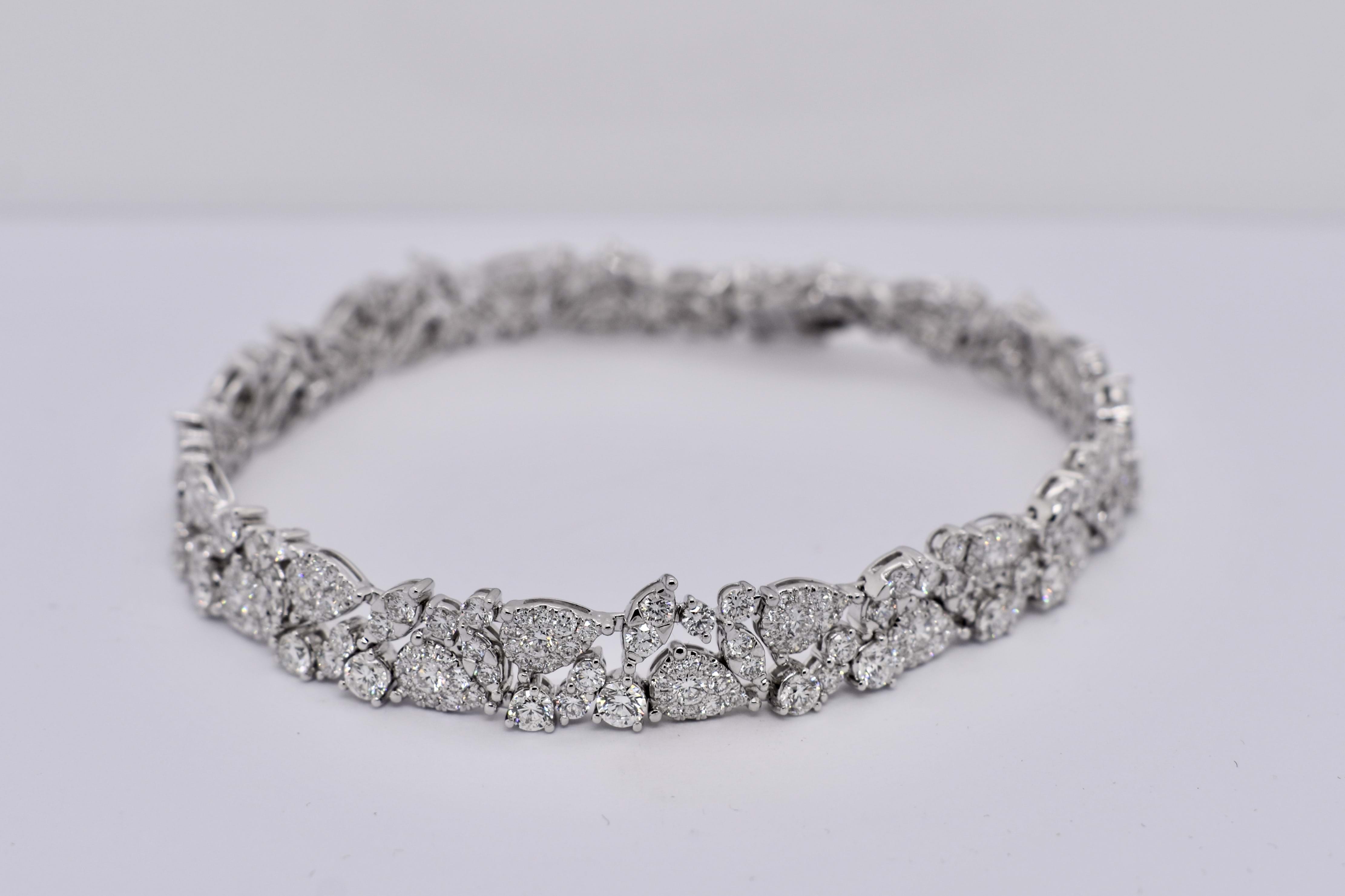 A scintillating and sparkling diamond bracelet expertly crafted in 18ct white gold with an amazing 384 round brilliant cut diamonds arranged in pearshape and marquise shape illusions to give the impression of individual larger stones. The bracelet contains a total of 6.82cts of F colour and VS clarity diamonds. Independent Valuation Supplied.