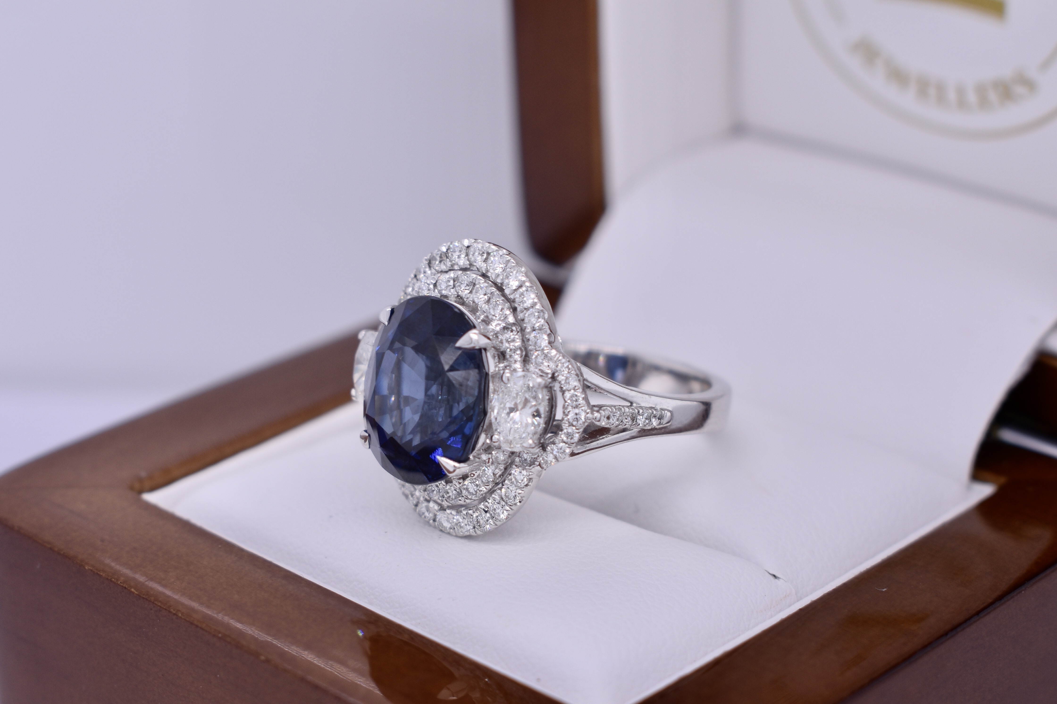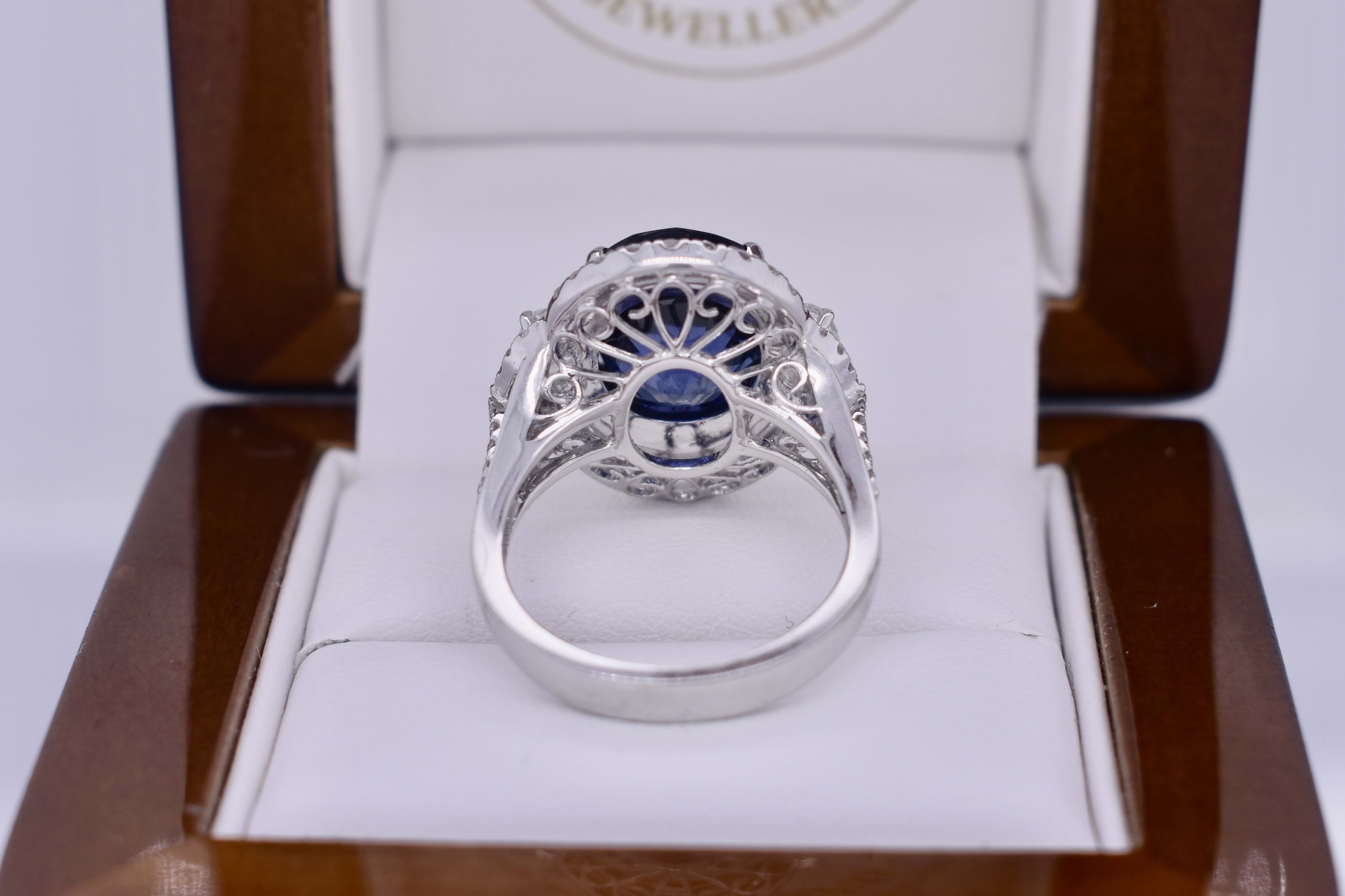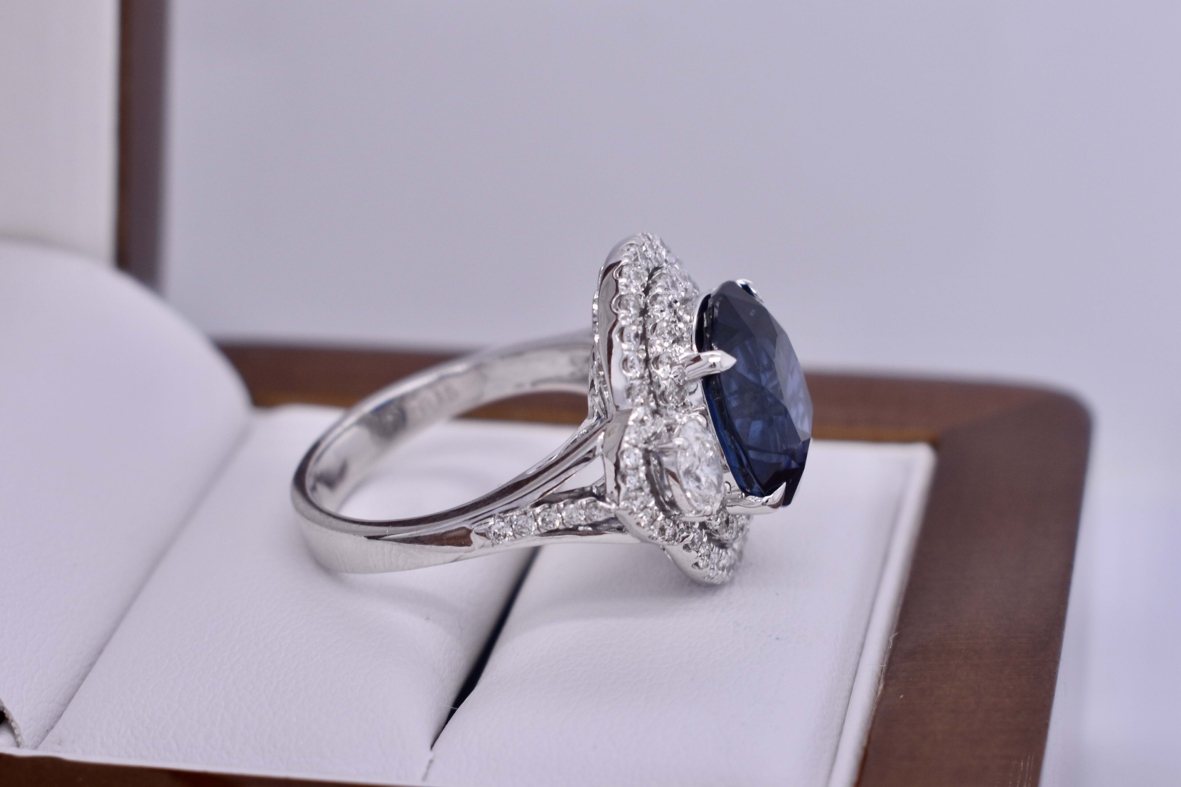 A spectacular, 8.15ct, GRS certified bright deep blue Ceylon sapphire four talon claw set in the centre of this sparkling double halo diamond ring with accent marquise diamonds set on each side and split diamond shoulders. The ring has been crafted in 18ct white gold and contains a total of 1.10ct of high white, eye clean diamonds. Independent Valuation & GRS Certificate Supplied.