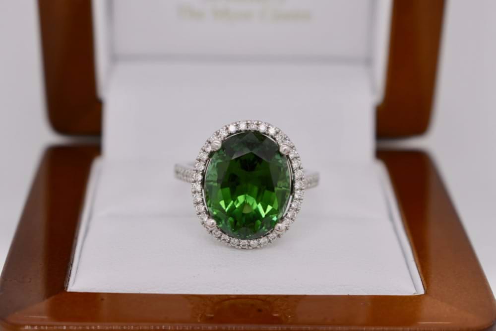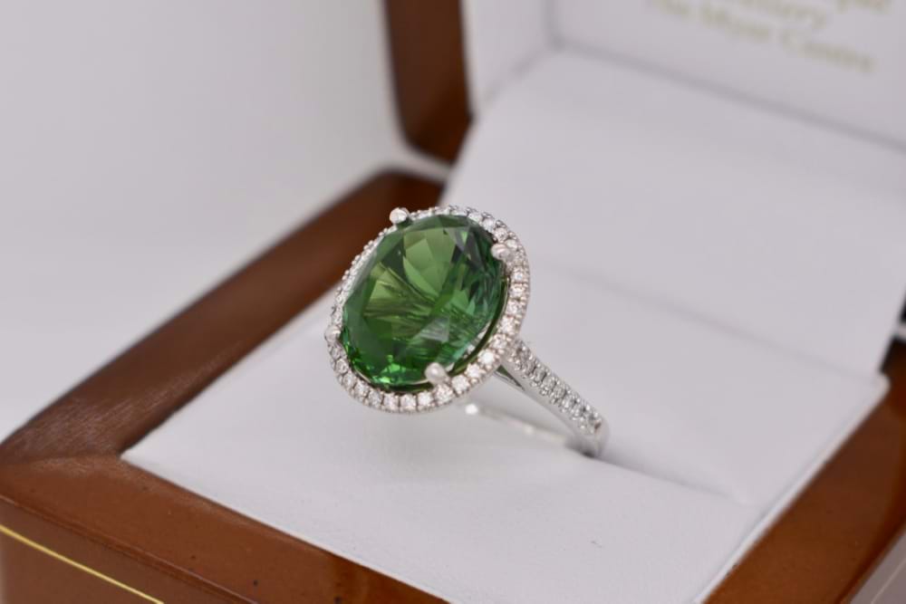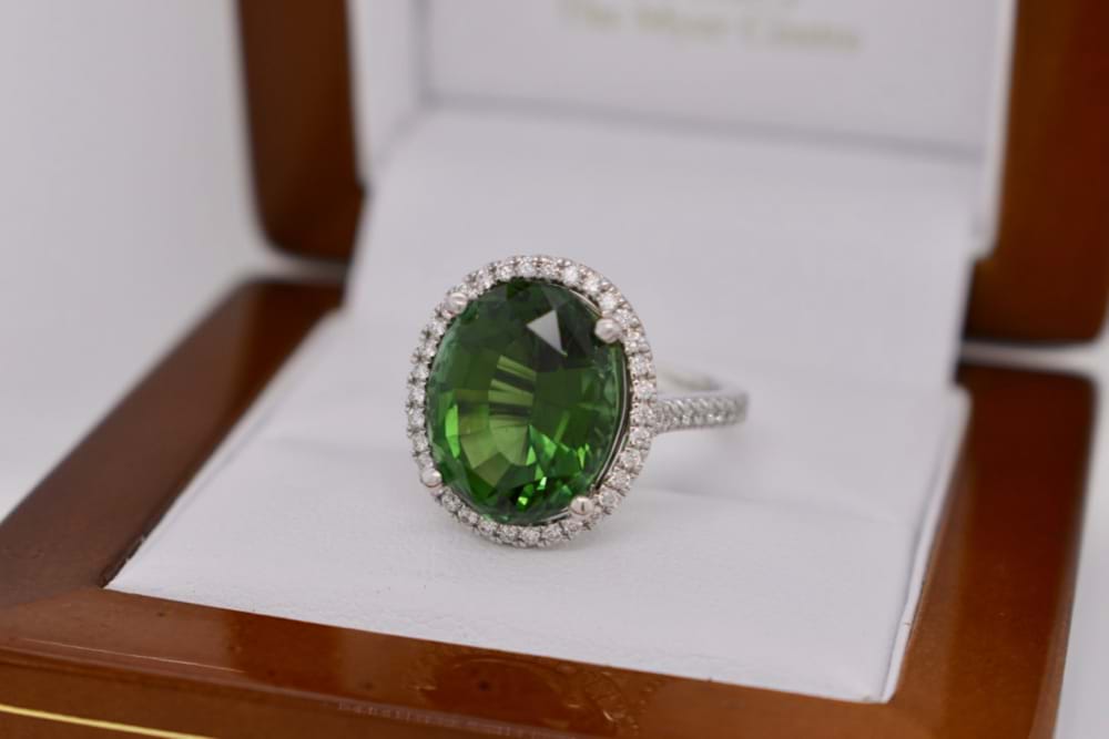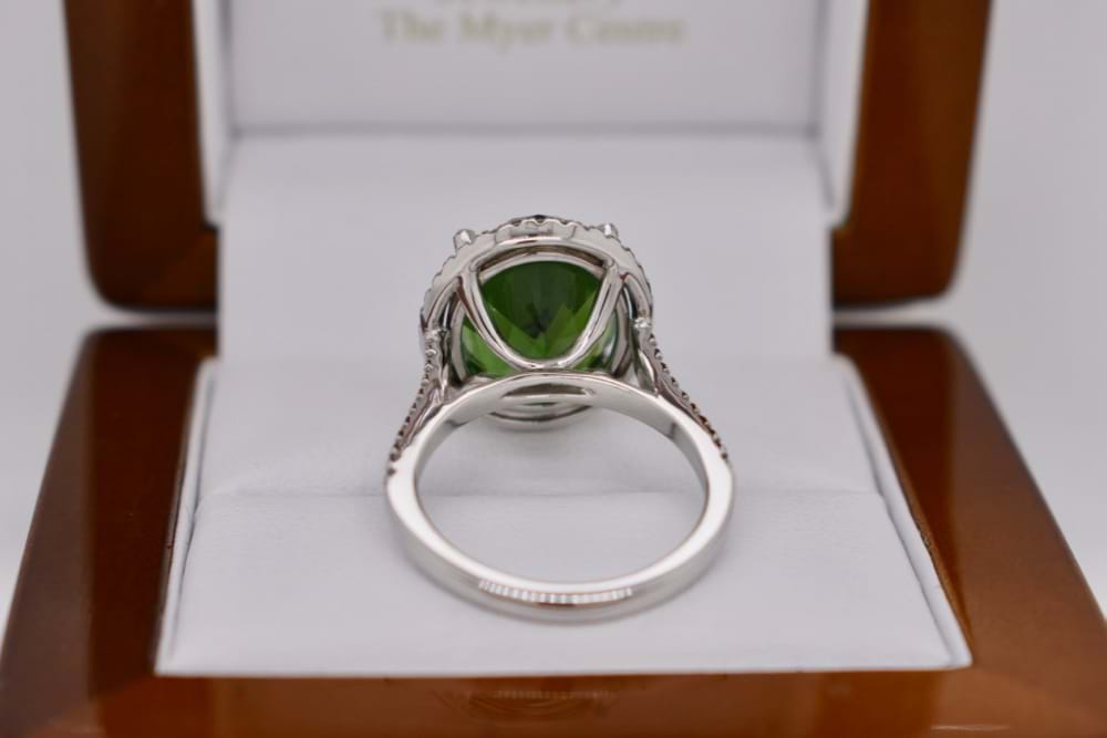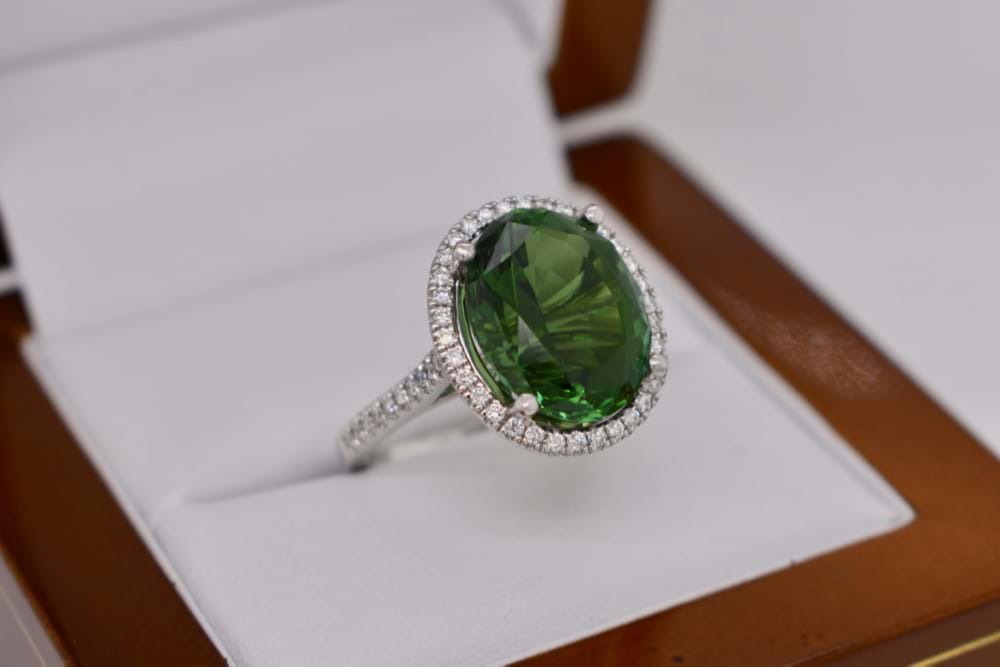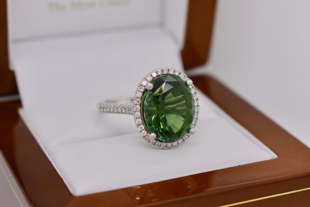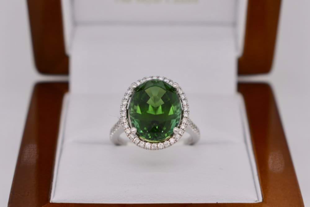 This spectacular dress ring was the perfect surprise for this special ladies anniversary! Featuring a totally divine 8.37ct green tourmaline originating from Afghanistan set into a single sparkling surround of round brilliant cut diamonds also set into the shoulders totalling 54=0.36cts (G/VS-SI) in 18ct white gold. Independent Valuation Supplied.