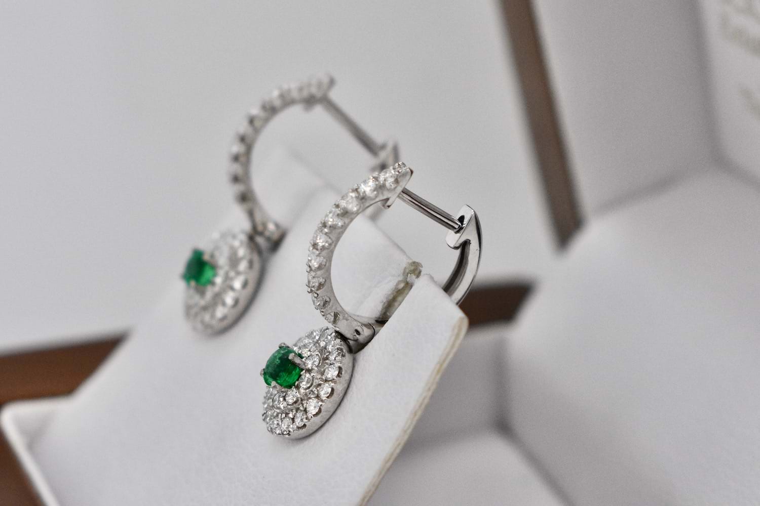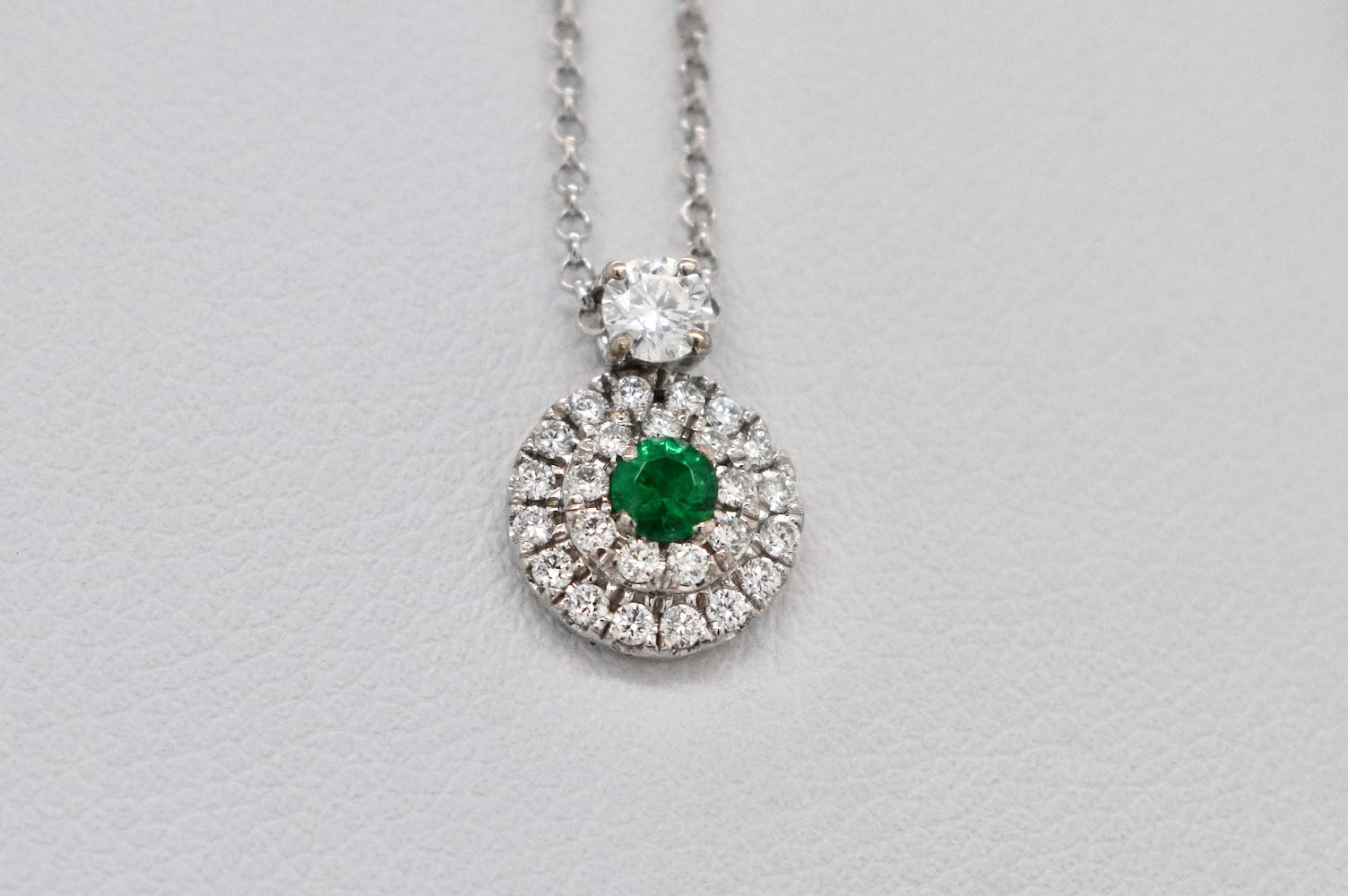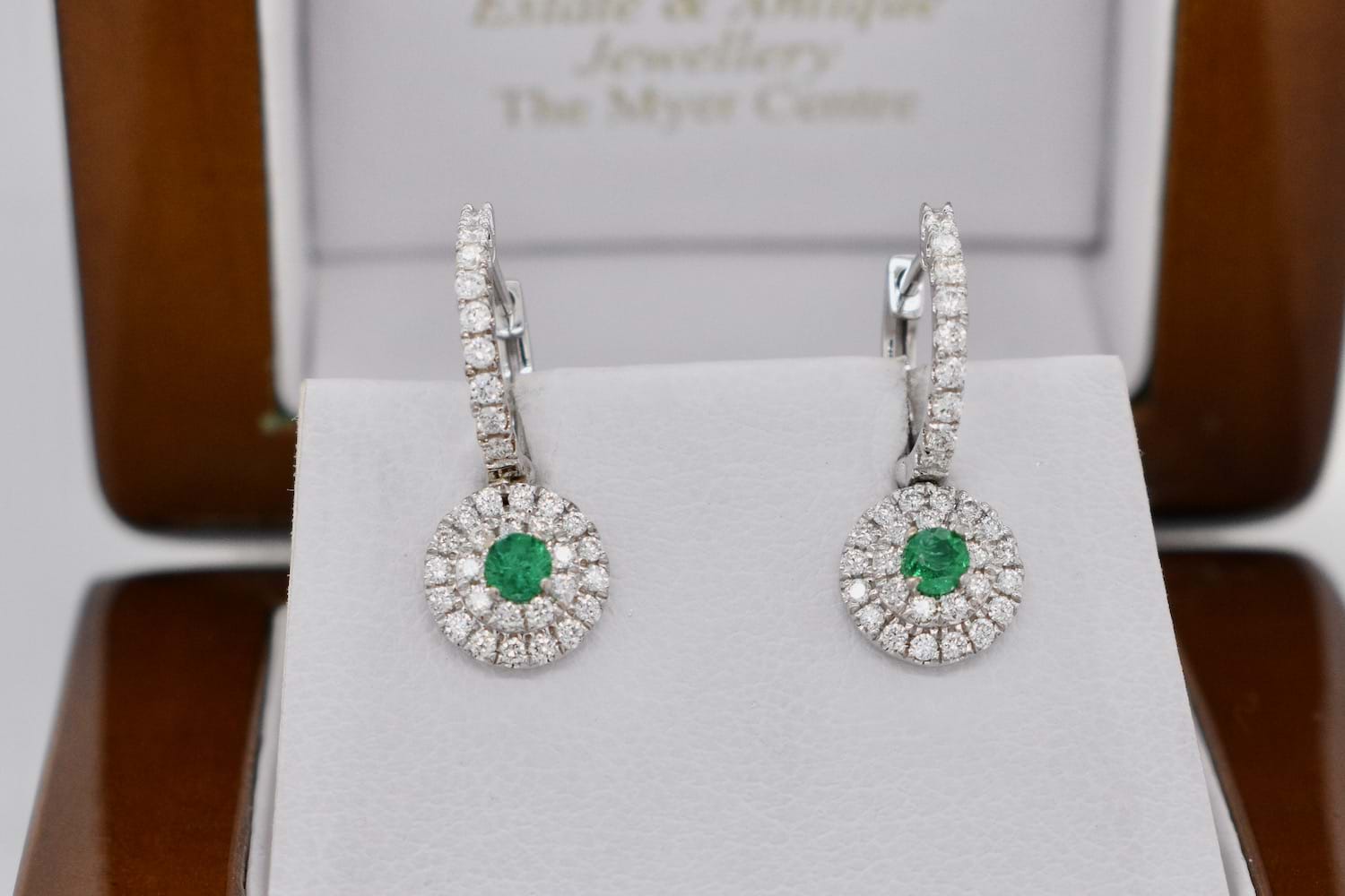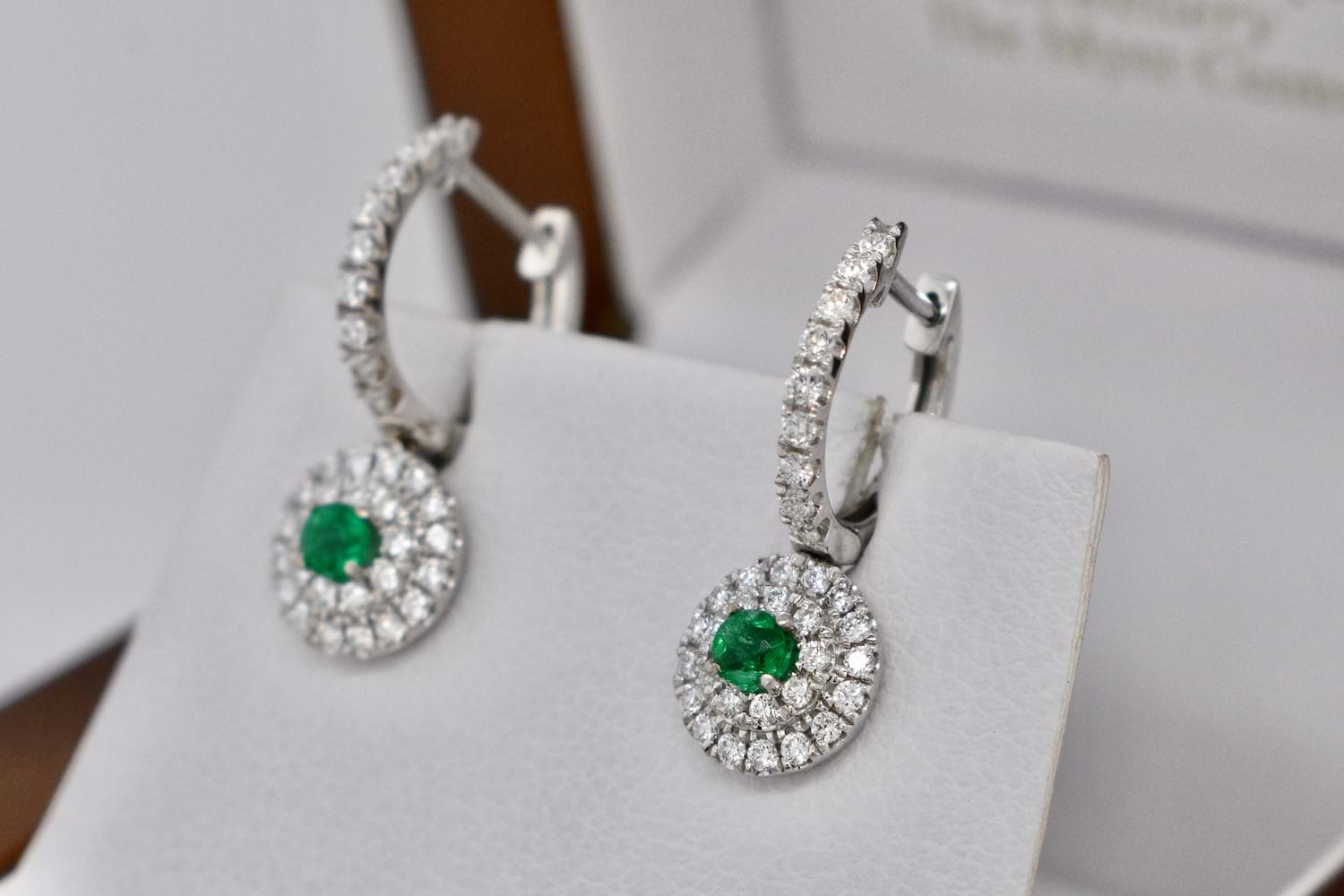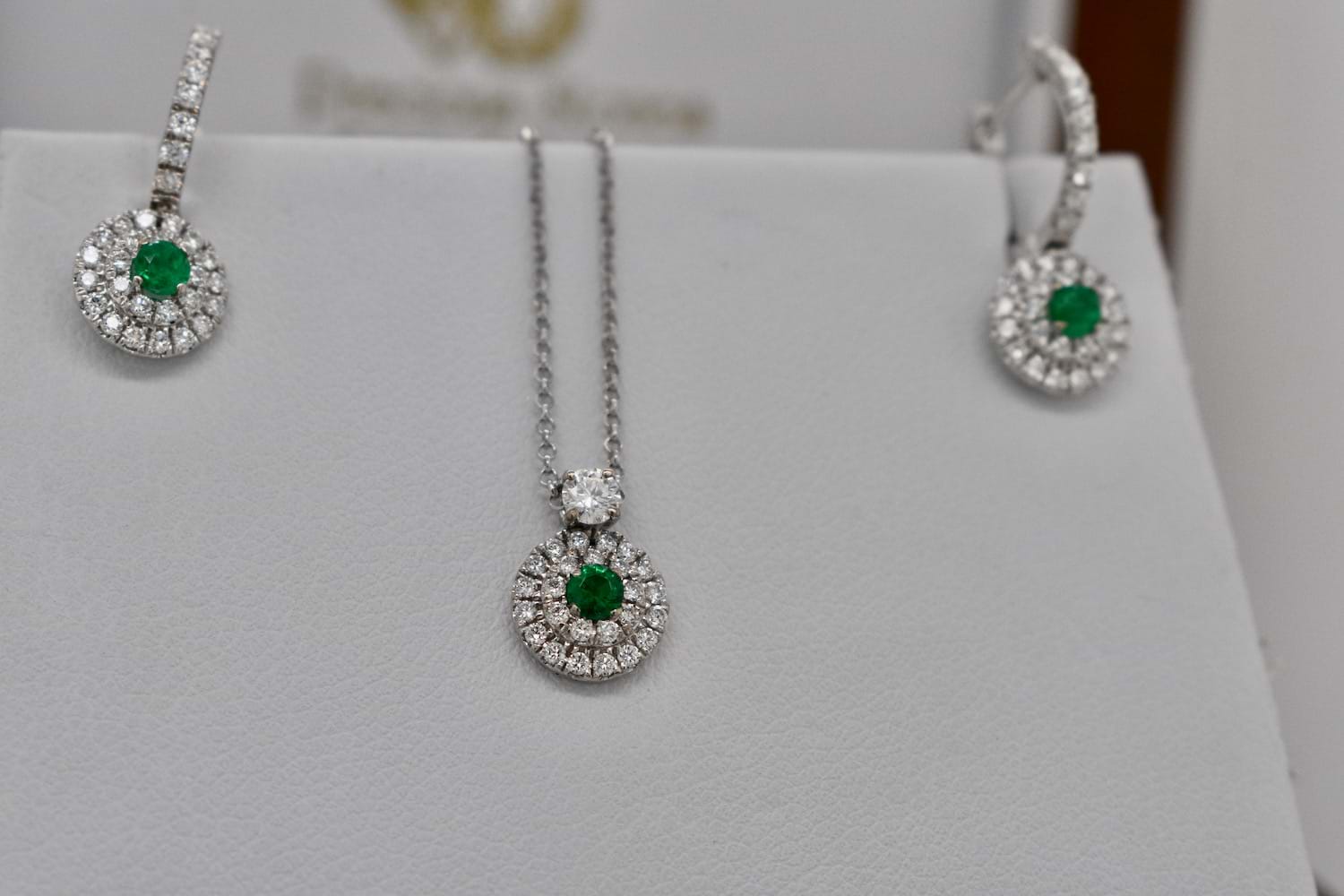 This pretty and feminine set of earrings and necklace were designed around the three bright mid green emeralds. Crafted in 18ct white gold the set contains a total of 0.67cts of shimmering diamonds and three emeralds equal 0.30cts. Independent Valuation Supplied.