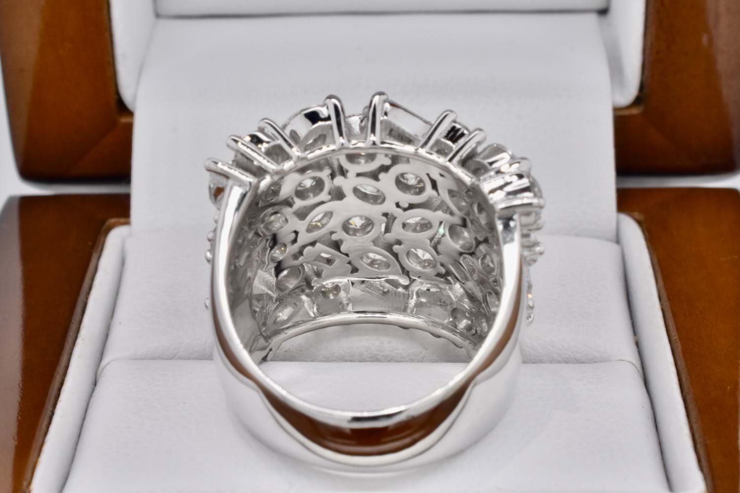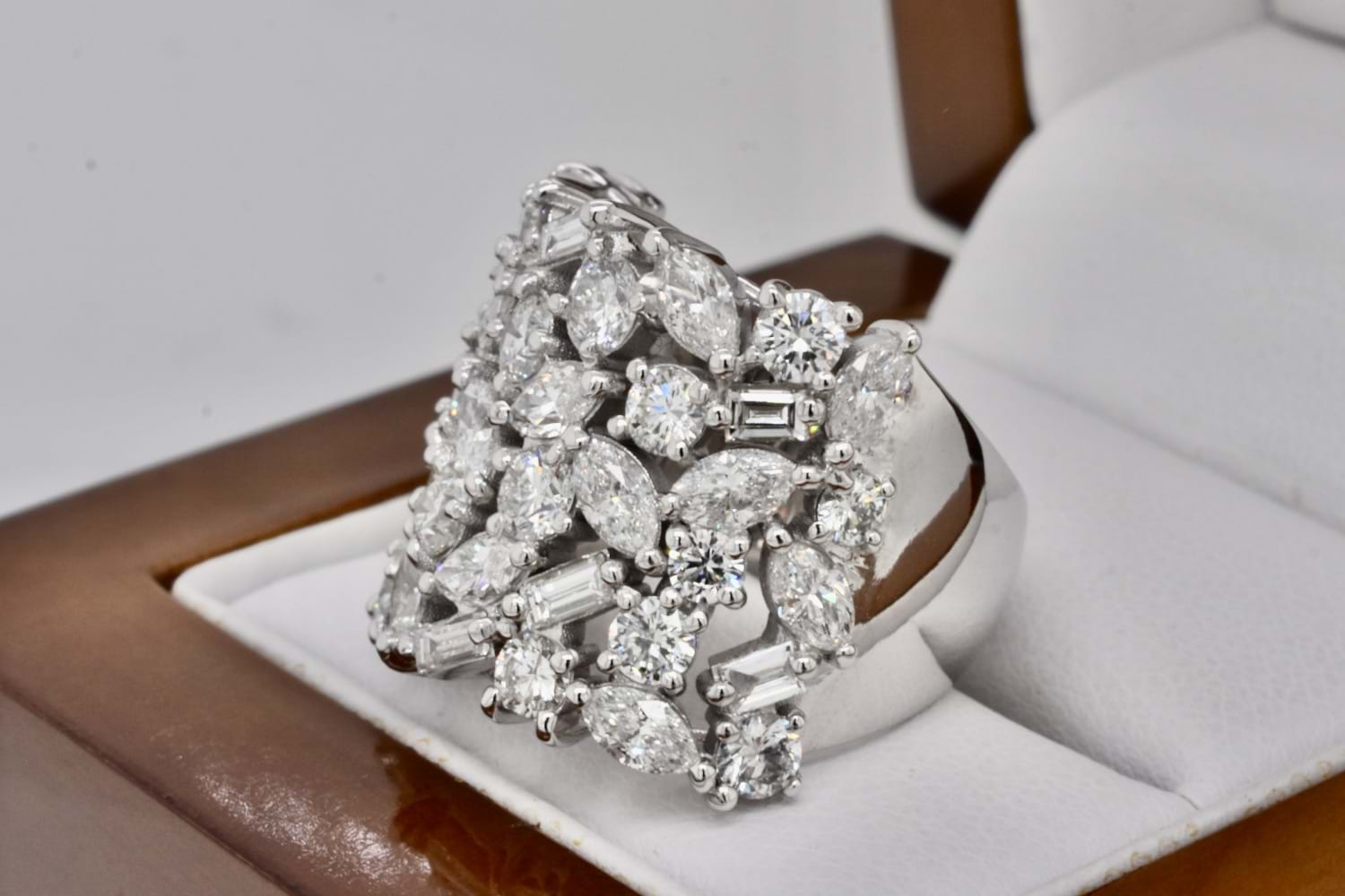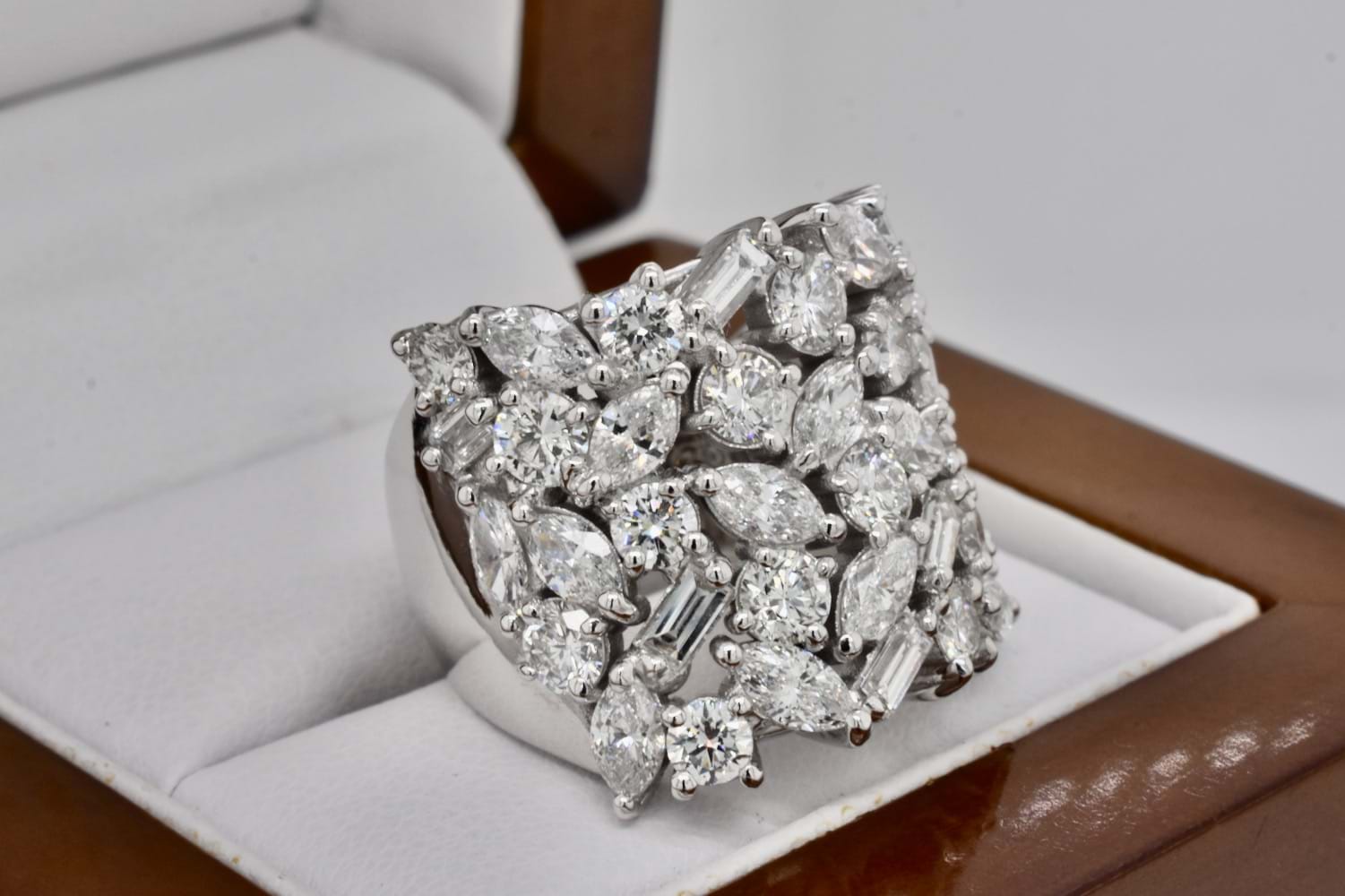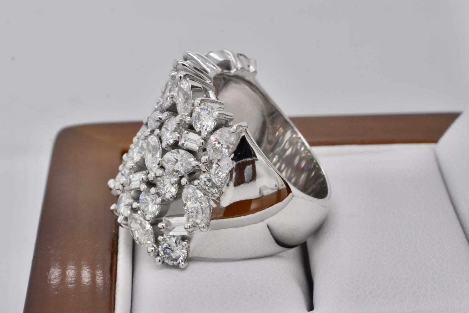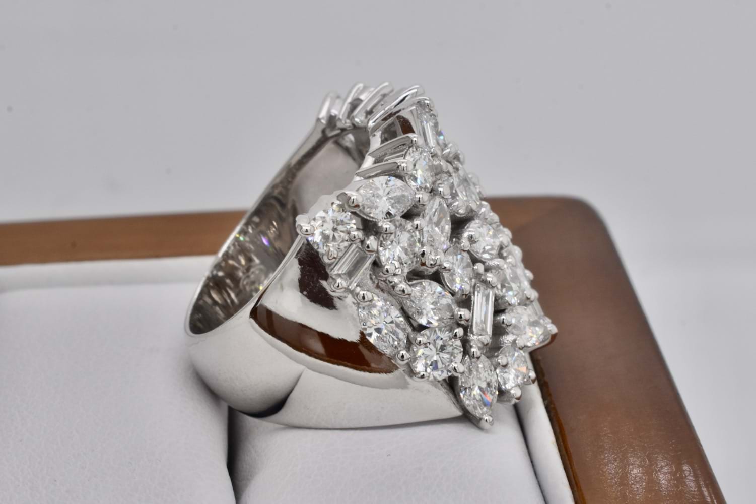Stunning wide asymmetrical diamond dress ring featuring a combination of sparkling round brilliant cut diamonds, shimmering marquise cut diamonds and baguette cut diamonds set into this wide 18ct white gold dress ring.