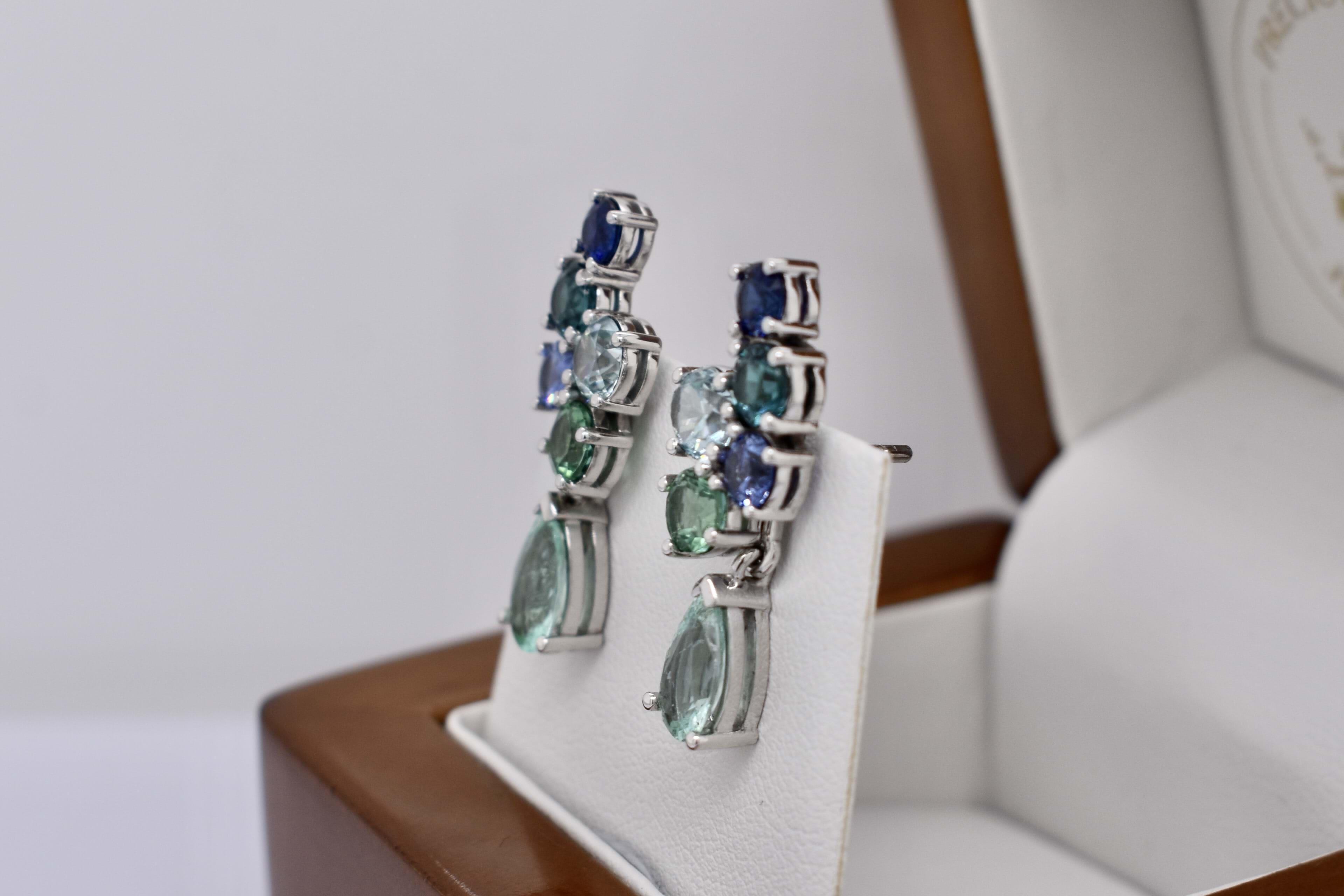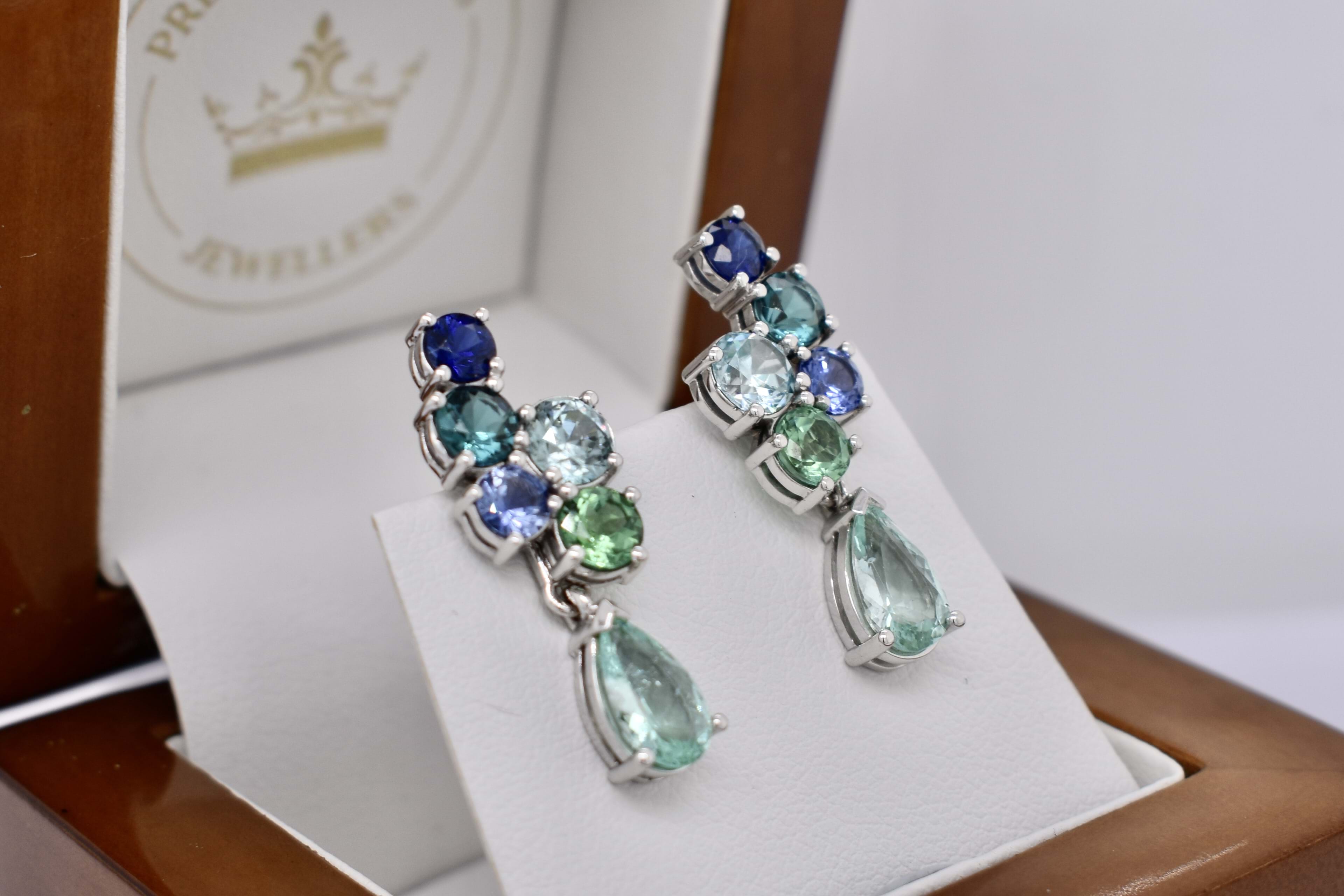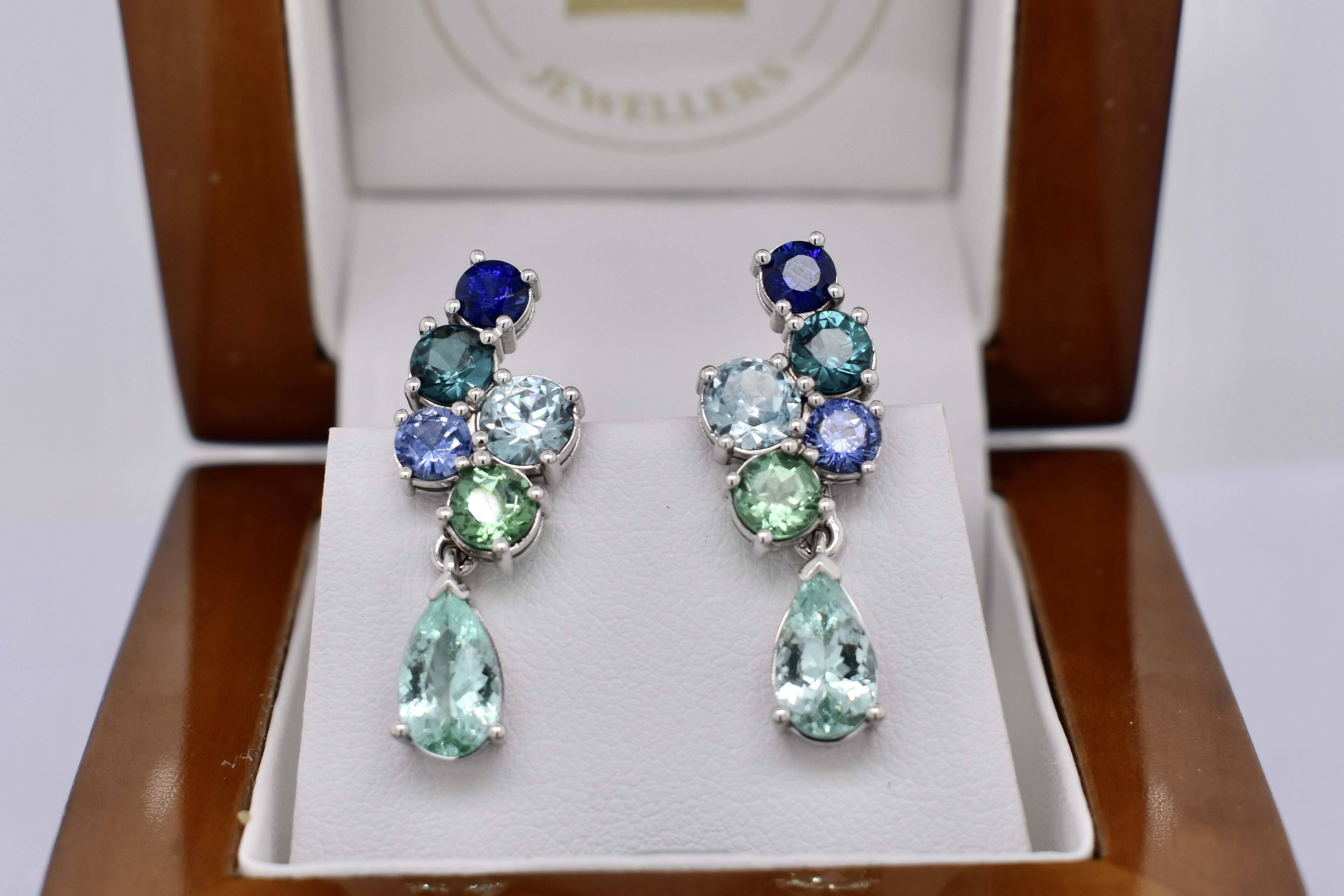 A beautiful gradient of Bora Bora blue and seafoam blue/green colours created with a mixture of different gemstones sourced over three years for this project! The earrings have been crafted in 18ct white gold and are designed in a sweeping cluster to climb up the earlobe of the wearer with a versatile and fun option to add the removable pearshape drops at the base. The earrings are composed of a pair of bright light blue zircons (1.30ct), a pair of dark blue (0.58ct) and a pair of mid blue (0.55ct) sapphires, a pair of blue/green (0.69ct) and a pair of green (0.77ct) tourmalines, with the impressive pinnacle being a matching pair of pearshape Paraiba type tourmalines (1.44ct). Independent Valuation Supplied.