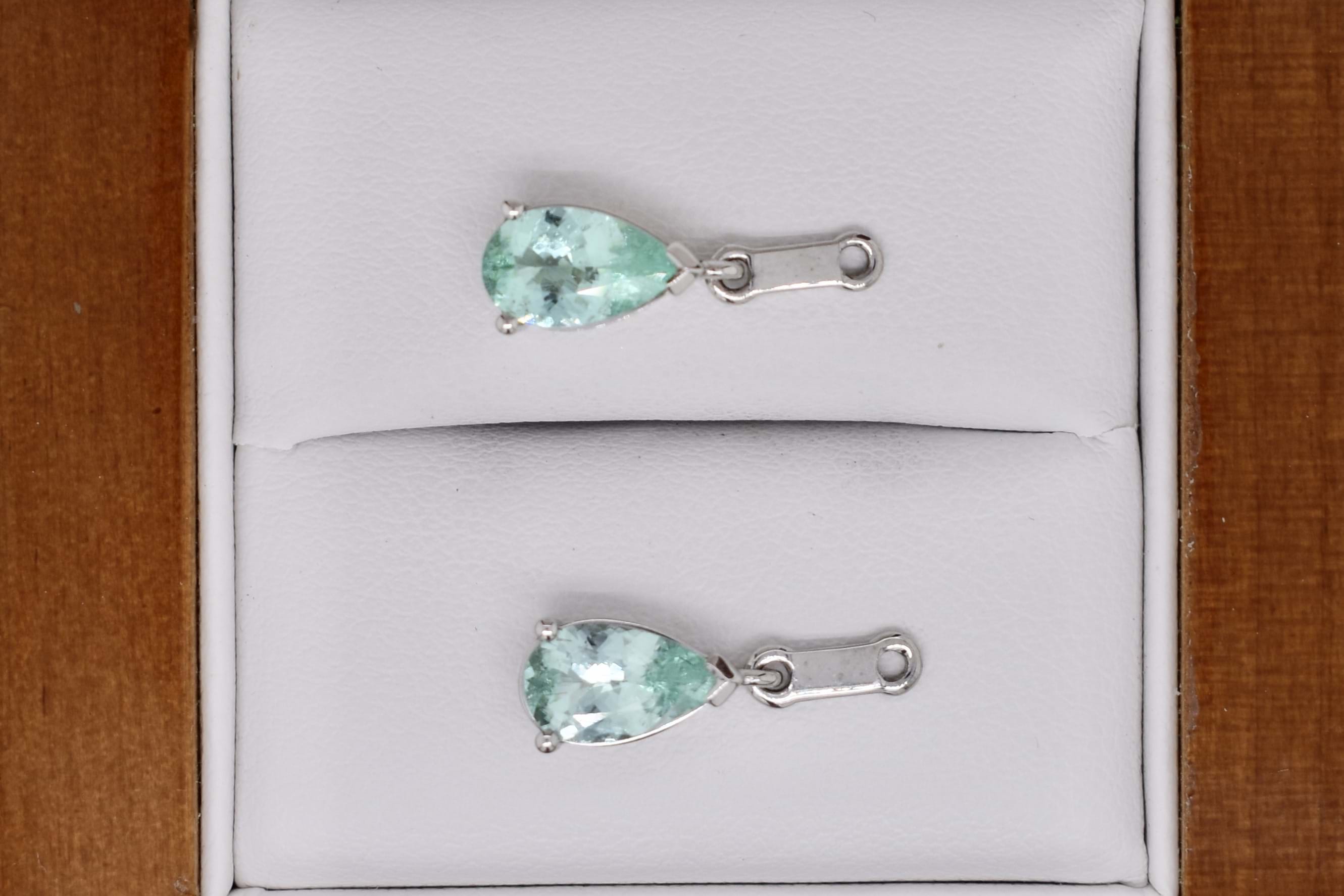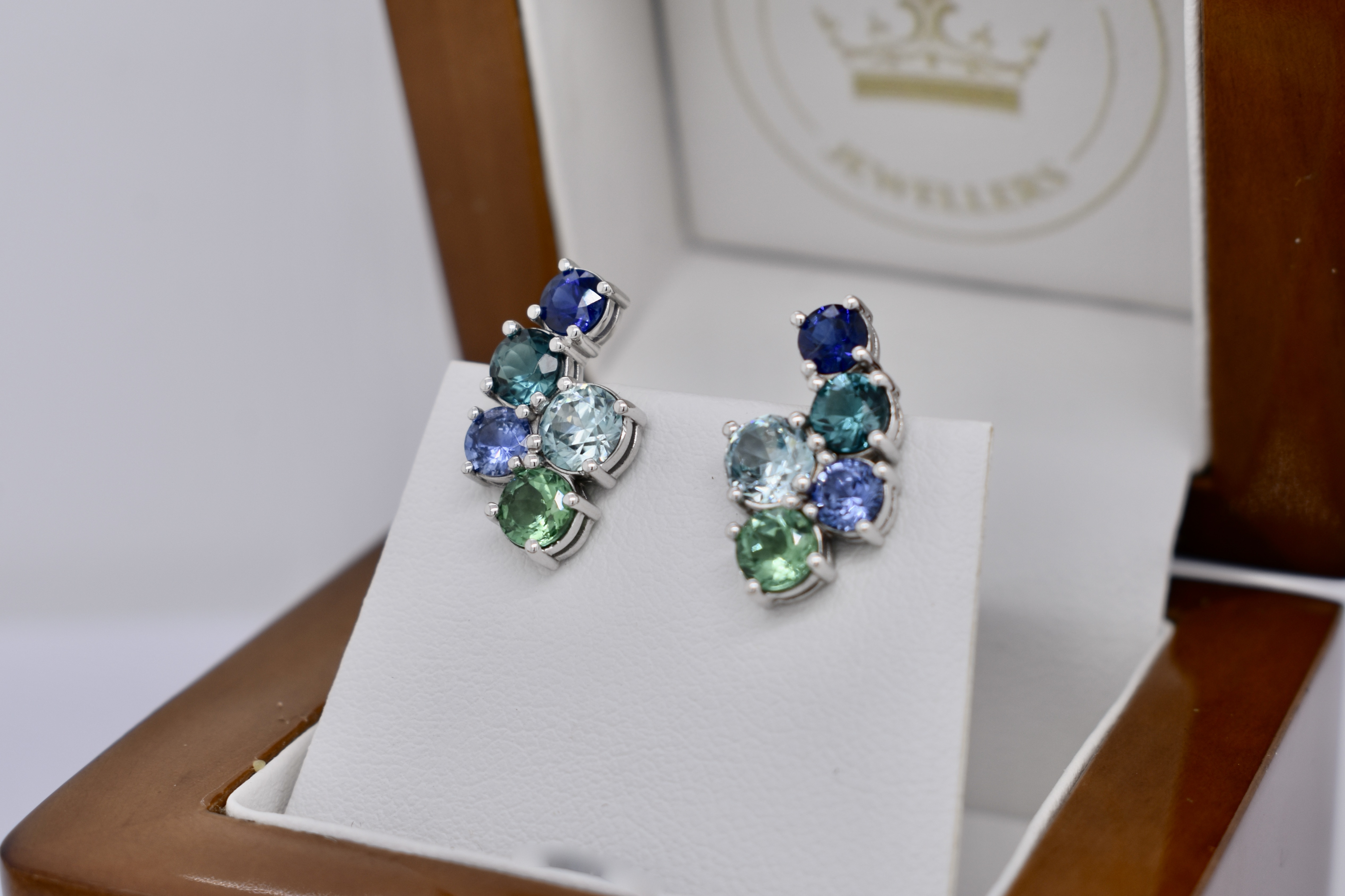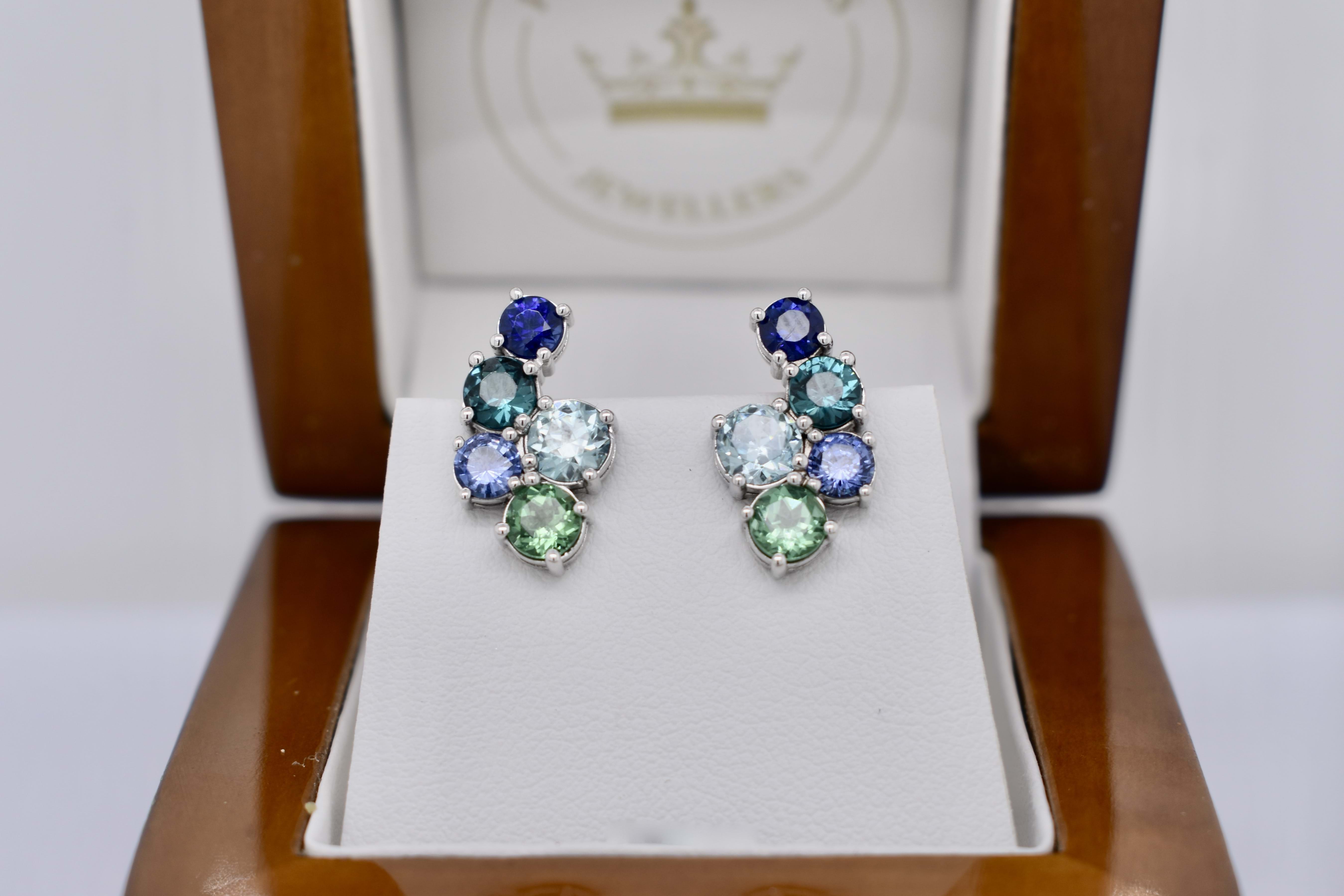 A beautiful gradient of Bora Bora blue and seafoam blue/green colours created with a mixture of different gemstones sourced over three years for this project! The earrings have been crafted in 18ct white gold and are designed in a sweeping cluster to climb up the earlobe of the wearer with a versatile and fun option to add the removable pearshape drops at the base. The earrings are composed of a pair of bright light blue zircons (1.30ct), a pair of dark blue (0.58ct) and a pair of mid blue (0.55ct) sapphires, a pair of blue/green (0.69ct) and a pair of green (0.77ct) tourmalines, with the impressive pinnacle being a matching pair of pearshape Paraiba type tourmalines (1.44ct). Independent Valuation Supplied.