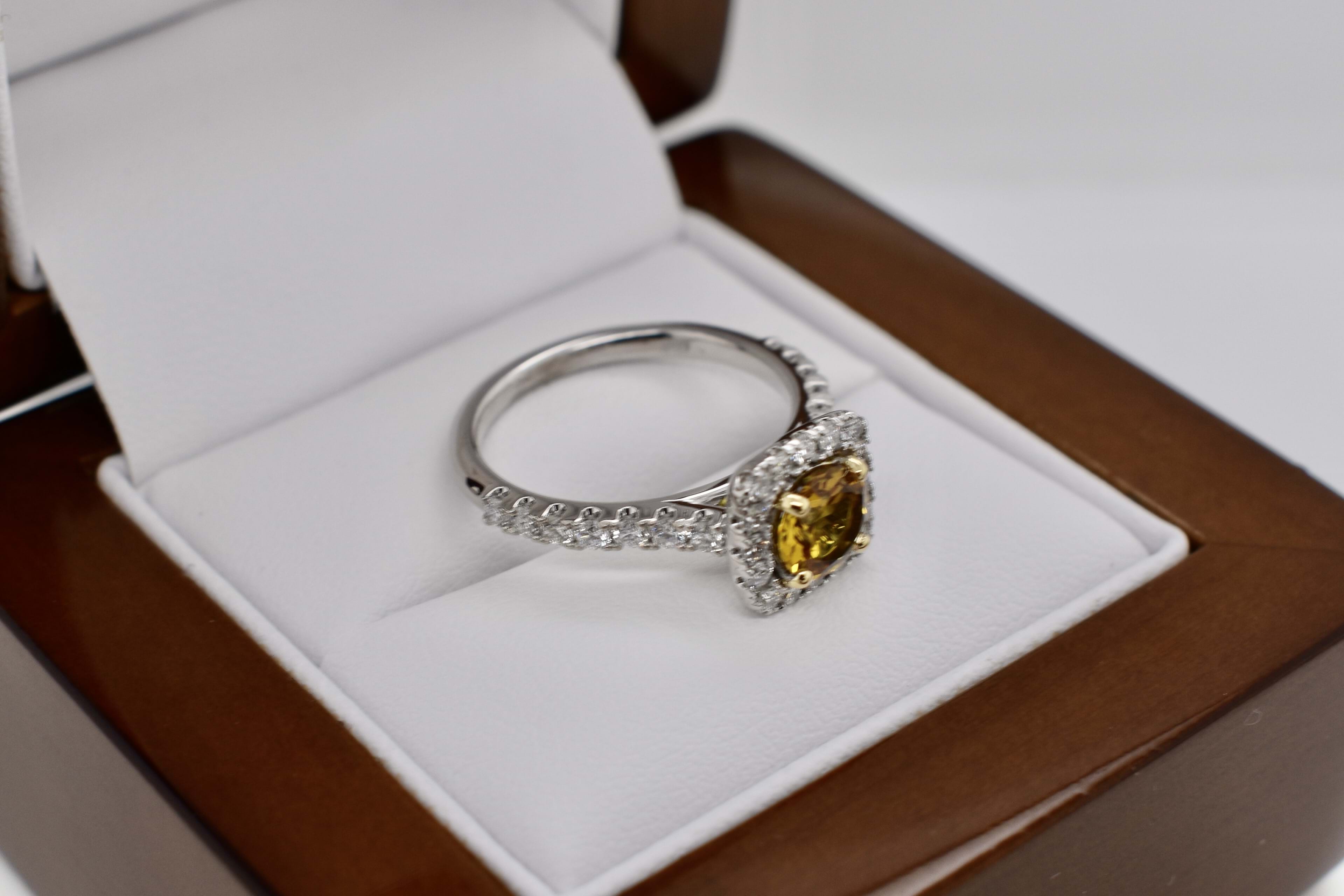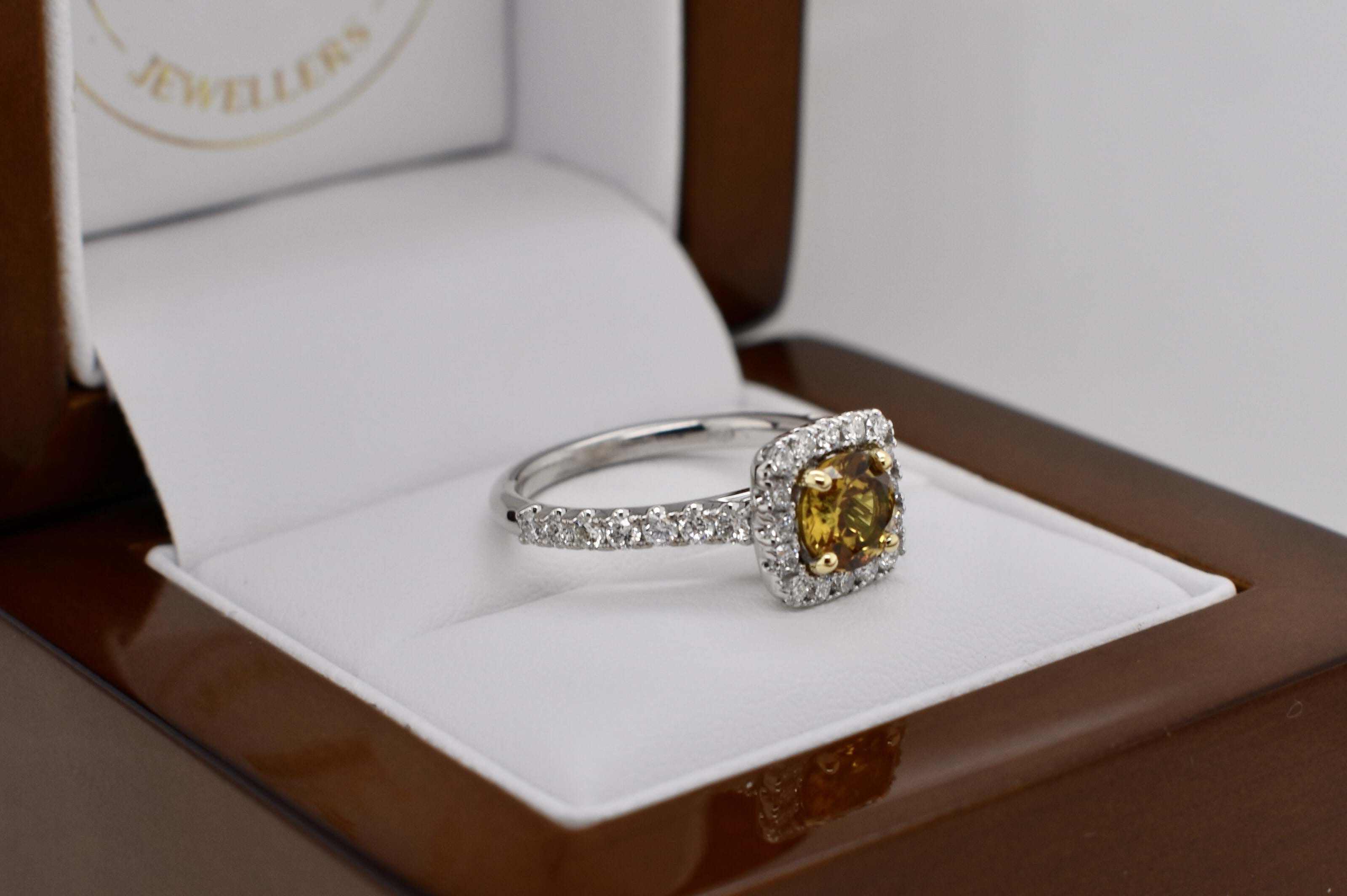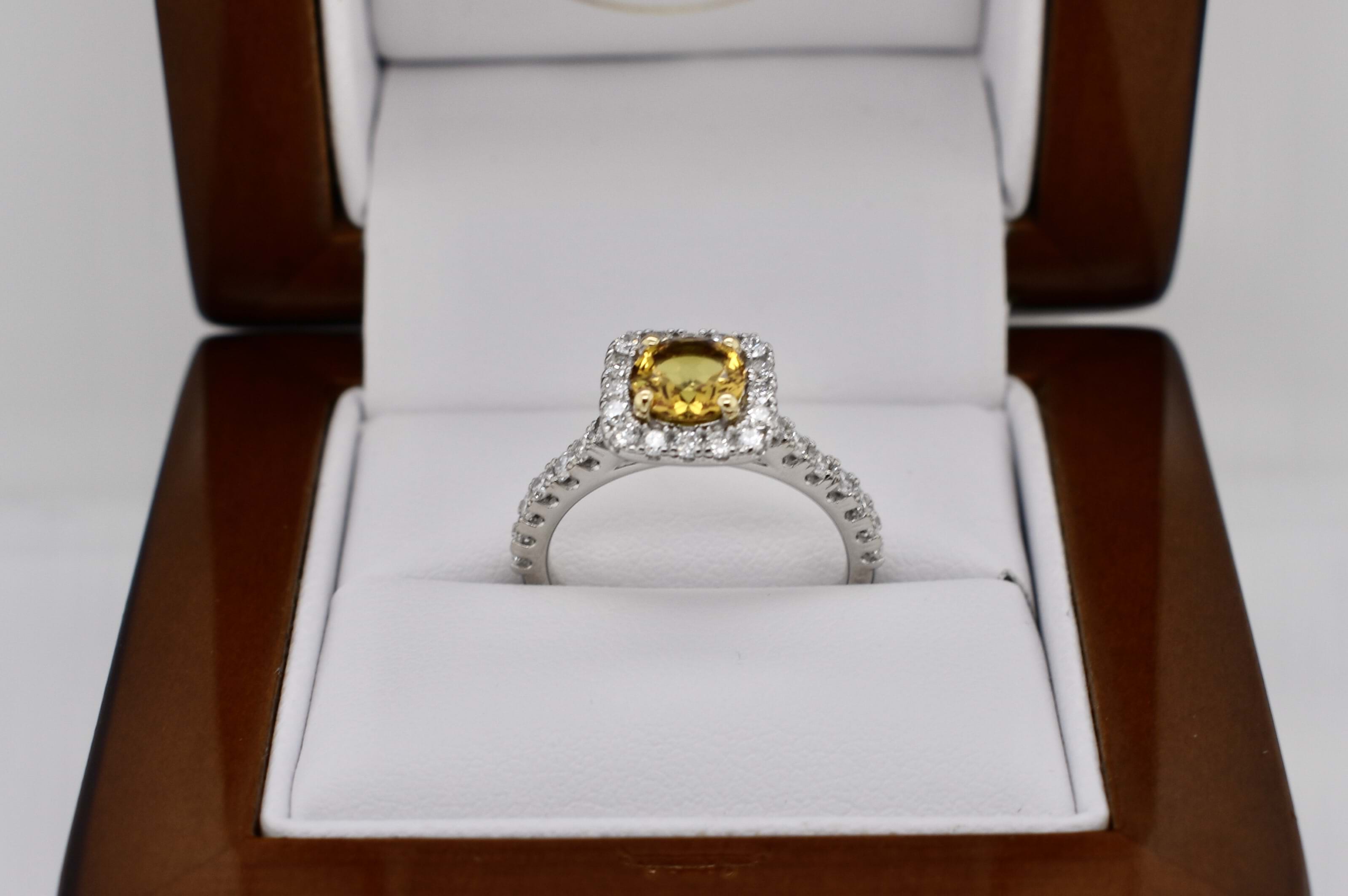 This ring was created to showcase our clients yellow sapphire, made in 18ct white gold the cushion shape halo beautifully surrounds the round sapphire and a single row of shimmering diamonds are set down the band. Total diamond content equals 0.50cts. Independent Valuation Supplied.