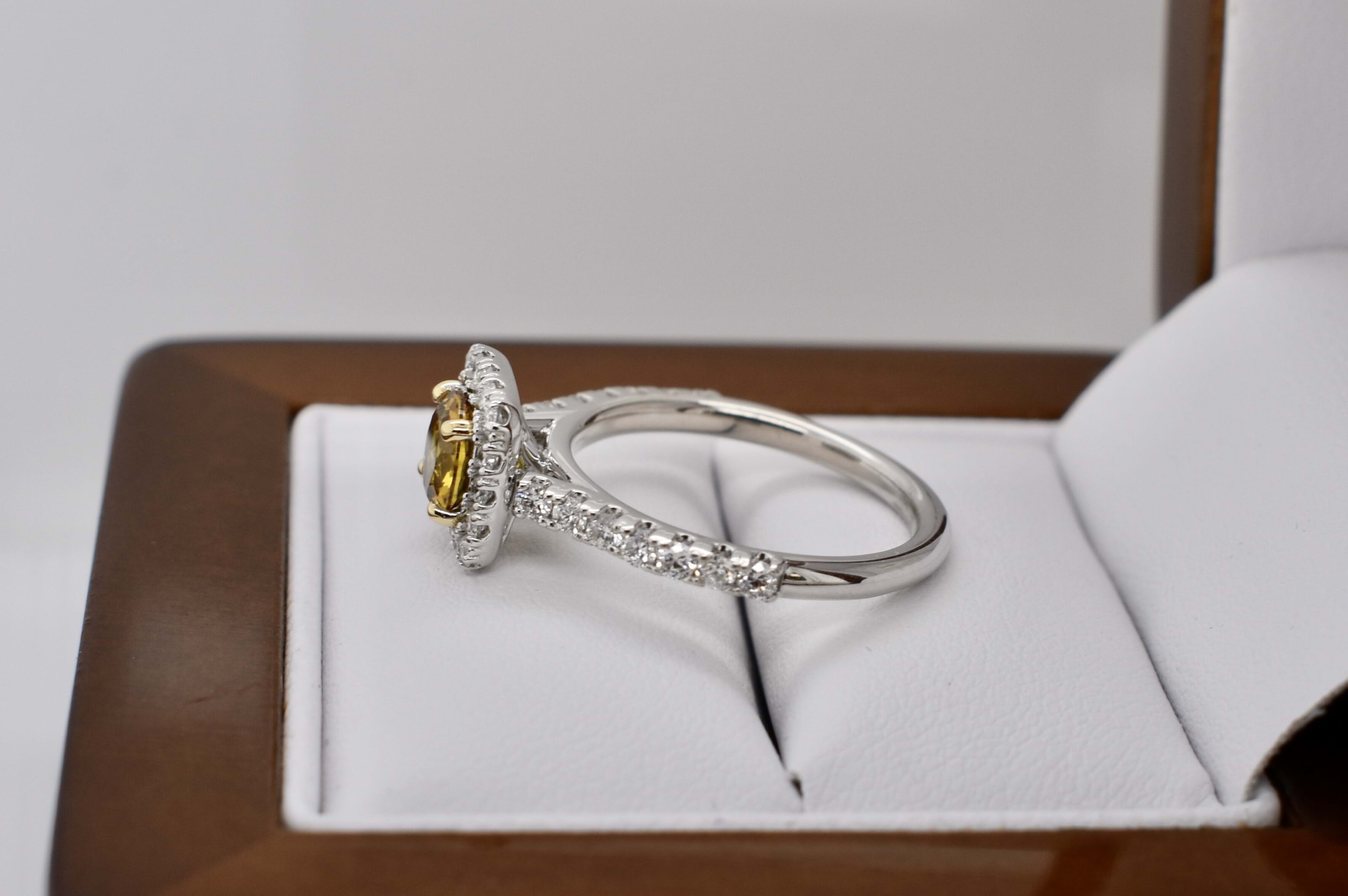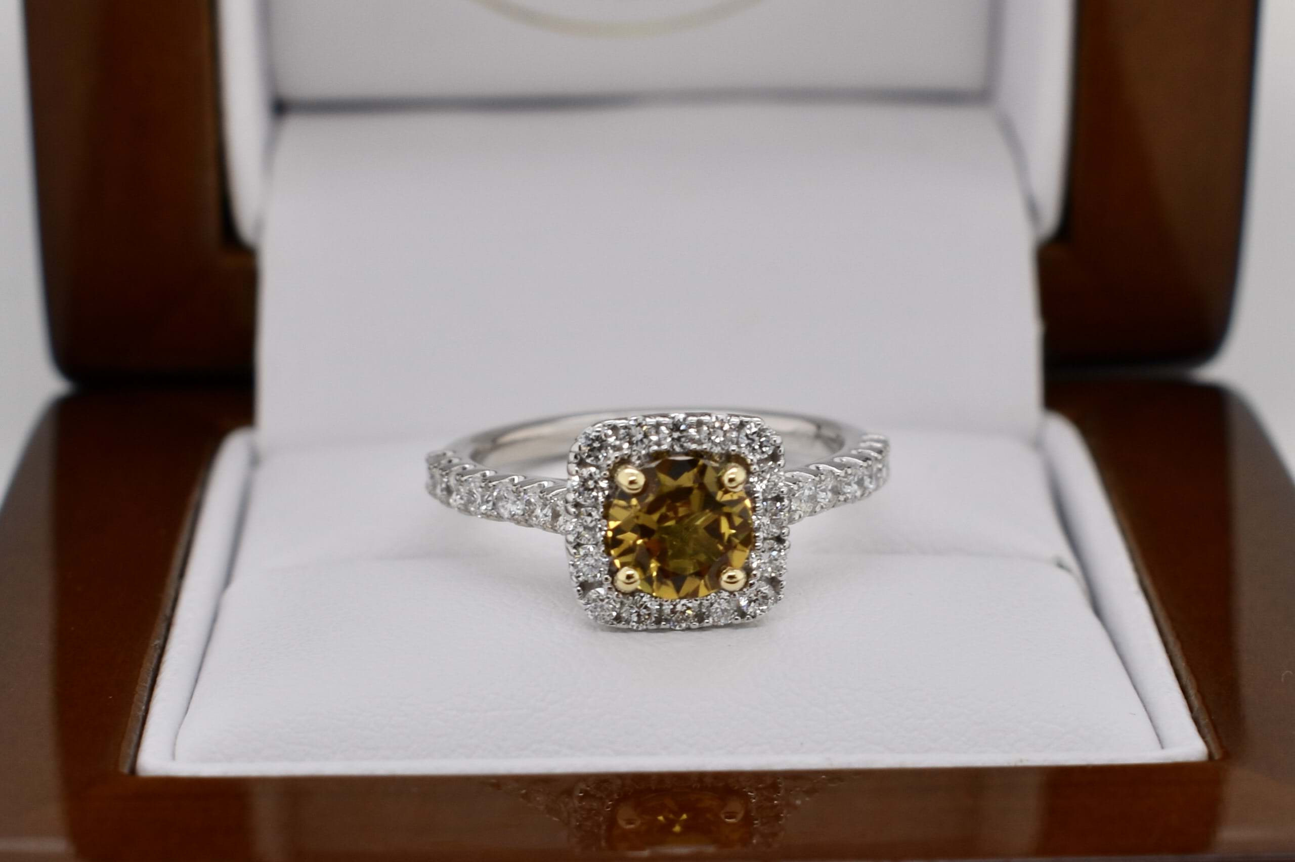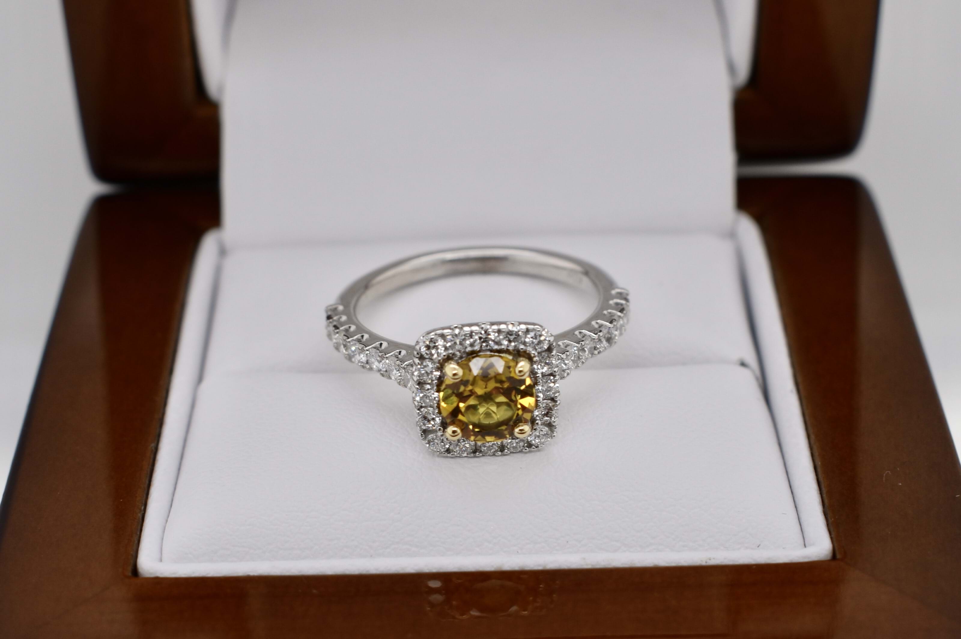 This ring was created to showcase our clients yellow sapphire, made in 18ct white gold the cushion shape halo beautifully surrounds the round sapphire and a single row of shimmering diamonds are set down the band. Total diamond content equals 0.50cts. Independent Valuation Supplied.