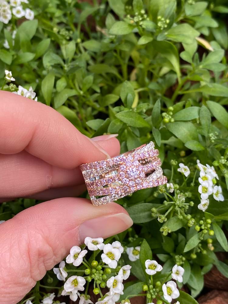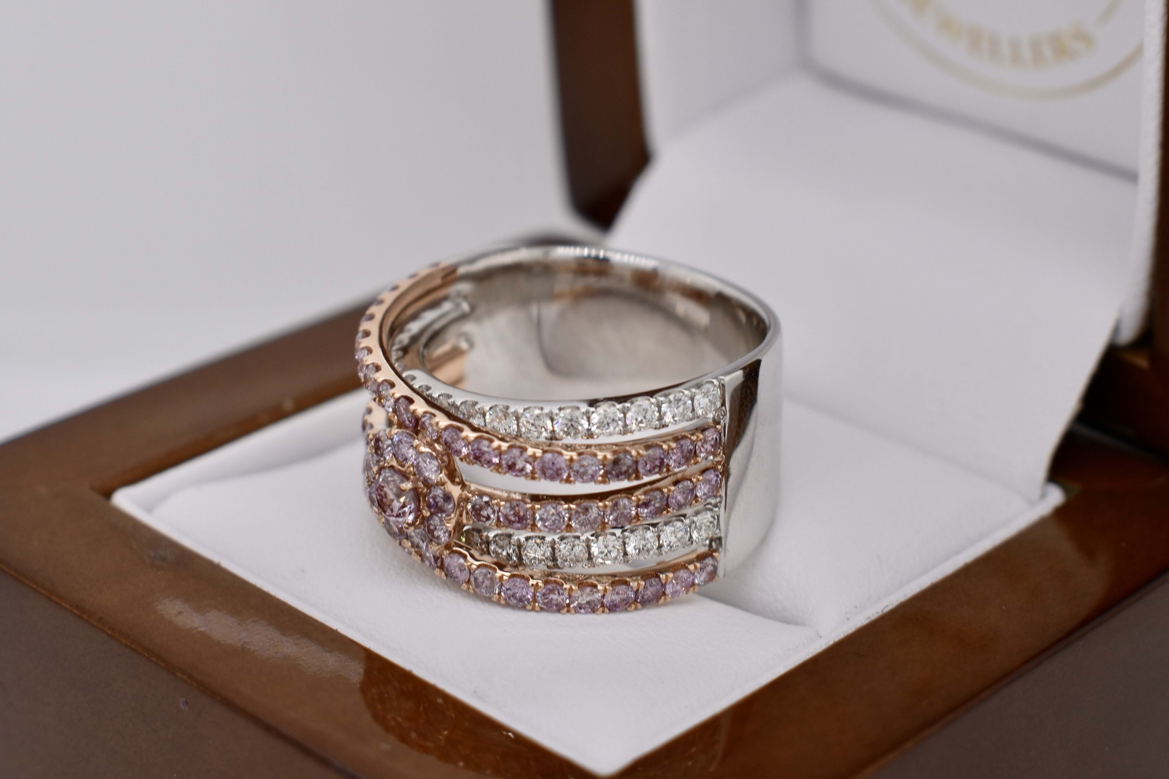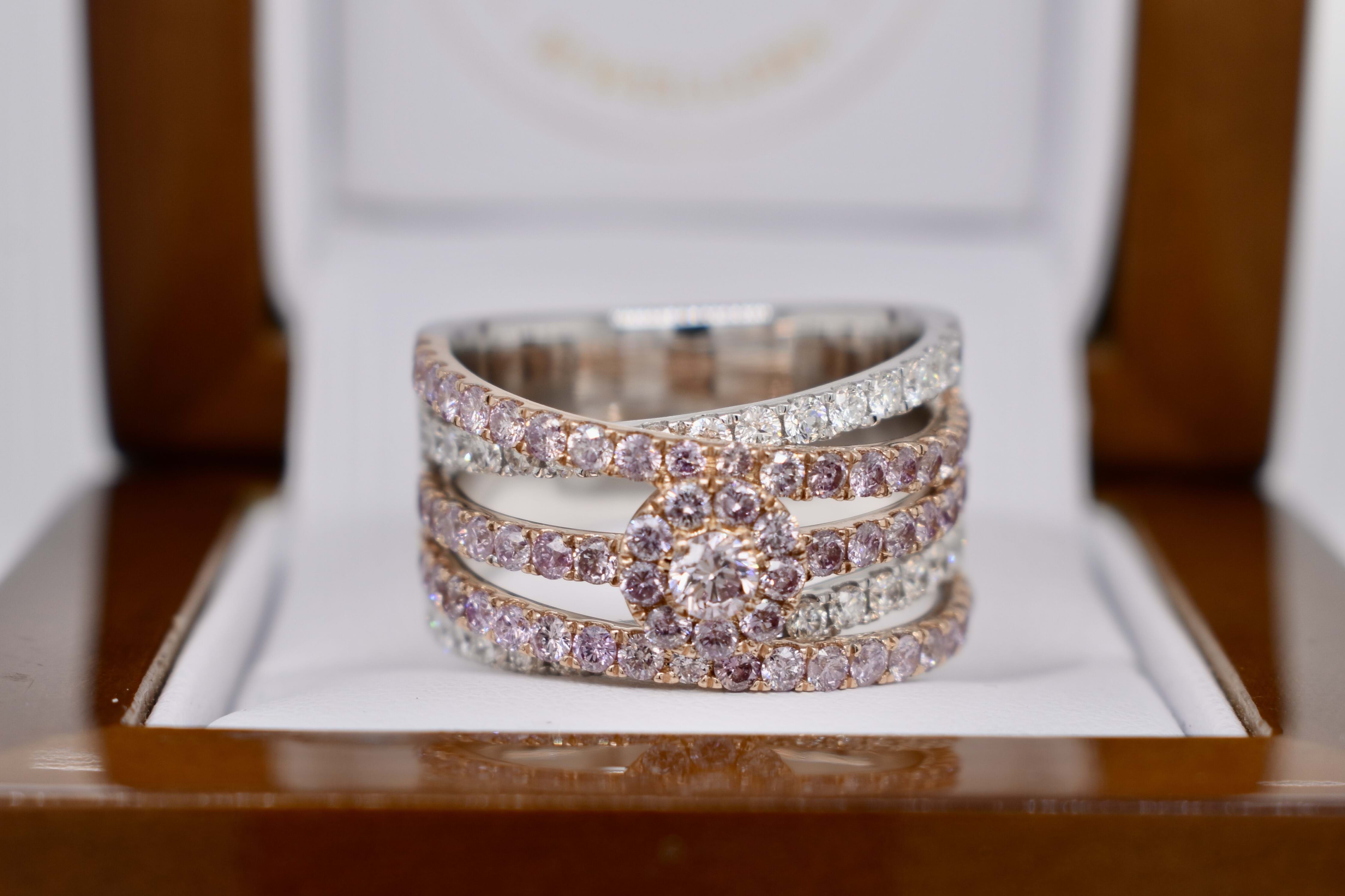 A beautiful 0.18ct fancy light pink, Argyle, diamond set as the feature of this sparkling pink and white diamond crossover design ring. Crafted in 18ct white and rose gold the halo and overlapping bands contain a total of 65 fancy pink diamonds equalling 1.76cts & 34 shimmering white diamonds totalling 0.85ct FG colour. Independent Valuation Supplied.