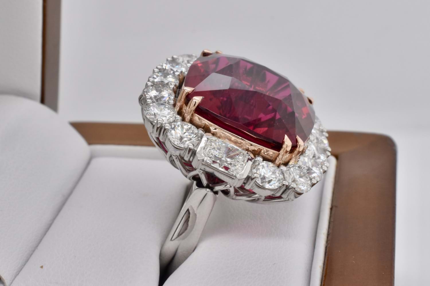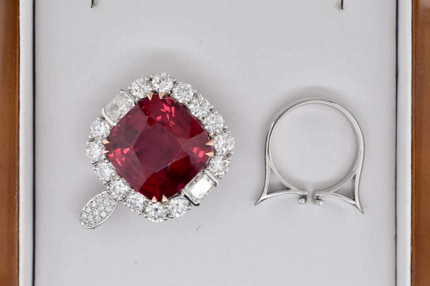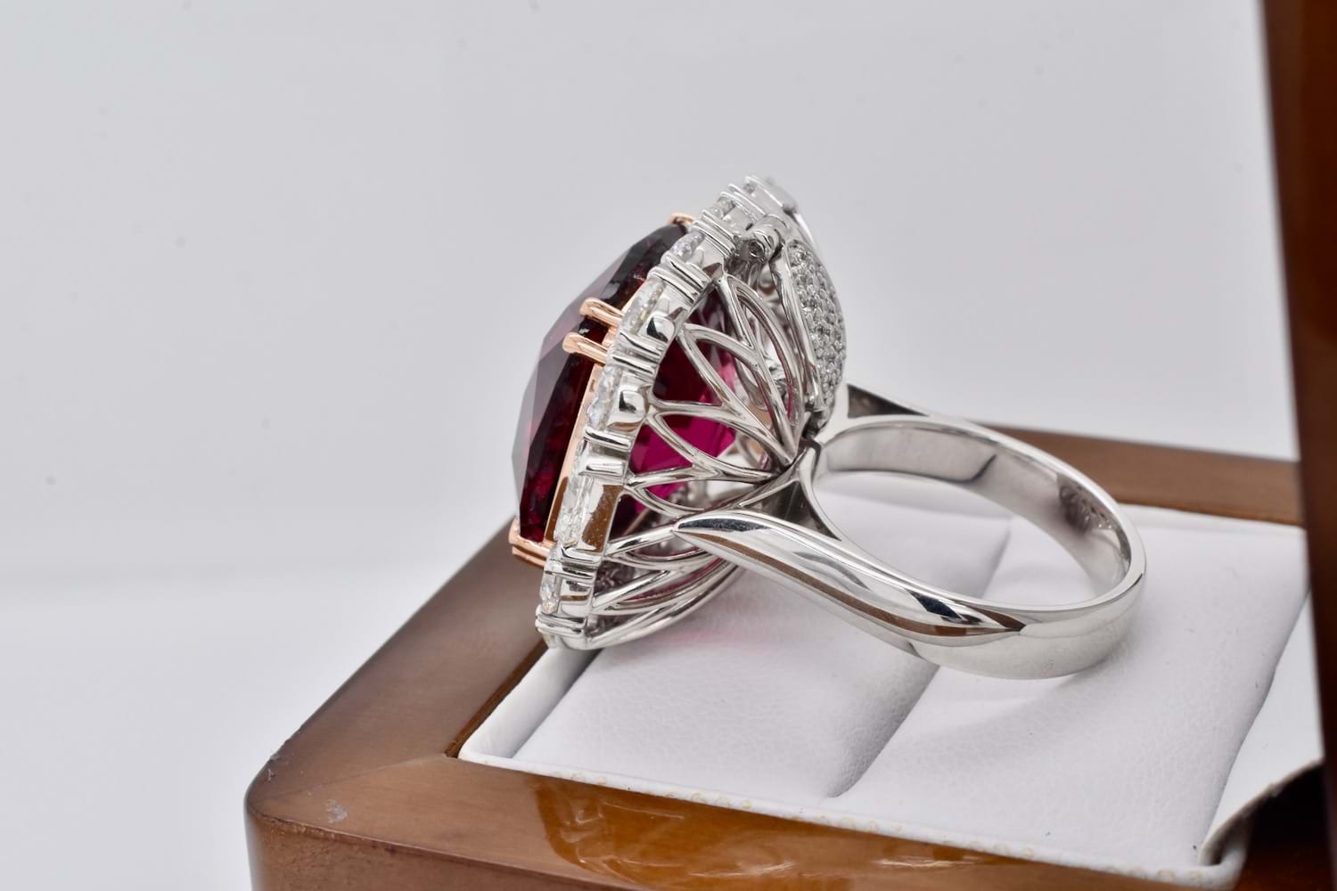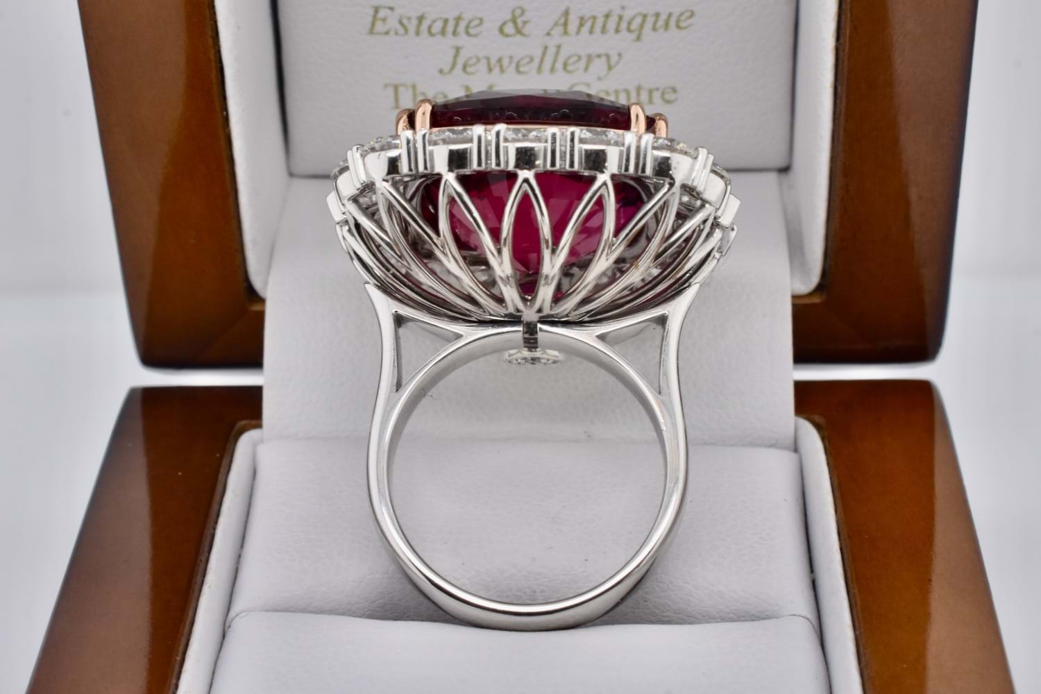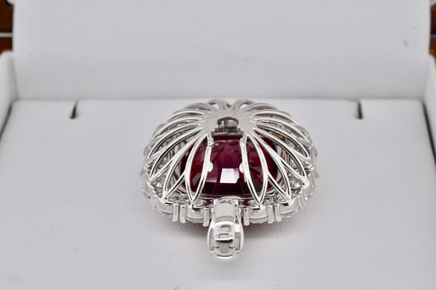 This is an exquisite, opulent and one of a kind rare showstopping piece which showcases magnificent stones and masterful design as well as craftsmanship - it is truly a piece of wearable art which is also convertible. The centre square cushion cut dark pinkish red rubellite tourmaline is a staggering 27.09ct, secured by fine double talon claws in 18ct rose gold to complement the tourmaline, with a halo of stunning and large bright, glittering diamonds with a combination of RBC and radiant cuts with a smaller setting of diamonds on the foldable bail, all set in 18ct white gold with a beautifully detailed floral style basket finished with a plain, solid band. Total of thirty two diamonds equalling a huge 18.46ct FG/VS-SI. The band of the ring twists away to allow the piece to be worn as an enhancer once the bail has been folded out. Independent Valuation Supplied