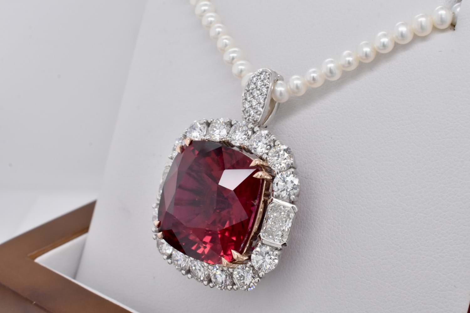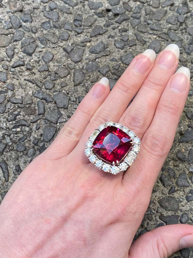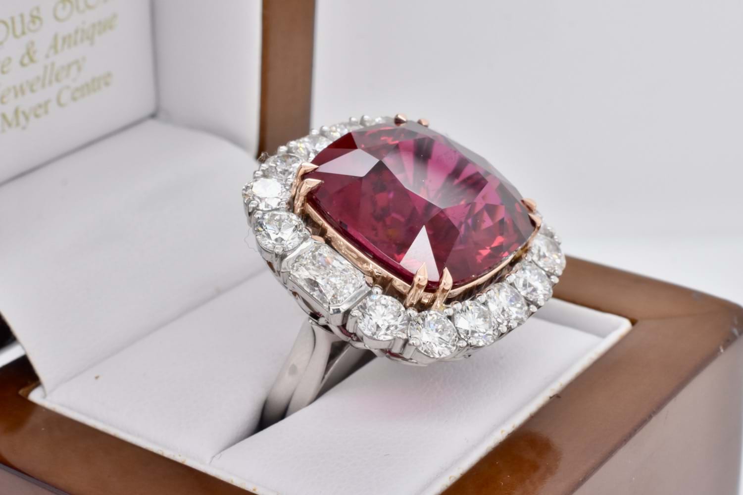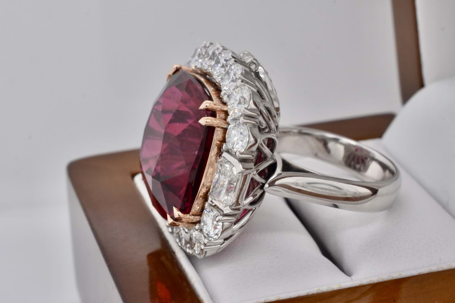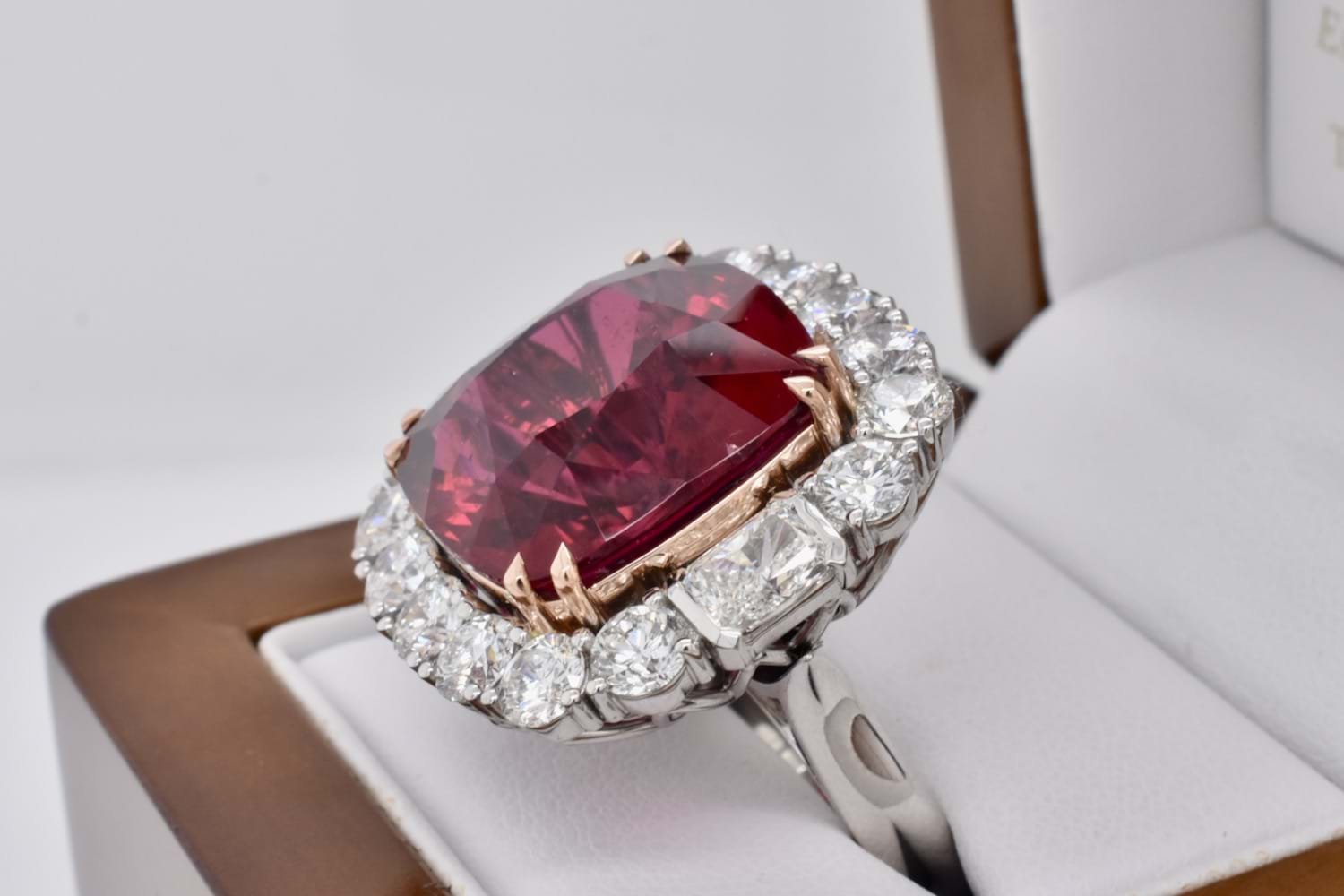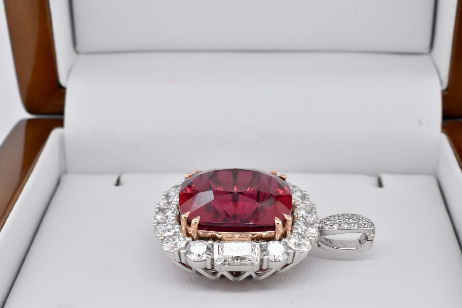 This is an exquisite, opulent and one of a kind rare showstopping piece which showcases magnificent stones and masterful design as well as craftsmanship - it is truly a piece of wearable art which is also convertible. The centre square cushion cut dark pinkish red rubellite tourmaline is a staggering 27.09ct, secured by fine double talon claws in 18ct rose gold to complement the tourmaline, with a halo of stunning and large bright, glittering diamonds with a combination of RBC and radiant cuts with a smaller setting of diamonds on the foldable bail, all set in 18ct white gold with a beautifully detailed floral style basket finished with a plain, solid band. Total of thirty two diamonds equalling a huge 18.46ct FG/VS-SI. The band of the ring twists away to allow the piece to be worn as an enhancer once the bail has been folded out. Independent Valuation Supplied