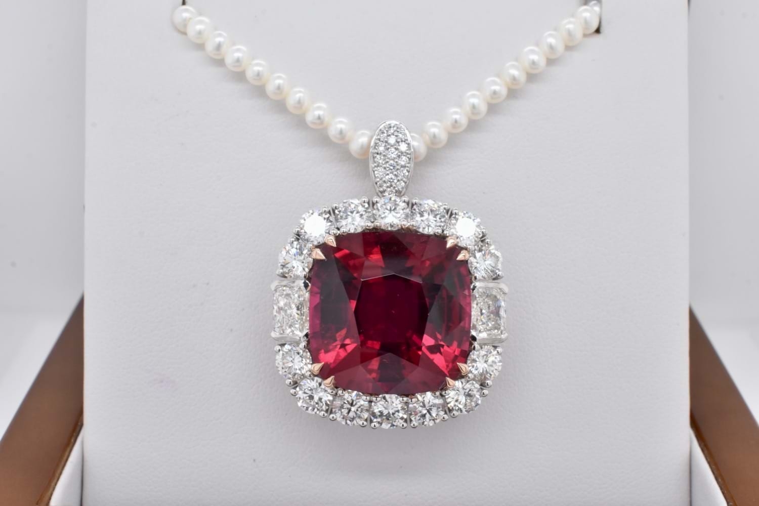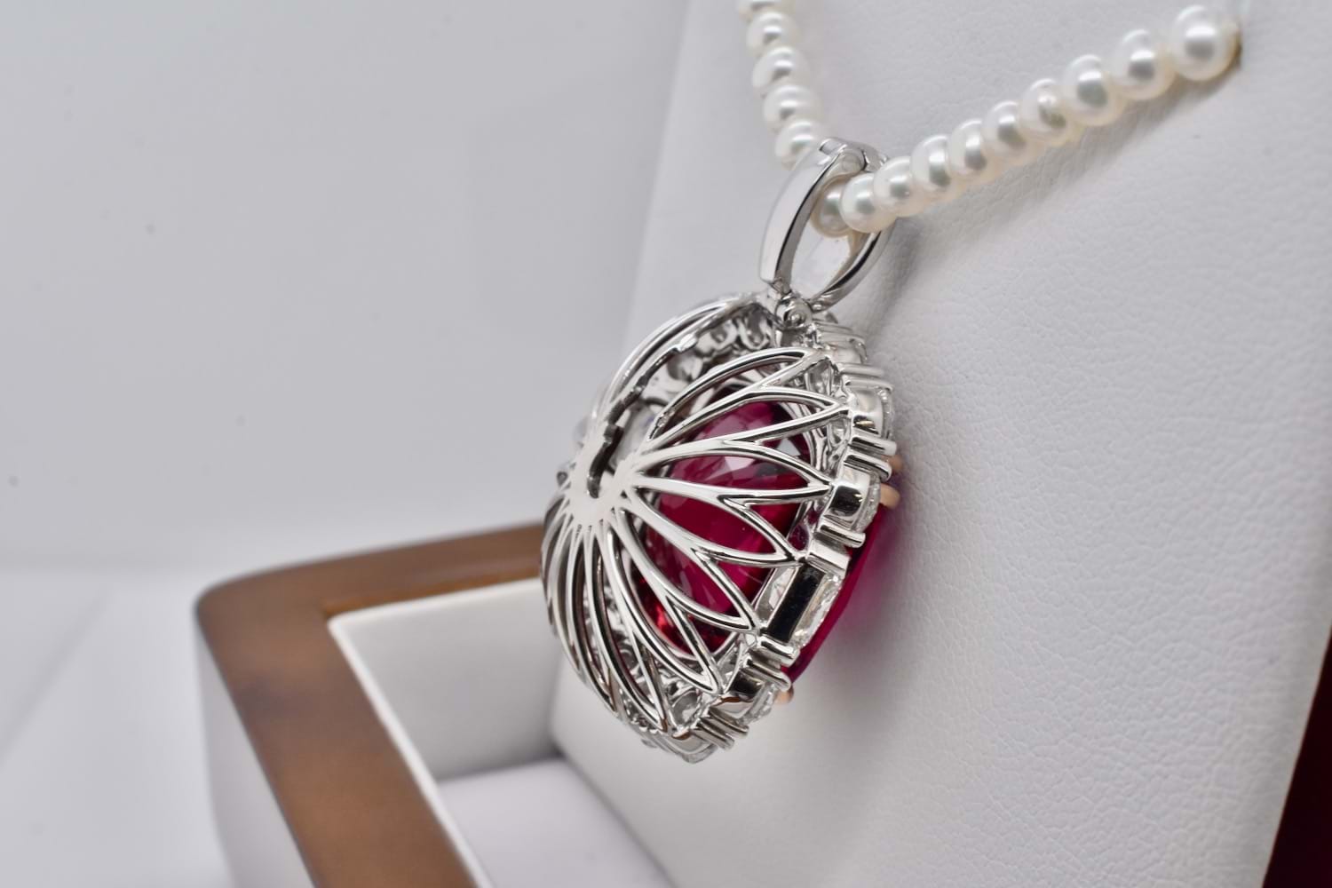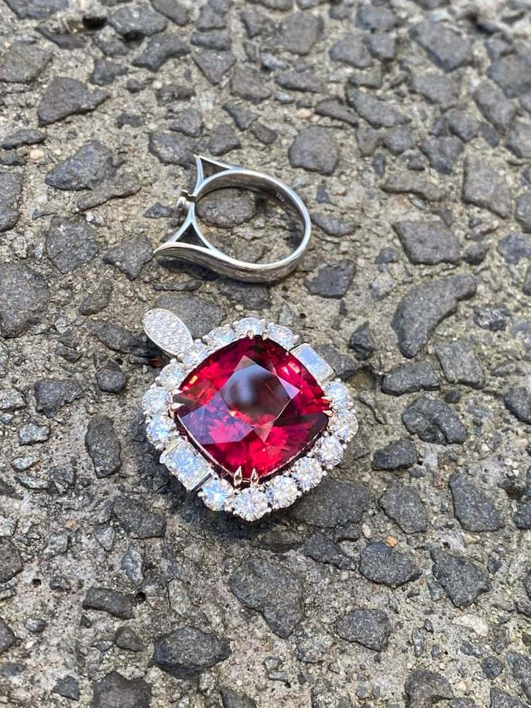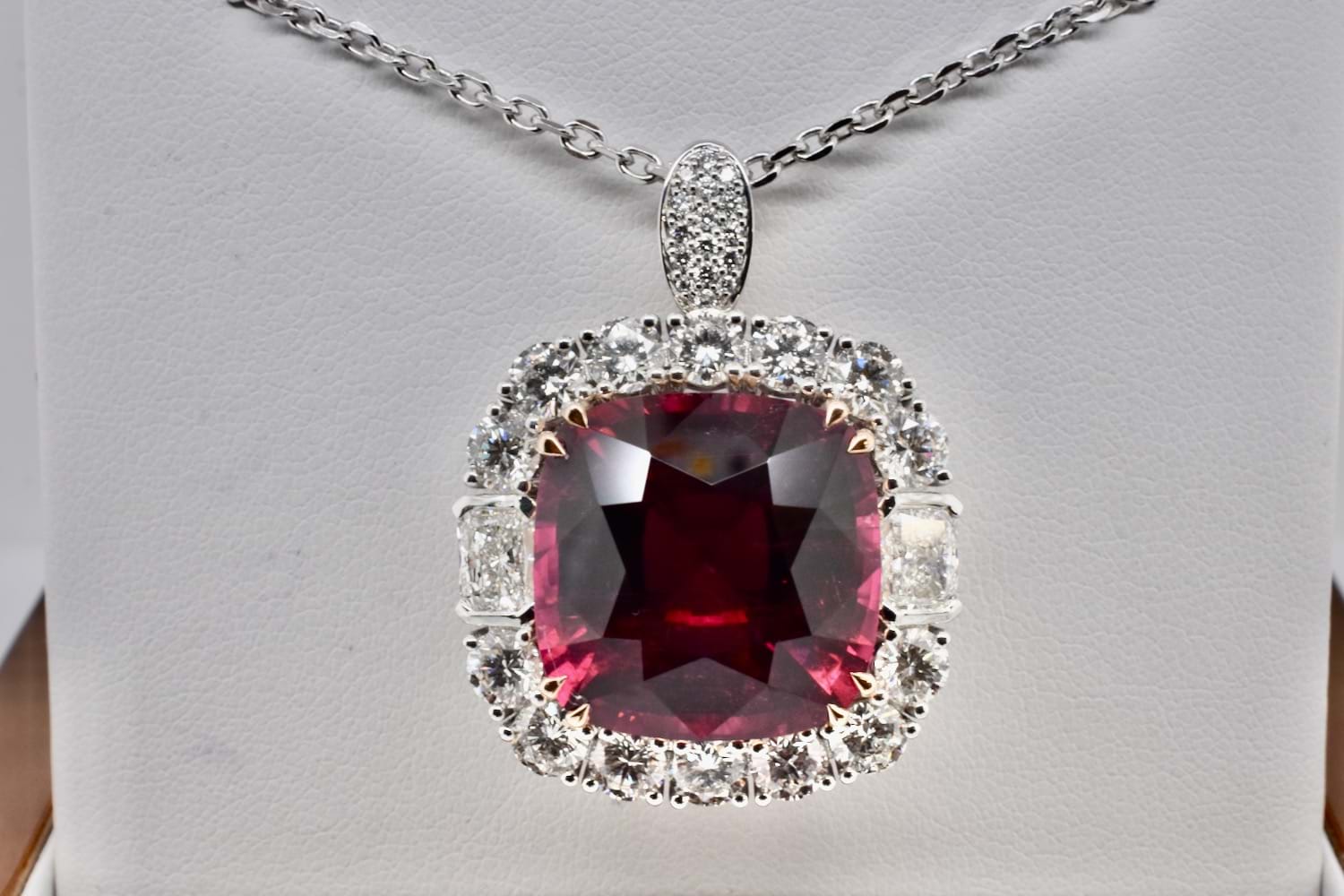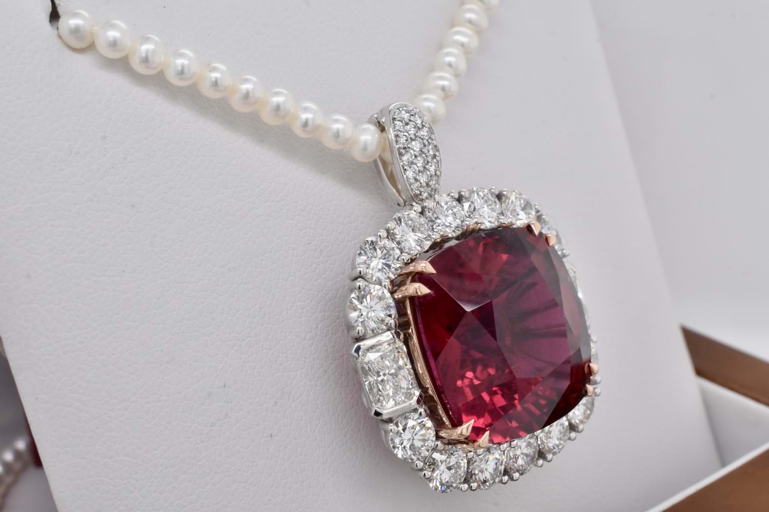 This is an exquisite, opulent and one of a kind rare showstopping piece which showcases magnificent stones and masterful design as well as craftsmanship - it is truly a piece of wearable art which is also convertible. The centre square cushion cut dark pinkish red rubellite tourmaline is a staggering 27.09ct, secured by fine double talon claws in 18ct rose gold to complement the tourmaline, with a halo of stunning and large bright, glittering diamonds with a combination of RBC and radiant cuts with a smaller setting of diamonds on the foldable bail, all set in 18ct white gold with a beautifully detailed floral style basket finished with a plain, solid band. Total of thirty two diamonds equalling a huge 18.46ct FG/VS-SI. The band of the ring twists away to allow the piece to be worn as an enhancer once the bail has been folded out. Independent Valuation Supplied